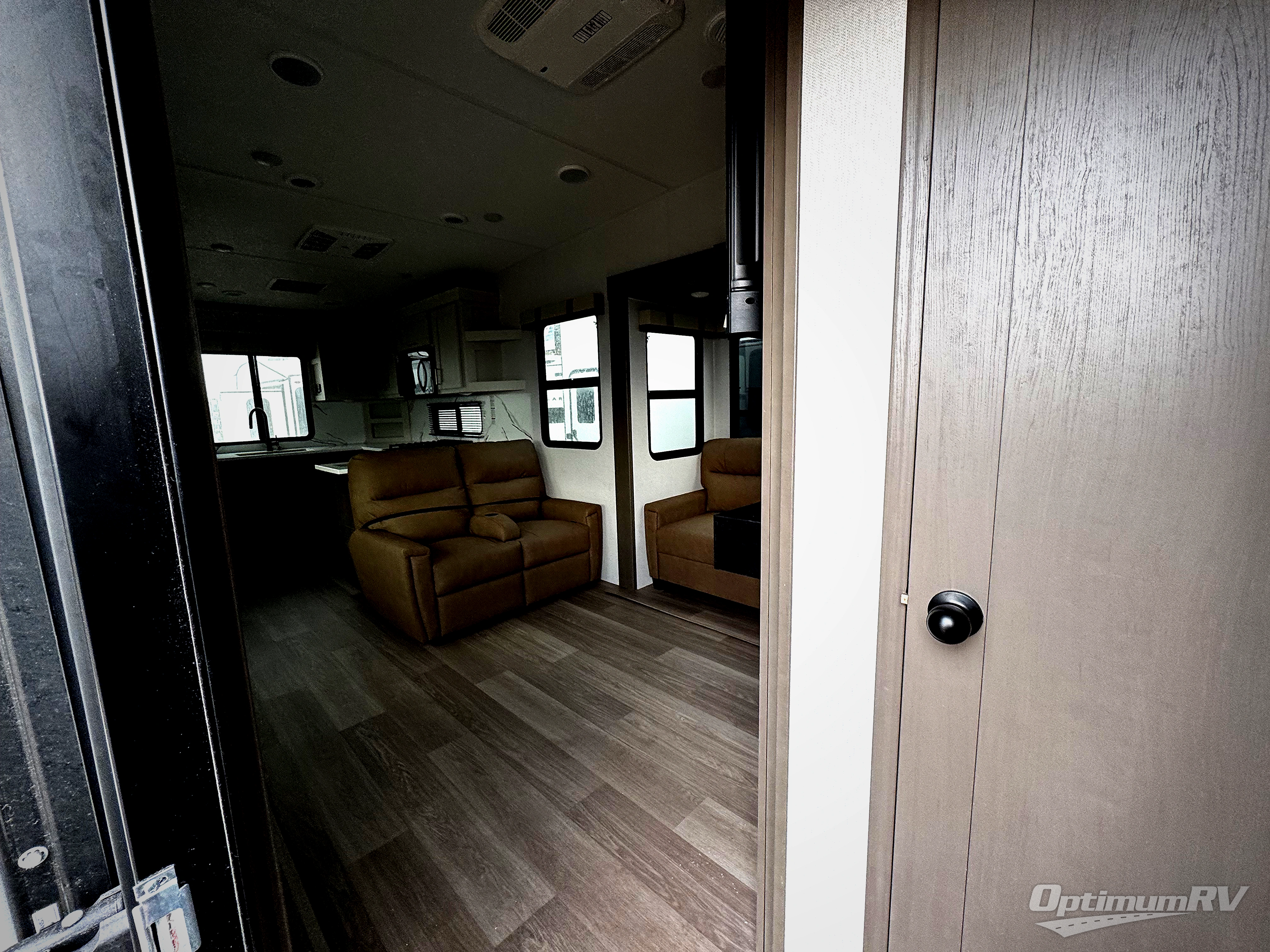 It won't be hard to find comfort and convenience in this spacious fifth wheel! The rear kitchen features ample counter space, a four burner 24" range, plus a 16 cu. ft. 12V refrigerator and pantry for food storage. There is also a desk here if you plan to work while you're away from home, and the coffee station by the pantry will be the perfect place to set up your own Keurig machine. The middle living area includes theater seating across from the 65" TV and fireplace, and there is a hide-a-bed sofa for guests to sleep on. A convenient utility room includes a sink with counter space plus stackable washer/dryer prep to make this an optional laundry room! A full bath will let you freshen up each day, and the front private bedroom will feel just like home with its king bed slide out, dresser and full-width wardrobe!