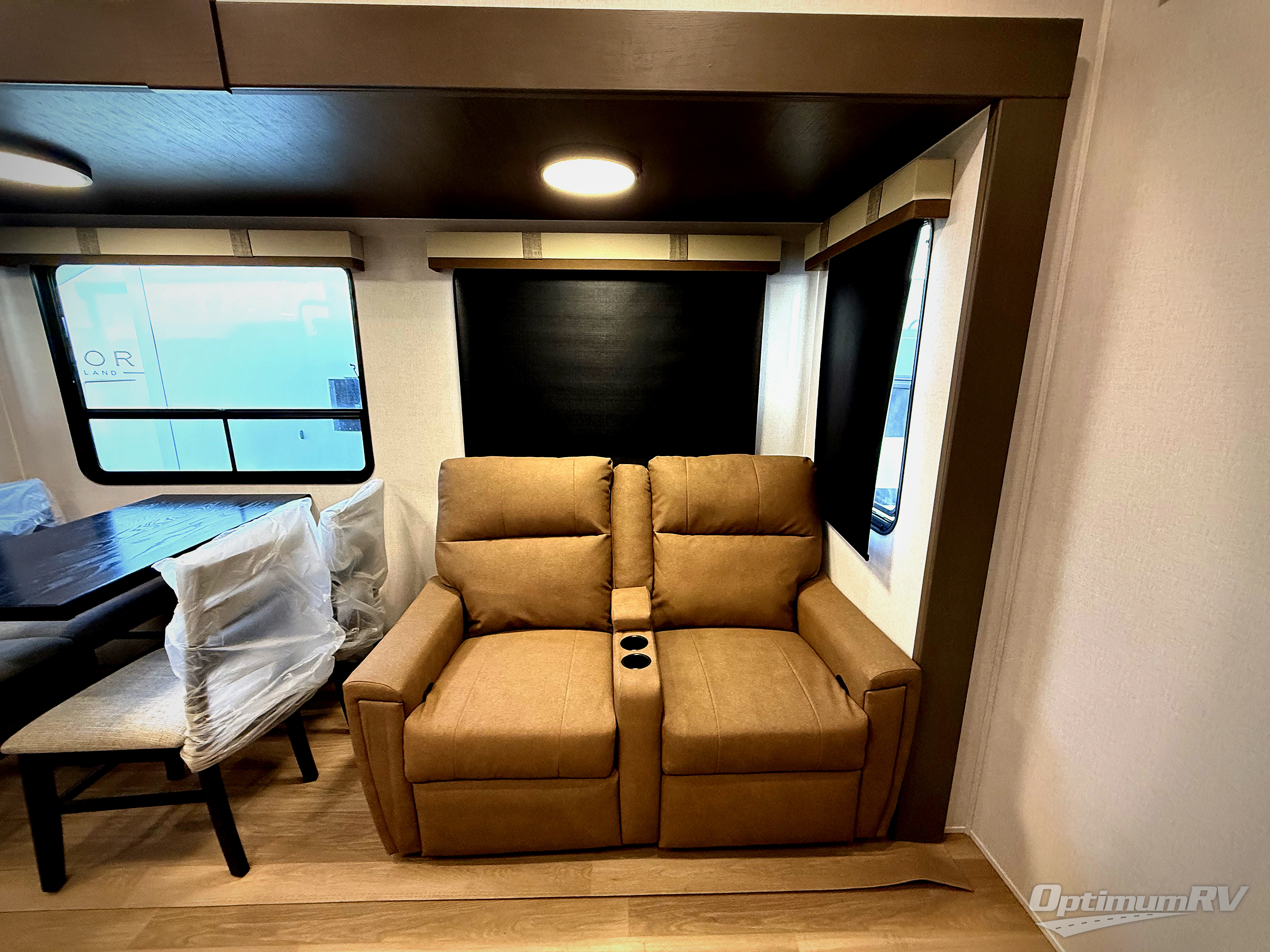 This is the perfect fifth wheel if you enjoy bringing along extra friends and family! You'll have the front private bedroom all to yourselves with a king bed slide out, a dresser with TV prep, plus a large front wardrobe and stackable washer/dryer prep. And a full bath is right next door for easy use. Your guests will love the rear den suite with a power tilt queen bed slide and a desk with a chair. There is also a full rear bath with its own exterior entry door and a loft area for even more sleeping or storage space. In the morning, you can all meet in the combined kitchen and living area that includes dual opposing slides for more space, a kitchen island, and a hutch for additional storage. There is also theater seating in direct view of the 50" TV and fireplace, along with a dinette with four chairs where you can dine together.