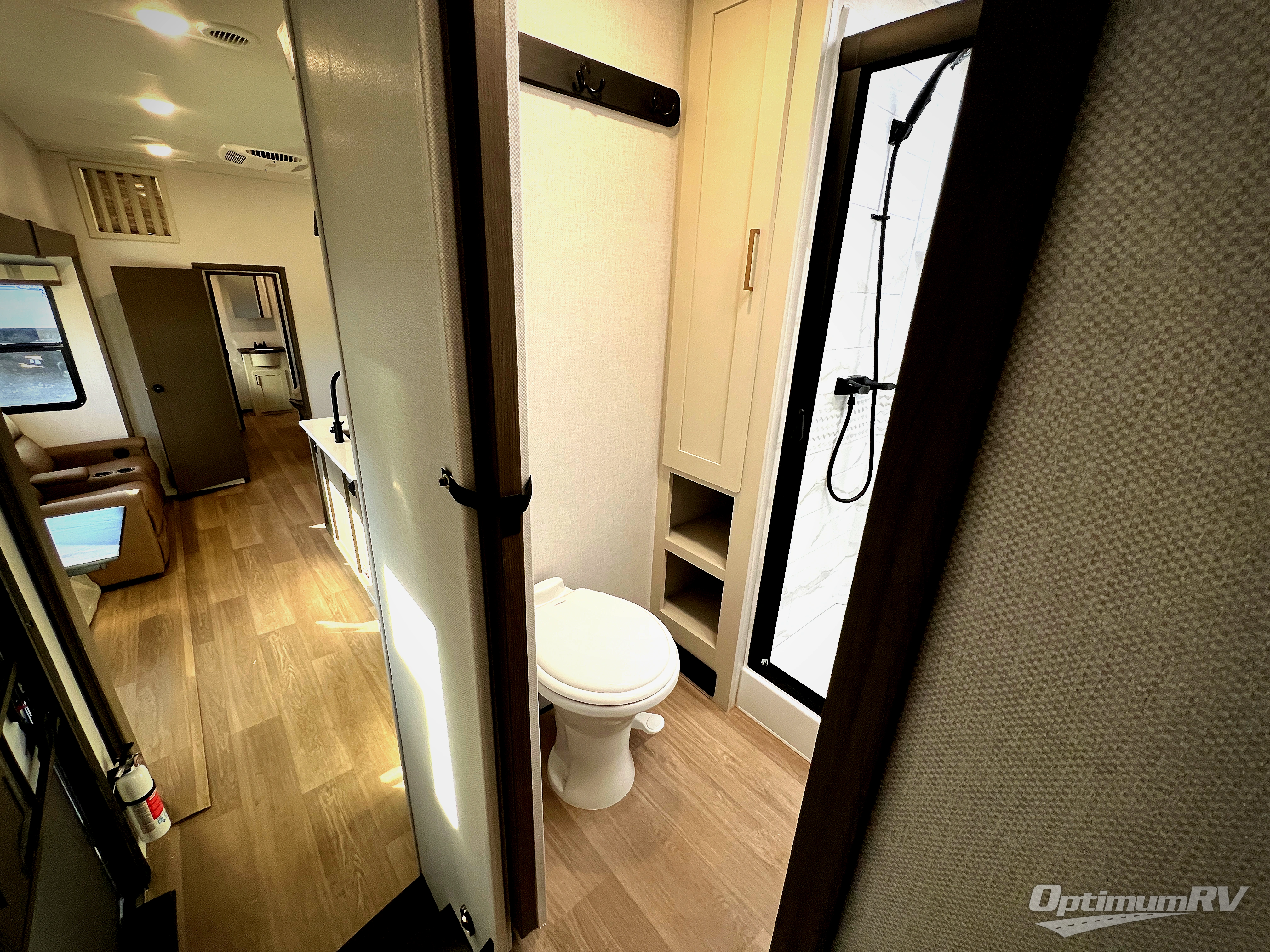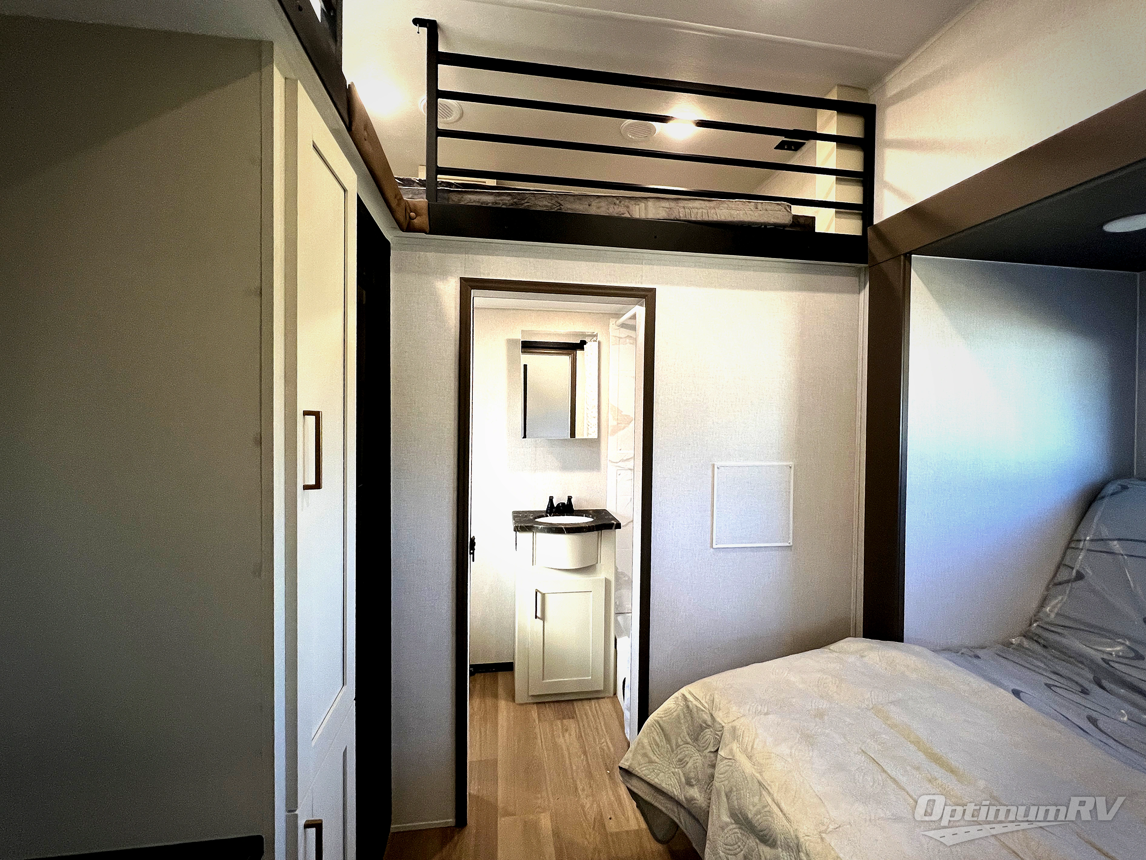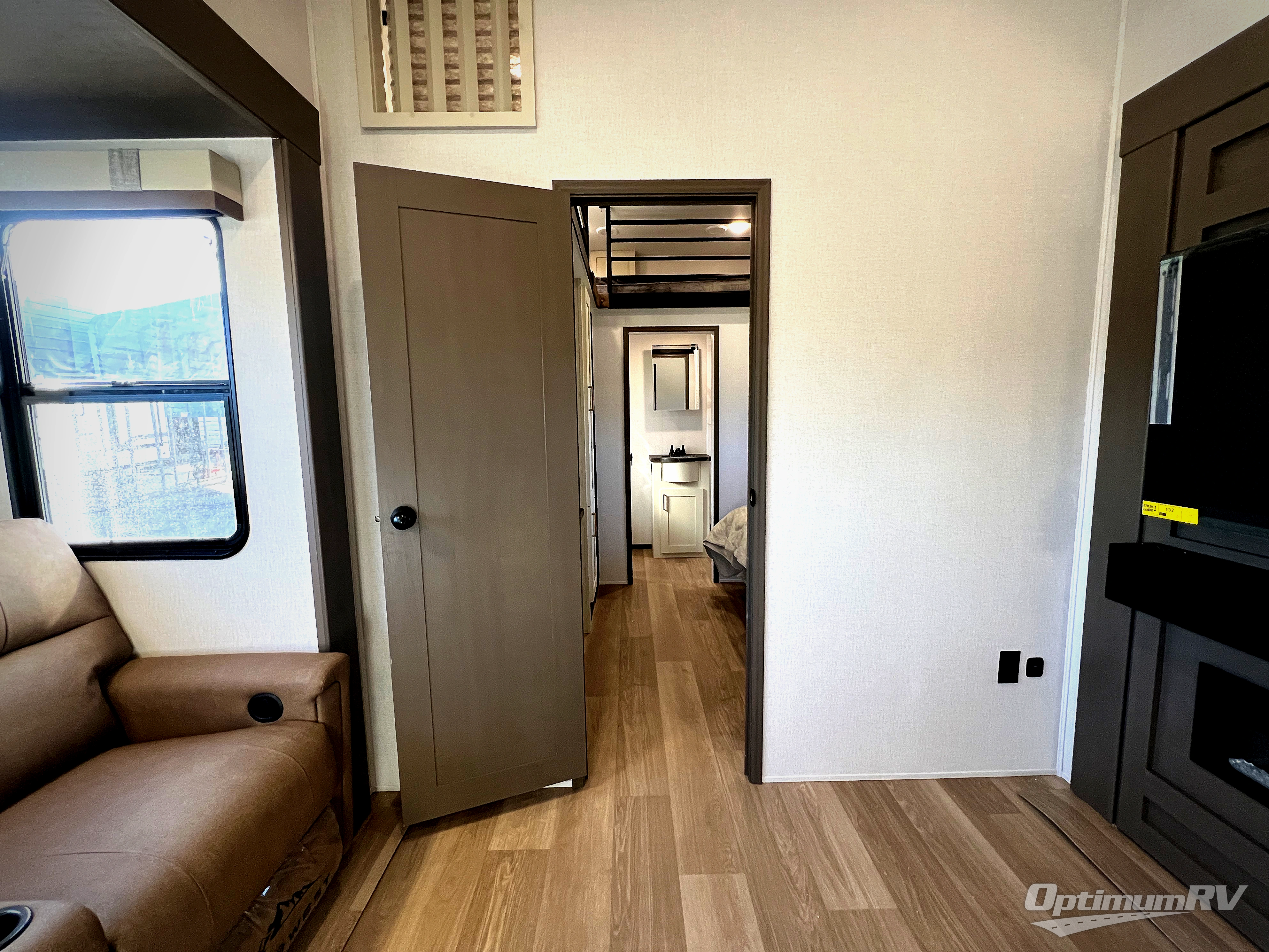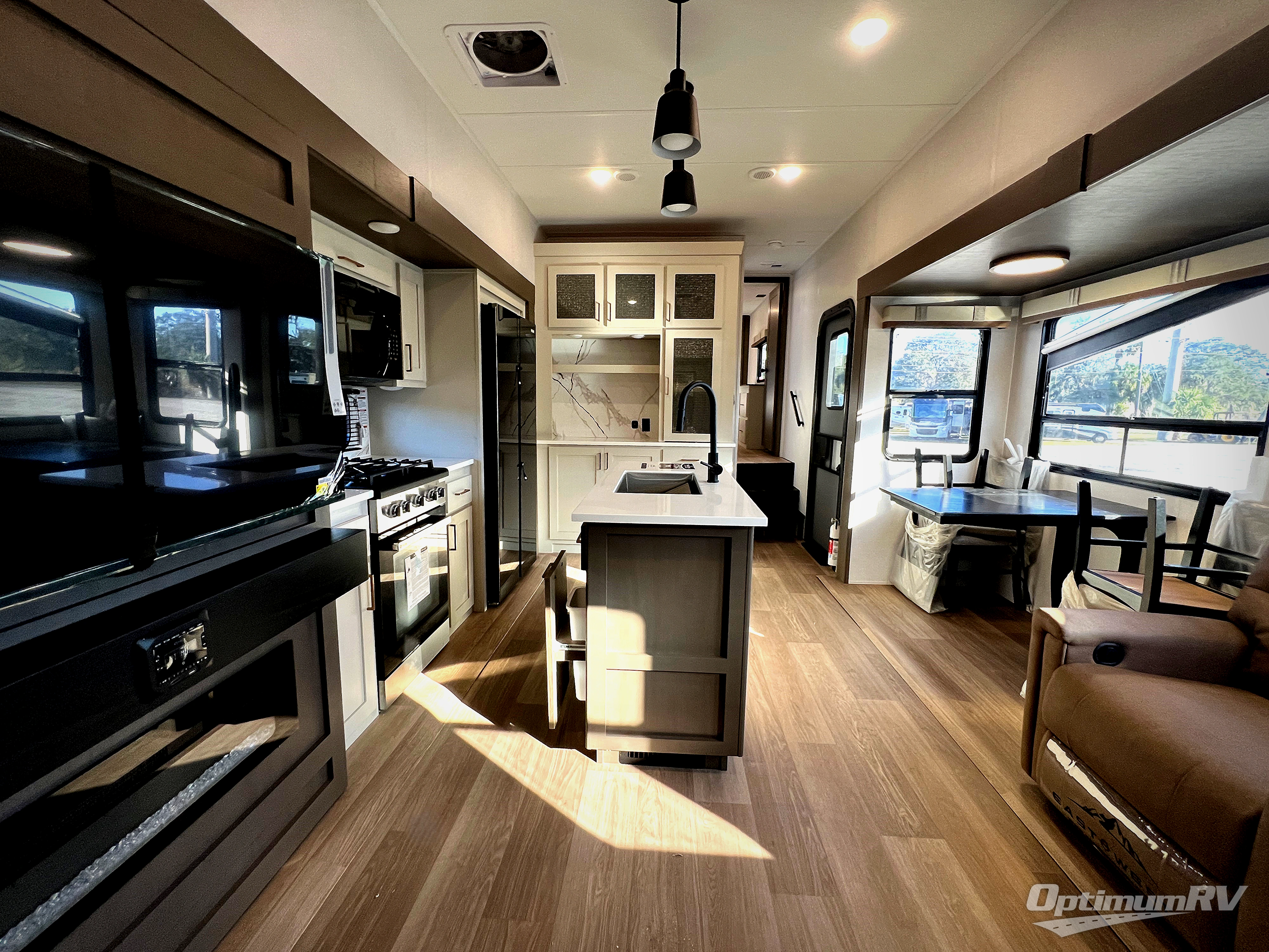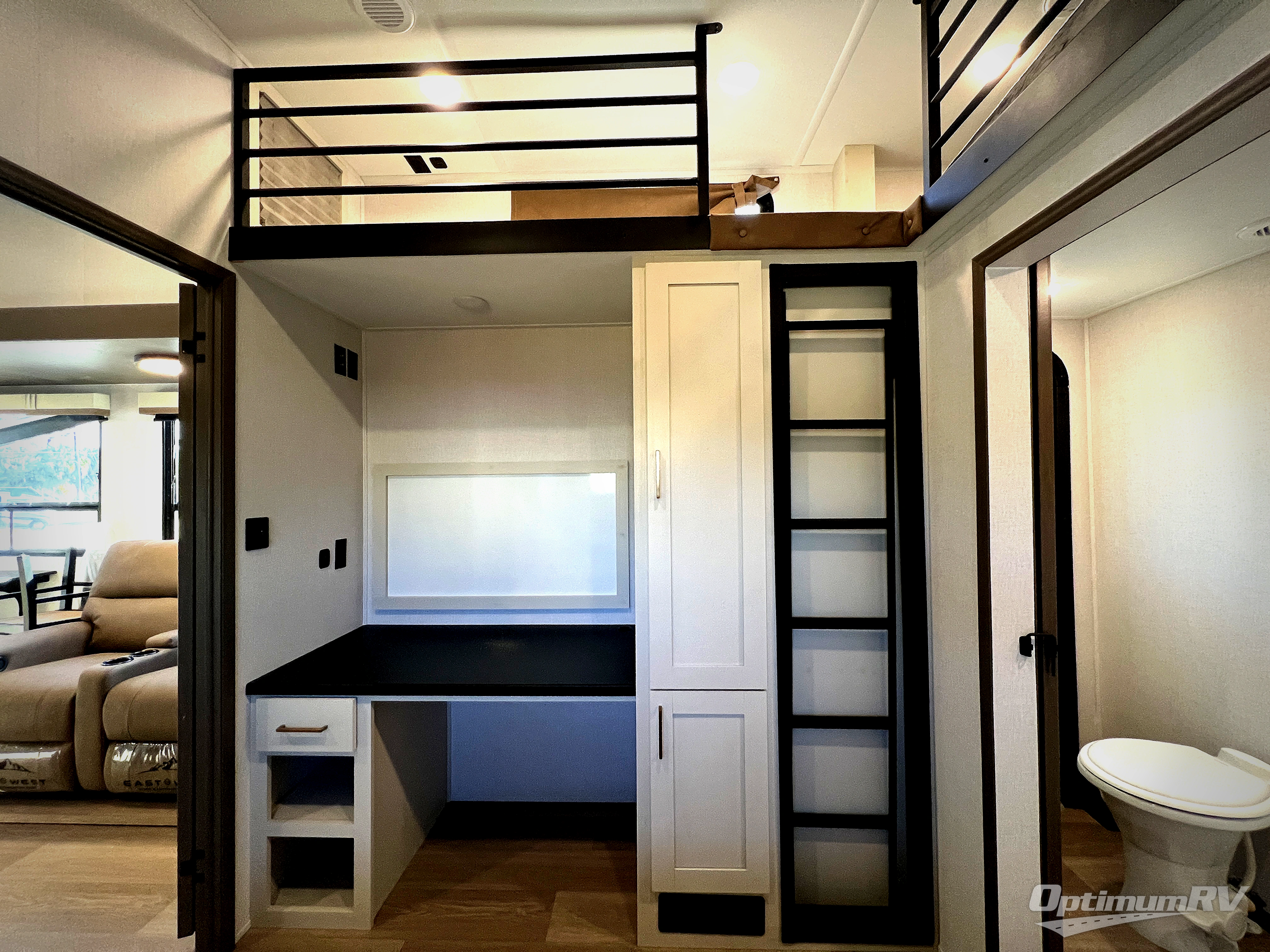 This is the perfect fifth wheel if you enjoy bringing along extra friends and family! You'll have the front private bedroom all to yourselves with a king bed slide out, a dresser with TV prep, plus a large front wardrobe and stackable washer/dryer prep. And a full bath is right next door for easy use. Your guests will love the rear den suite with a power tilt queen bed slide and a desk with a chair. There is also a full rear bath with its own exterior entry door and a loft area for even more sleeping or storage space. In the morning, you can all meet in the combined kitchen and living area that includes dual opposing slides for more space, a kitchen island, and a hutch for additional storage. There is also theater seating in direct view of the 50" TV and fireplace, along with a dinette with four chairs where you can dine together.