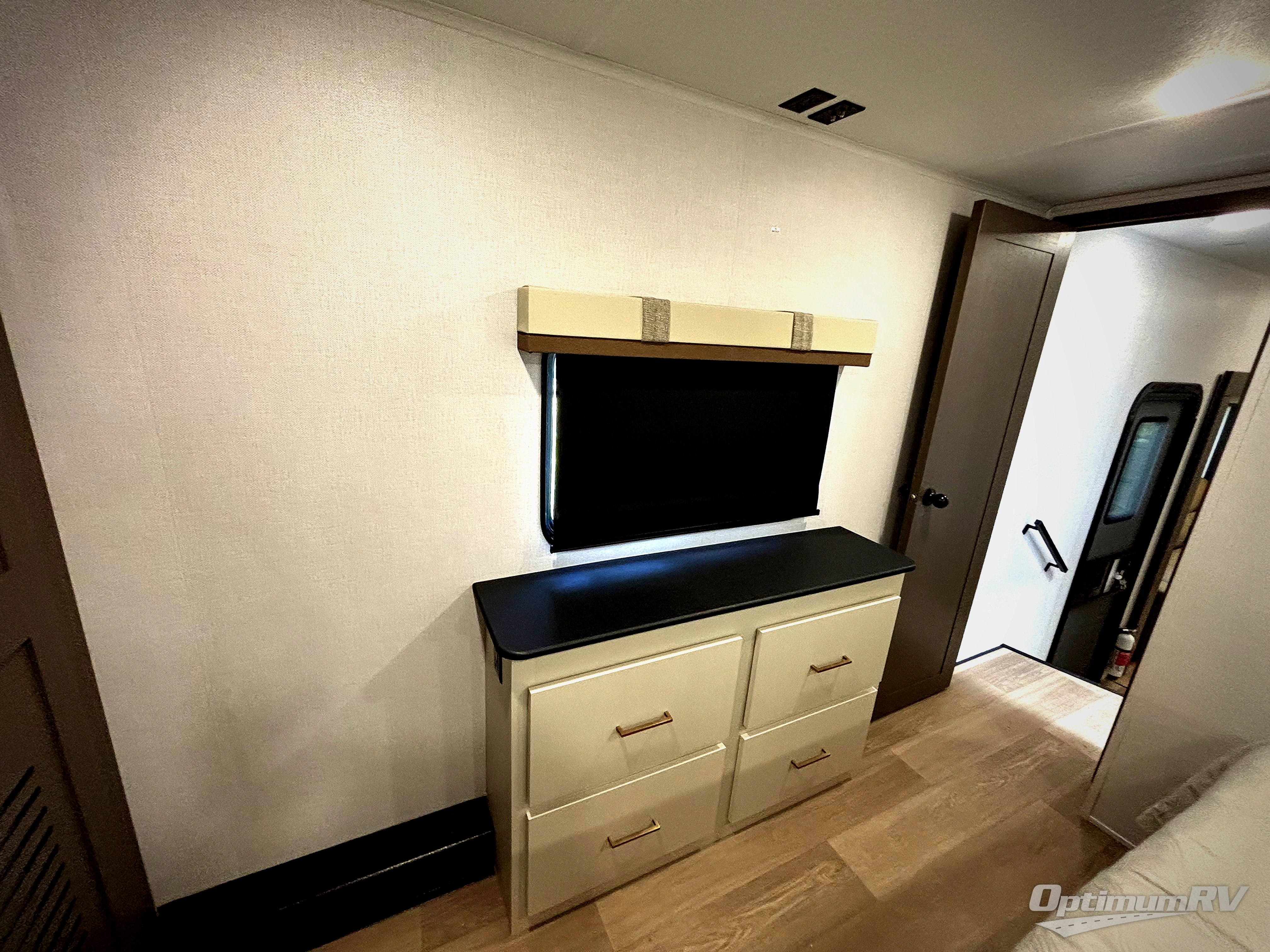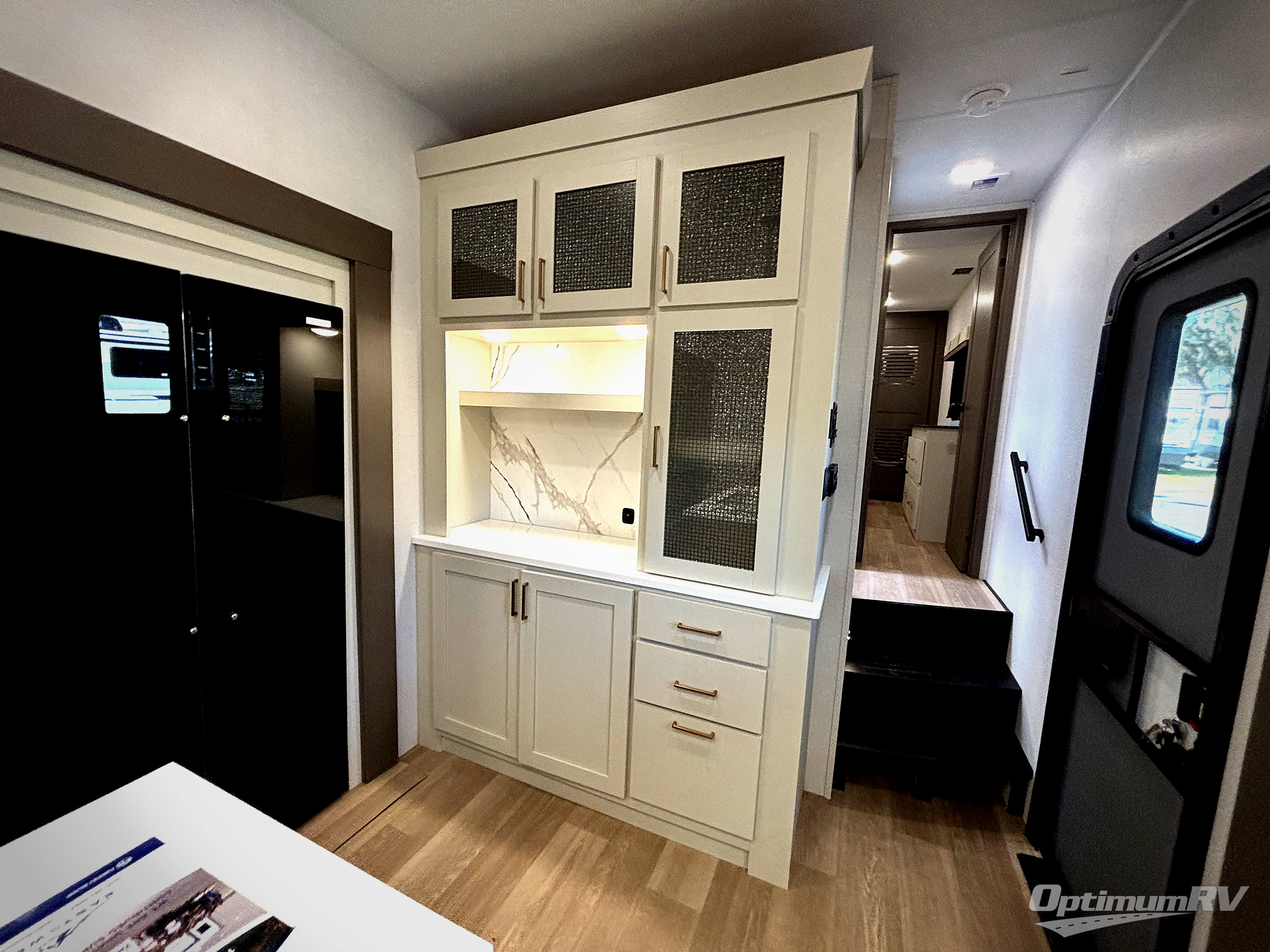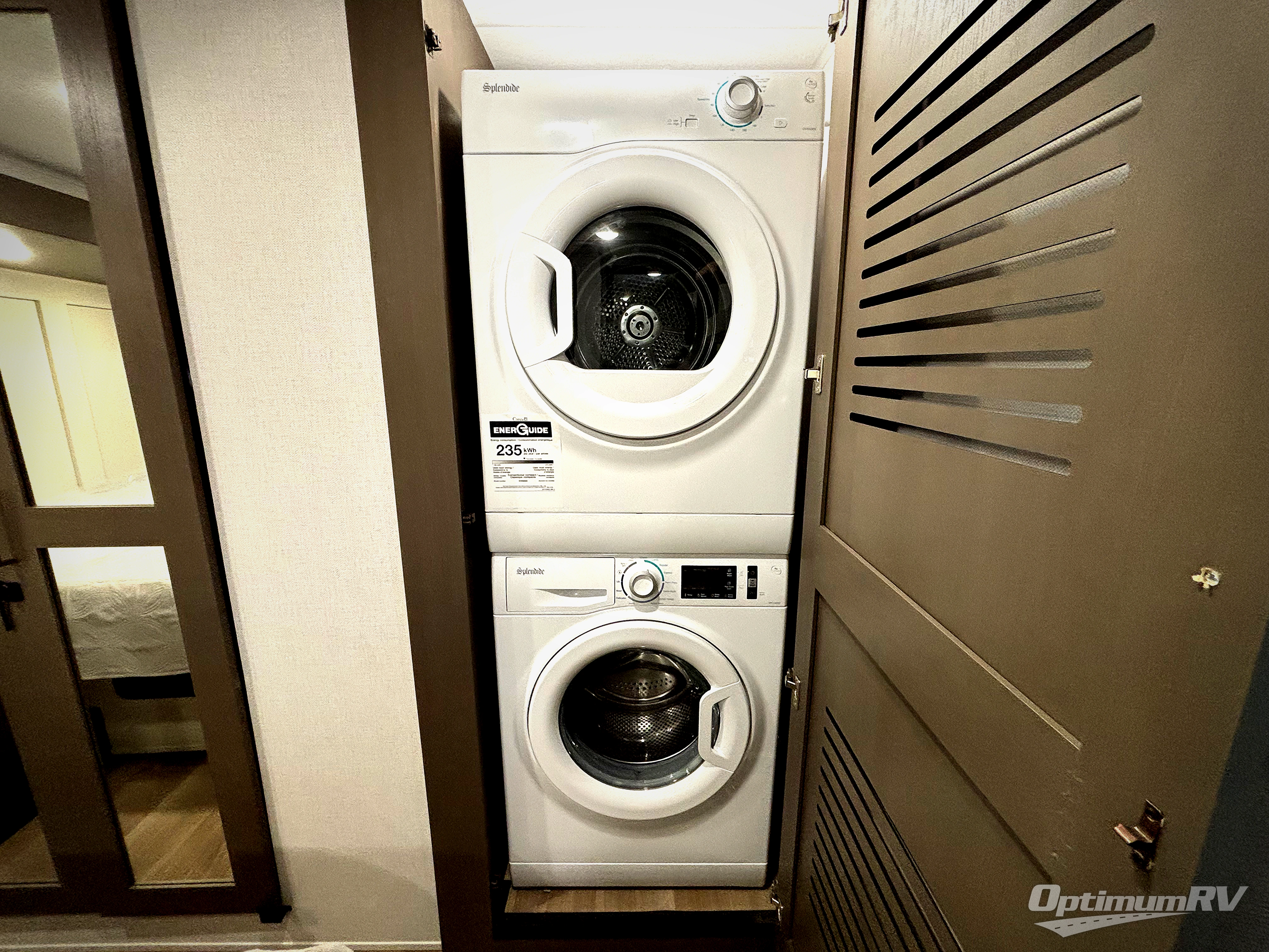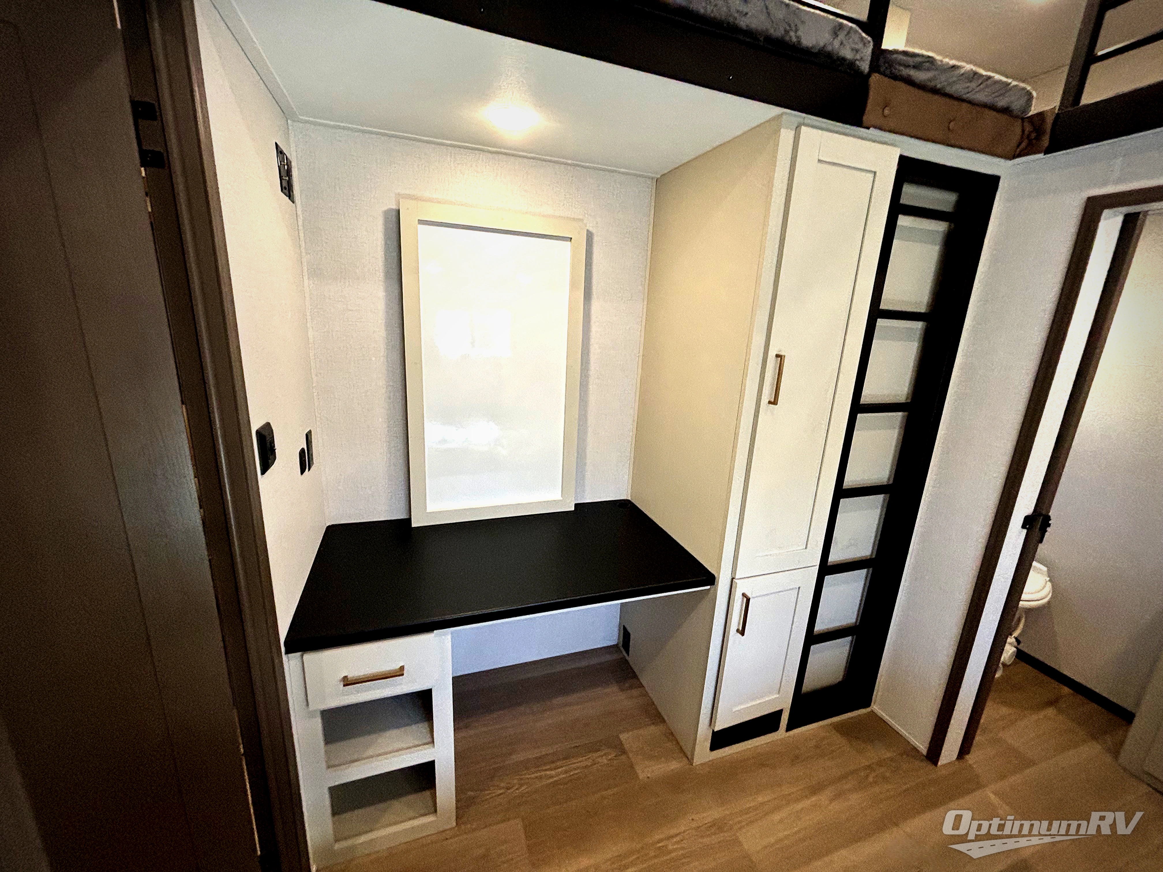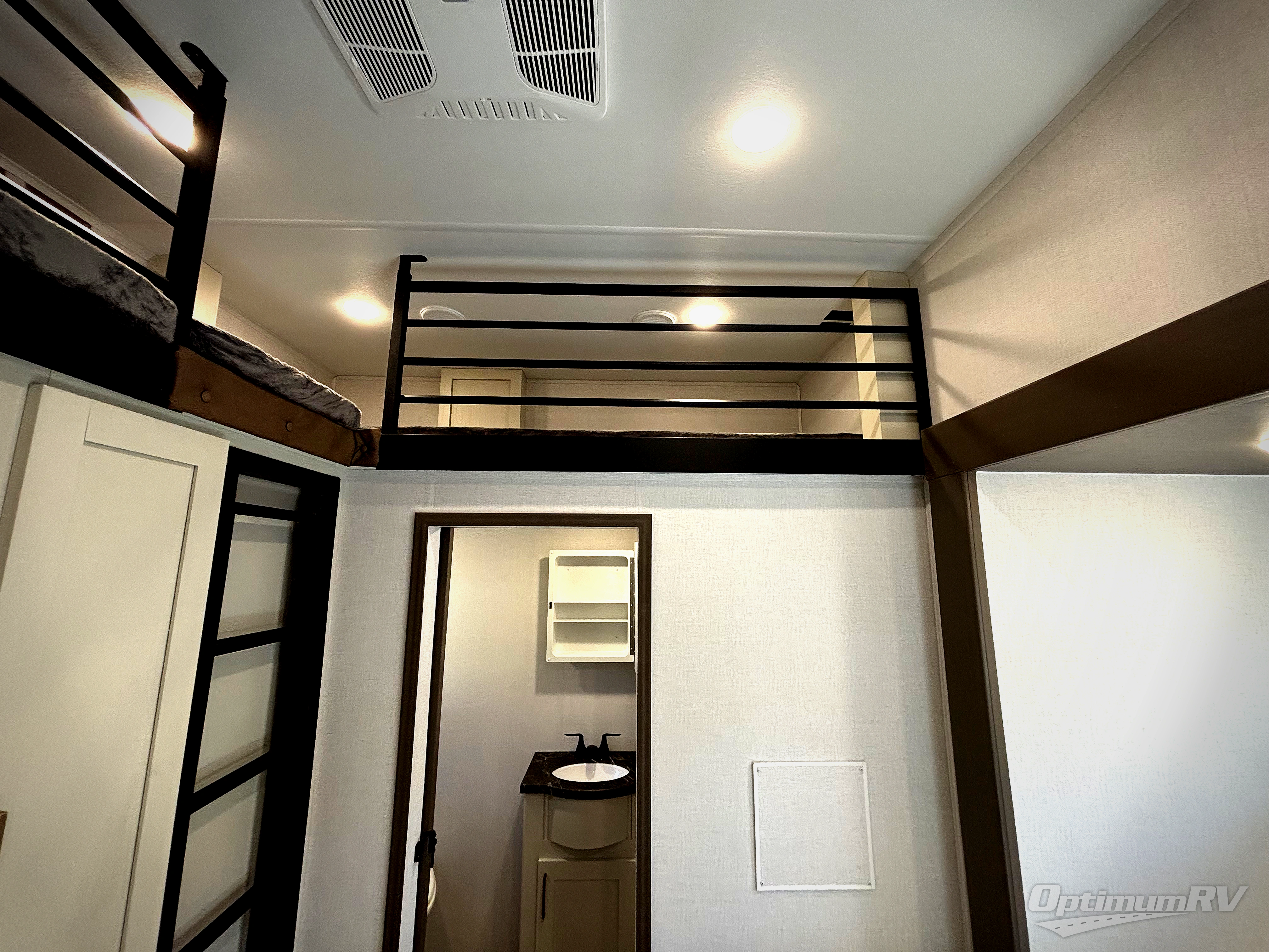 This is the perfect fifth wheel if you enjoy bringing along extra friends and family! You'll have the front private bedroom all to yourselves with a king bed slide out, a dresser with TV prep, plus a large front wardrobe and stackable washer/dryer prep. And a full bath is right next door for easy use. Your guests will love the rear den suite with a power tilt queen bed slide and a desk with a chair. There is also a full rear bath with its own exterior entry door and a loft area for even more sleeping or storage space. In the morning, you can all meet in the combined kitchen and living area that includes dual opposing slides for more space, a kitchen island, and a hutch for additional storage. There is also theater seating in direct view of the 50" TV and fireplace, along with a dinette with four chairs where you can dine together.