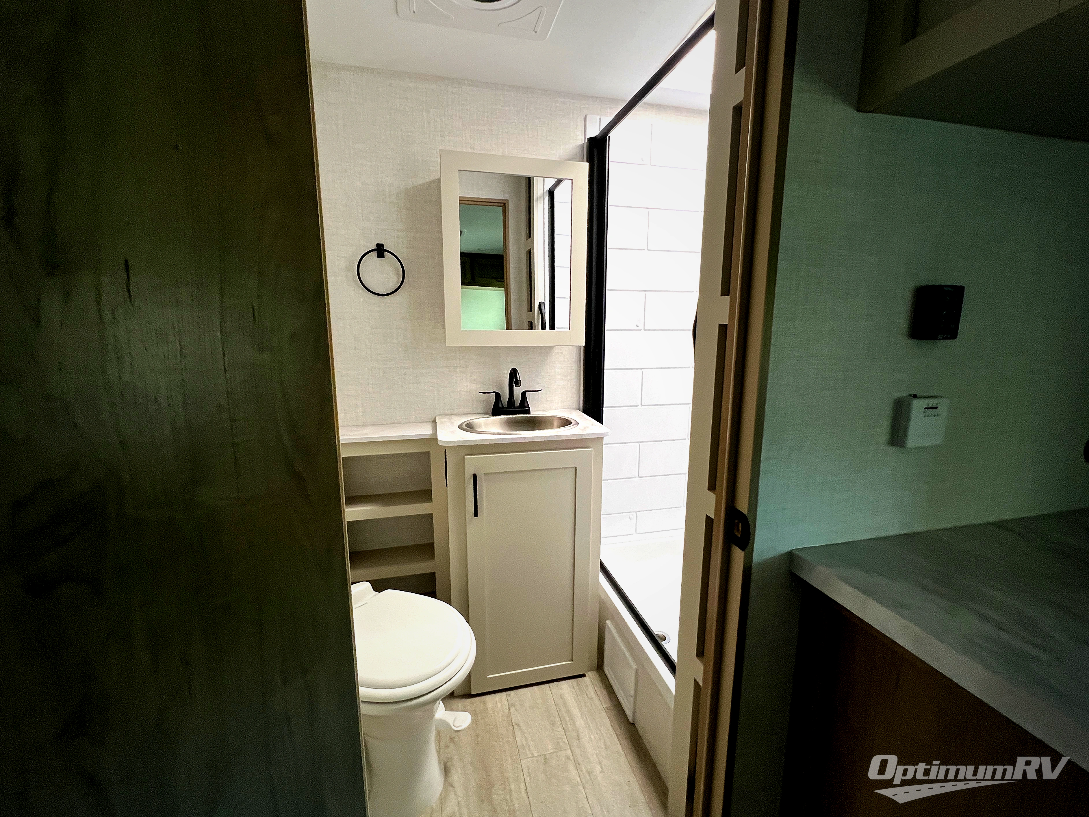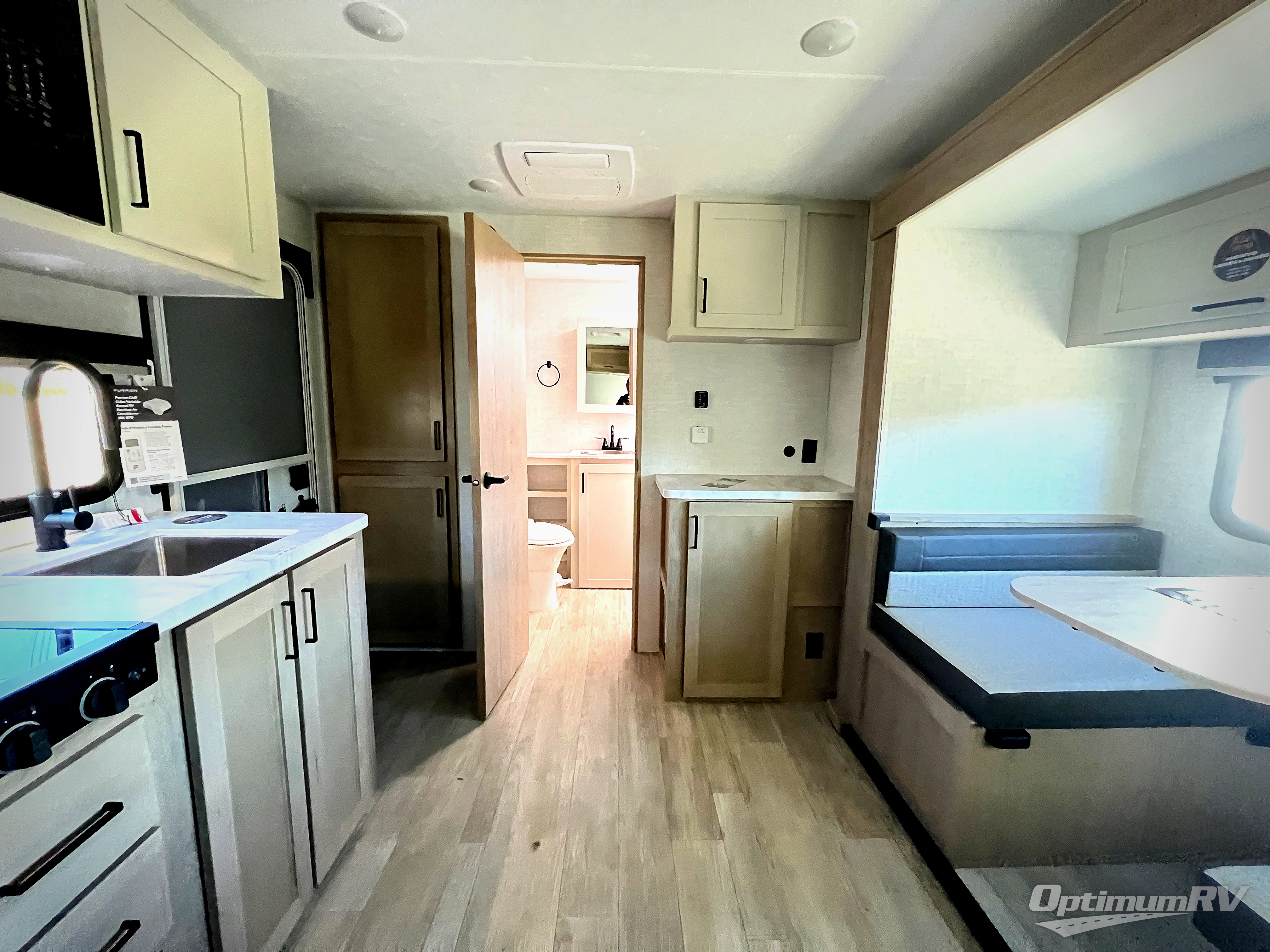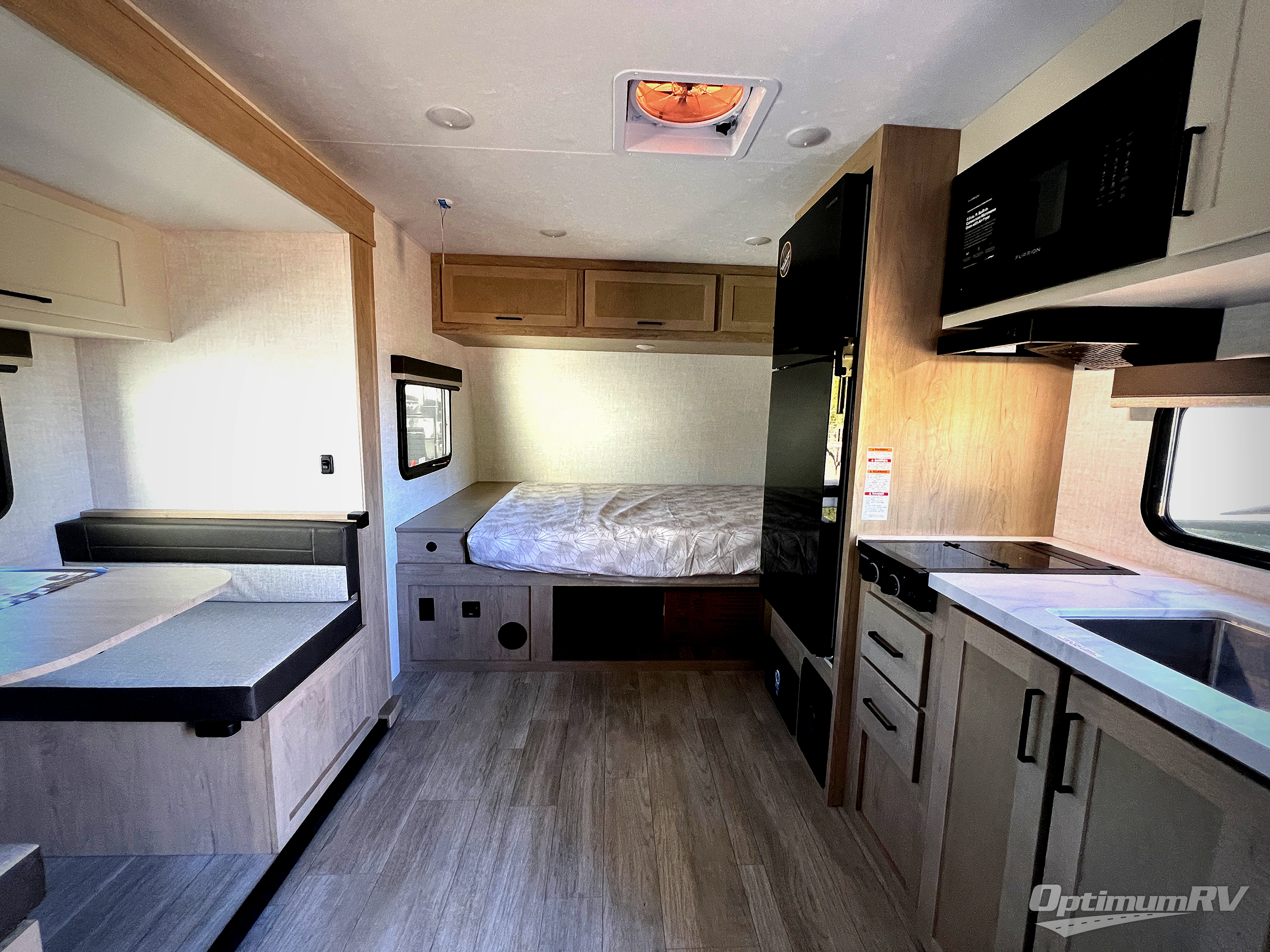 Time at the campground in this travel trailer will be time well spent. Once you arrive at your destination, you can put out the 14' electric awning, unpack the pass-through storage, then head inside for lunch. There is an air fryer convection microwave plus a dual burner cooktop to make meals each day, and the 10 cu. ft. 12V refrigerator will keep your food fresh. A legless dinette slide provides a place to dine together and even let a guest sleep over. If you're not needing the extra sleeping space, just choose the optional theater seating! You'll find the front queen bed will give you a great night's rest, and there is a full rear bath on board that will allow you to freshen up each morning.