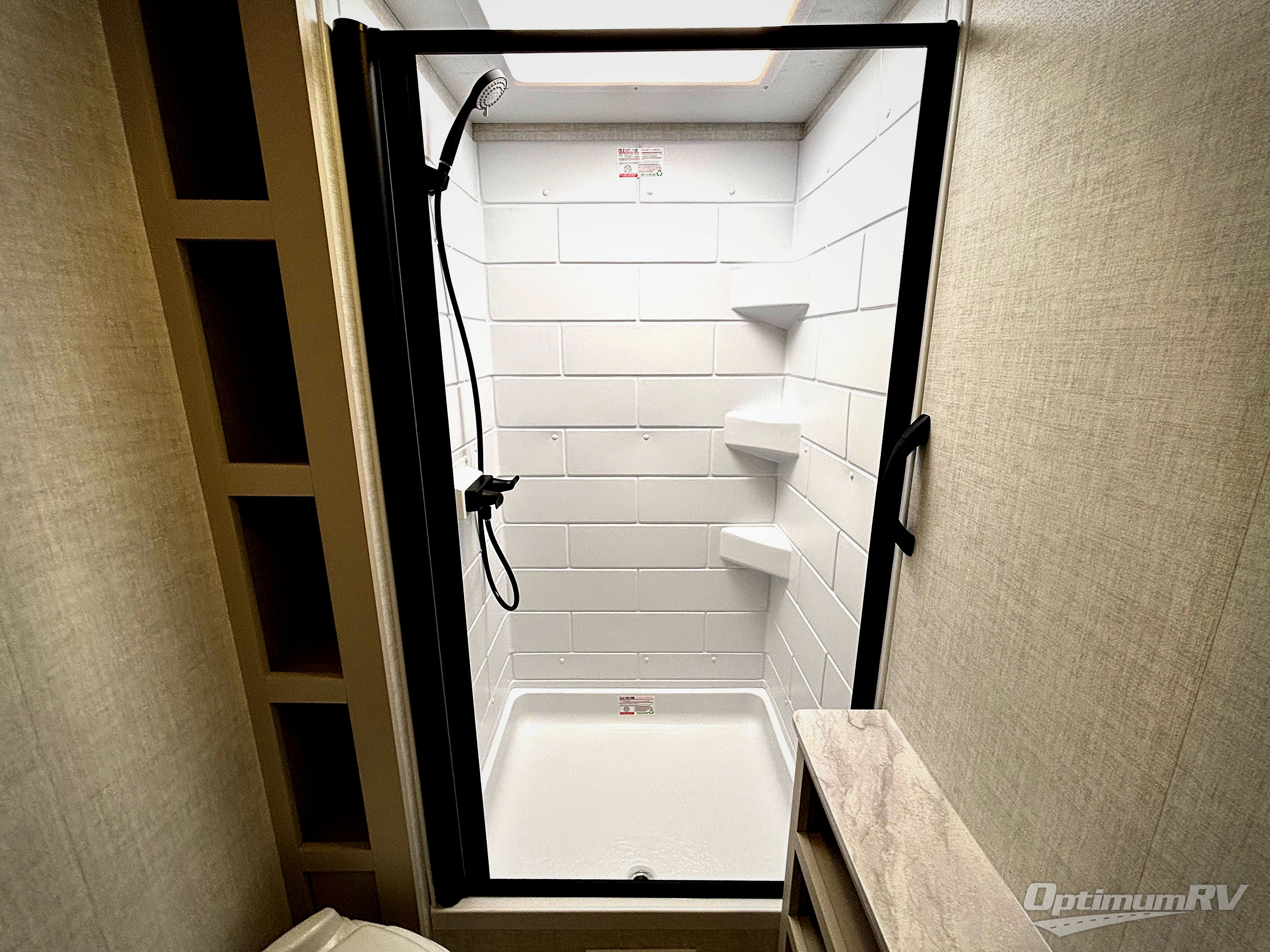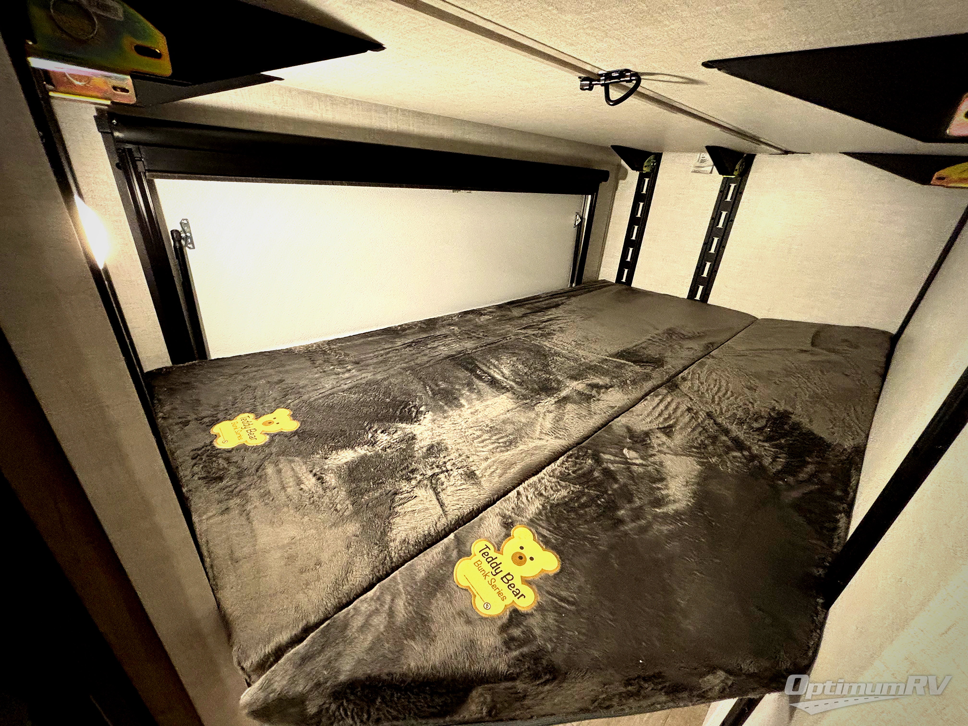 Time at the campground in this travel trailer will be time well spent. Once you arrive at your destination, you can put out the 16' electric awning, unpack the pass-through storage, then head inside for lunch. There is an air fryer convection microwave plus a dual burner cooktop to make meals each day, and the 10 cu. ft. 12V refrigerator will keep your food fresh. A legless dinette slide provides a place to dine together and even let a guest sleep over. If you're not needing the extra sleeping space, just choose the optional theater seating! You'll find the front queen bed will give you a great night's rest, and there is a full bath on board that will allow you to freshen up each morning. This unit includes the patent-pending repositionable EmberTrack E-Track bunk/storage system that allows for multiple single/double bunk configurations, depending on your needs.
