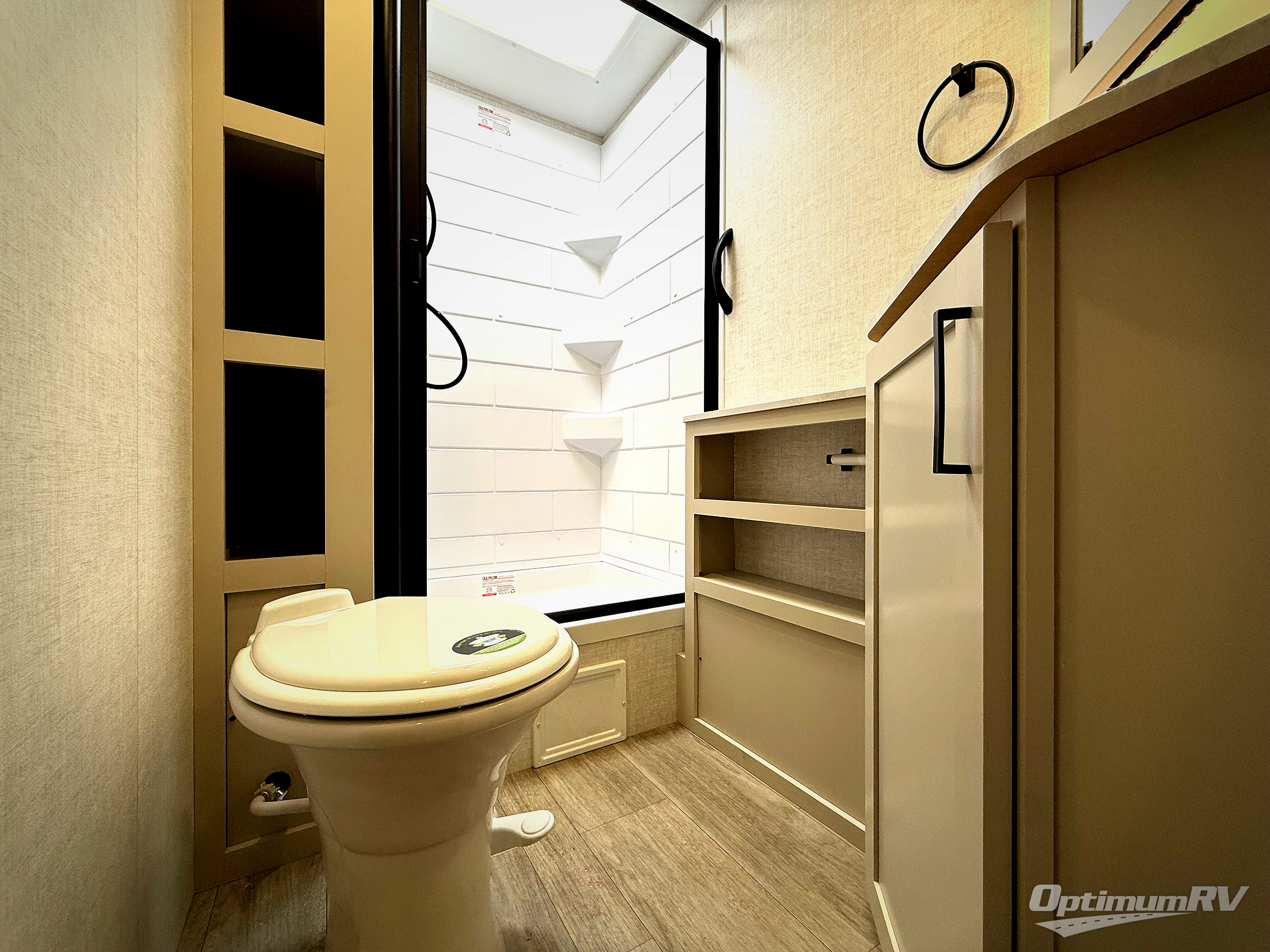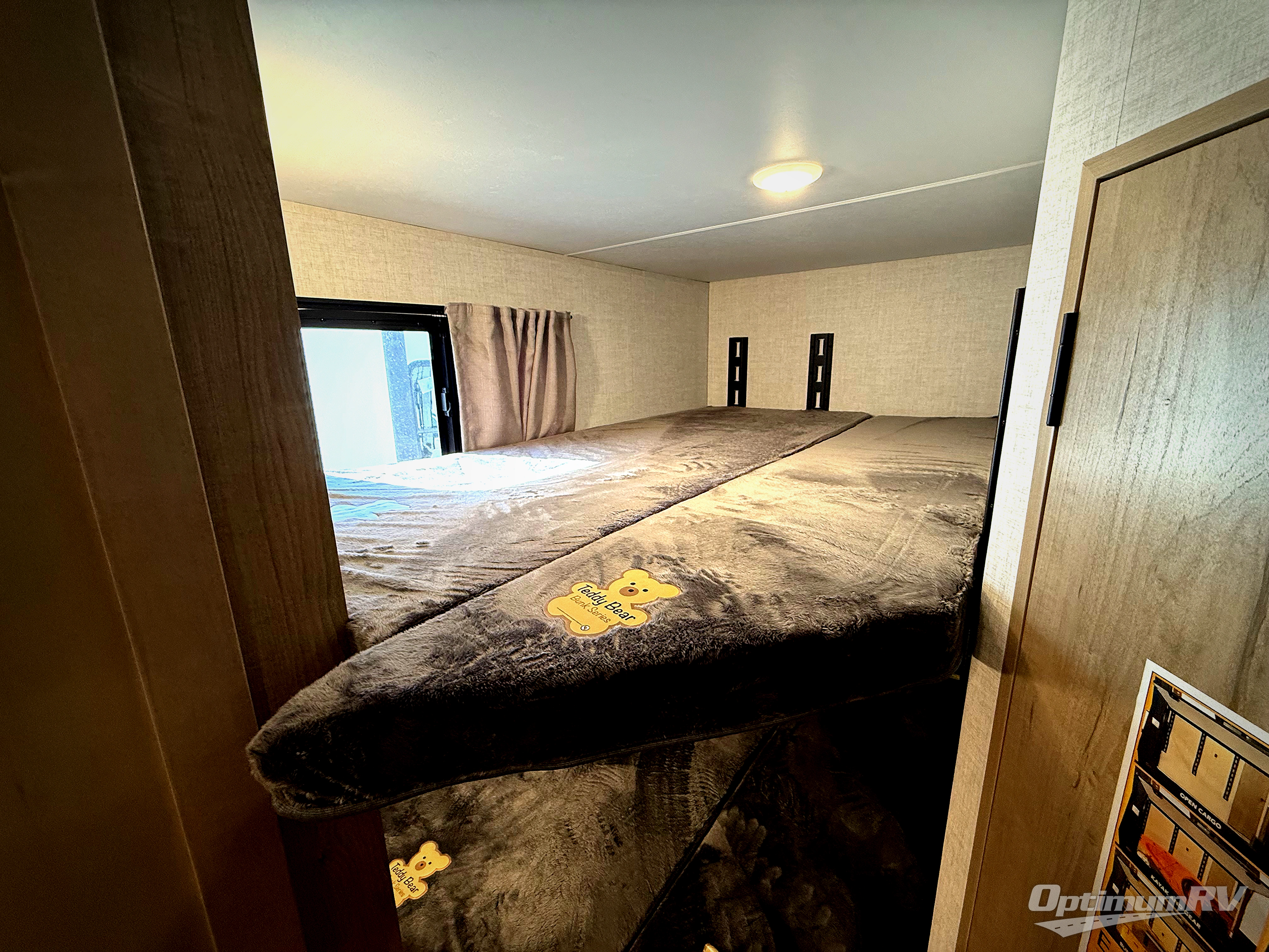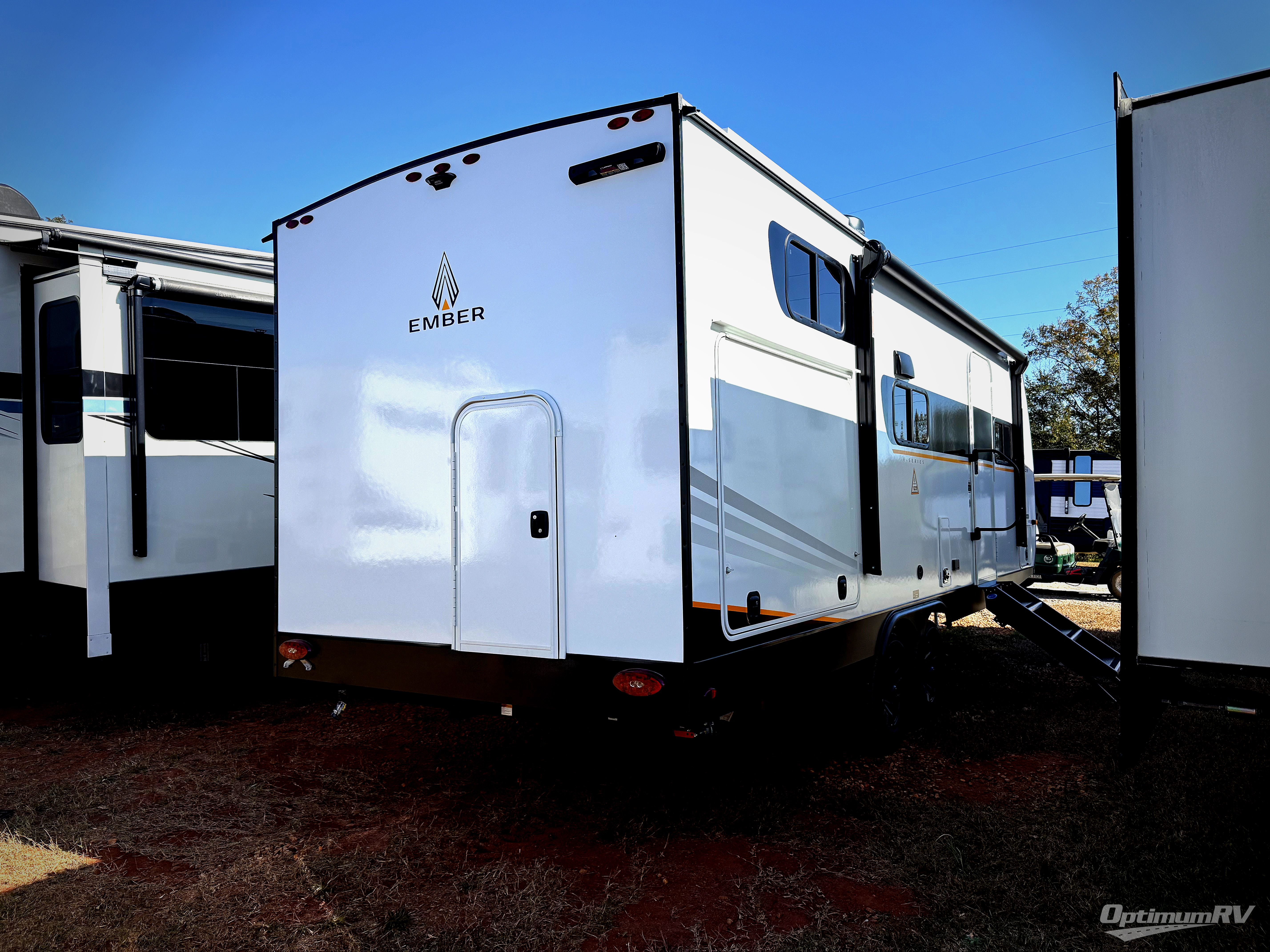 You'll love every minute spent in this spacious travel trailer that can sleep up to six. The patent-pending repositionable EmberTrack E-Track bunk/storage system includes 74" x 45" cargo space, and there are multiple single/double bunk configurations to fit your needs. The front walk-around true residential queen bed includes dual nightstands and dual wardrobes, plus a privacy curtain if you have guests staying over. This E-Series kitchen includes an air fryer convection microwave, a two burner cooktop, plus a breakfast bar with bar stools so you can visit with the chef as they cook meals. A legless dinette or optional theater seating will provide a place to dine, or you can take your plate outdoors to sit under the 14' power awning with a dimmable LED light. You'll also find a pass-through storage outside, along with a docking station and a kayak/bike storage door!