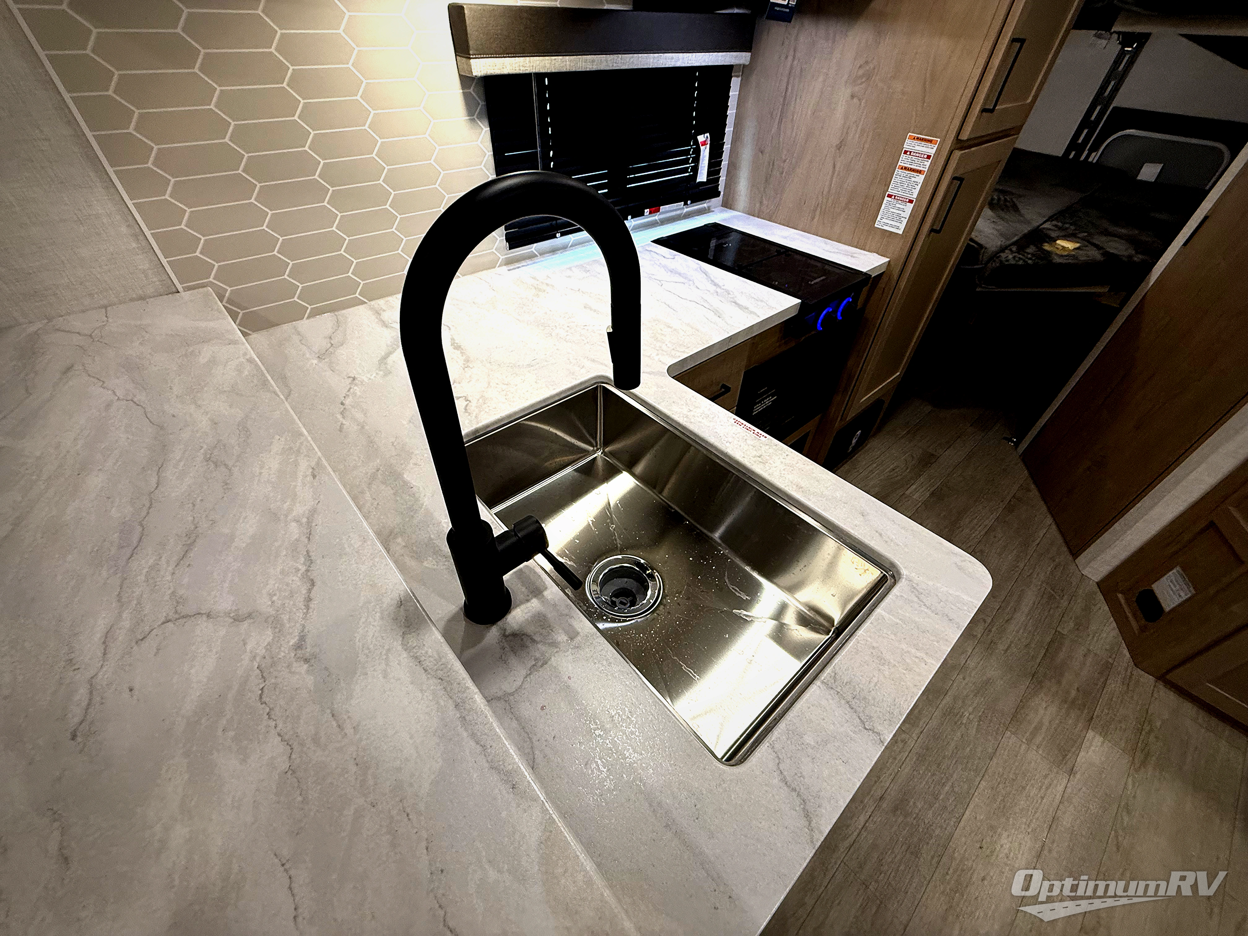 You'll love every minute spent in this spacious travel trailer that can sleep up to six. The patent-pending repositionable EmberTrack E-Track bunk/storage system includes 74" x 45" cargo space, and there are multiple single/double bunk configurations to fit your needs. The front walk-around true residential queen bed includes dual nightstands and dual wardrobes, plus a privacy curtain if you have guests staying over. This E-Series kitchen includes an air fryer convection microwave, a two burner cooktop, plus a breakfast bar with bar stools so you can visit with the chef as they cook meals. A legless dinette or optional theater seating will provide a place to dine, or you can take your plate outdoors to sit under the 14' power awning with a dimmable LED light. You'll also find a pass-through storage outside, along with a docking station and a kayak/bike storage door!