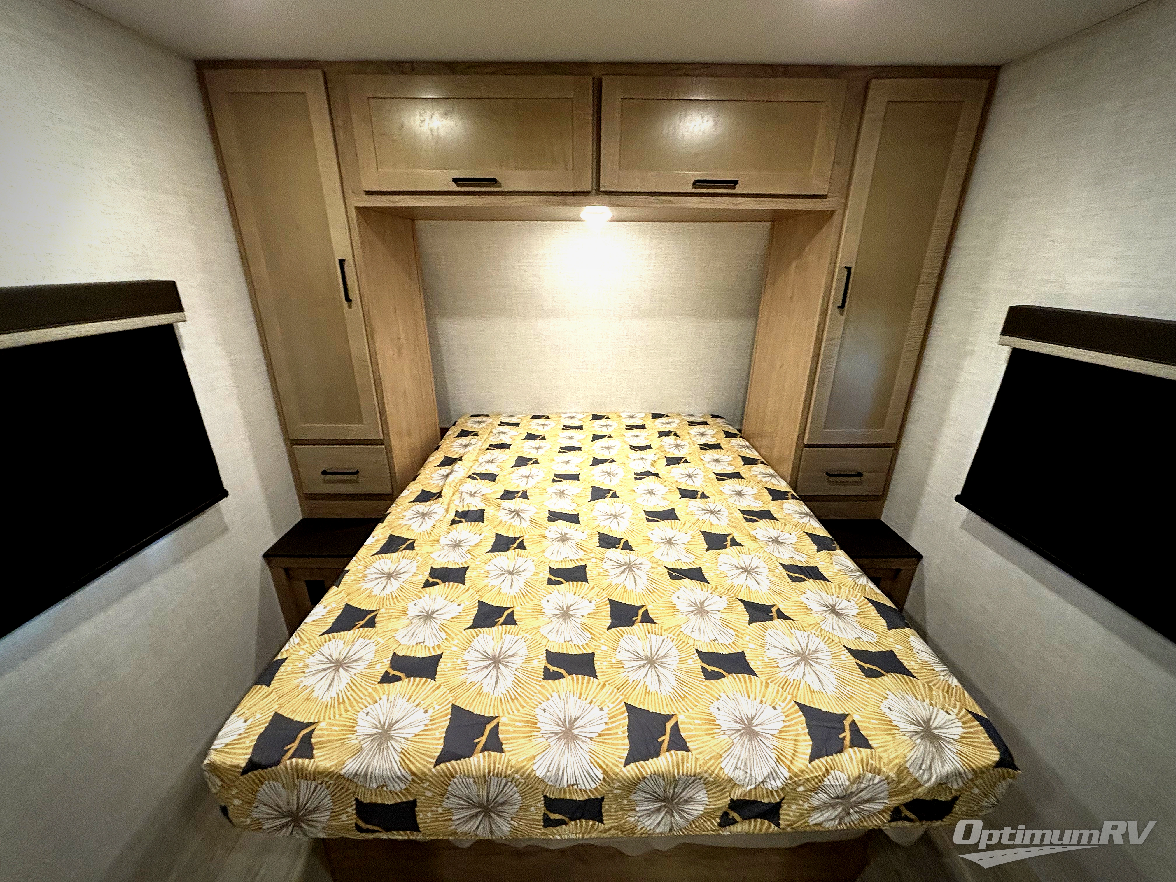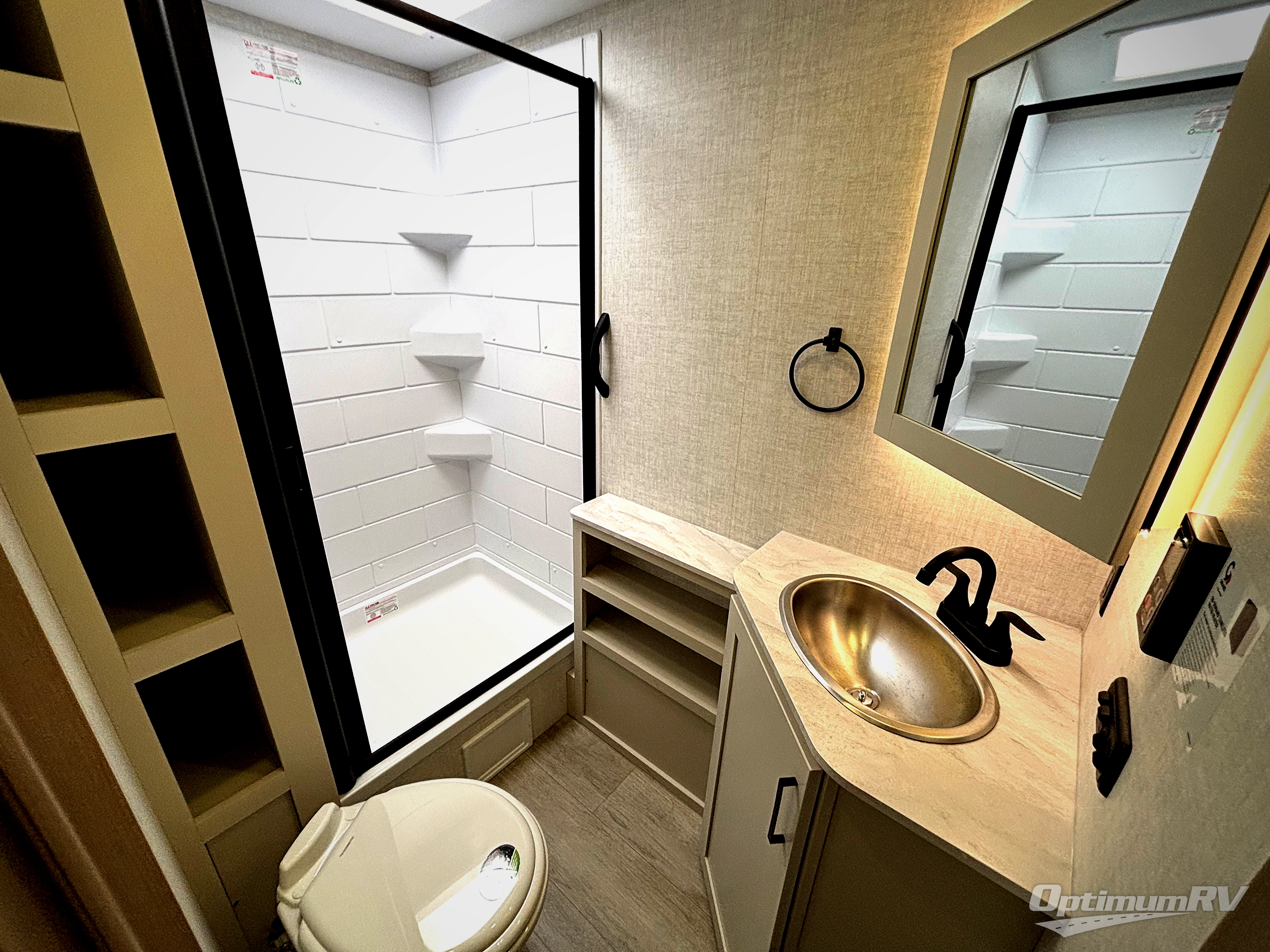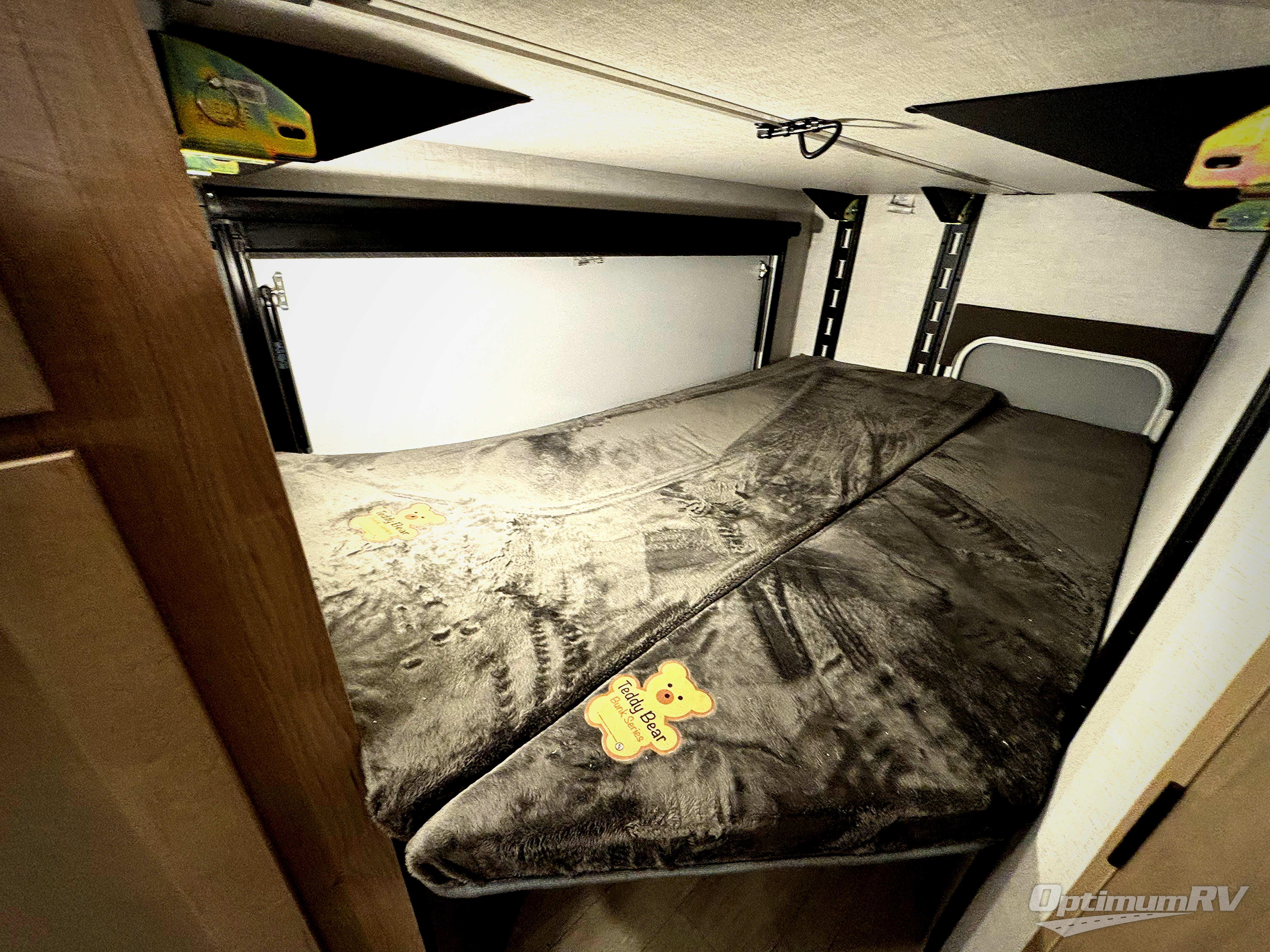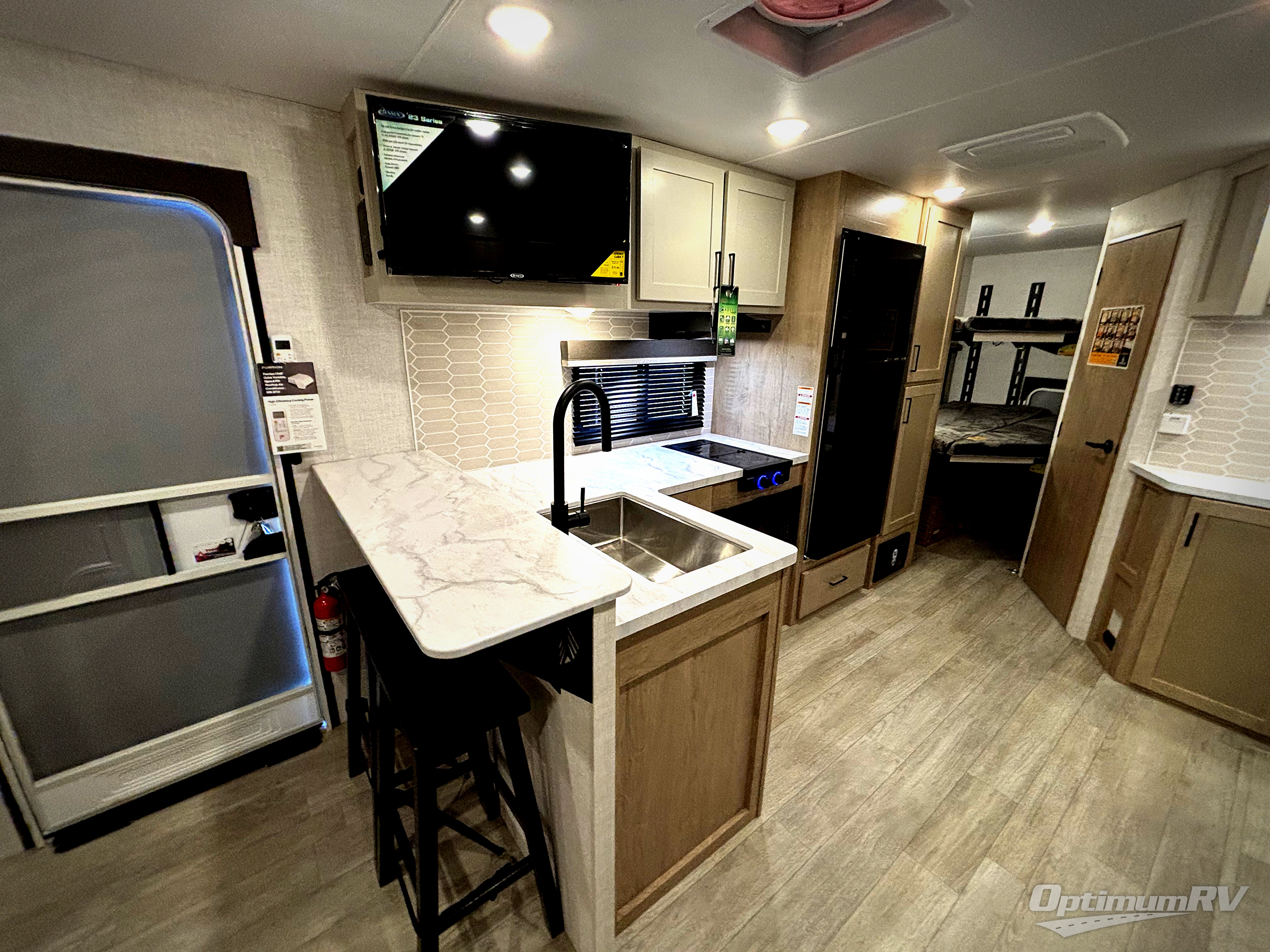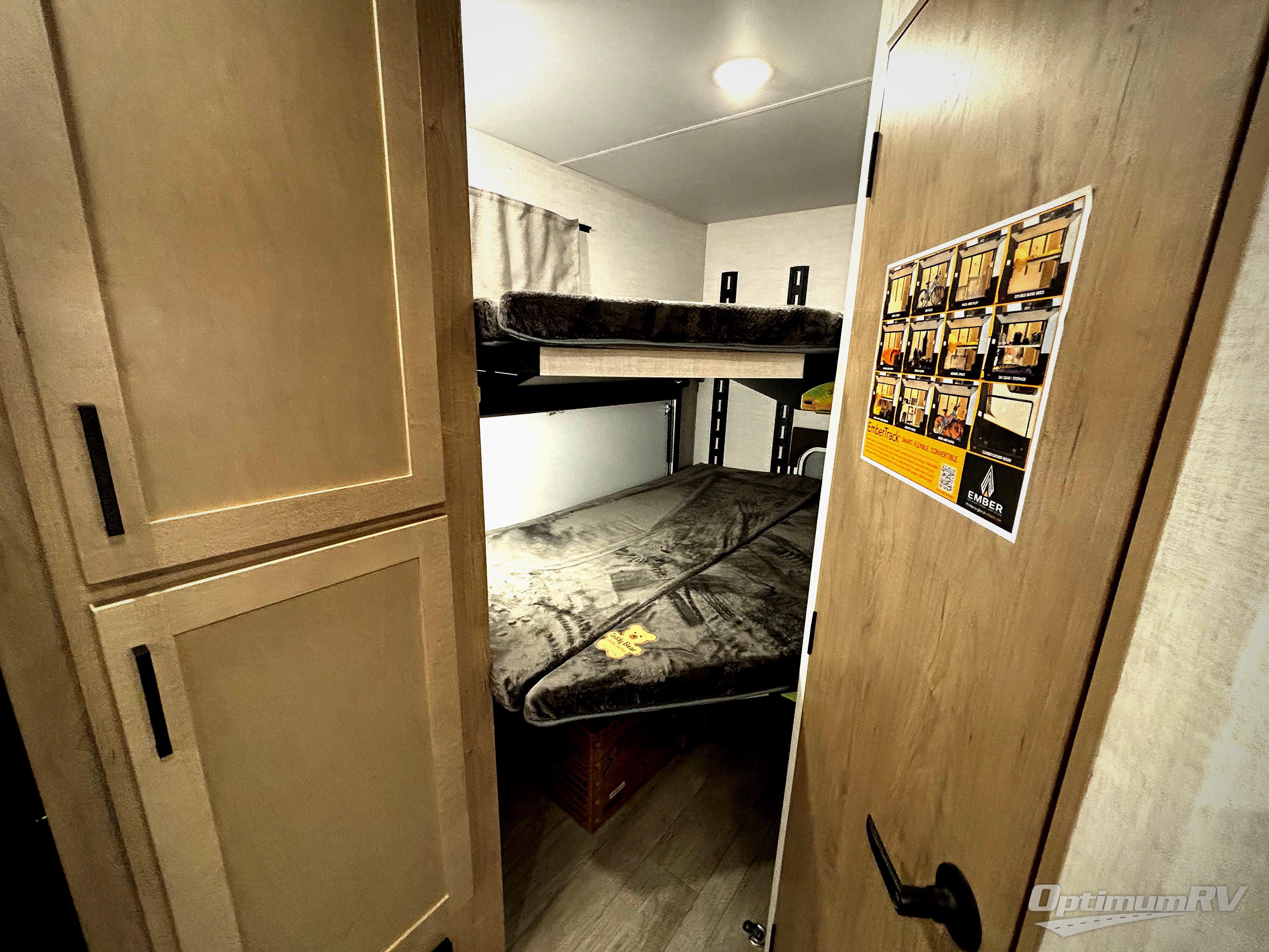 This model resembles 22ETS, but you'll enjoy added theater seating and a larger exterior length for more interior space! The patent-pending repositionable EmberTrack E-Track bunk/storage system includes 74" x 45" cargo space, and there are multiple single/double bunk configurations to fit your needs. The front walk-around true residential queen bed includes dual nightstands and dual wardrobes, and you'll appreciate sliding doors that makes a private bedroom. This E-Series kitchen includes an air fryer convection microwave, a two burner cooktop, plus a breakfast bar with bar stools so you can visit with the chef as they cook meals. A legless dinette will provide a place to dine, or you can take your plate outdoors to sit under the 18' power awning with a dimmable LED light. You'll also find a pass-through storage outside, along with a docking station and a kayak/bike storage door!