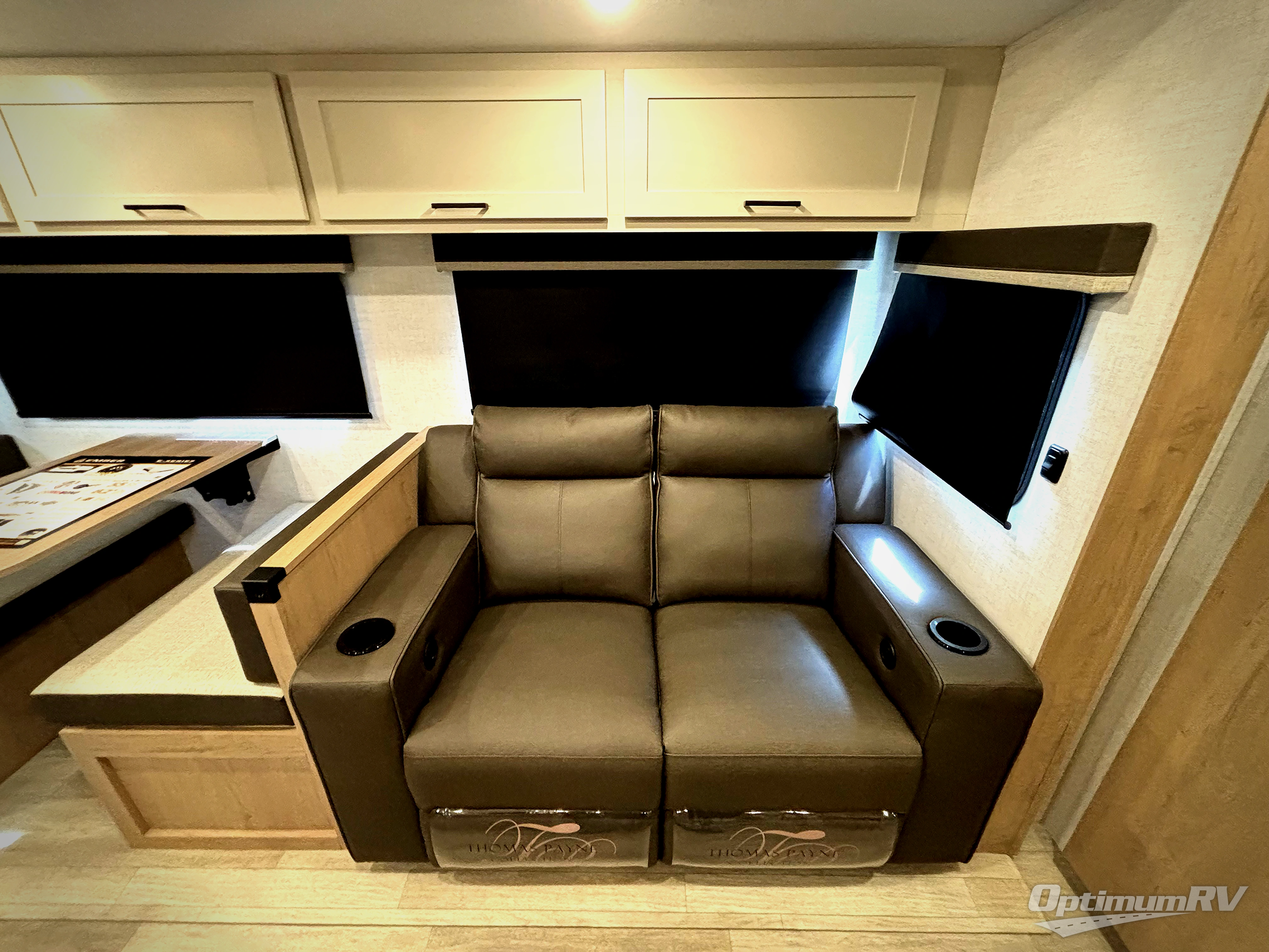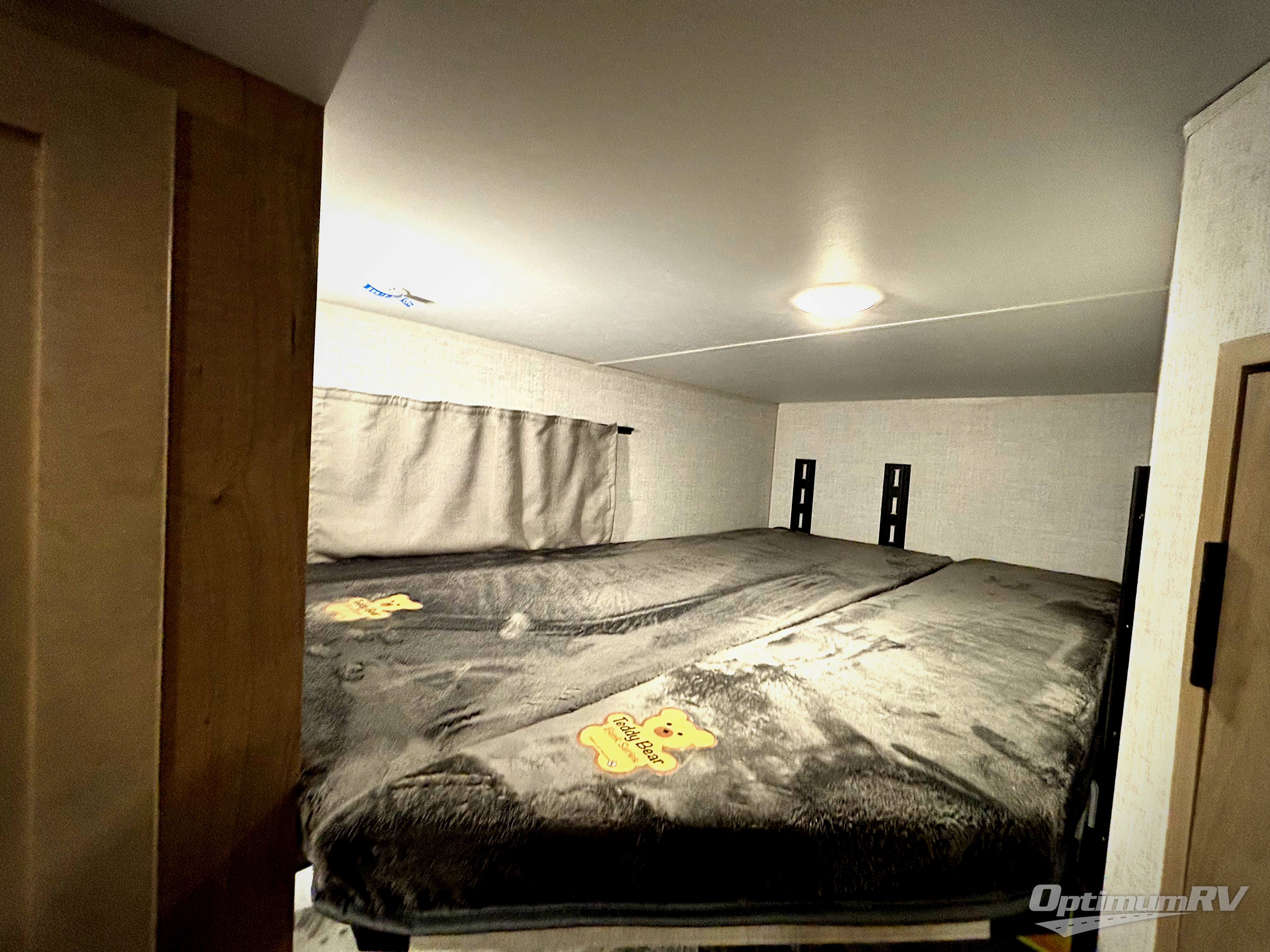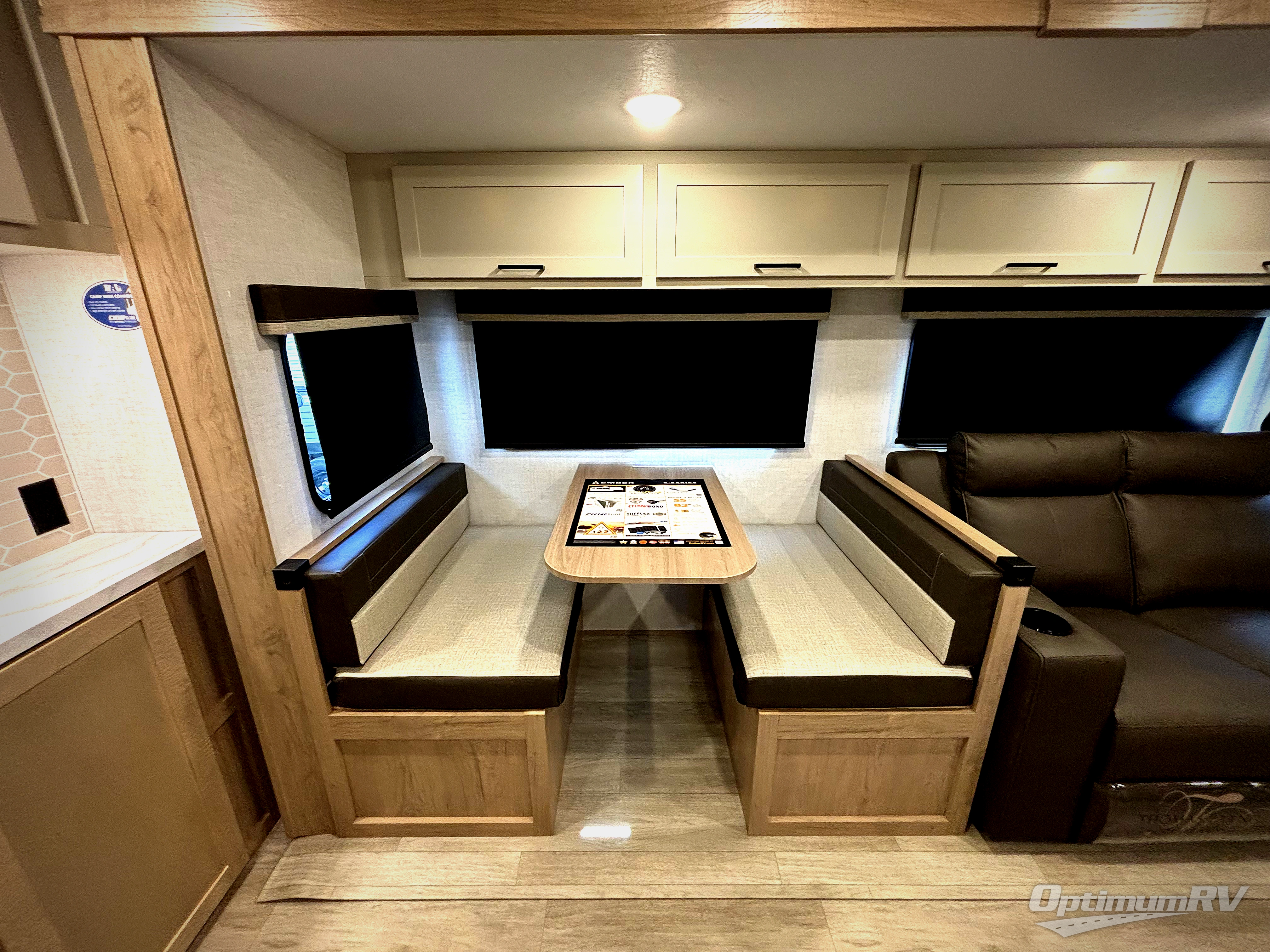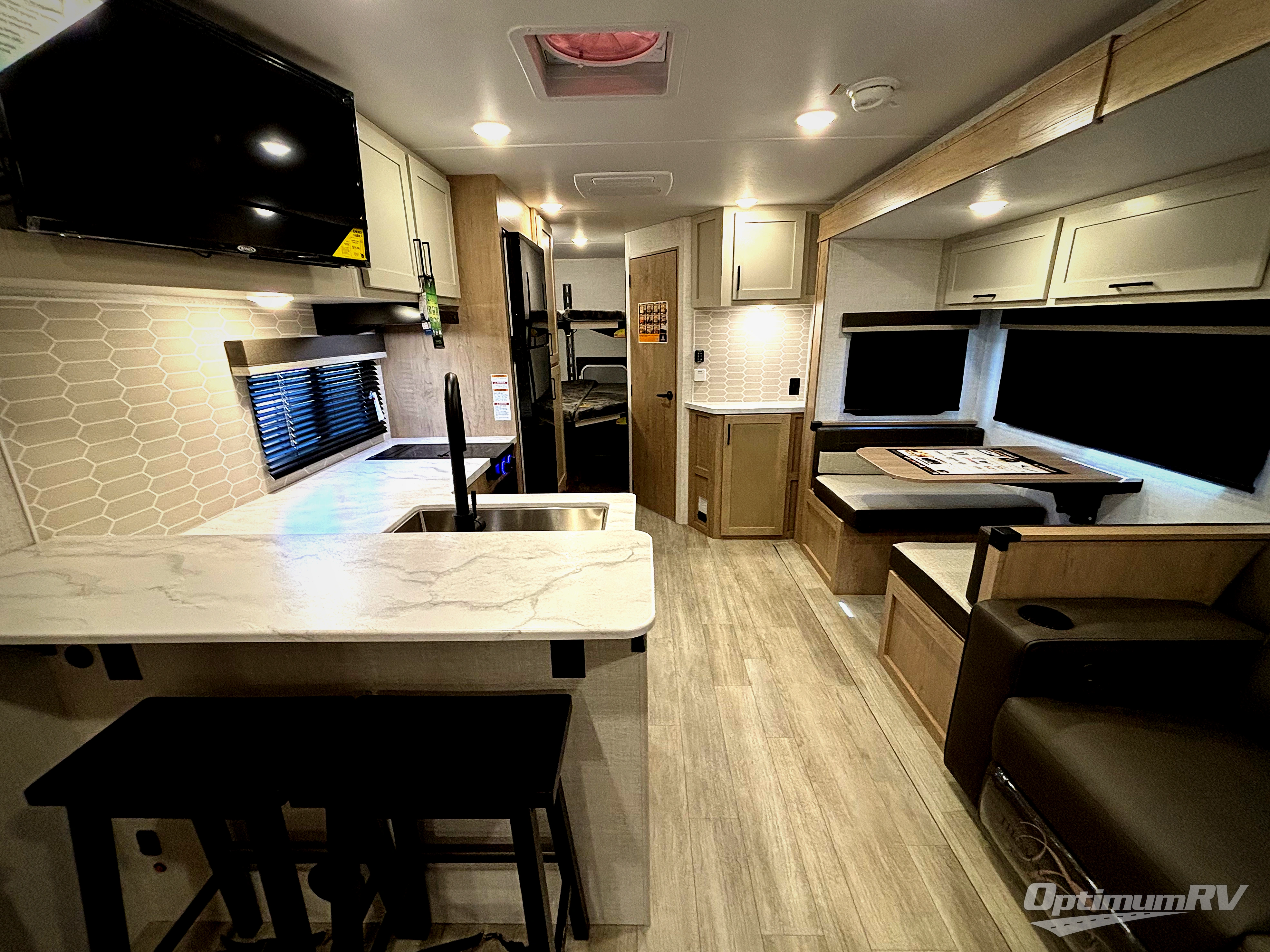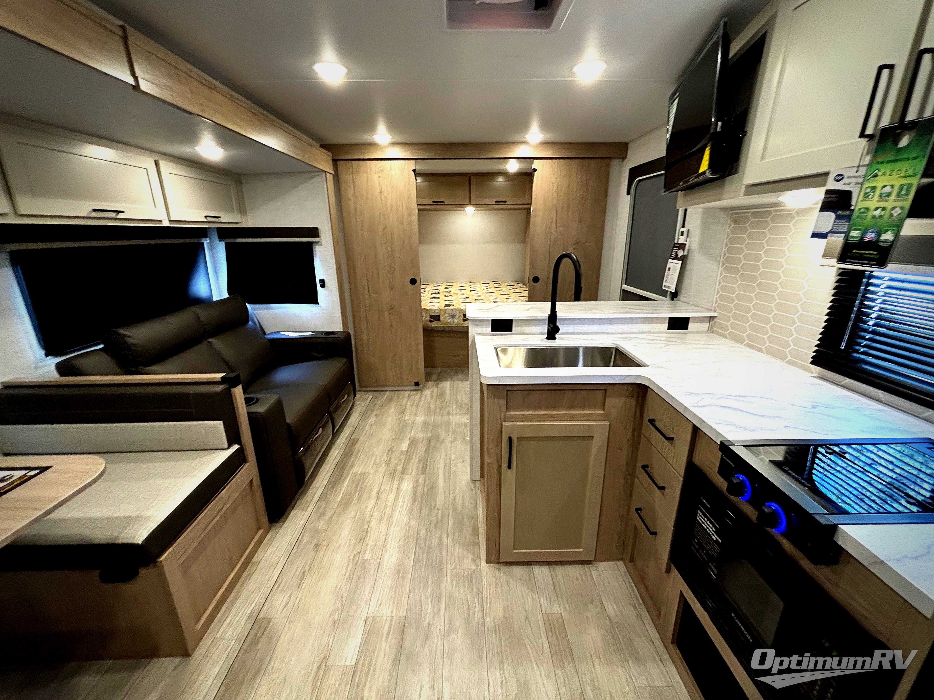 This model resembles 22ETS, but you'll enjoy added theater seating and a larger exterior length for more interior space! The patent-pending repositionable EmberTrack E-Track bunk/storage system includes 74" x 45" cargo space, and there are multiple single/double bunk configurations to fit your needs. The front walk-around true residential queen bed includes dual nightstands and dual wardrobes, and you'll appreciate sliding doors that makes a private bedroom. This E-Series kitchen includes an air fryer convection microwave, a two burner cooktop, plus a breakfast bar with bar stools so you can visit with the chef as they cook meals. A legless dinette will provide a place to dine, or you can take your plate outdoors to sit under the 18' power awning with a dimmable LED light. You'll also find a pass-through storage outside, along with a docking station and a kayak/bike storage door!
