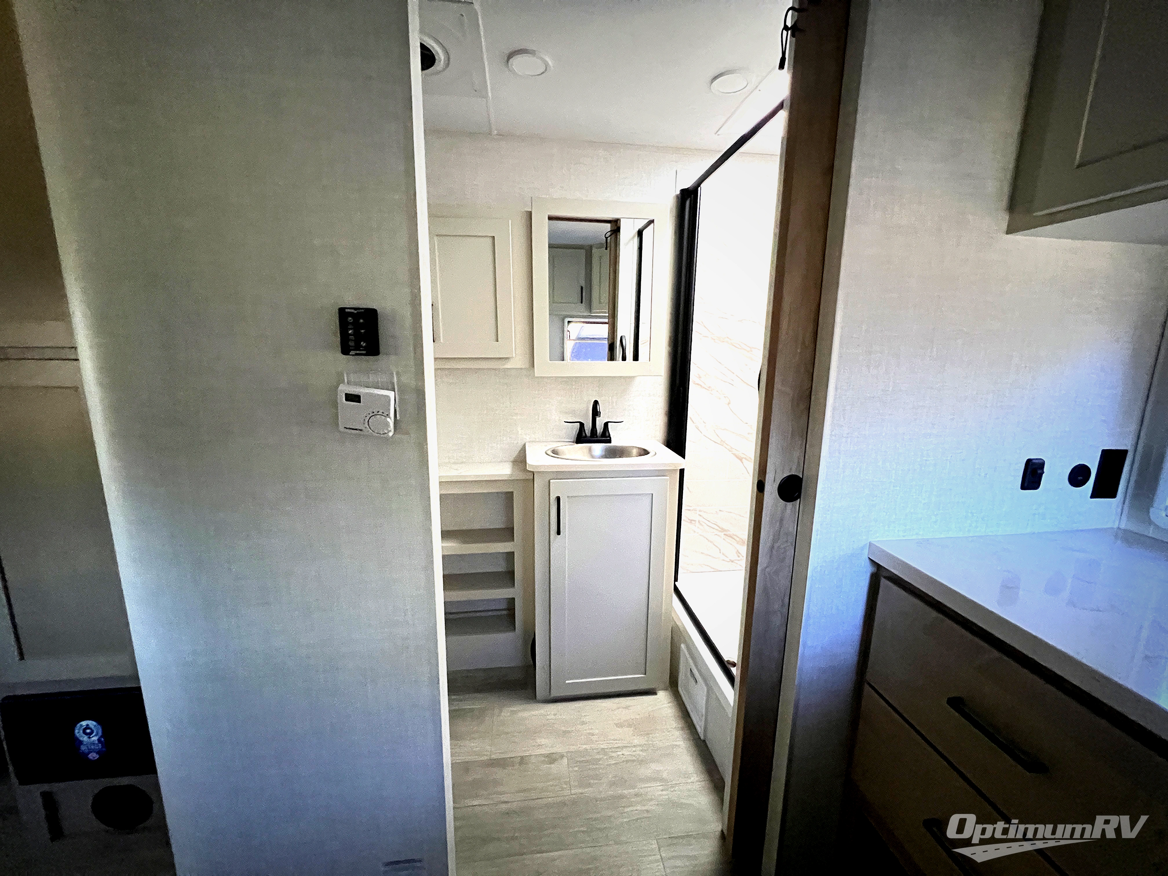Pack your bags and head to your favorite camping spot in this front bedroom travel trailer! You will sleep soundly on the walk-around residential queen bed with an optional Murphy bed, and there are dual nightstands and dual wardrobes to keep your things tidy. The rear of the unit is shared with the full bath and the kitchen countertop with a large stainless-steel sink, and you'll find the dual-burner LP cooktop and air fryer convection microwave within the large slide out! There is also theater seating with rotating side tables here, which is in perfect view of the HDTV for movie nights. And you're going to love the EmberFlex Dinesk, dining table/bar/desktop that can be reconfigured to fit your needs best!