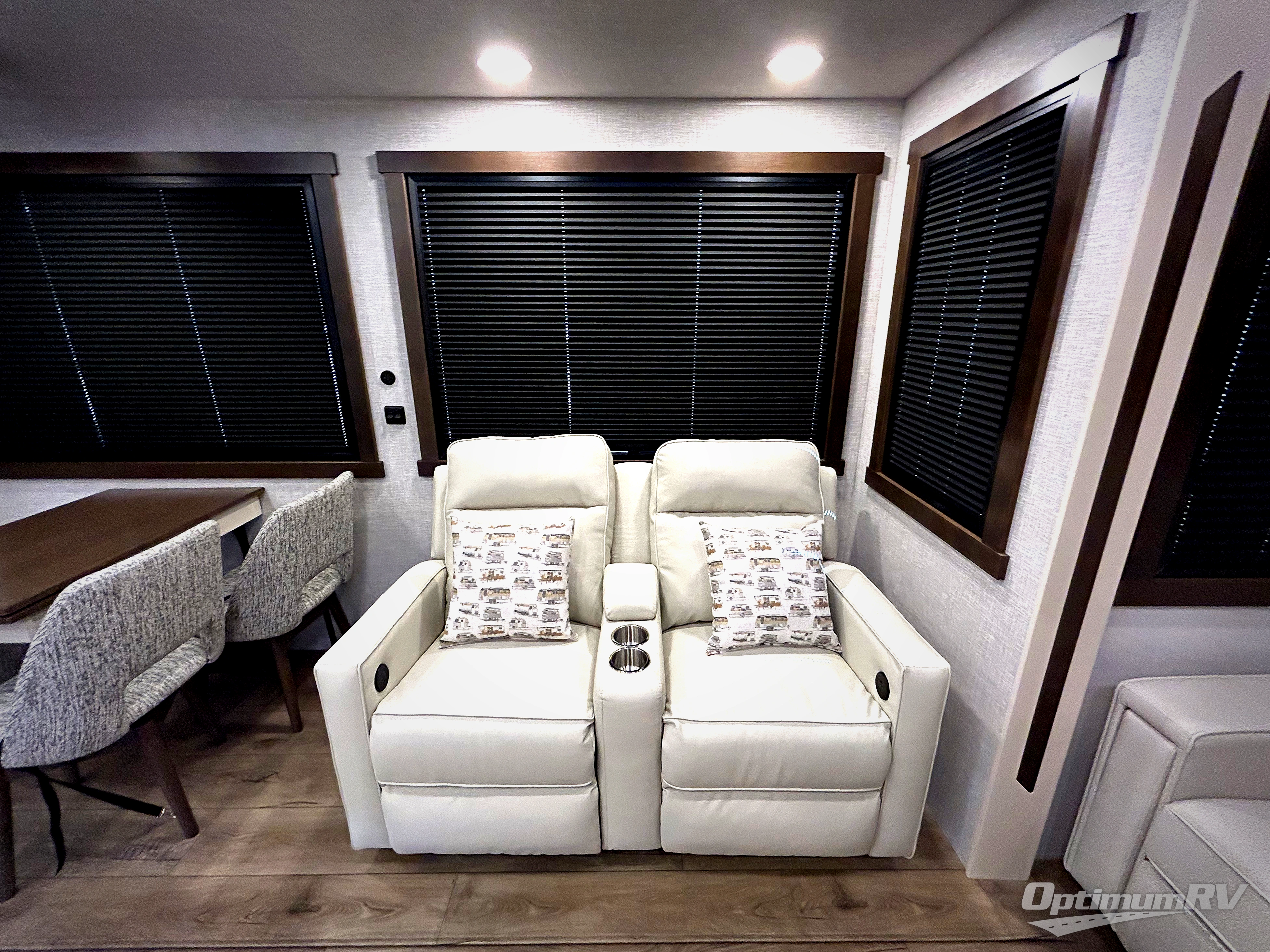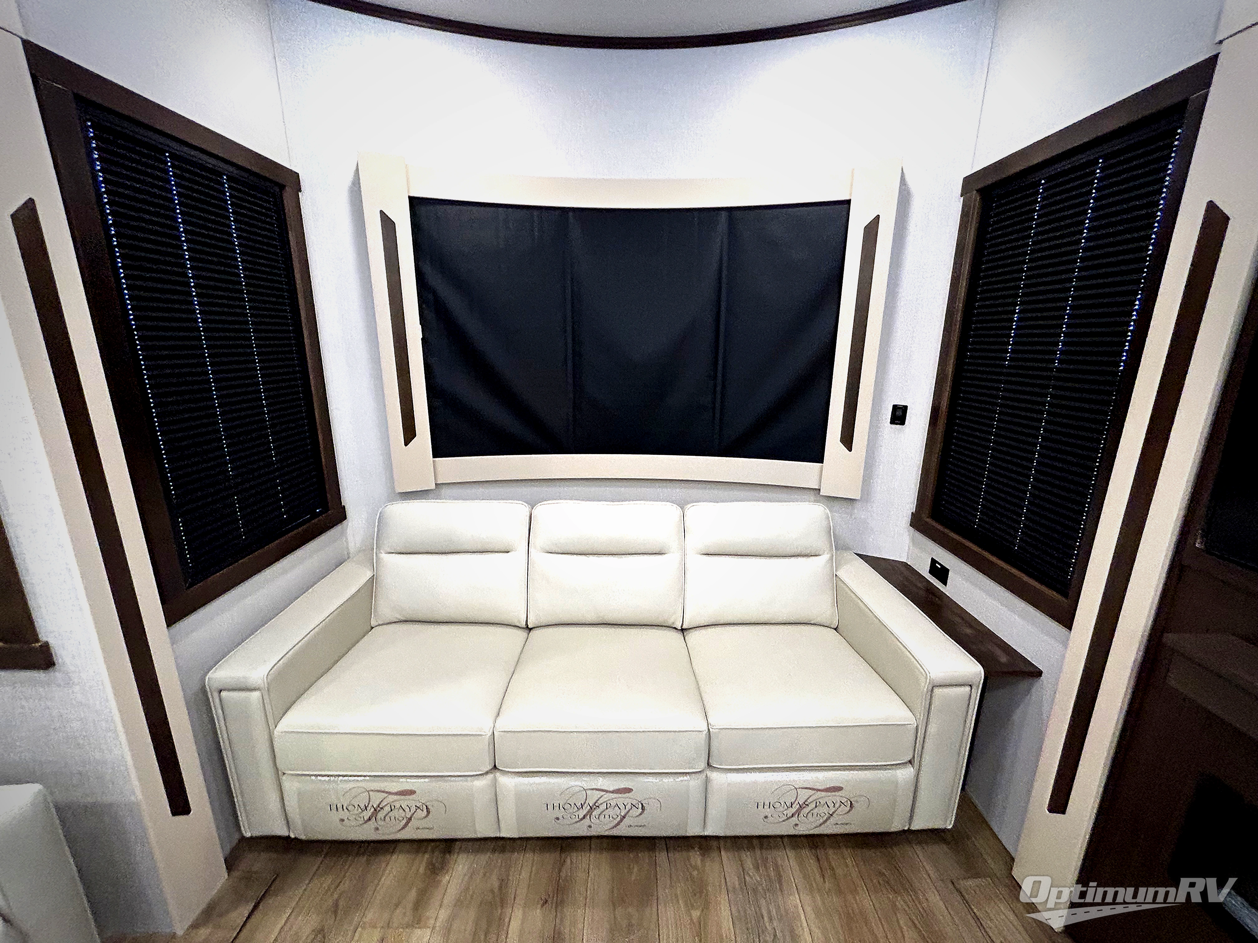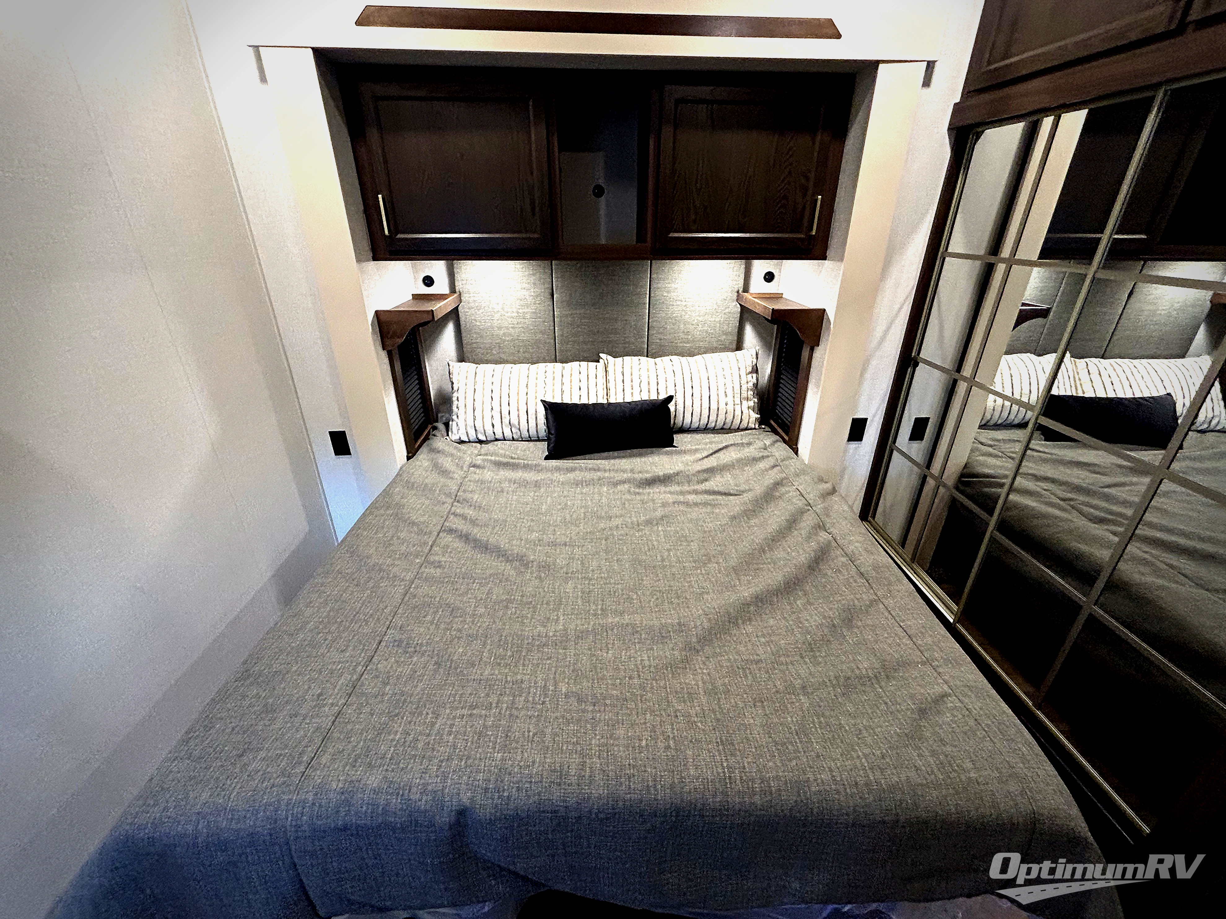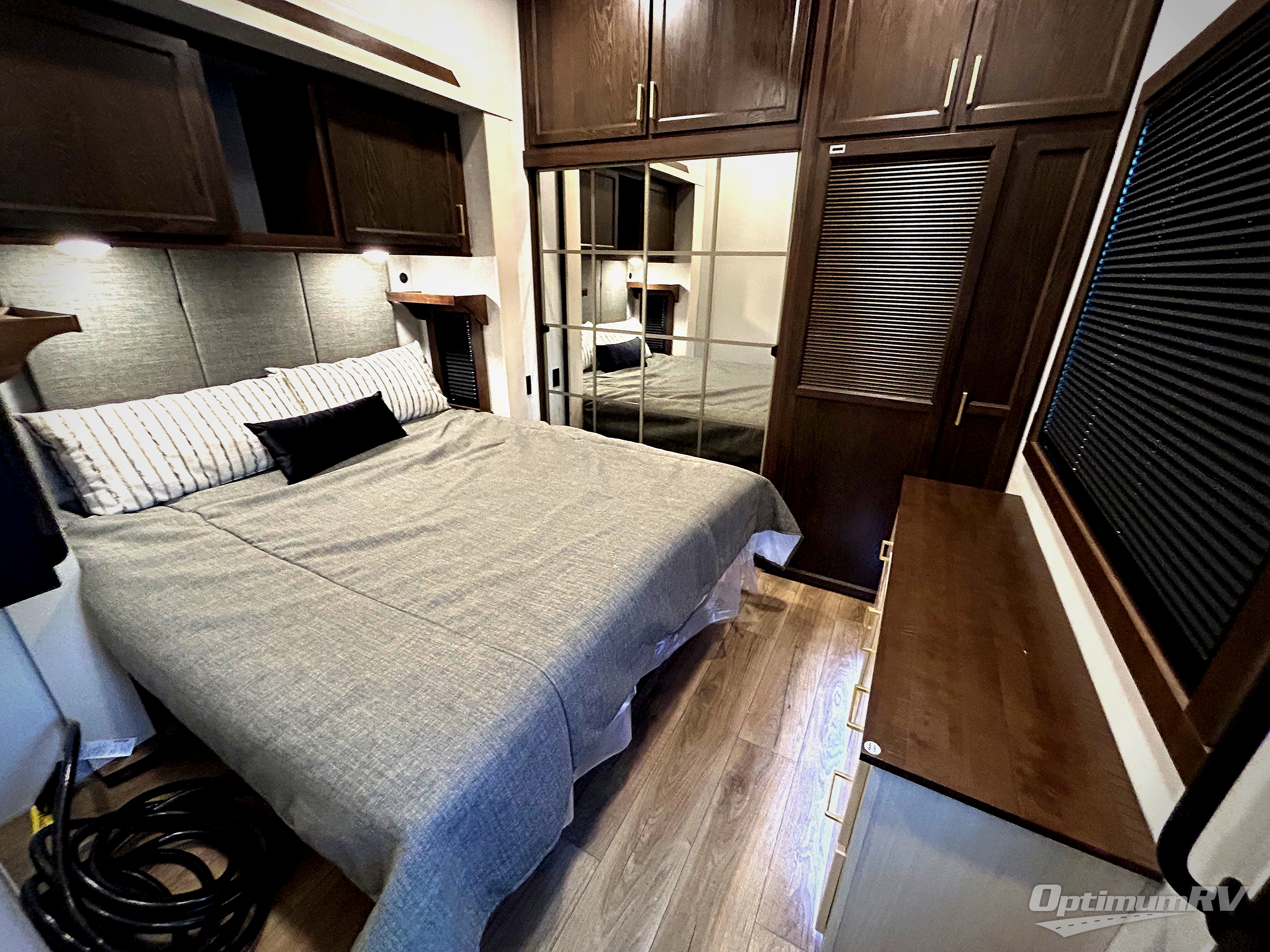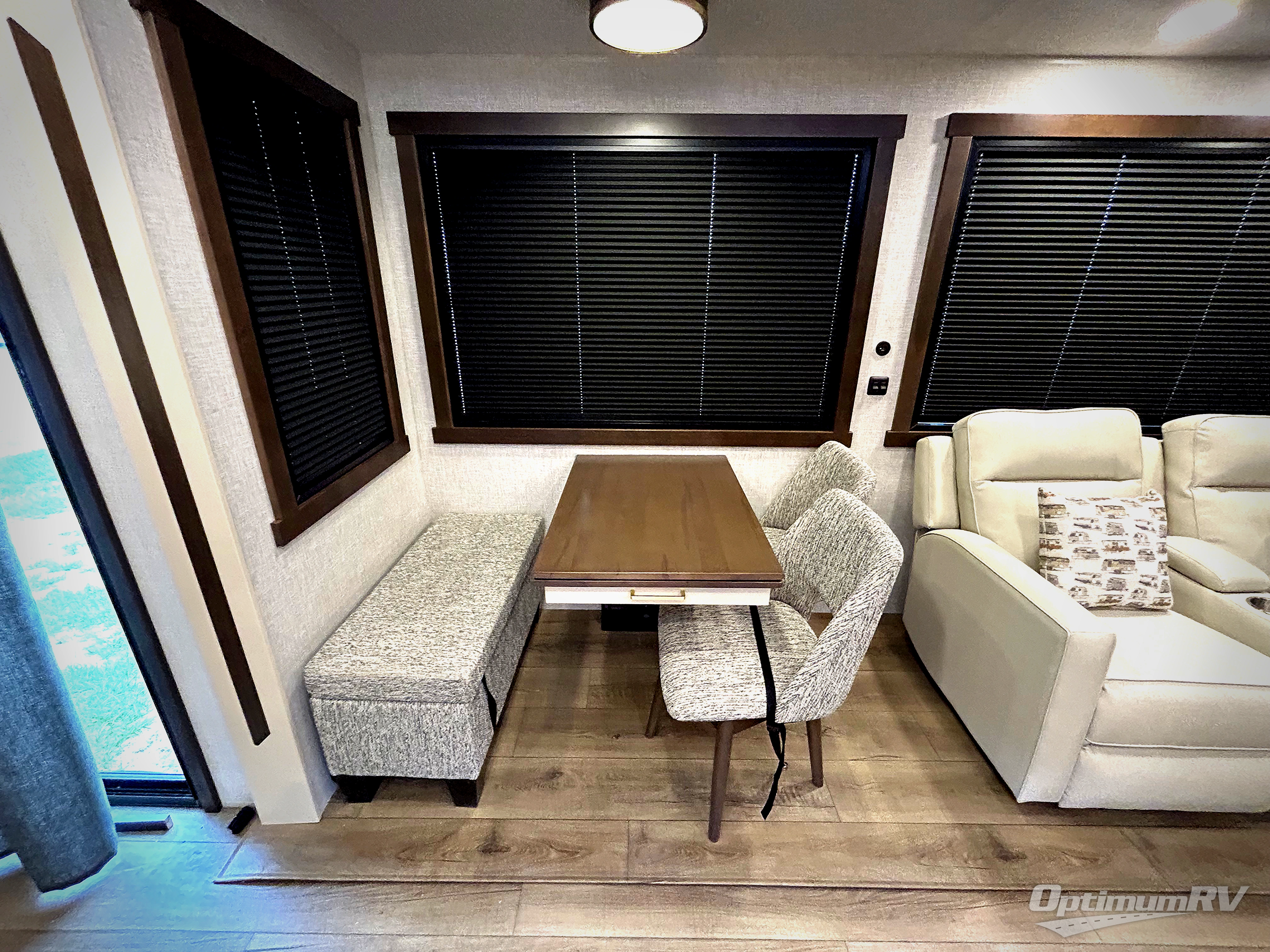 You're sure to feel right at home in this triple slide out destination trailer for four happy campers. The front private bedroom includes a king bed slide out, a large front wardrobe, and a dresser to keep your clothes organized. The full bath includes a shower skylight, extra storage for linens, and a Create-A-Breeze fan to keep air moving. The combined middle kitchen and living area will be a favorite place to visit together with its kitchen island and fold-down breakfast counter, free-standing table with an extension and an ottoman, and power theater seating. There is also a Murphy pantry behind the swivel mounted TV and fireplace for convenient storage, and a hide-a-bed sofa provides guests a place to sleep!