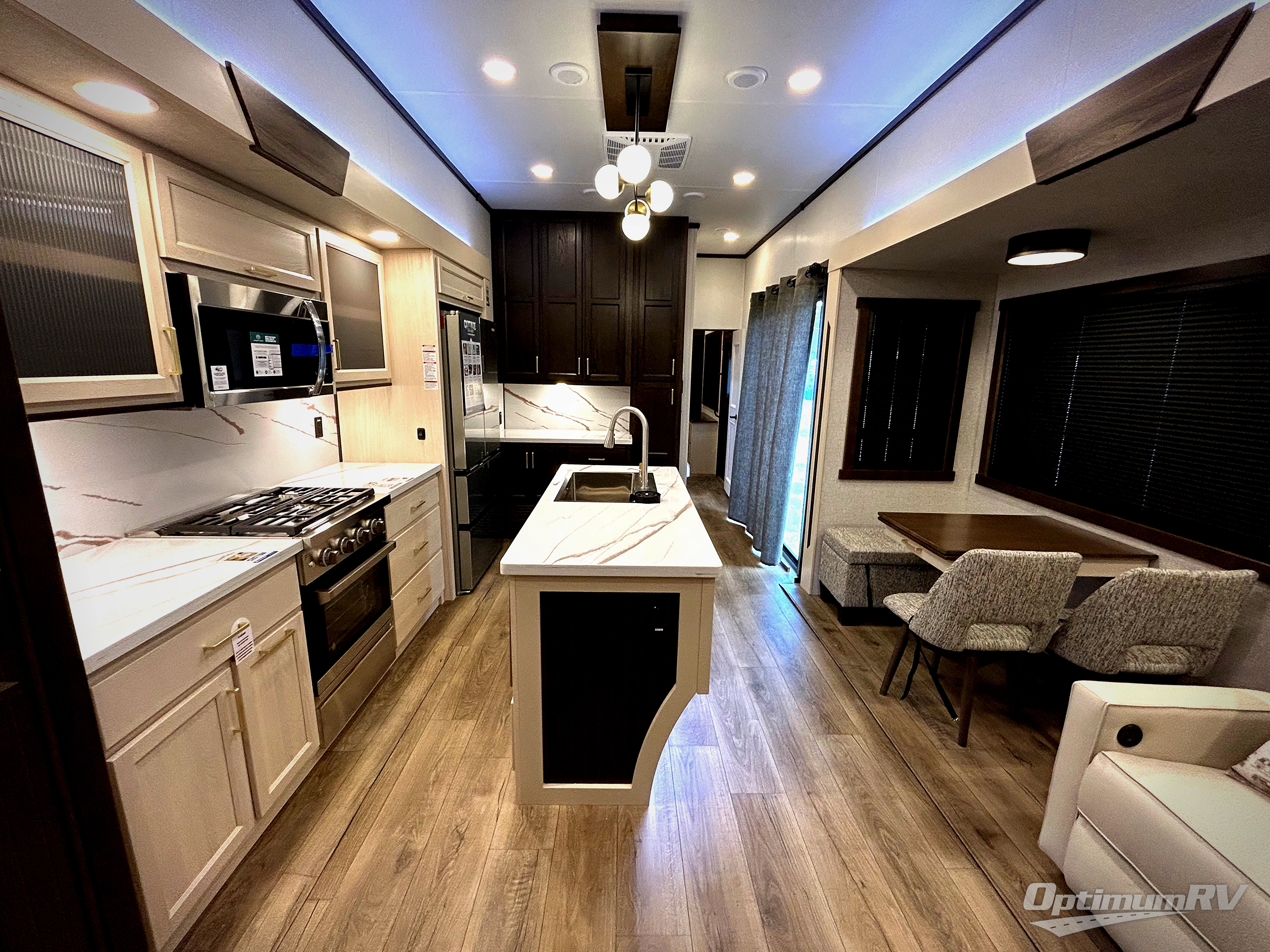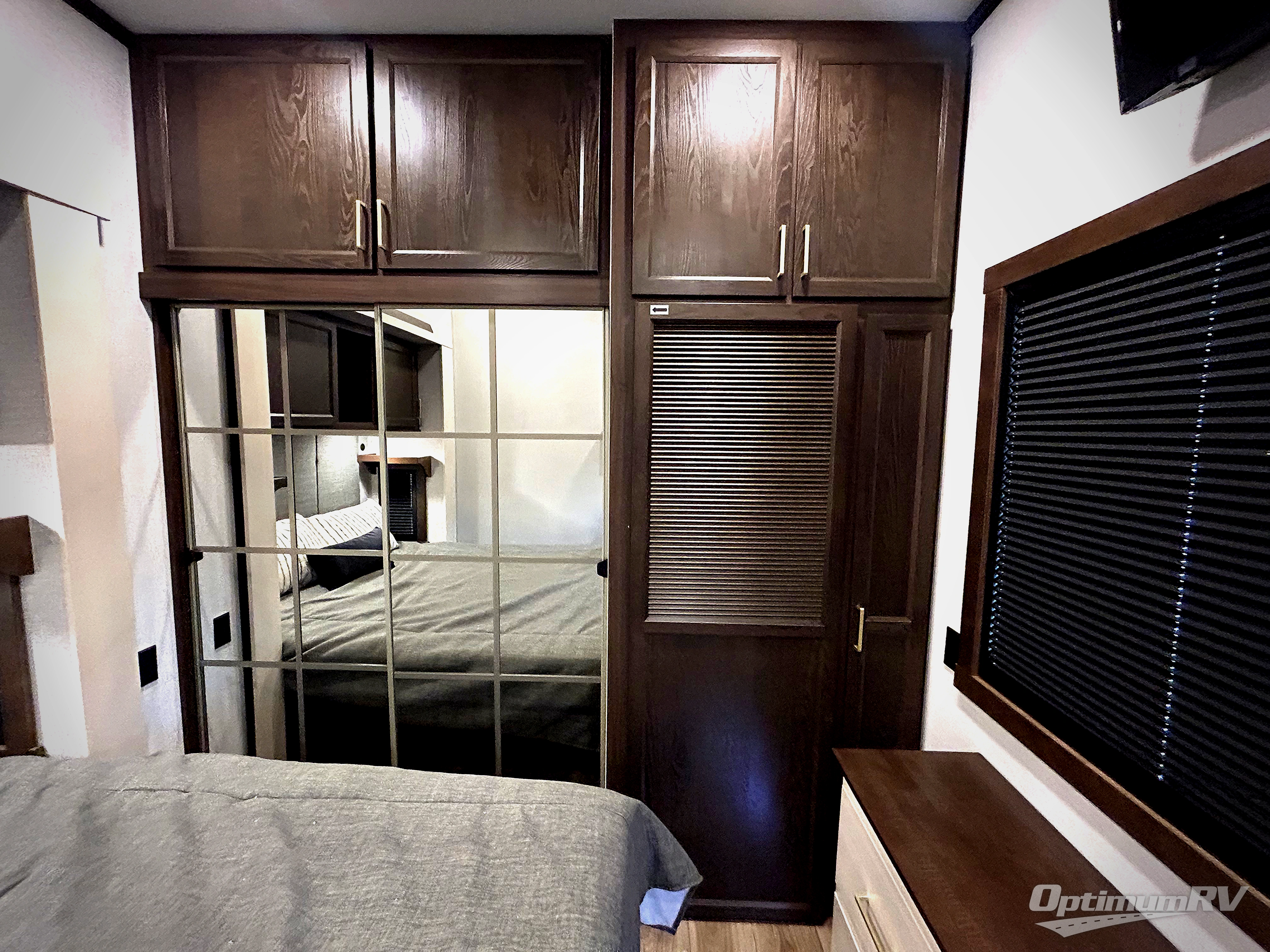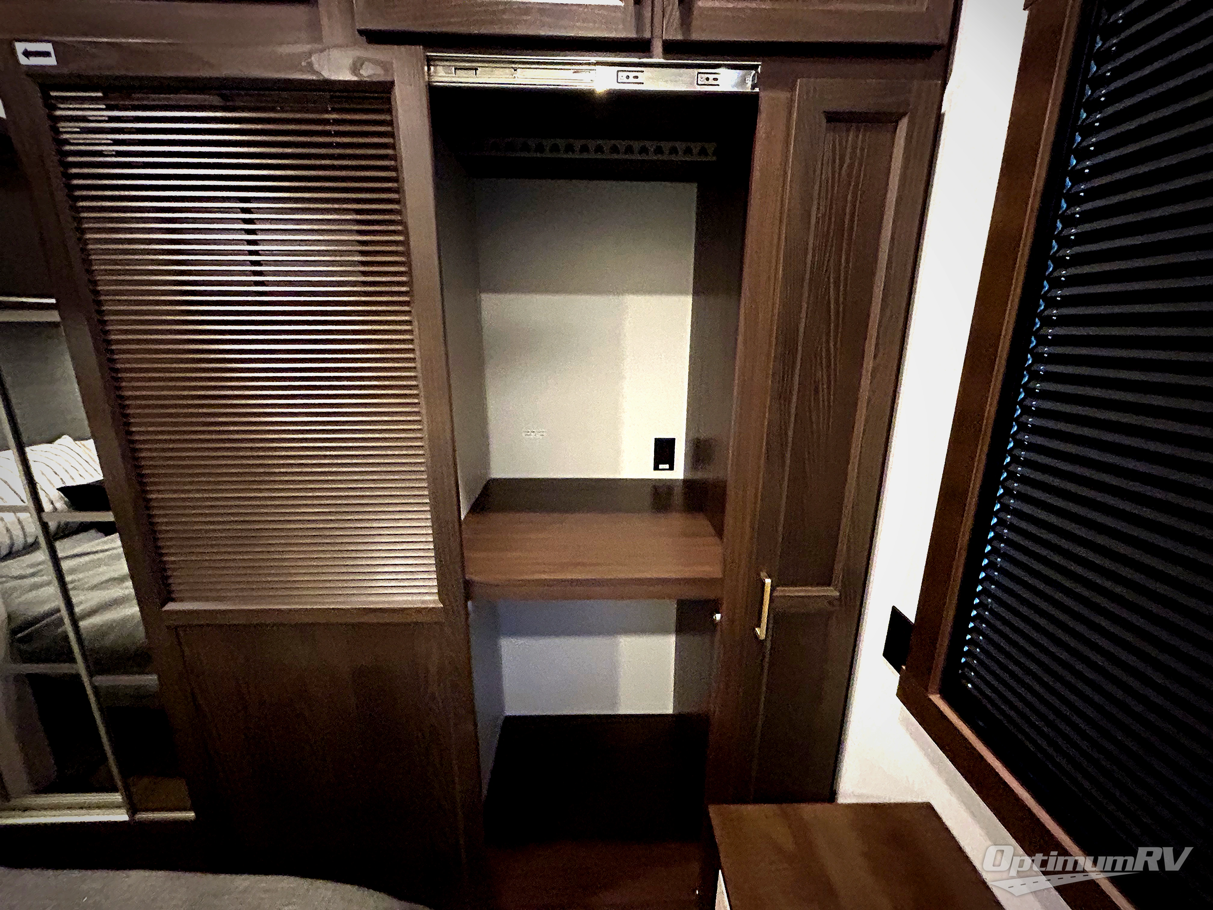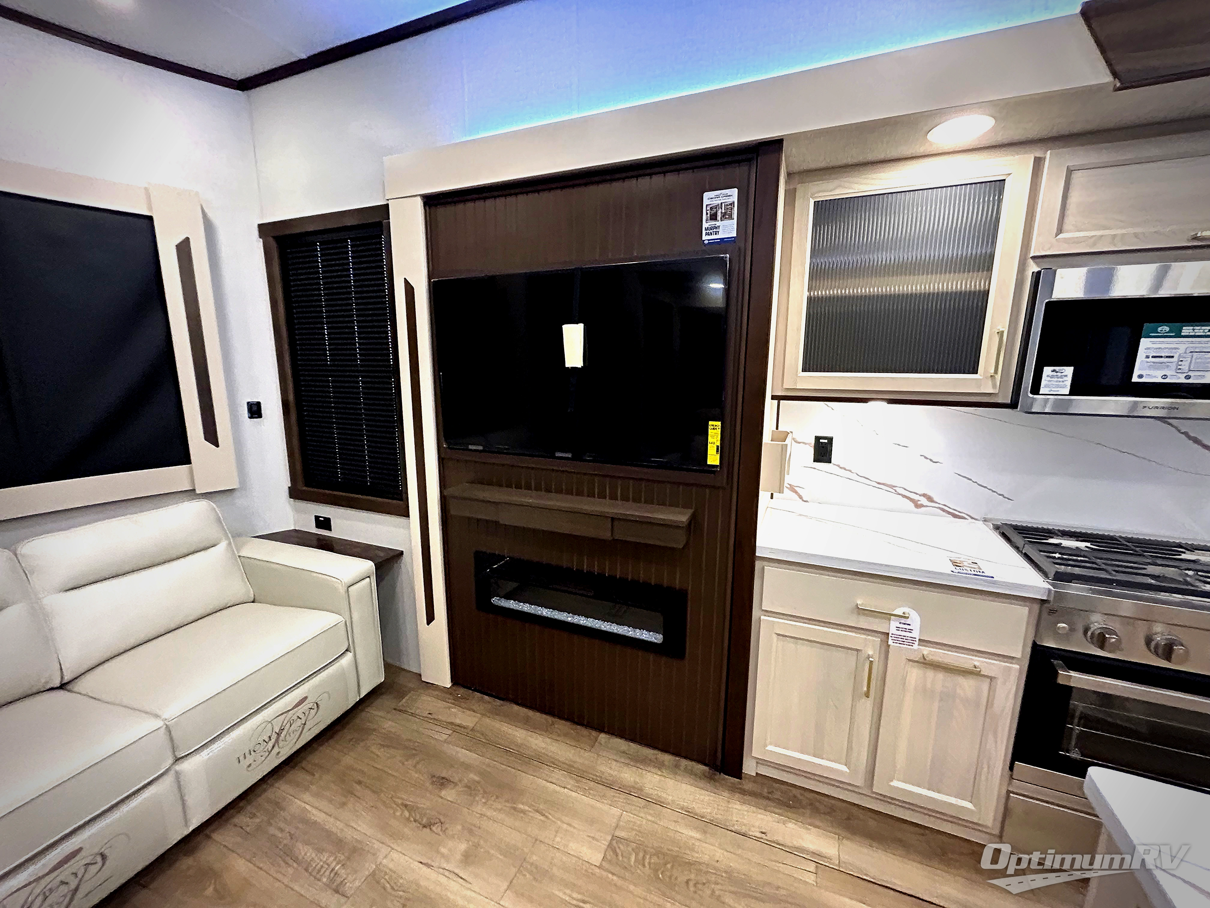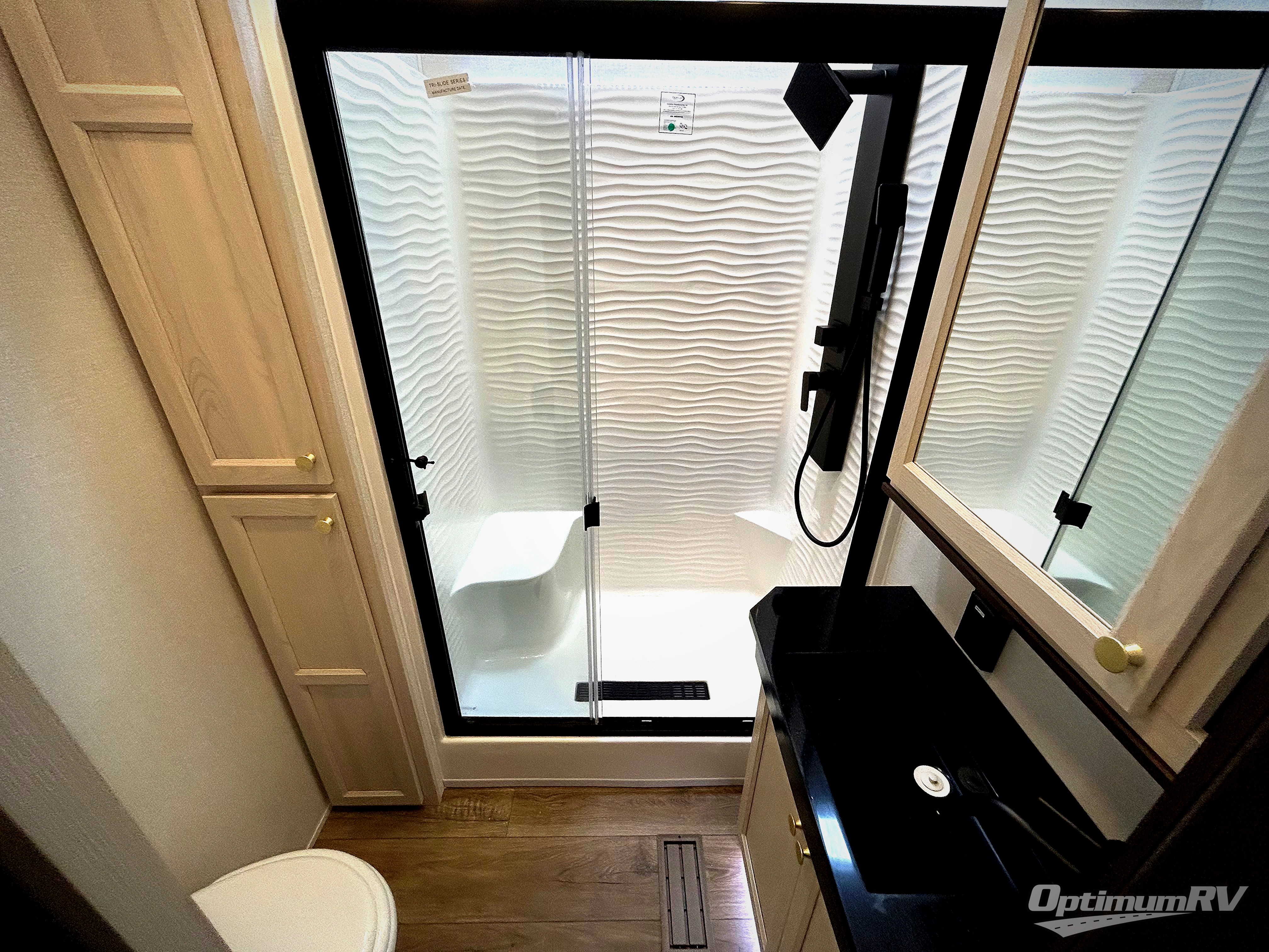 You're sure to feel right at home in this triple slide out destination trailer for four happy campers. The front private bedroom includes a king bed slide out, a large front wardrobe, and a dresser to keep your clothes organized. The full bath includes a shower skylight, extra storage for linens, and a Create-A-Breeze fan to keep air moving. The combined middle kitchen and living area will be a favorite place to visit together with its kitchen island and fold-down breakfast counter, free-standing table with an extension and an ottoman, and power theater seating. There is also a Murphy pantry behind the swivel mounted TV and fireplace for convenient storage, and a hide-a-bed sofa provides guests a place to sleep!