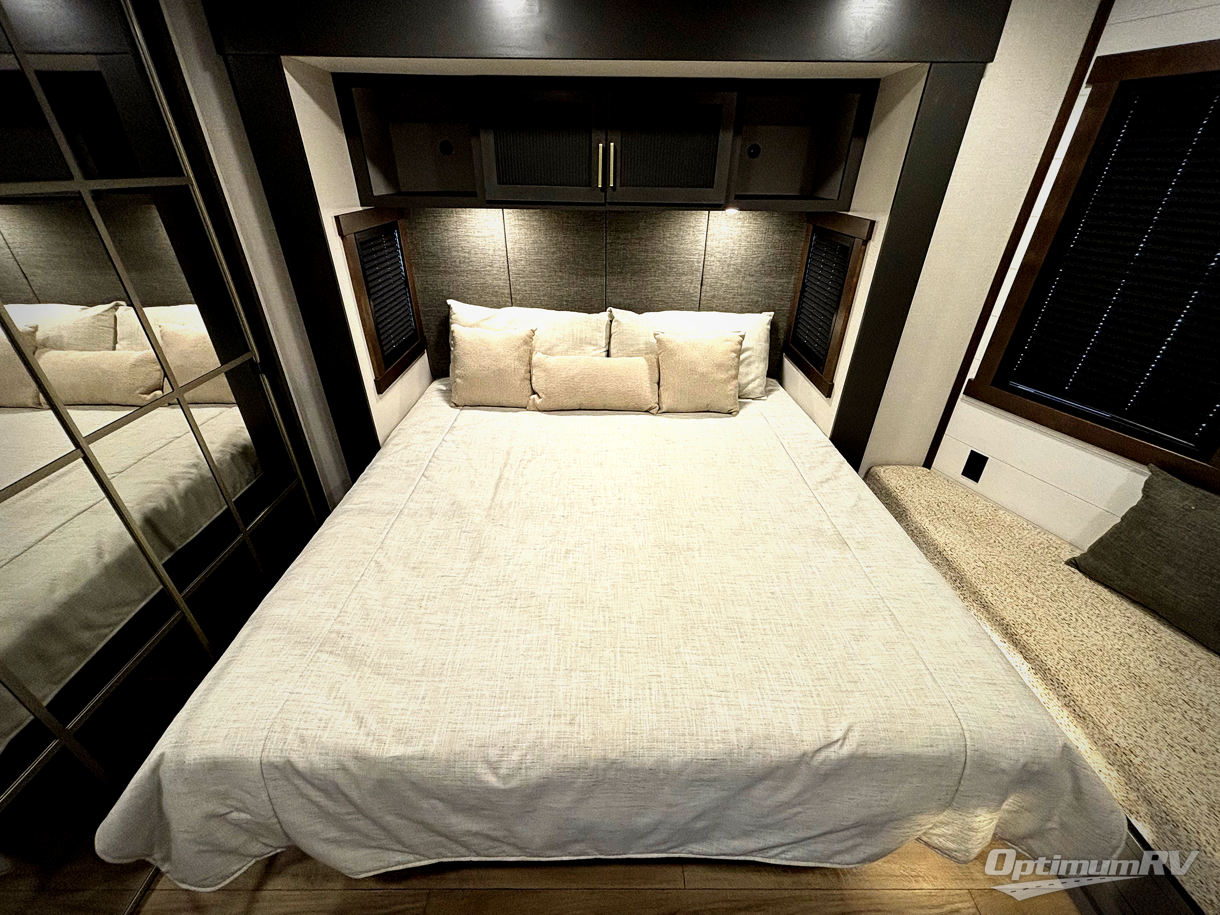 The rear living room is a spacious retreat, featuring a comfortable sectional sofa and a flip desk perfect for working or relaxing. Unwind with a glass of wine at the wine bar, or cozy up by the fireplace while enjoying your favorite show on the TV. The mud room is a practical and convenient feature, perfect for storing gear, boots, and jackets. The kitchen is fully equipped with overhead cabinets, a microwave, a refrigerator, and a table with swivel chairs, providing a comfortable spot to enjoy meals with family and friends. The full bathroom features an ample shower, providing plenty of space to get ready for the day, while the front bedroom is the perfect spot to relax and recharge after a long day of exploring, featuring a king bed, closet, and dresser.