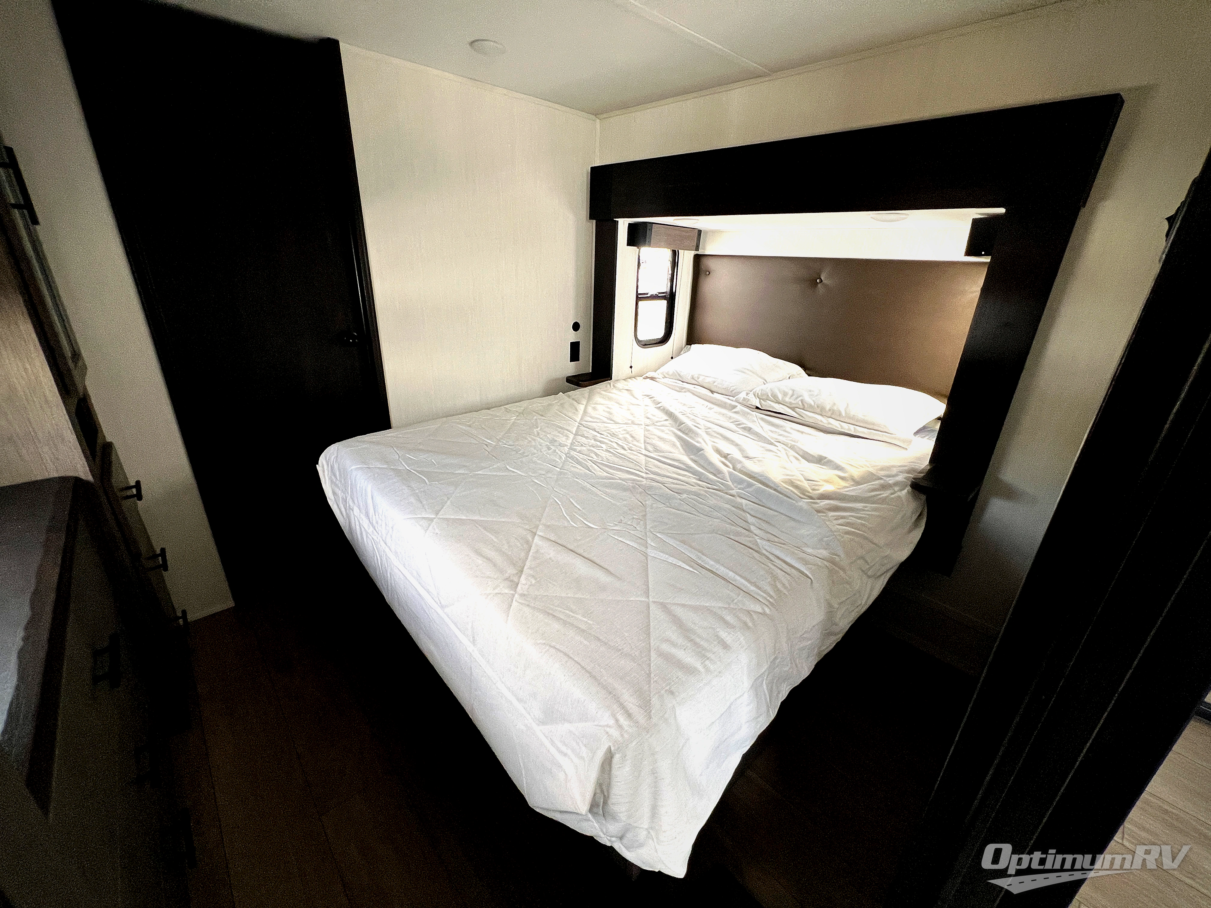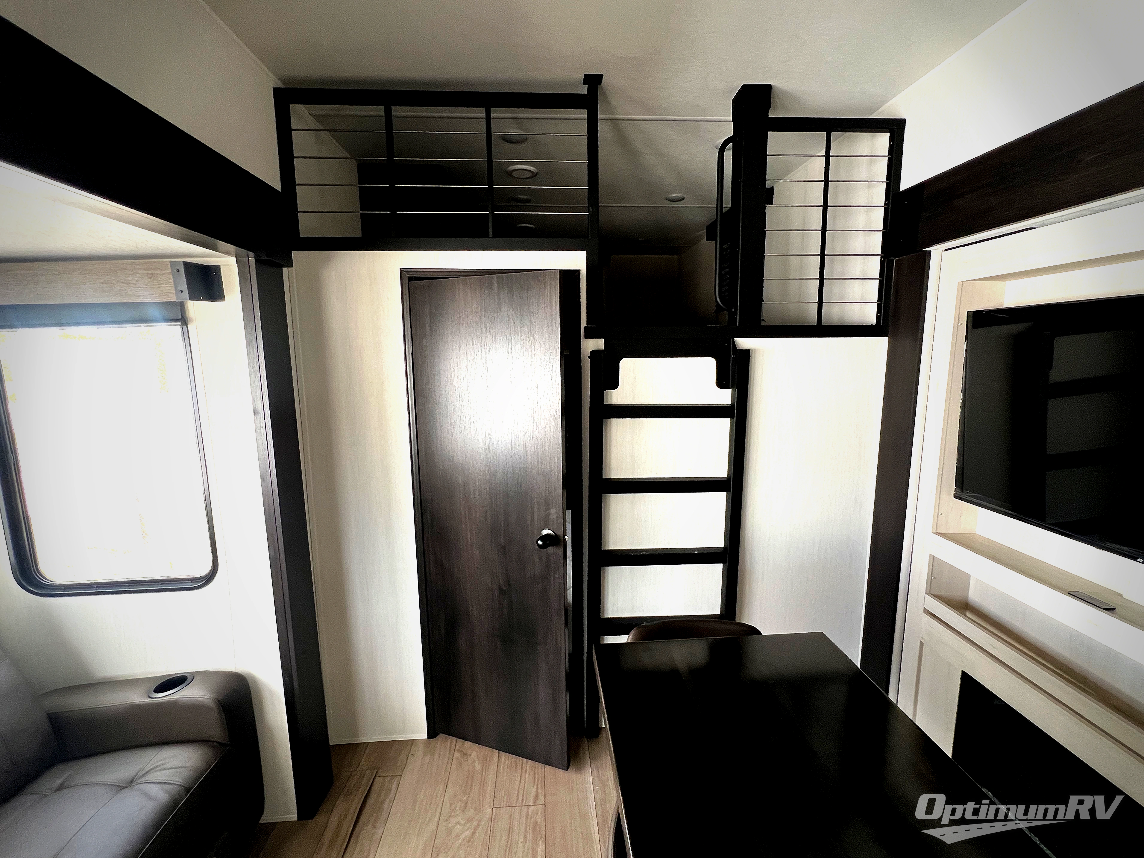 This quad-slide layout is set up for long stays and easy routines. The kitchen centers around a beautiful kitchen island for prep, the free-standing range is perfect for making full-size meals, and clean-up is a breeze with the built-in dishwasher. Across the living/kitchen zone you’ll find seating oriented to the entertainment wall and an LED TV, so movie nights don’t fight the cook space. Up front, the suite’s king bed slide faces a bedroom fireplace, with deep hanging space and drawers to keep wardrobes organized. Outside, the dual entry design improves campsite flow, and the triple-awning coverage stretches usable patio space. There is also more space for kids or guests in the upper loft!