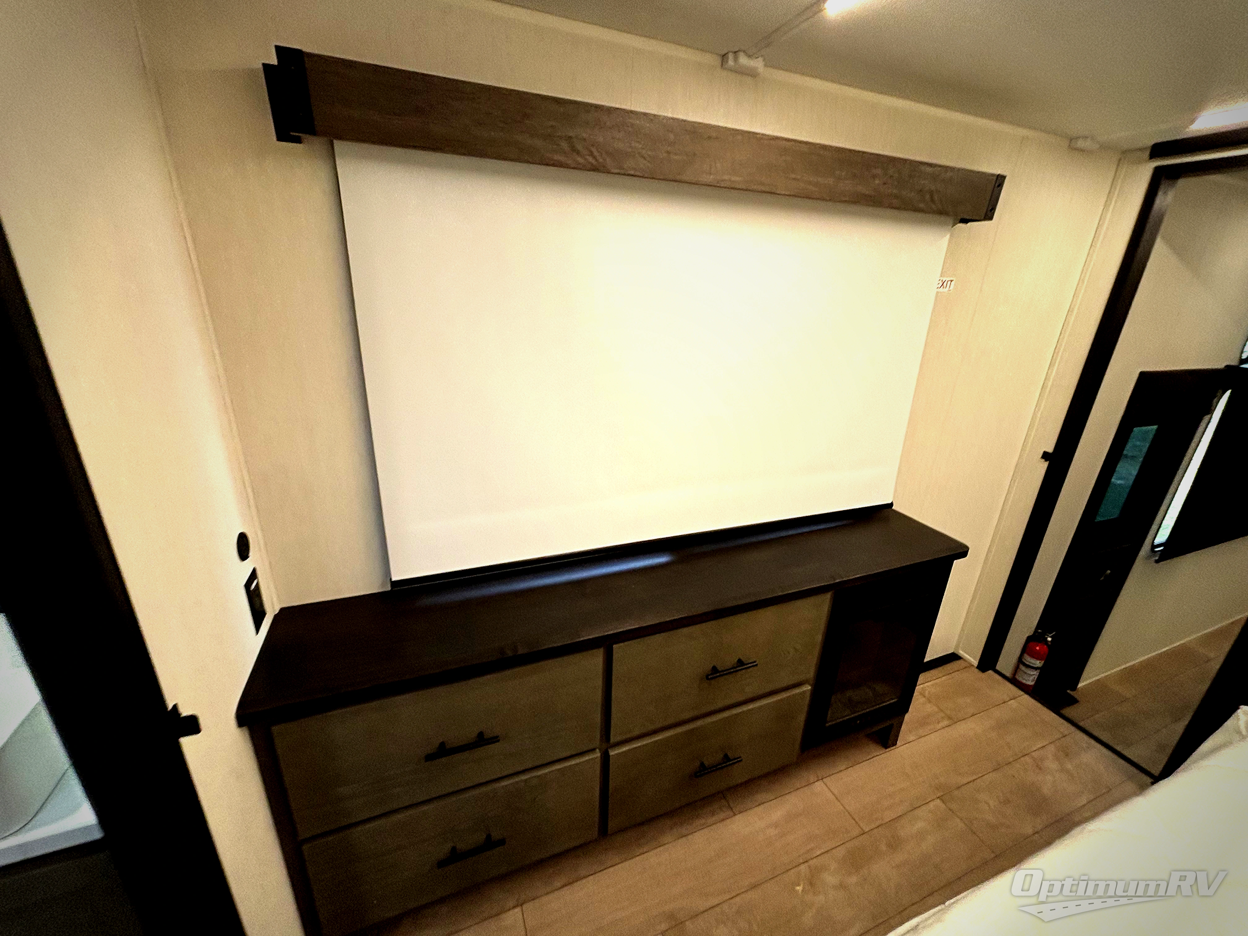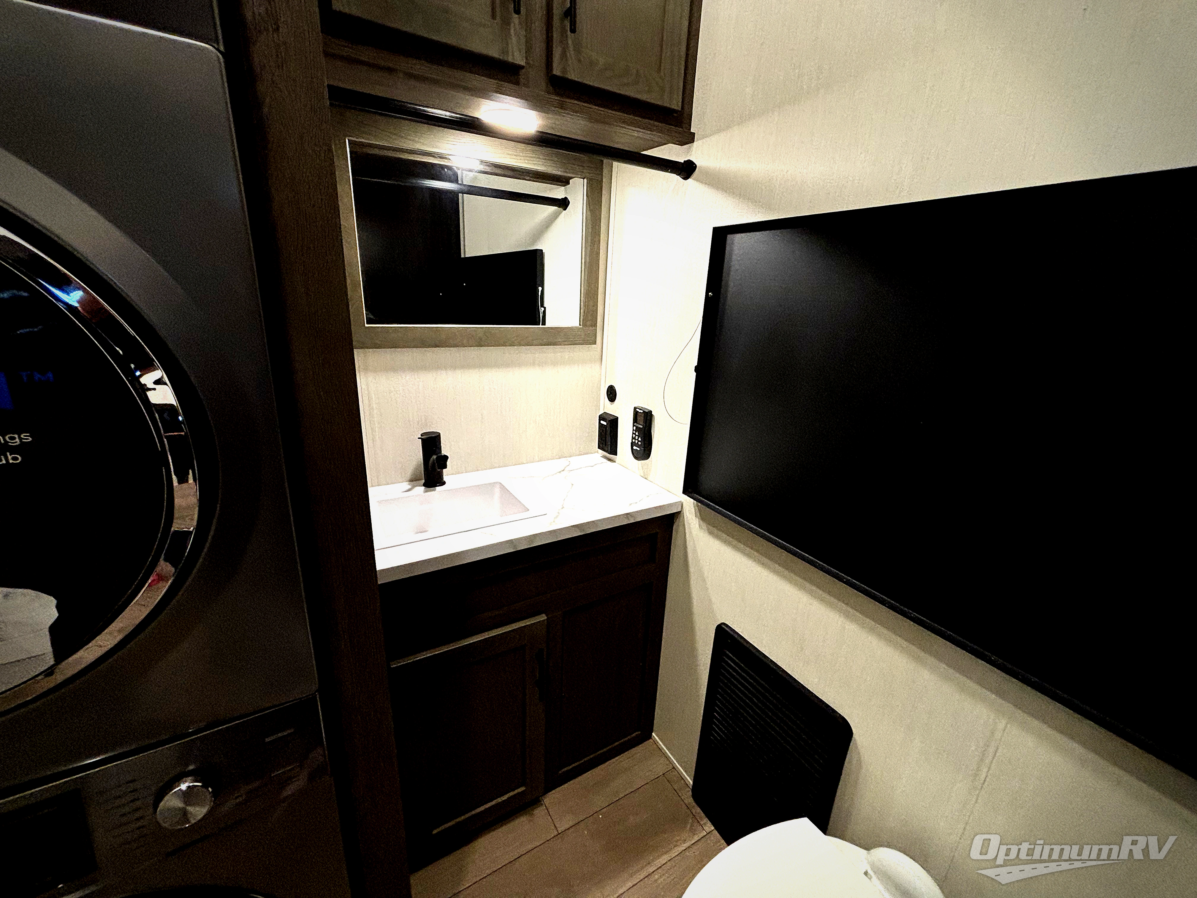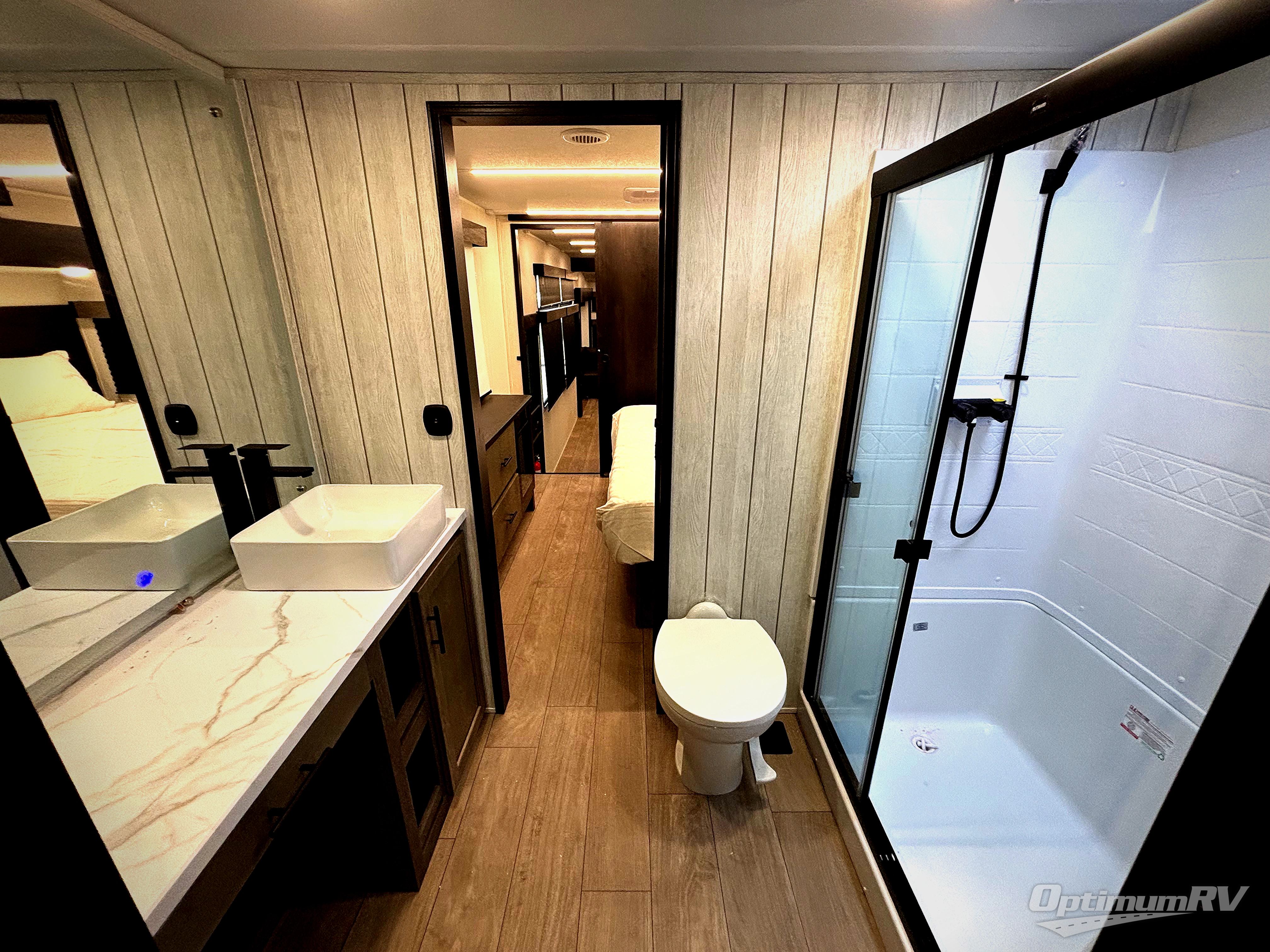 This thoughtfully arranged floorplan is built for extended stays and easy daily living. The rear lounge centers around an L-shaped sectional facing the entertainment wall and fireplace, with a nearby desk for work or hobbies. The kitchen’s island anchors a generous prep area, oversized pantry, and full cooking suite, so meals are simple whether you’re weekending or full-timing. Mid-coach, the guest half bath is convenient for all. Up front, the private bedroom’s king bed slide connects to a spa-style bath with large shower and dressing space, plus a substantial wardrobe to keep clutter out of sight. Outside, enjoy the campsite under dual power awnings that stretch along the patio side.