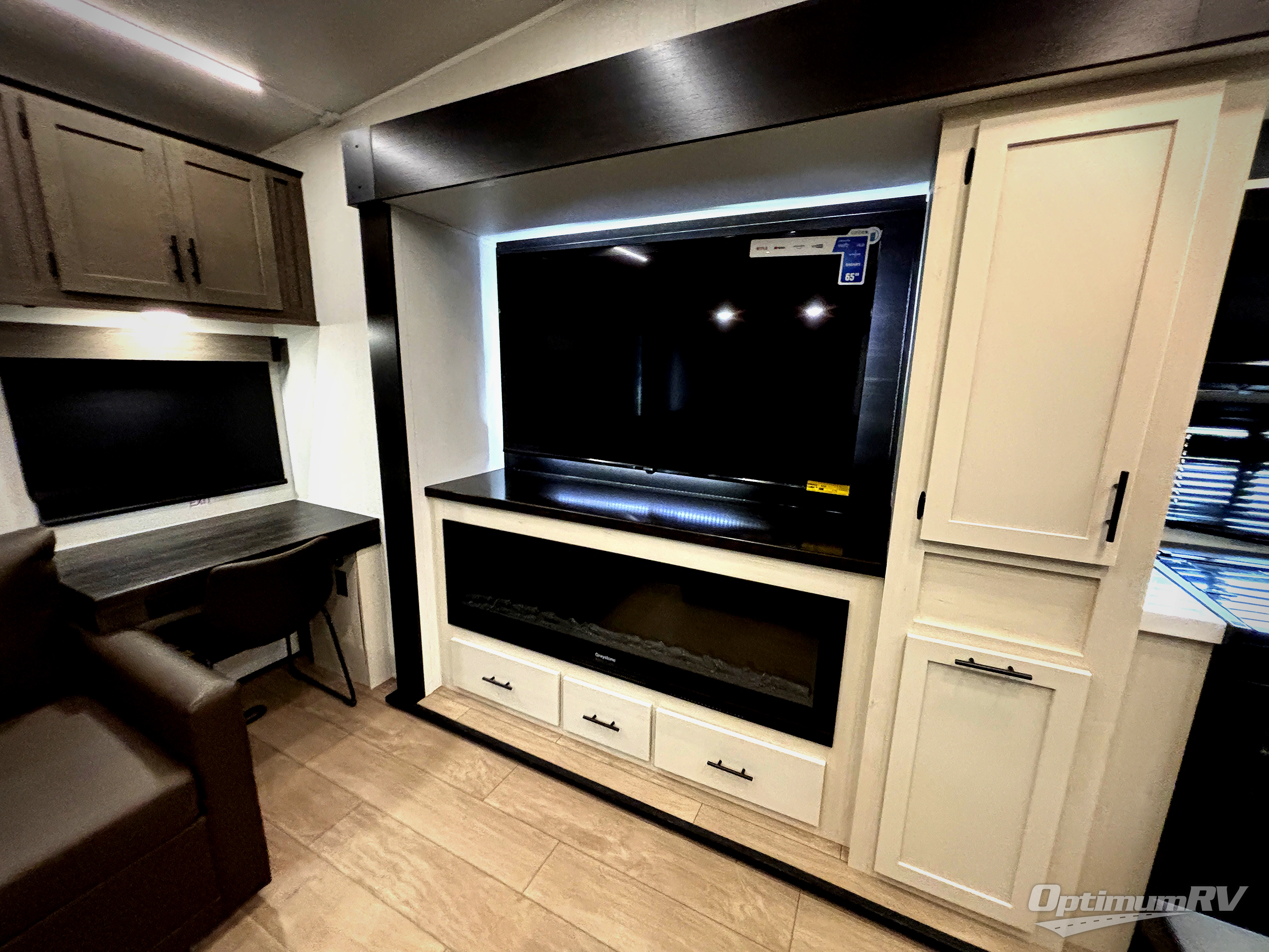 This thoughtfully arranged floorplan is built for extended stays and easy daily living. The rear lounge centers around an L-shaped sectional facing the entertainment wall and fireplace, with a nearby desk for work or hobbies. The kitchen’s island anchors a generous prep area, oversized pantry, and full cooking suite, so meals are simple whether you’re weekending or full-timing. Mid-coach, the guest half bath is convenient for all. Up front, the private bedroom’s king bed slide connects to a spa-style bath with large shower and dressing space, plus a substantial wardrobe to keep clutter out of sight. Outside, enjoy the campsite under dual power awnings that stretch along the patio side.