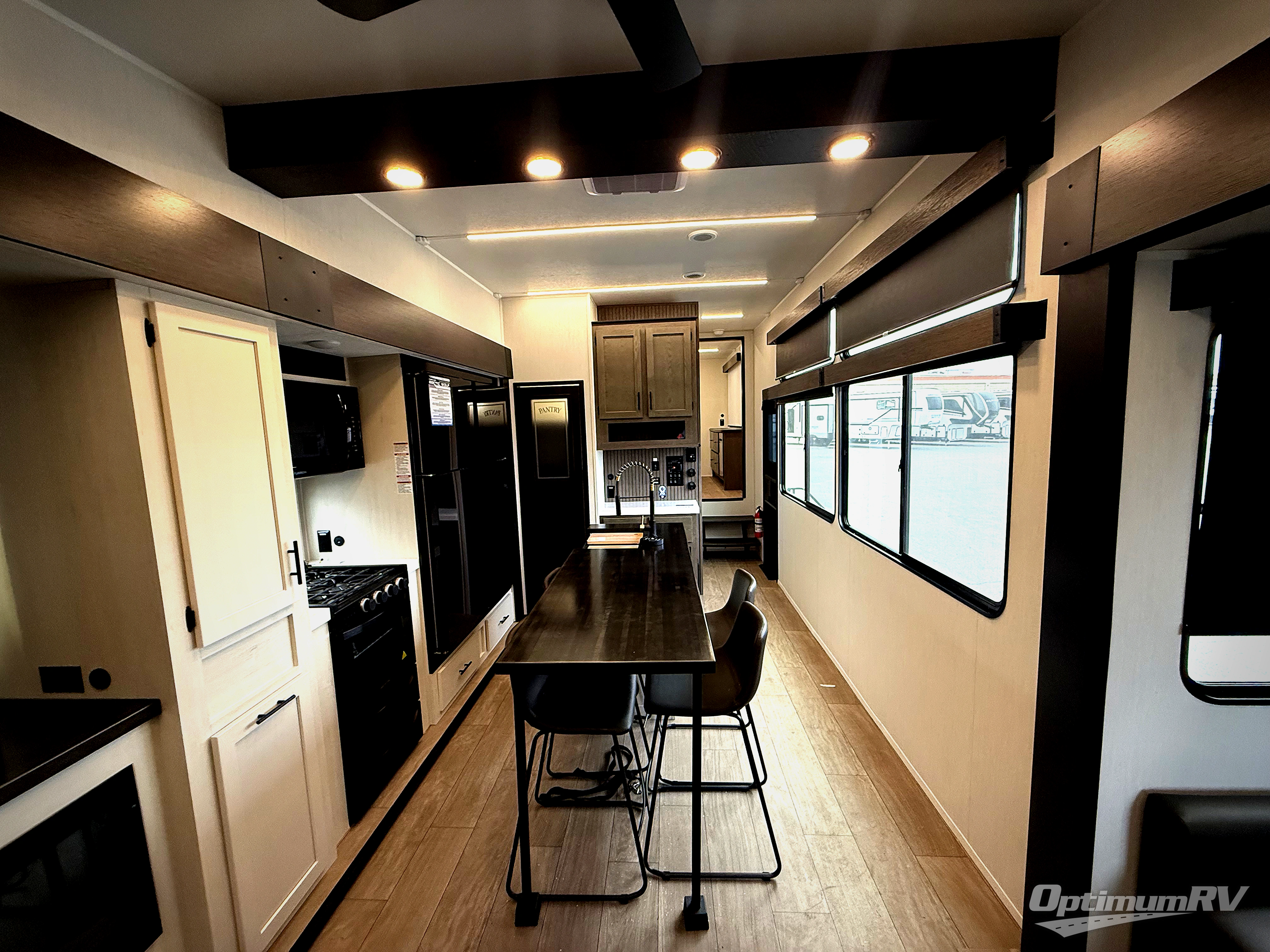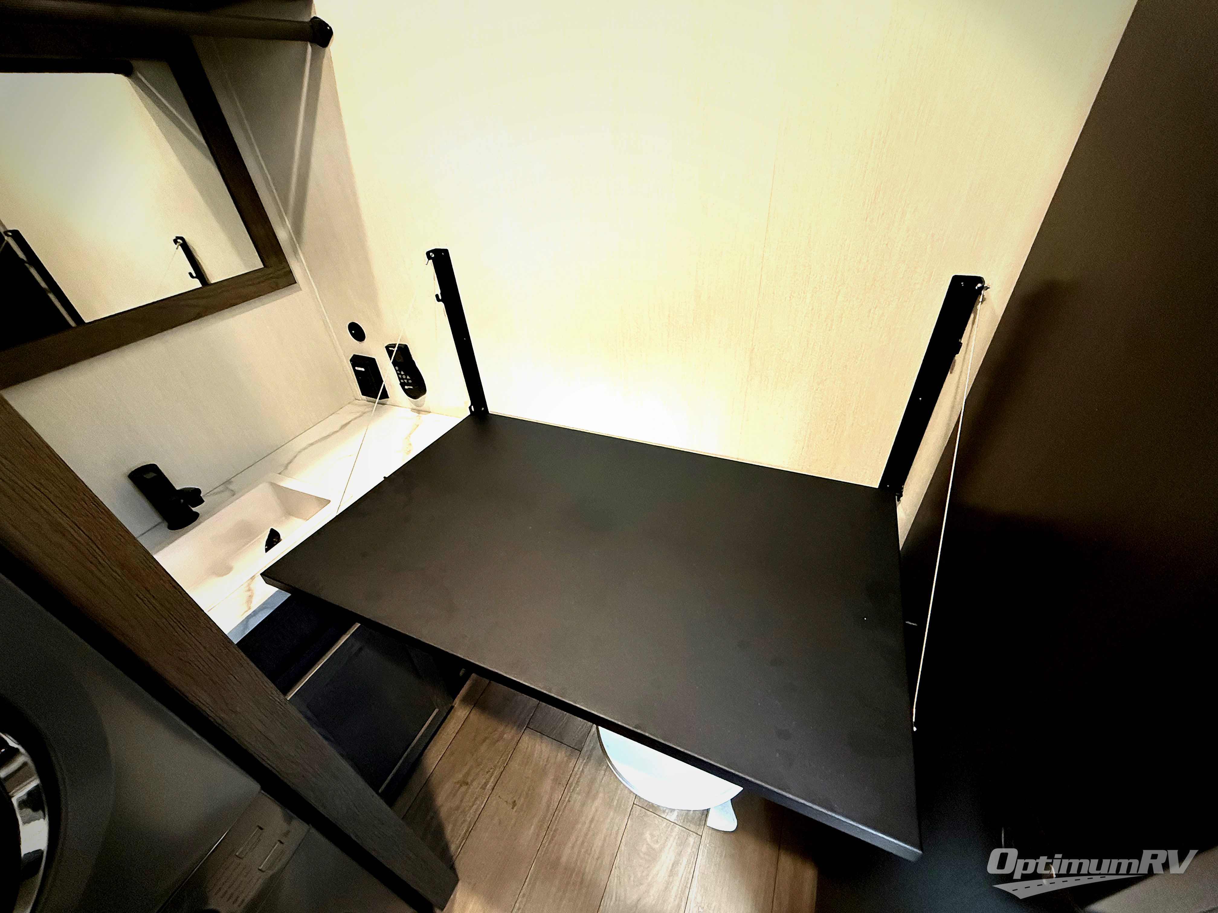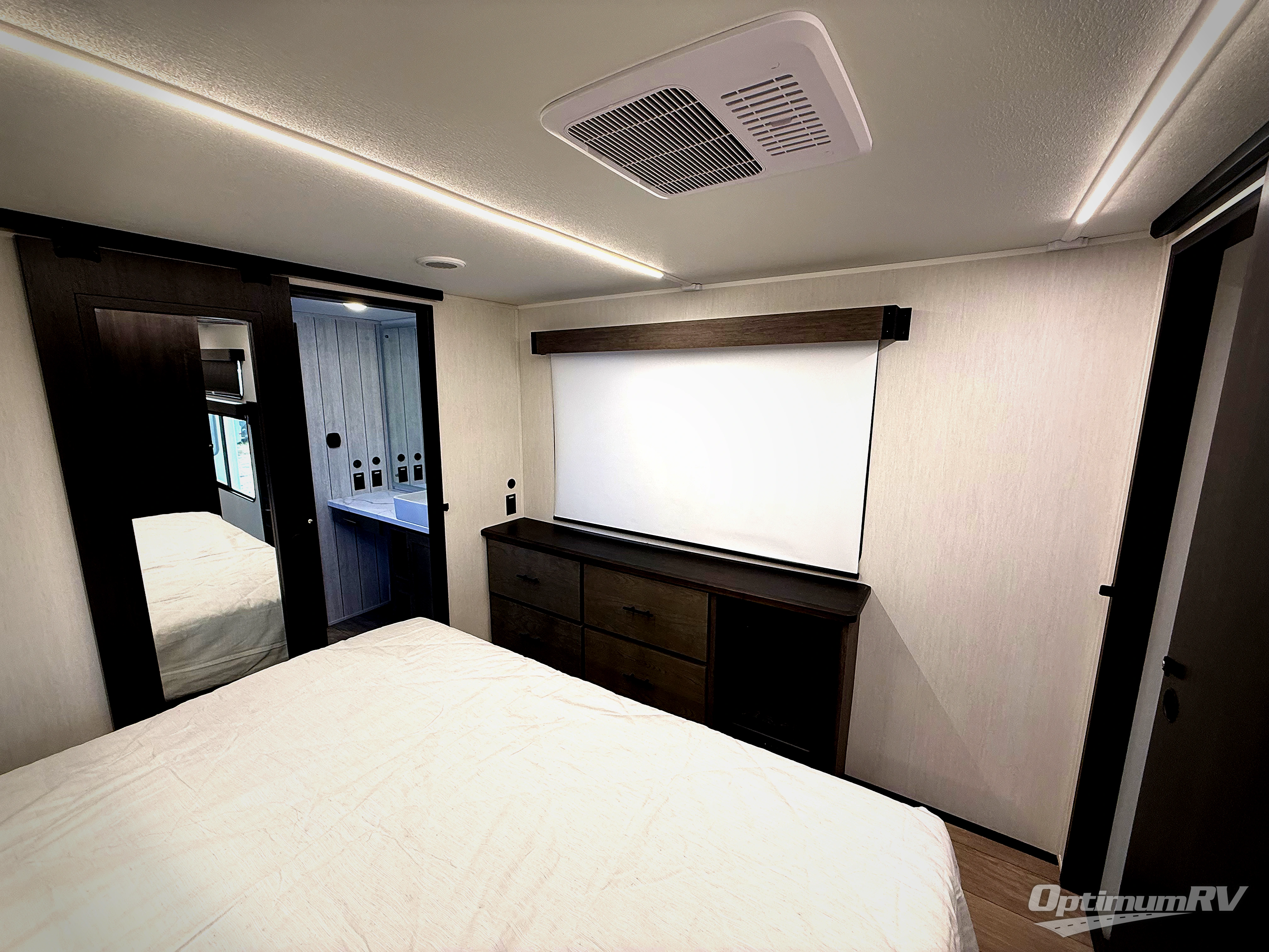 This thoughtfully arranged floorplan is built for extended stays and easy daily living. The rear lounge centers around an L-shaped sectional facing the entertainment wall and fireplace, with a nearby desk for work or hobbies. The kitchen’s island anchors a generous prep area, oversized pantry, and full cooking suite, so meals are simple whether you’re weekending or full-timing. Mid-coach, the guest half bath is convenient for all. Up front, the private bedroom’s king bed slide connects to a spa-style bath with large shower and dressing space, plus a substantial wardrobe to keep clutter out of sight. Outside, enjoy the campsite under dual power awnings that stretch along the patio side.