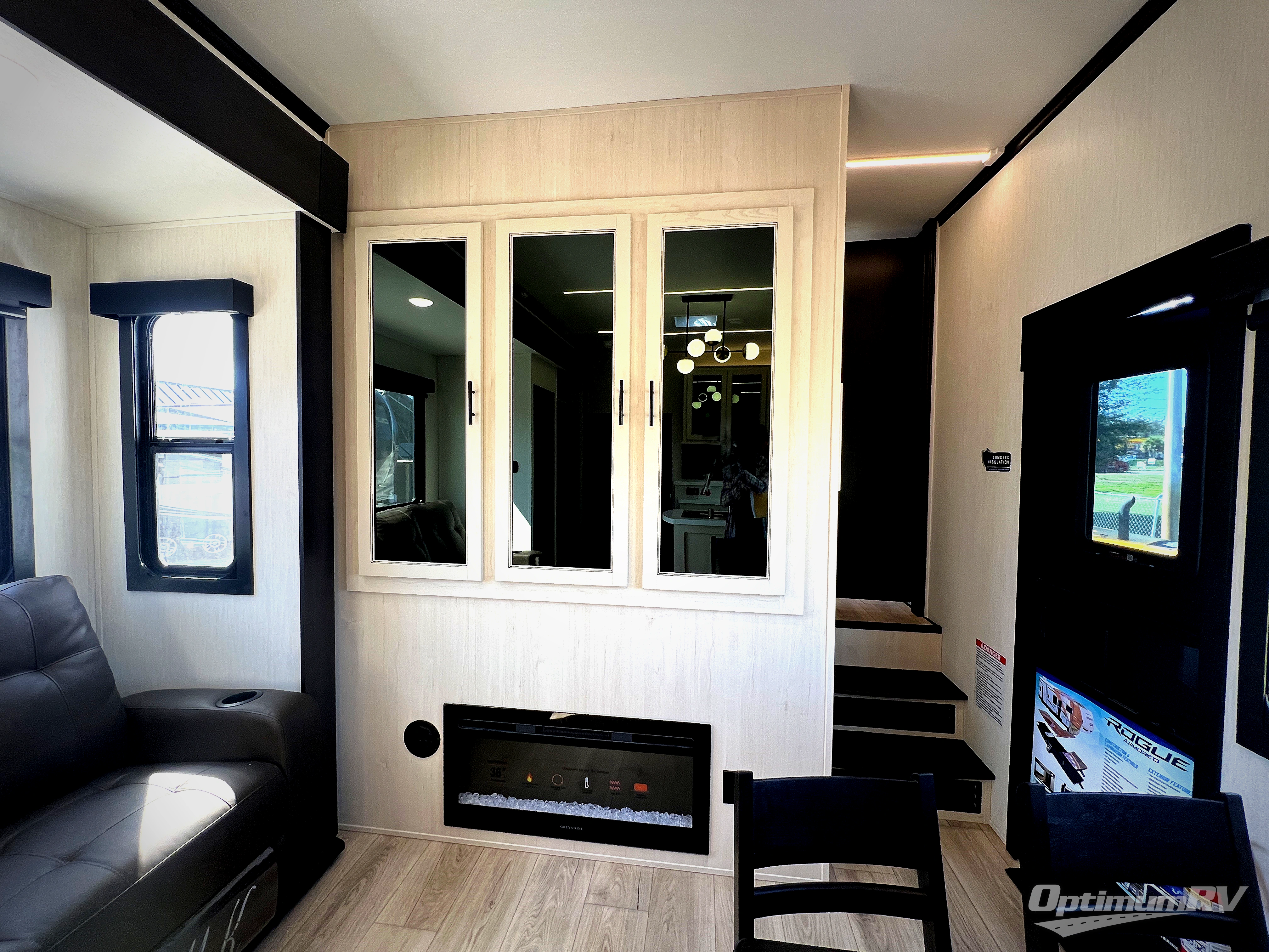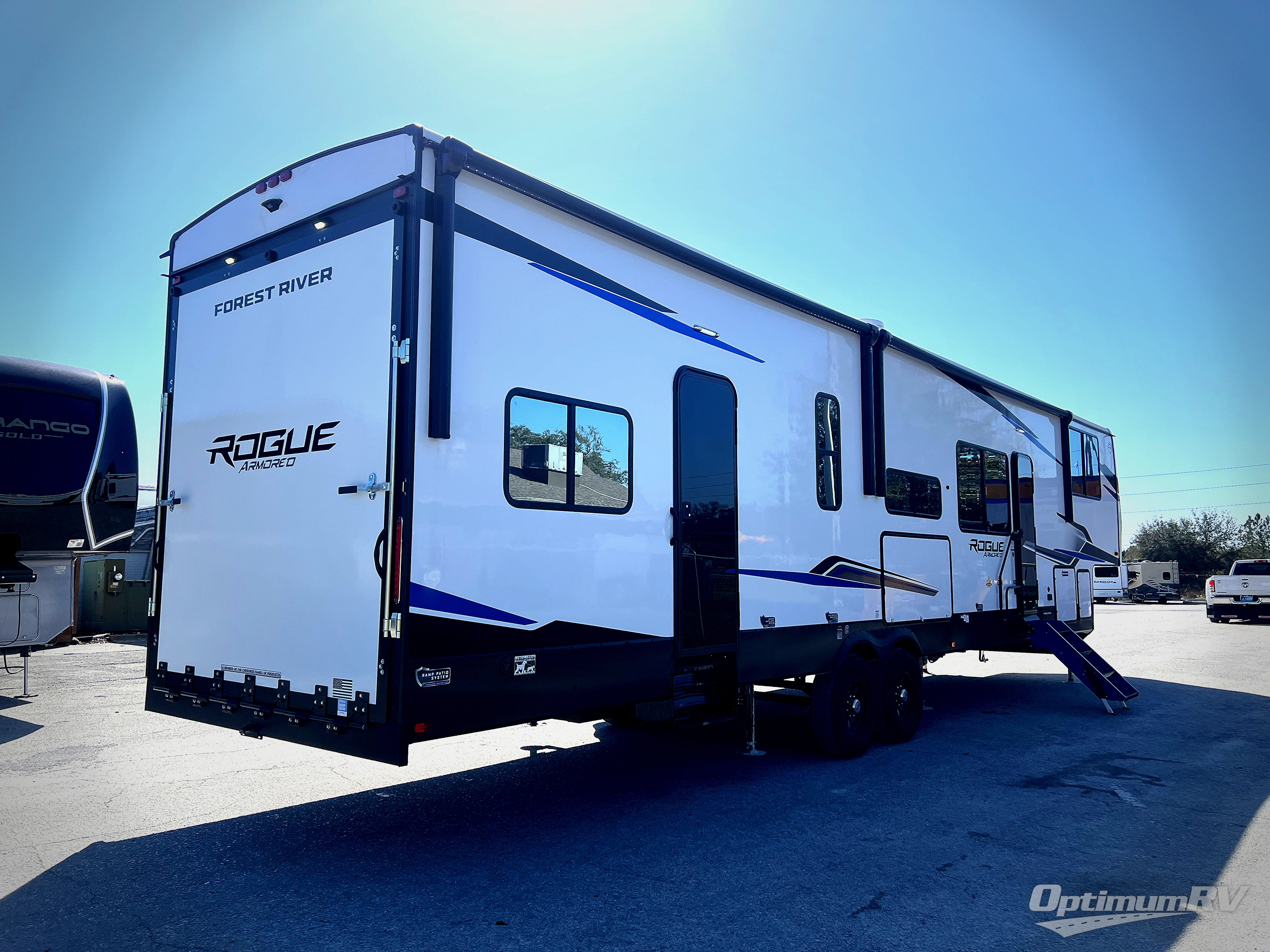 Every one of these Forest River Cherokee Rogue Armored fifth wheel toy haulers come with the features you want most at an affordable price tag! The DuraPoxy gas/oil resistant floor has 5,000 lb. tie downs to ensure your toys will arrive safely without damaging the flooring, plus the 3,000 lb. rated ramp door makes it easy to load them. Two 15,000 BTU A/Cs are "Super H Ducted" to keep you cool even on the hottest summer days, and the heated enclosed holding tanks help protect against the elements. Each model also includes a 6-point leveling system, dual LED cargo lights, solar reflective windows, and a tire pressure monitoring system. Inside, you'll enjoy the solid surface countertops, glass shower door, zebra shades in the living room, and stainless-steel multi-purpose sink to name a few comforts!