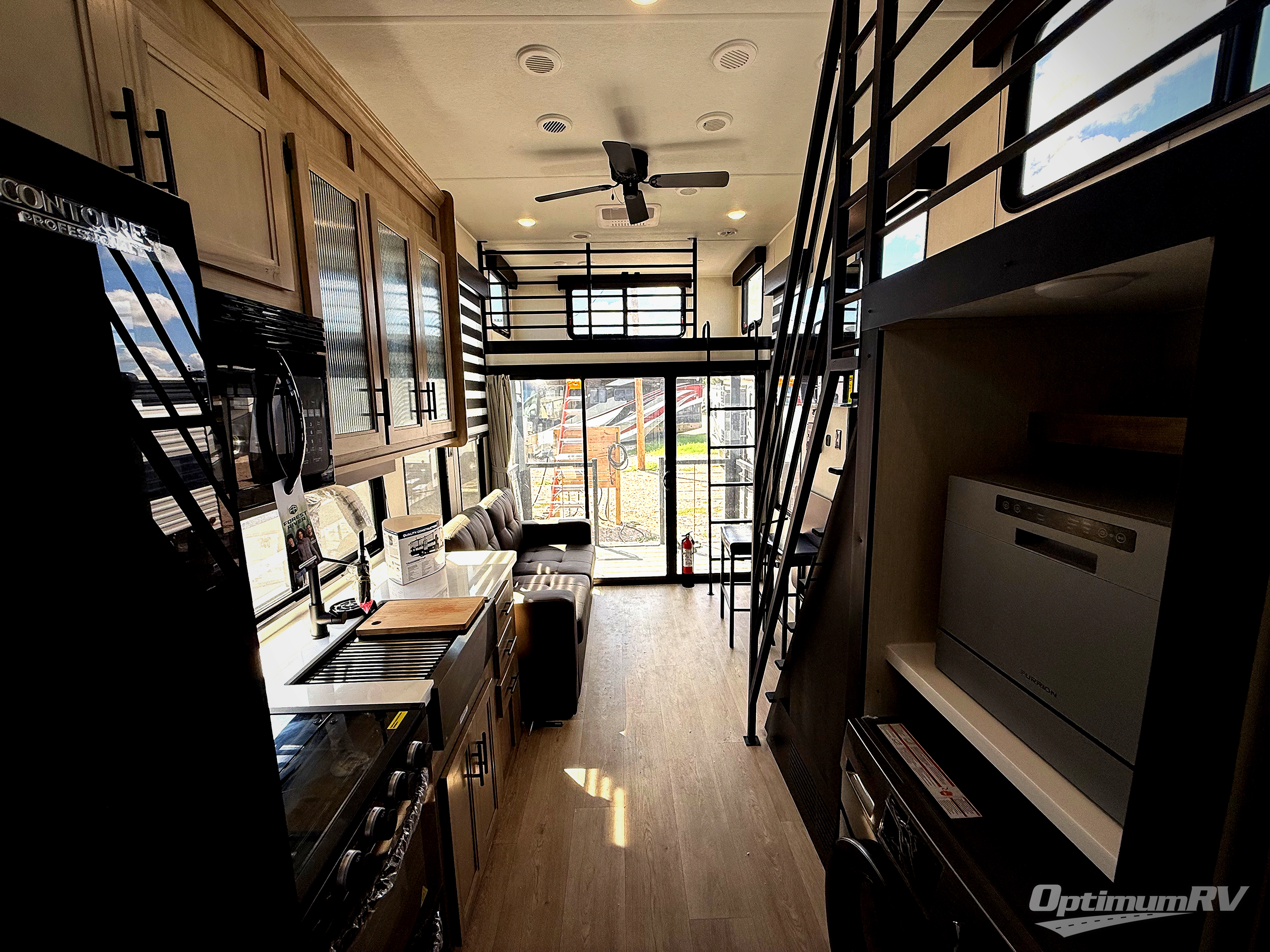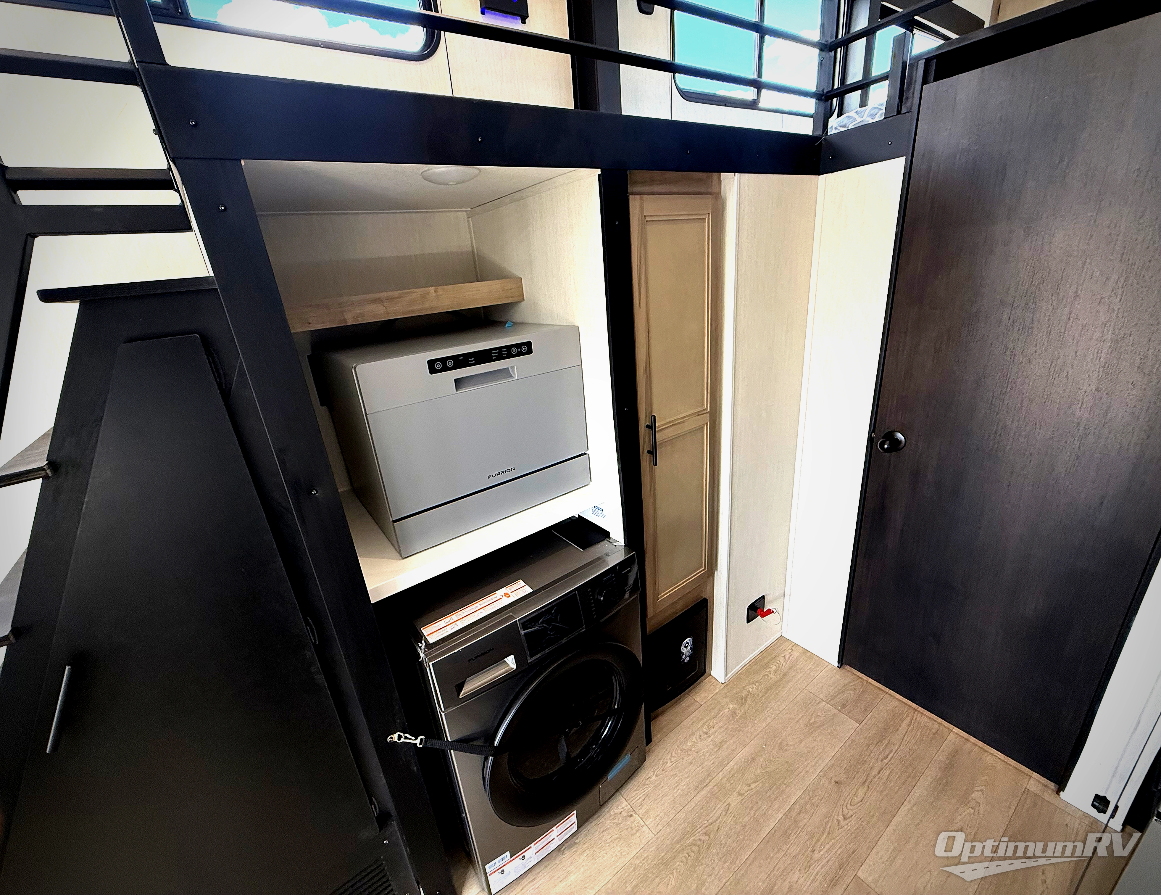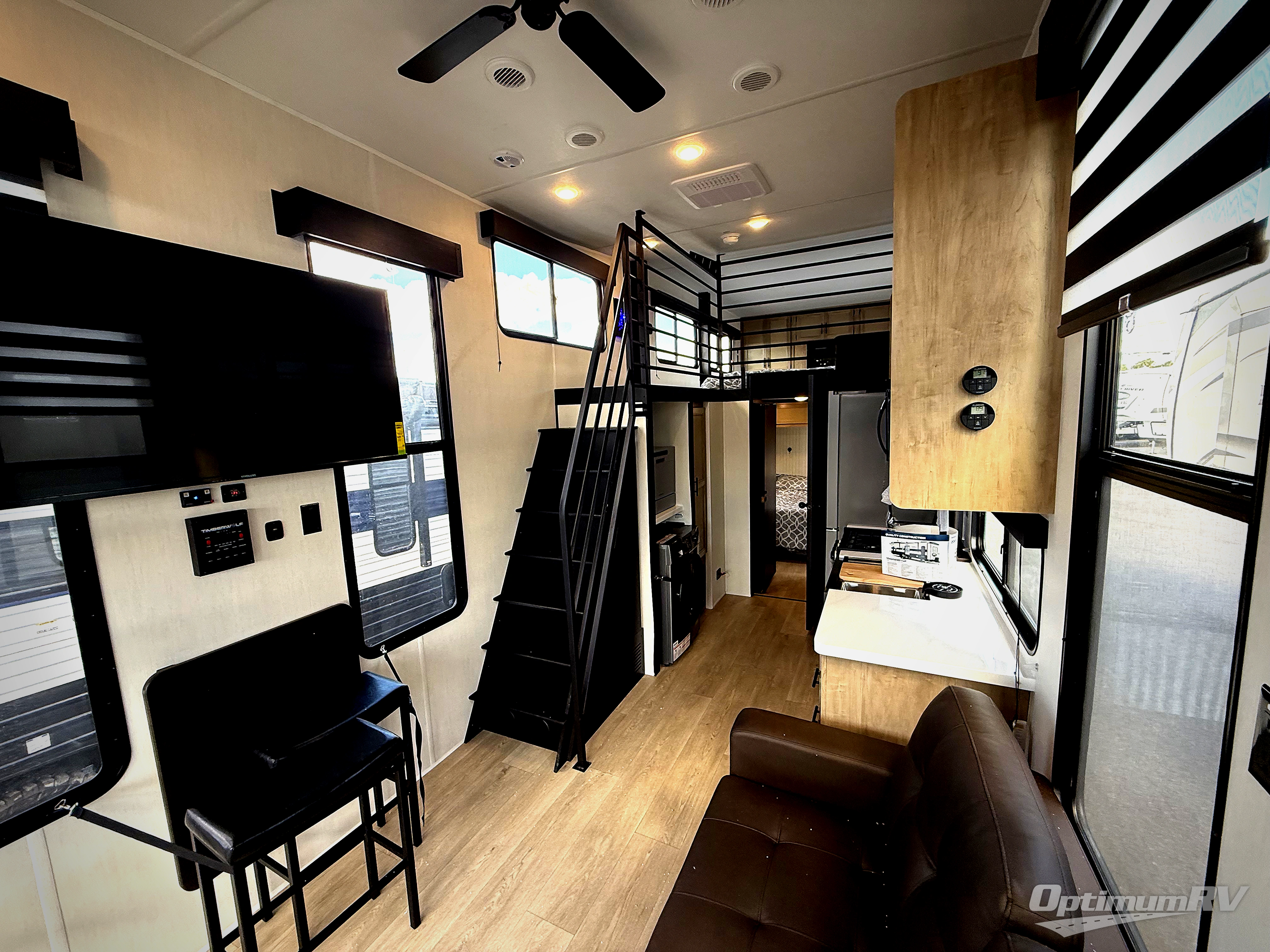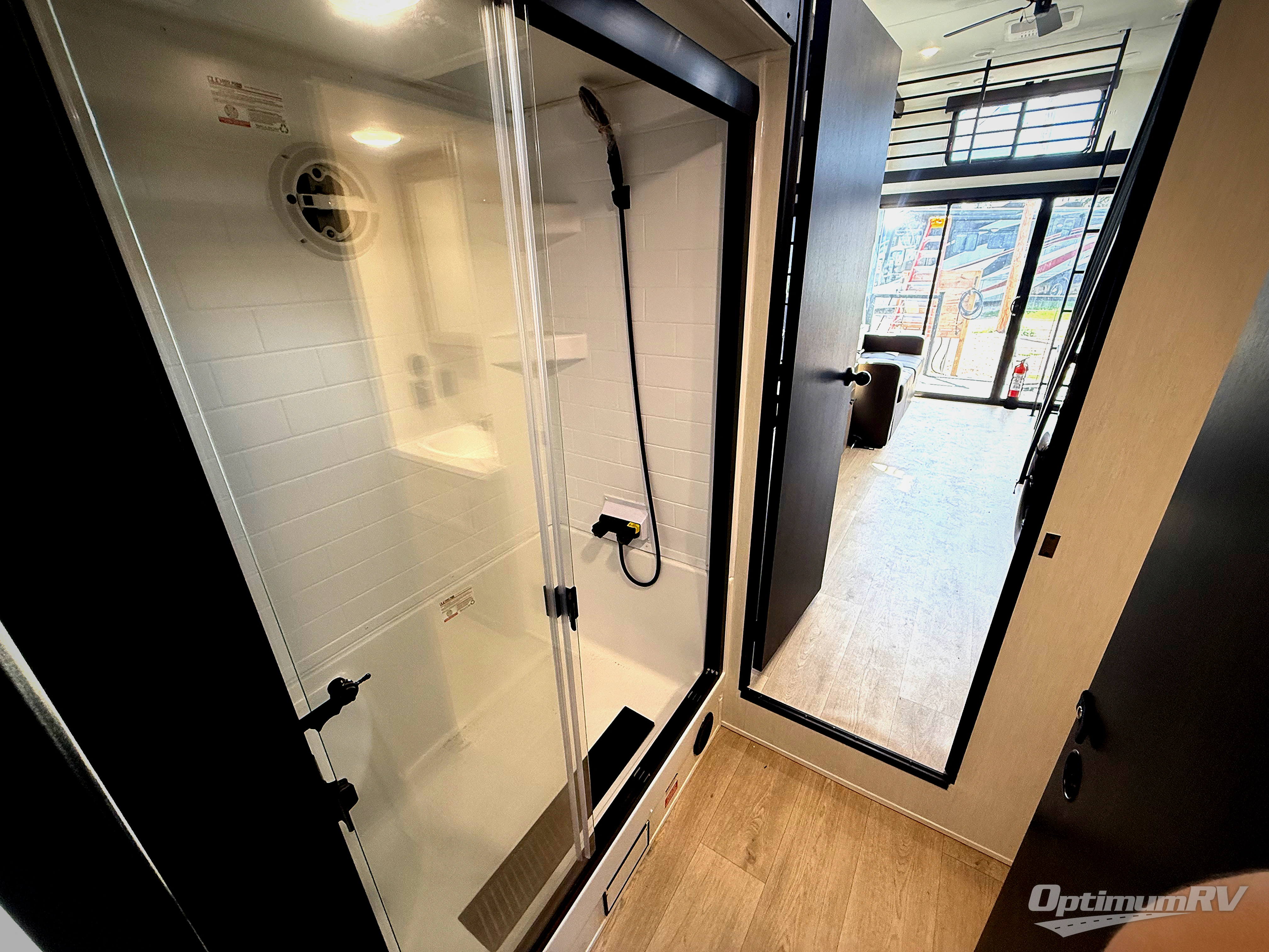 This model is similar to 16ML but larger! A bigger bathroom, RV king bed in the lower master, and a queen bed plus a twin bunk mat in the front loft. And the second loft can be utilized as extra sleeping space or storage space! There is an 18 cu. ft. refrigerator so you can stock up for a week long vacation, a hide-a-bed sofa that can transform into added sleeping for guests, and a high top table with two stools to dine at. The bathroom below is split with a shower on one side, and a private toilet area and sink opposite. And the view is amazing from just about anywhere inside.