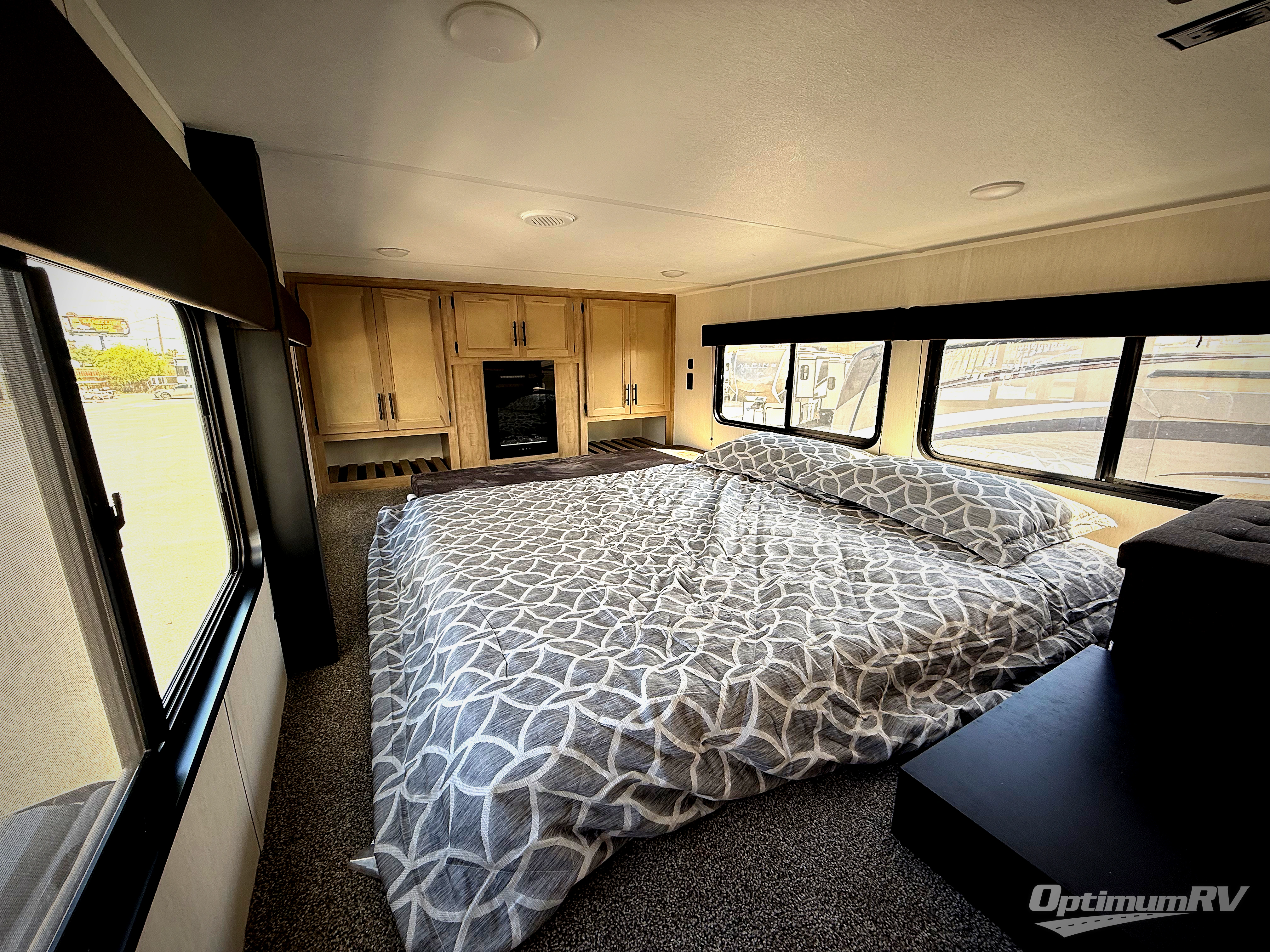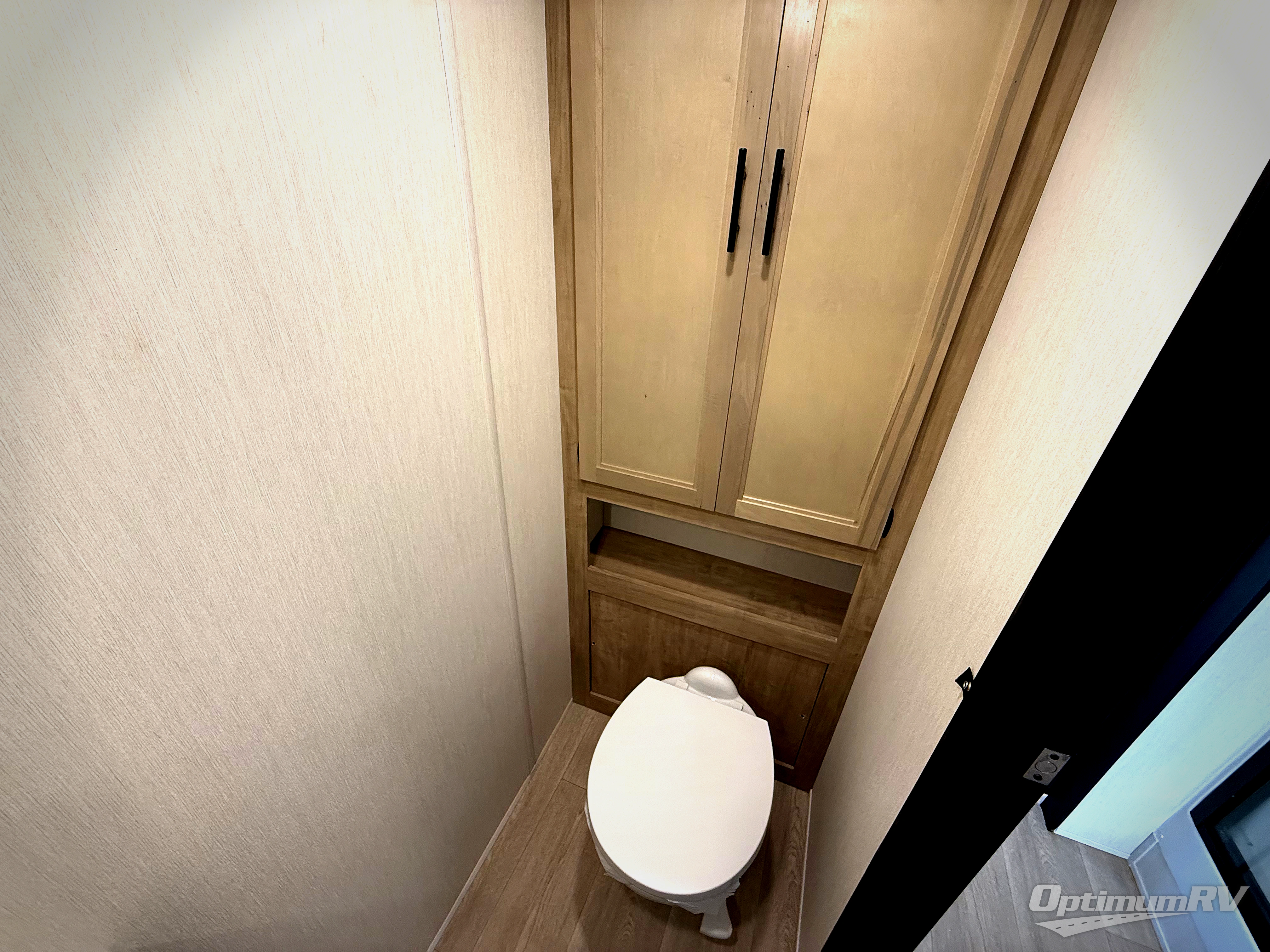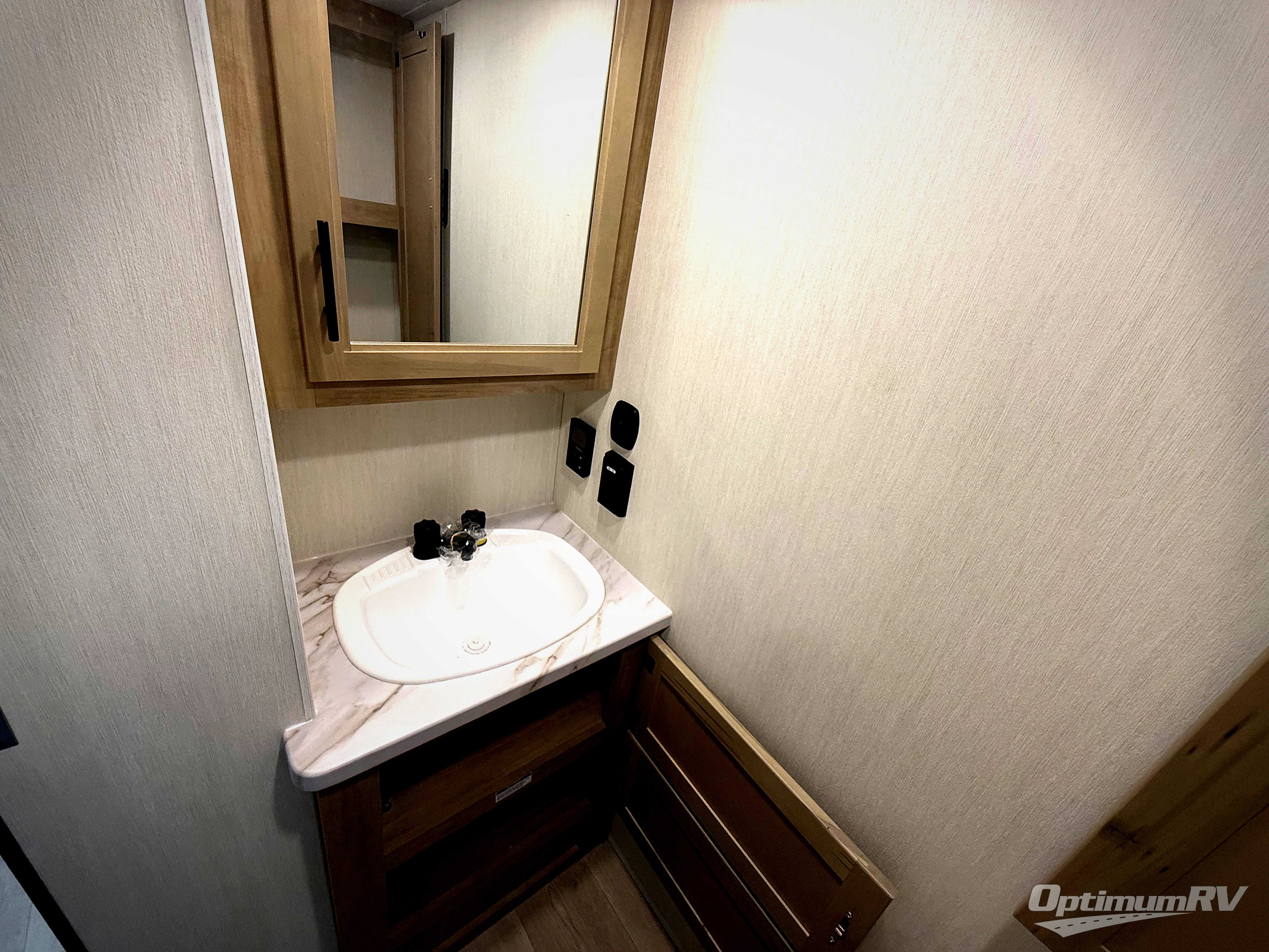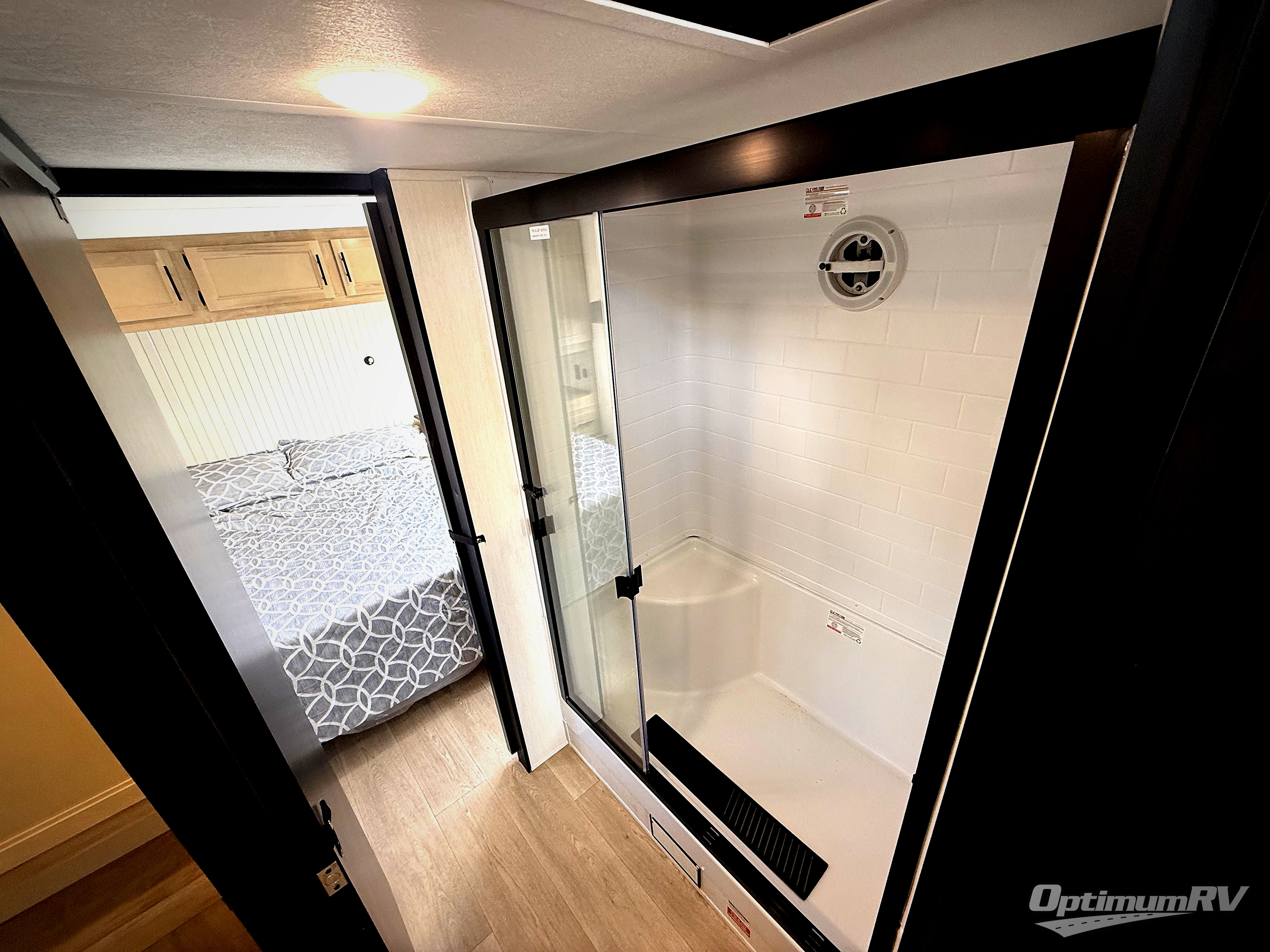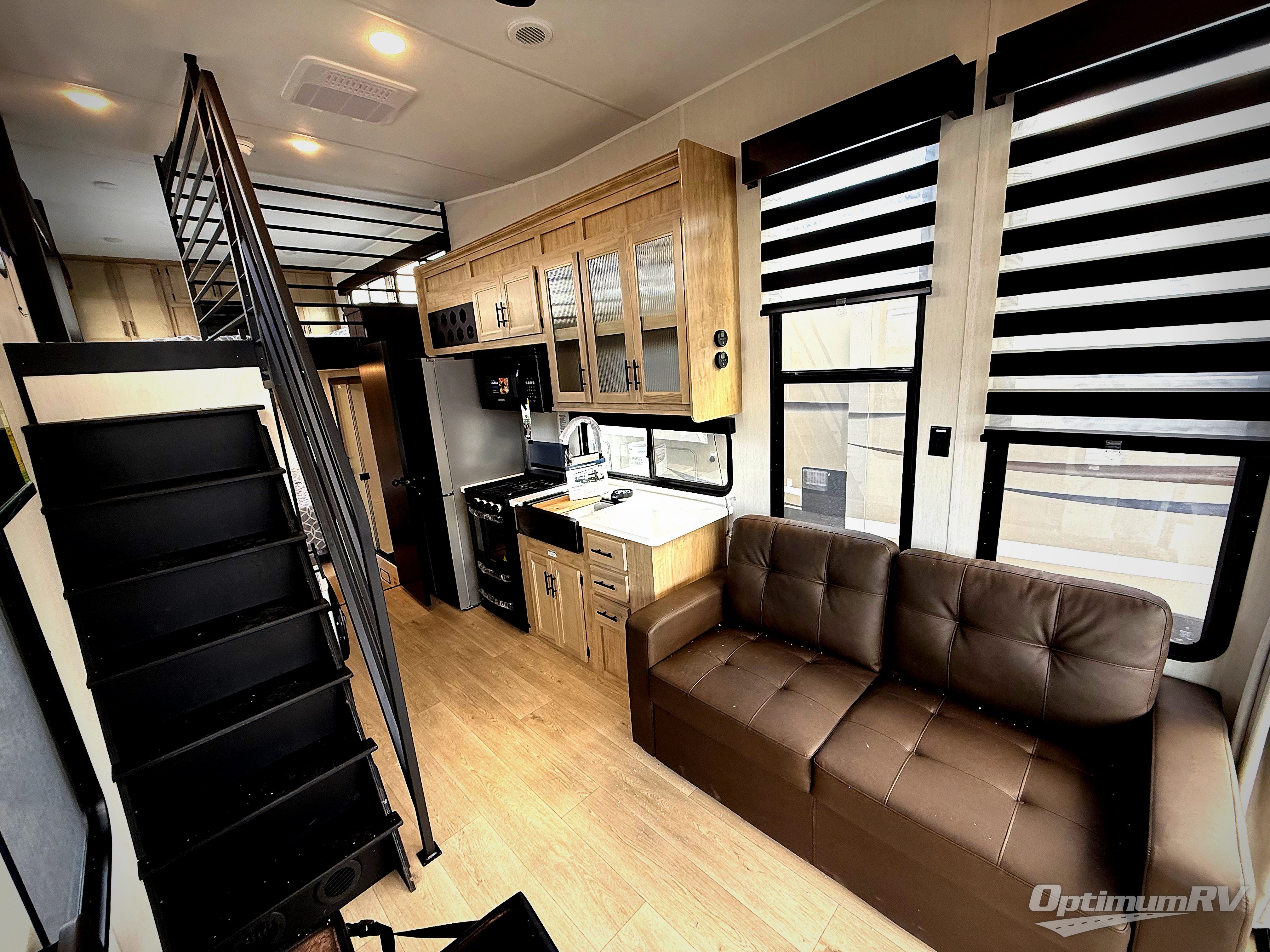 This model is similar to 16ML but larger! A bigger bathroom, RV king bed in the lower master, and a queen bed plus a twin bunk mat in the front loft. And the second loft can be utilized as extra sleeping space or storage space! There is an 18 cu. ft. refrigerator so you can stock up for a week long vacation, a hide-a-bed sofa that can transform into added sleeping for guests, and a high top table with two stools to dine at. The bathroom below is split with a shower on one side, and a private toilet area and sink opposite. And the view is amazing from just about anywhere inside.