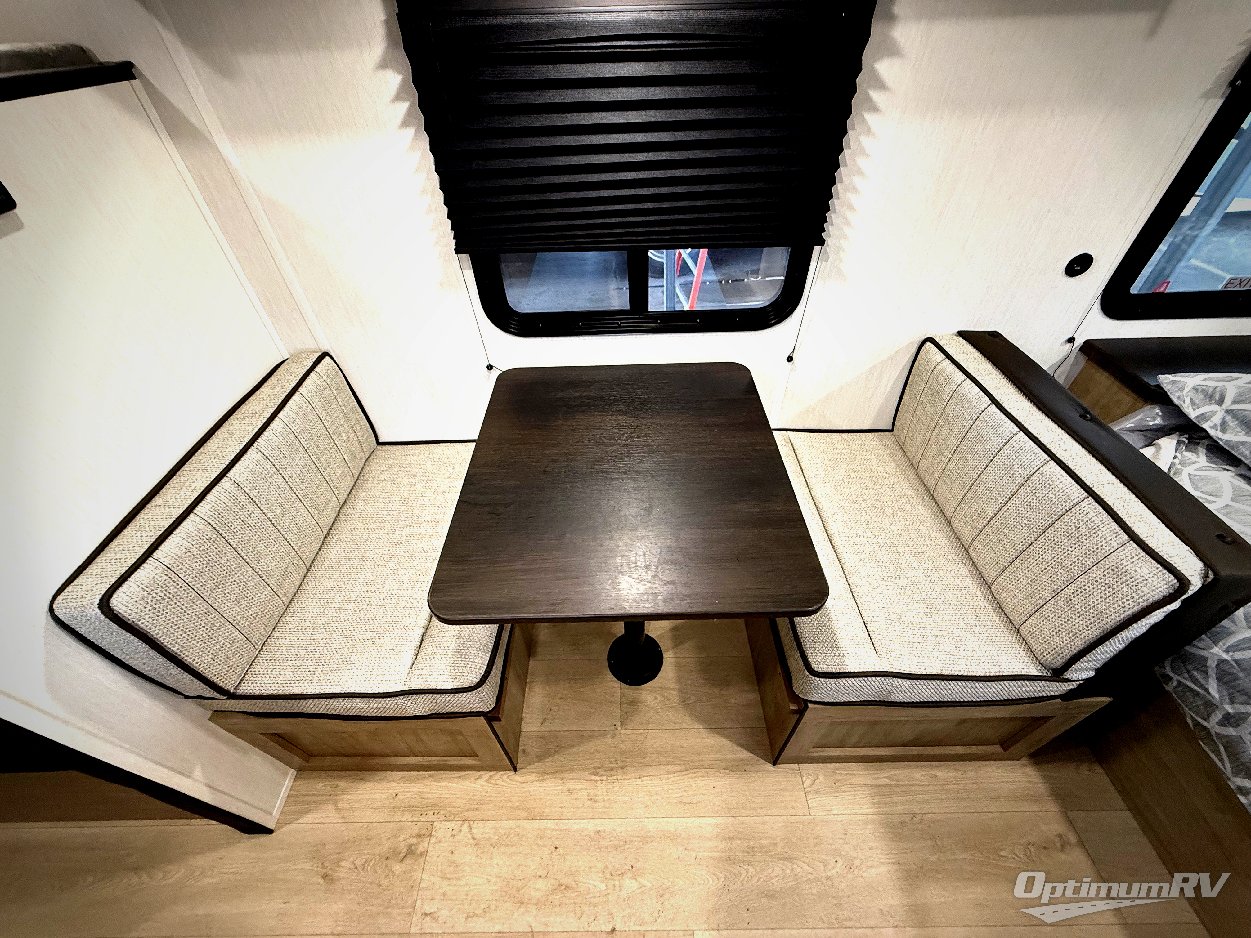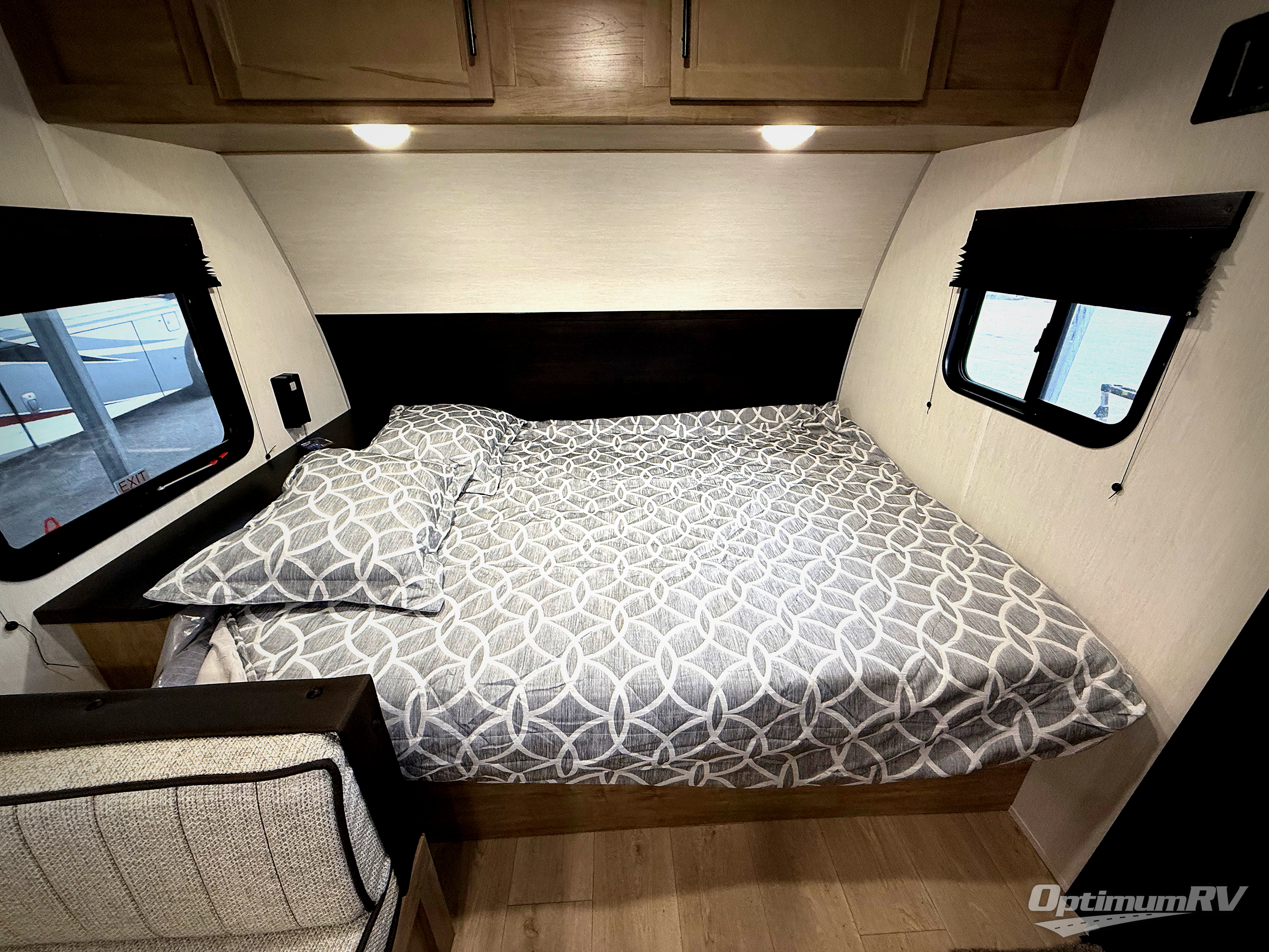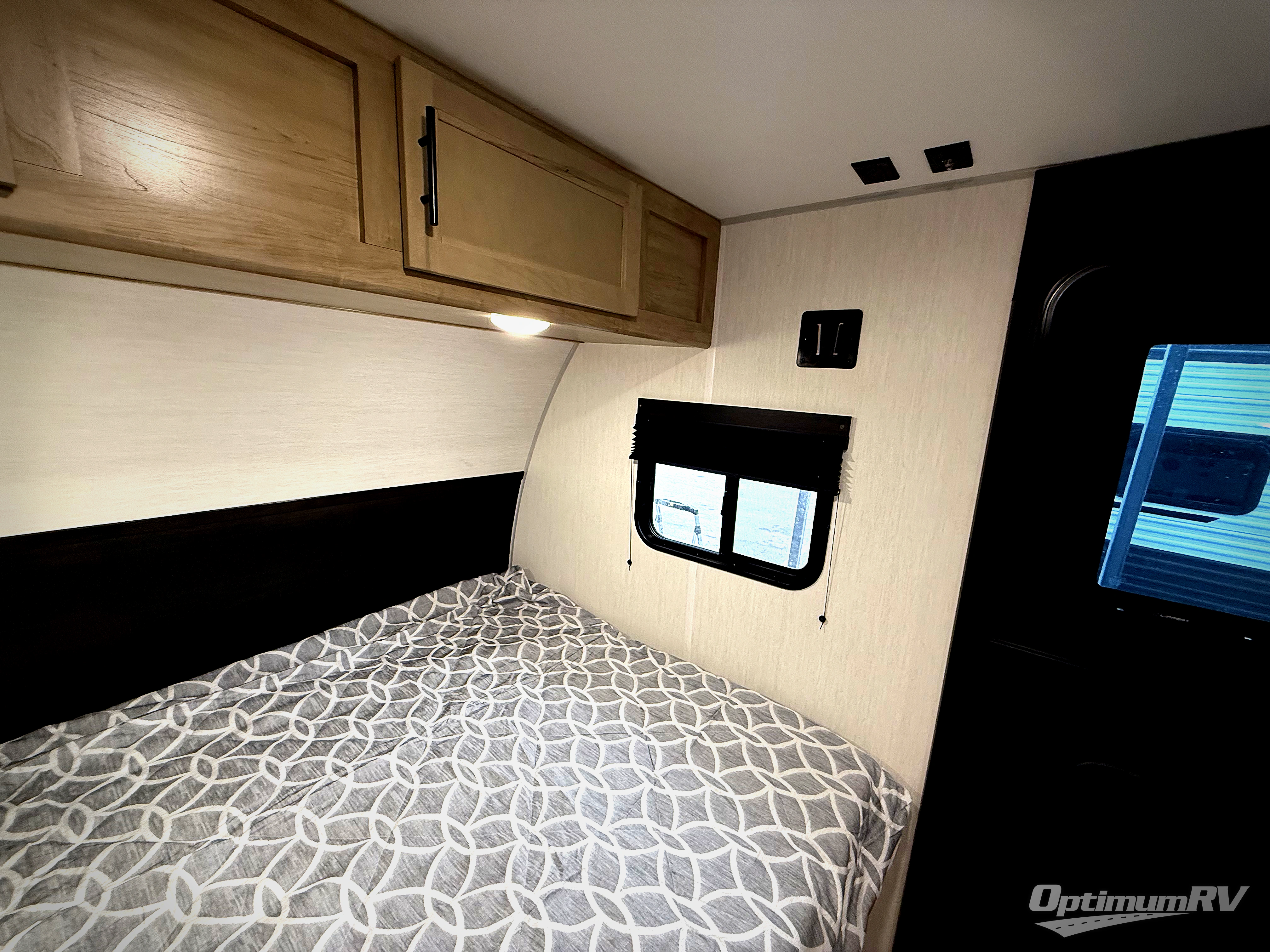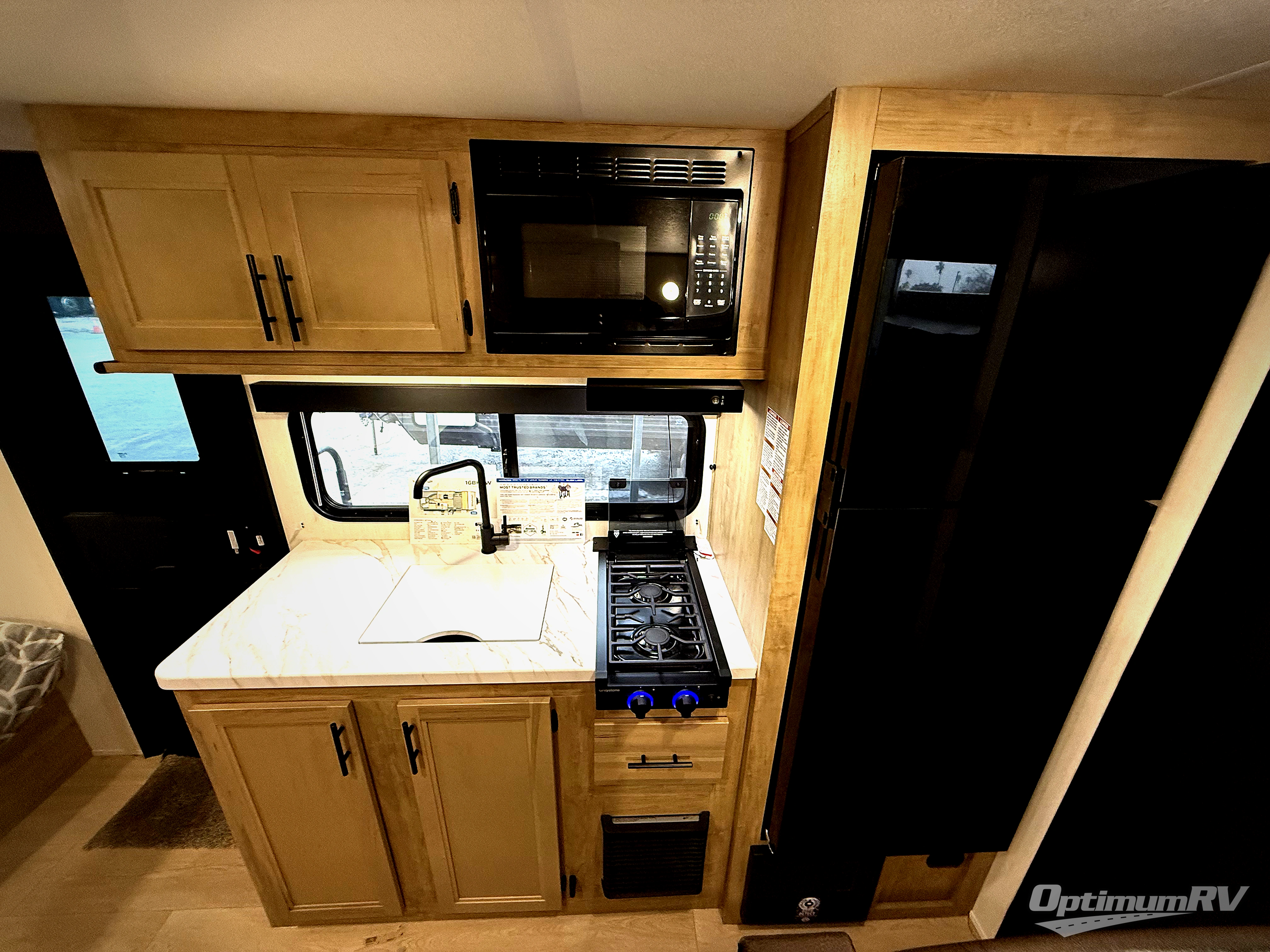 The whole family can sleep comfortably in this travel trailer! It has a set of bunk beds for the kids to sleep on, and you can sleep comfortably on the front queen bed with overhead cabinets and a shelf. There is even an exterior storage plus door that accesses the storage space under the bottom bunk. The chef will enjoy preparing their best home cooked meals either indoors with the high output cooktop or at the outside mini kitchen while staying protected by the 12' power awning!