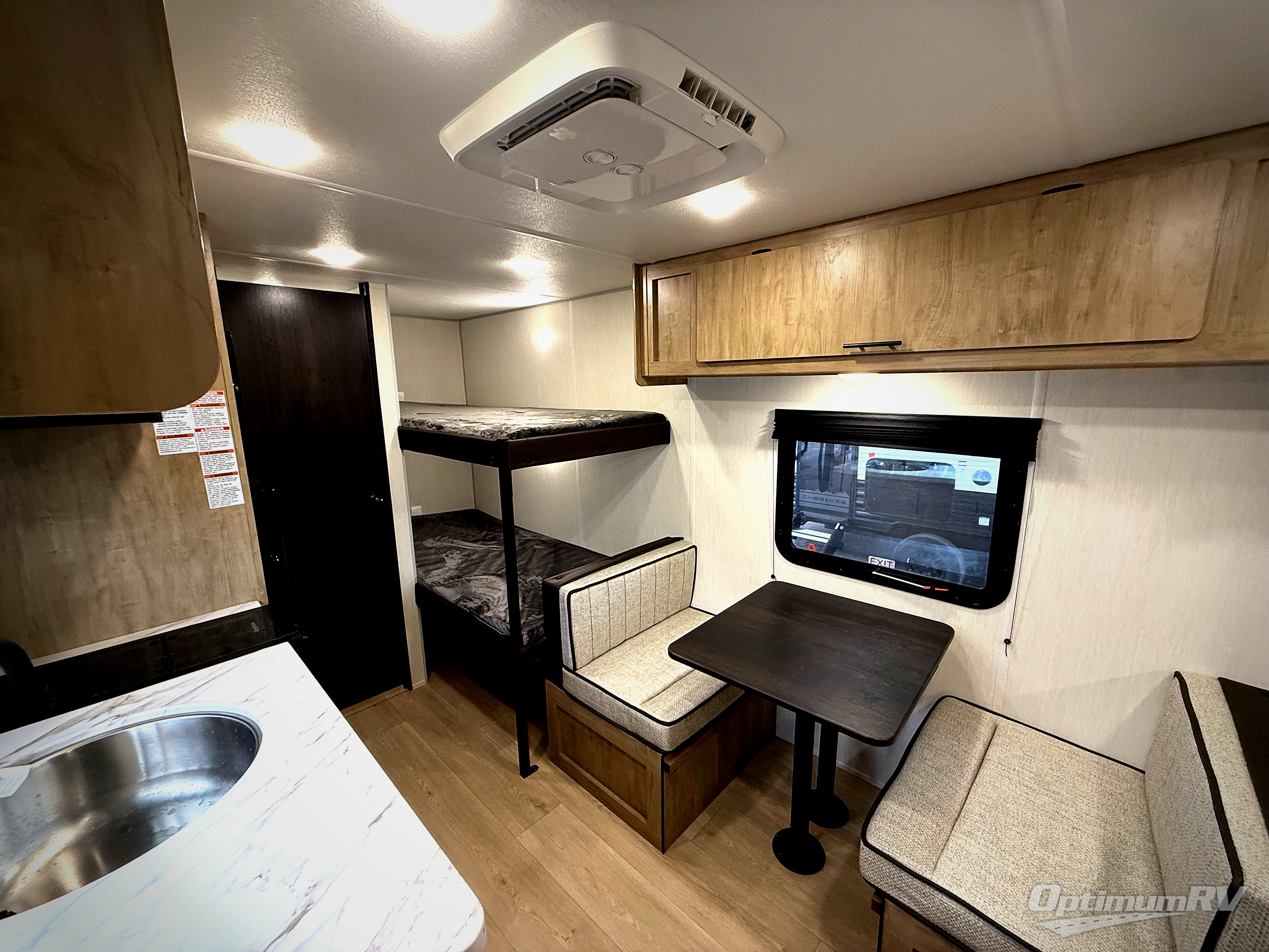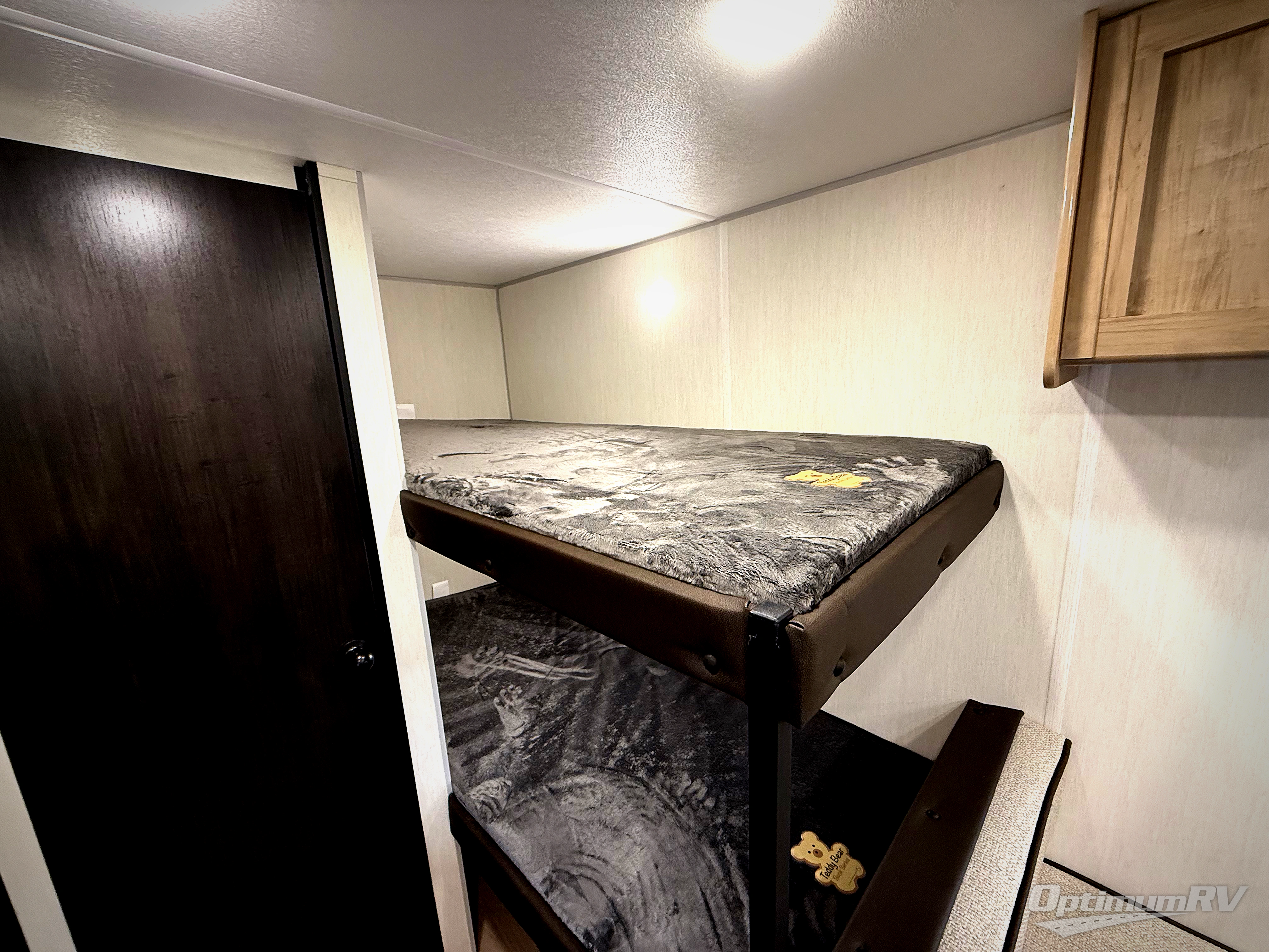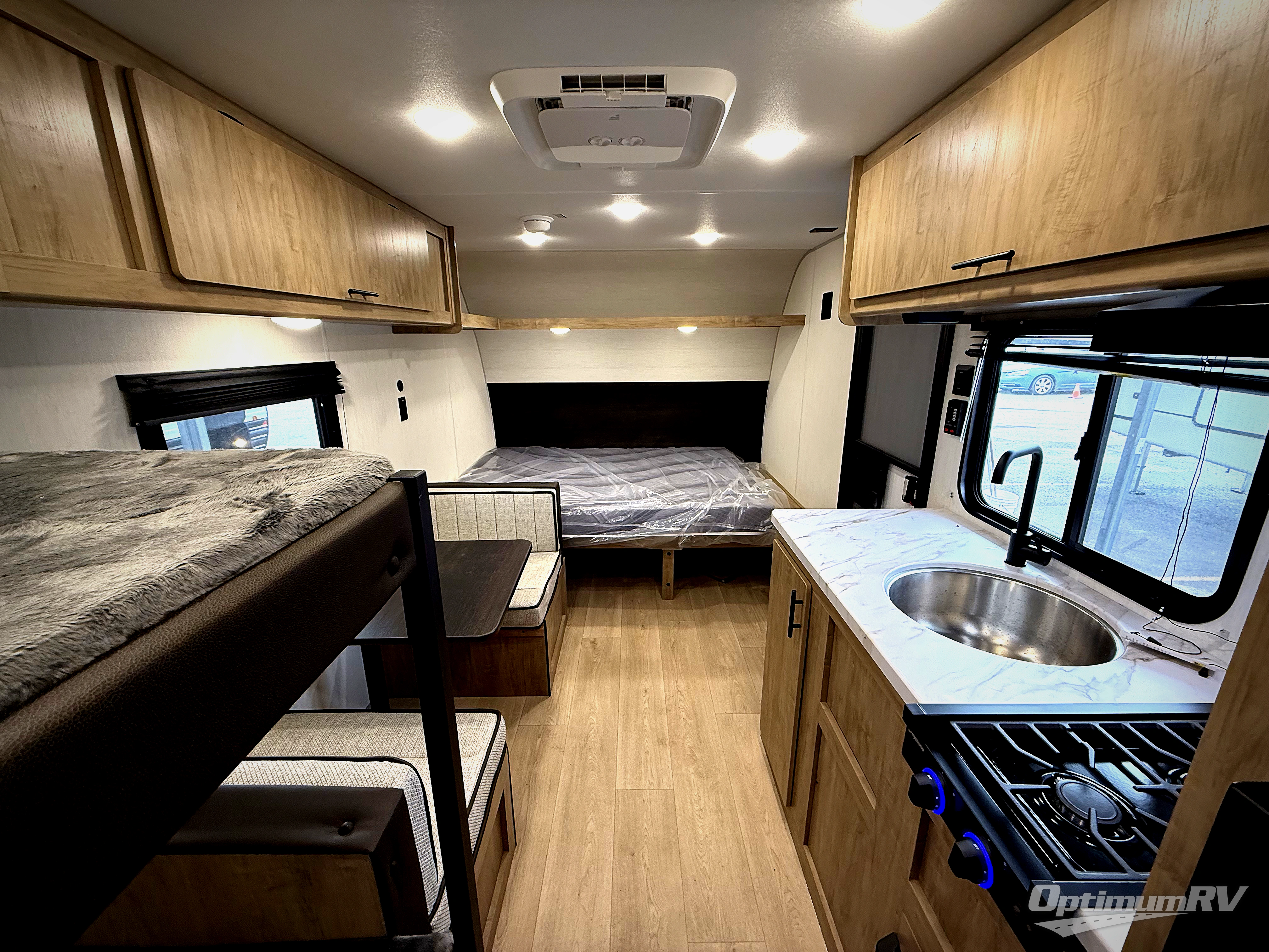 The whole family can sleep comfortably in this travel trailer! It has a set of bunk beds for the kids to sleep on, and you can sleep comfortably on the front queen bed with overhead cabinets and a shelf. The chef will enjoy preparing their best home cooked meals with the cooktop, and you can dine at the booth dinette. And the private bath onboard means you won't have to leave your camper in the middle of the night!