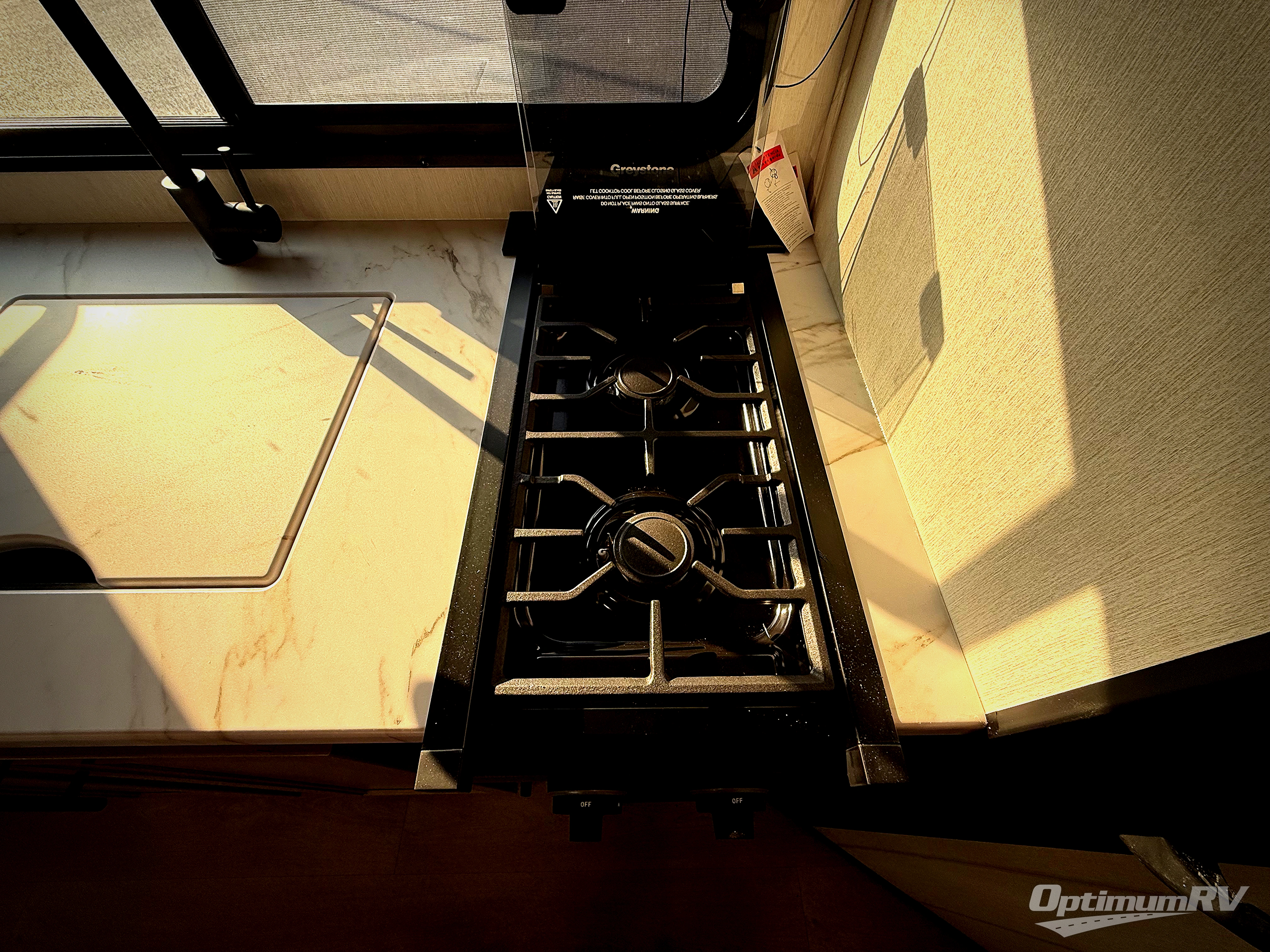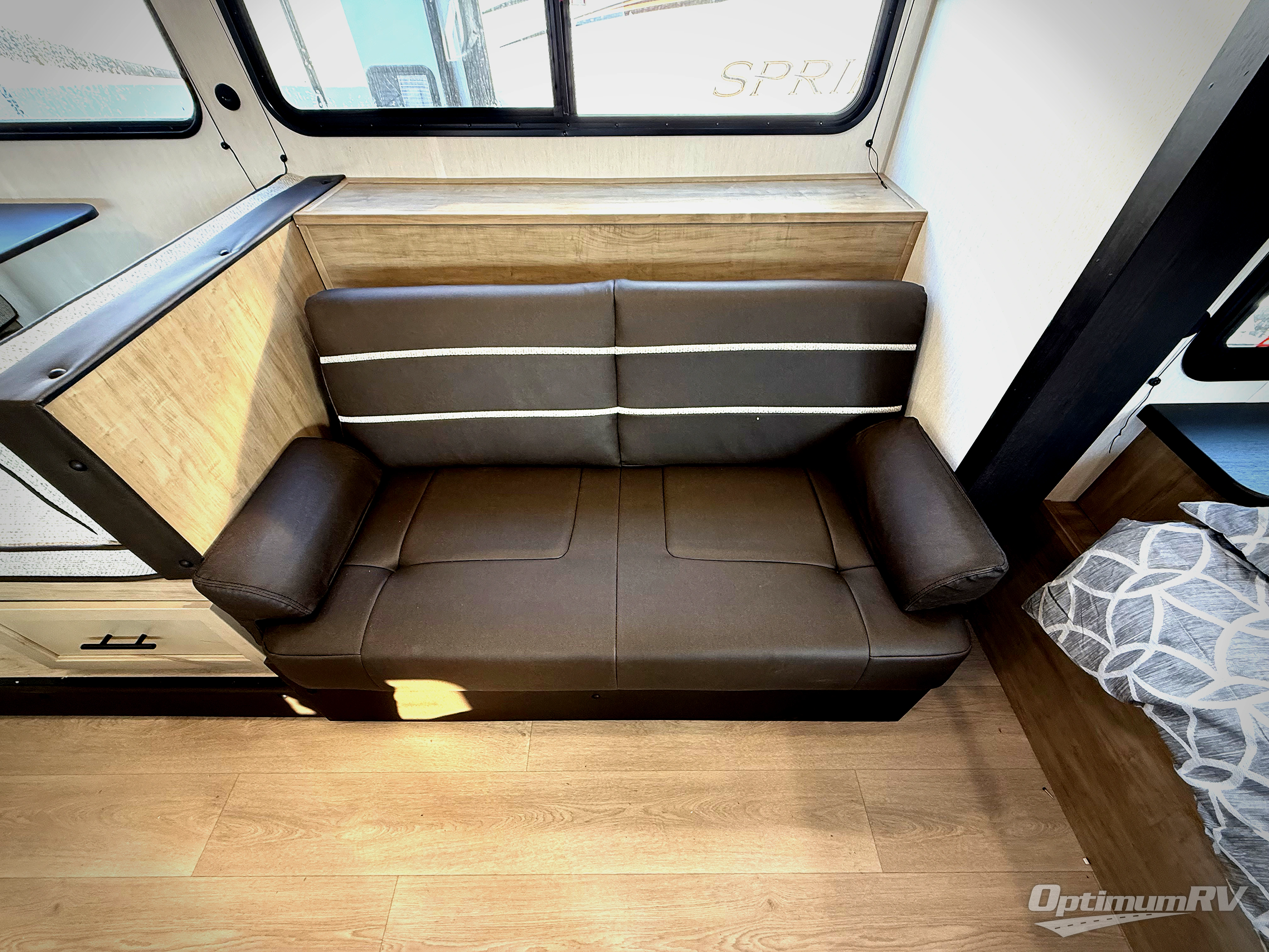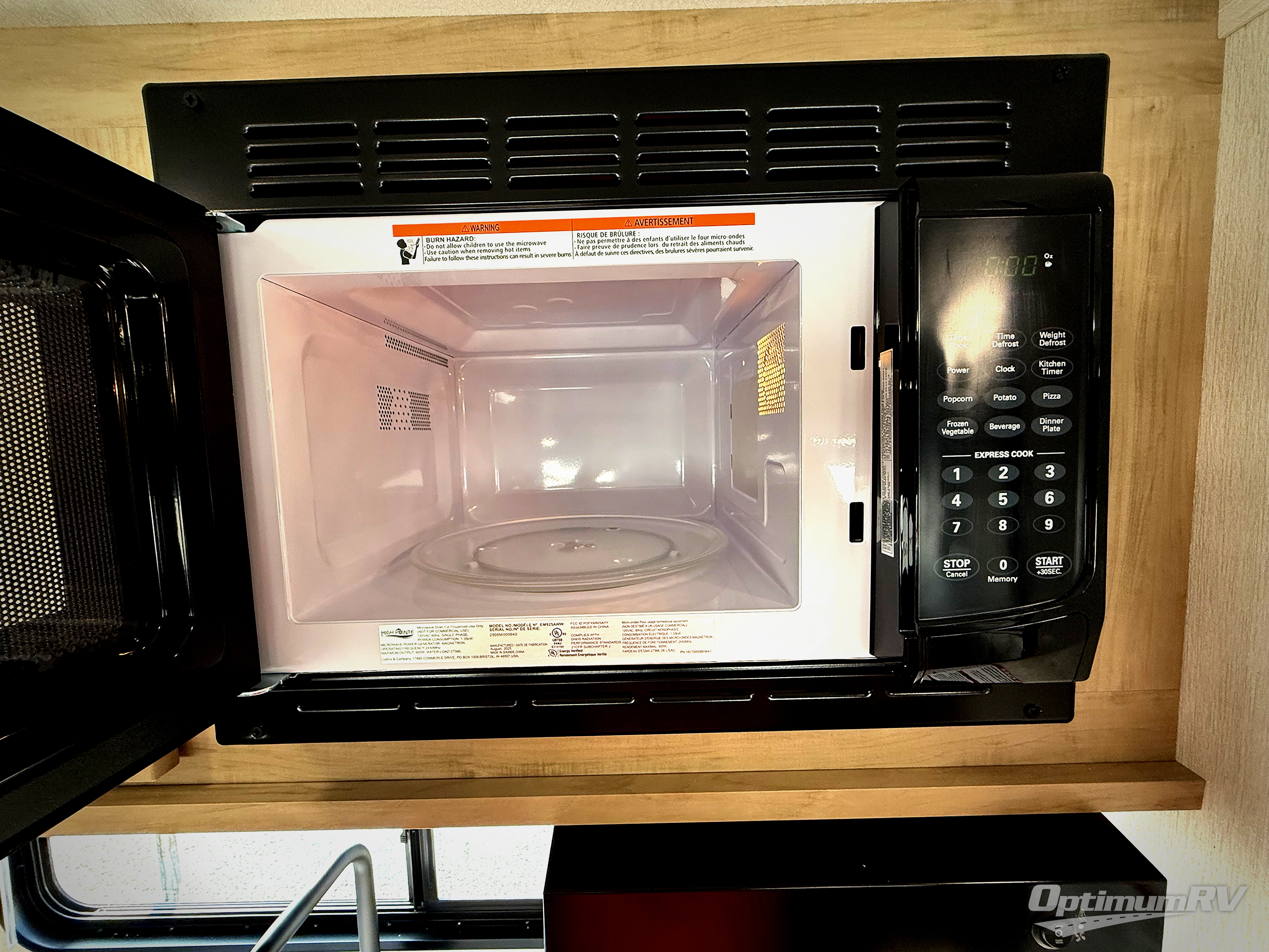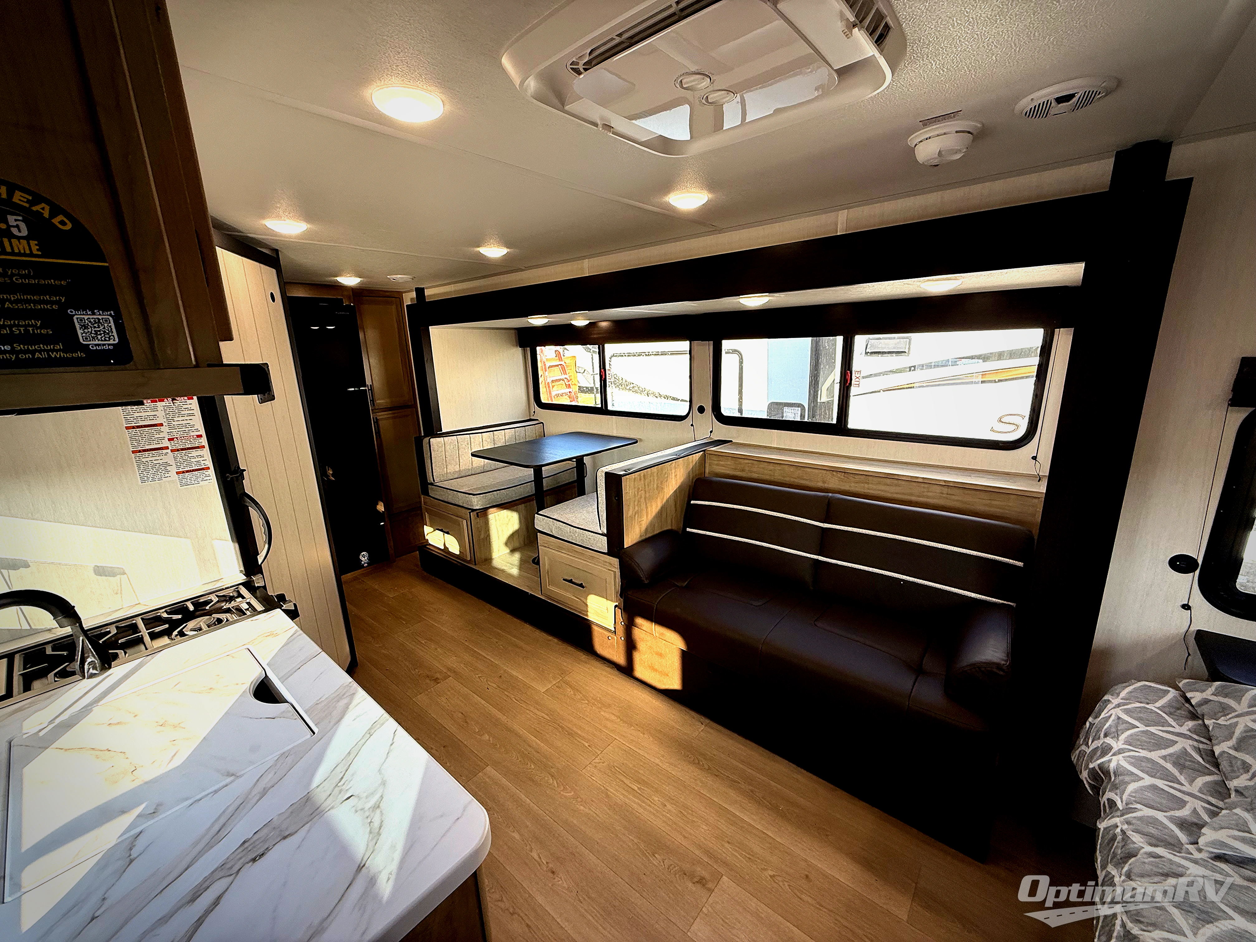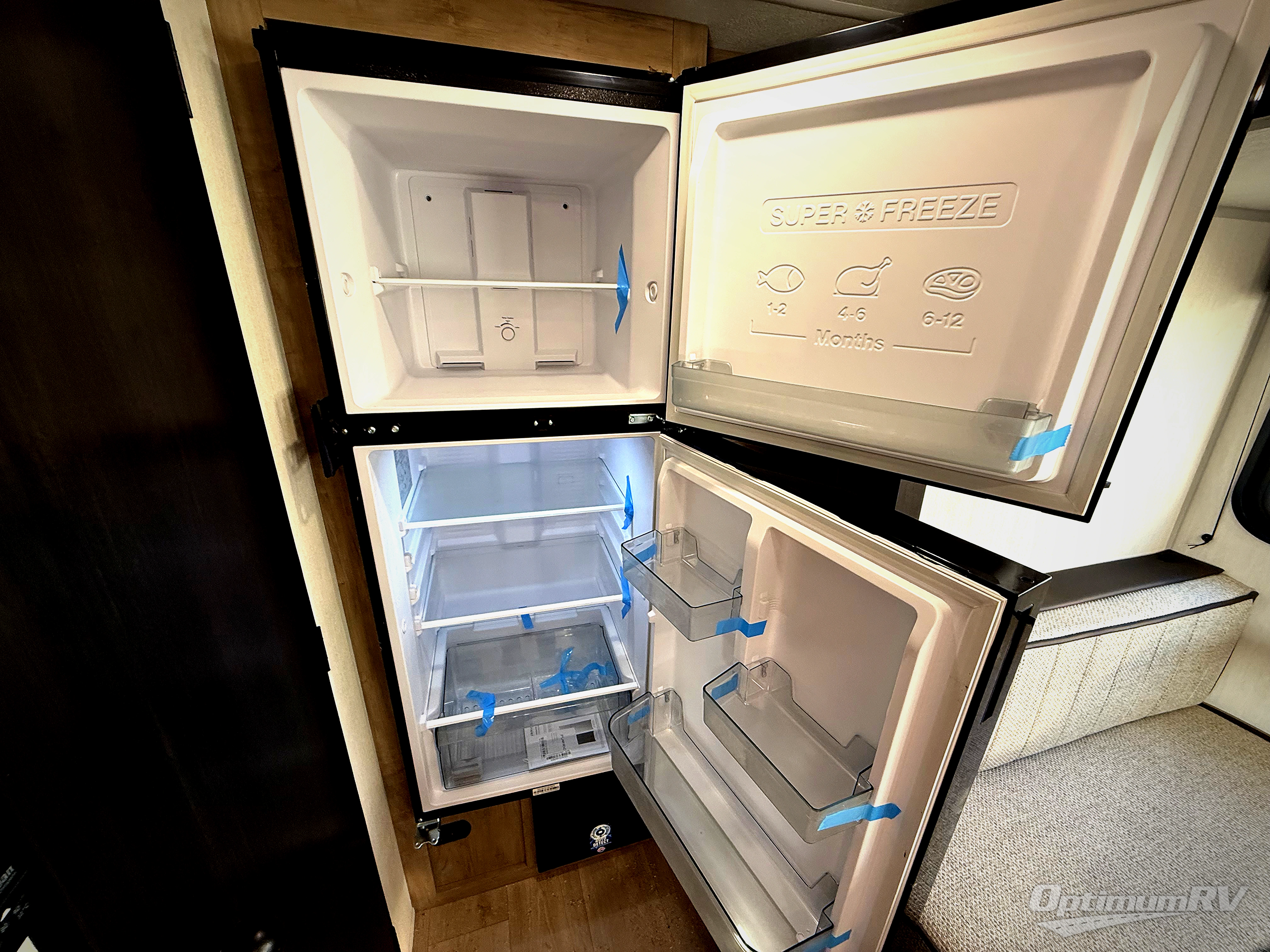 Camping trips in this spacious travel trailer are sure to bring memories! Once you arrive at the campground, you can unload the outside storage, put out the 12' awning, and enjoy the outdoor mini kitchen. Once inside, you can dine at the booth dinette, relax on the sofa, and freshen up in the full bath with a tub/shower. The front queen bed will provide a great night's rest, while your guests sleep on the living area furniture. This travel trailer also includes ample interior storage, including a spacious kitchen pantry, an overhead cabinet above the bed, plus additional storage beside the refrigerator!
