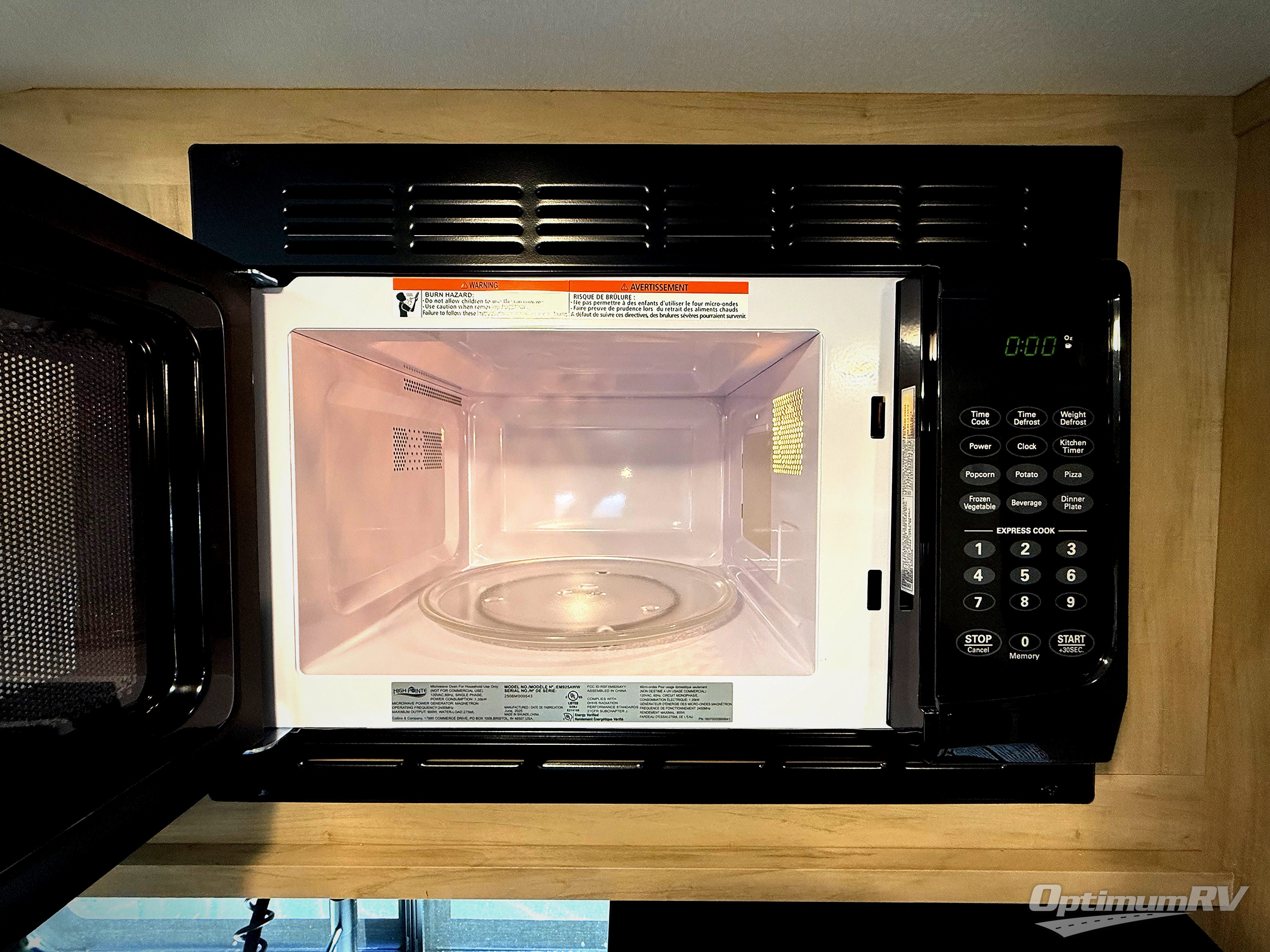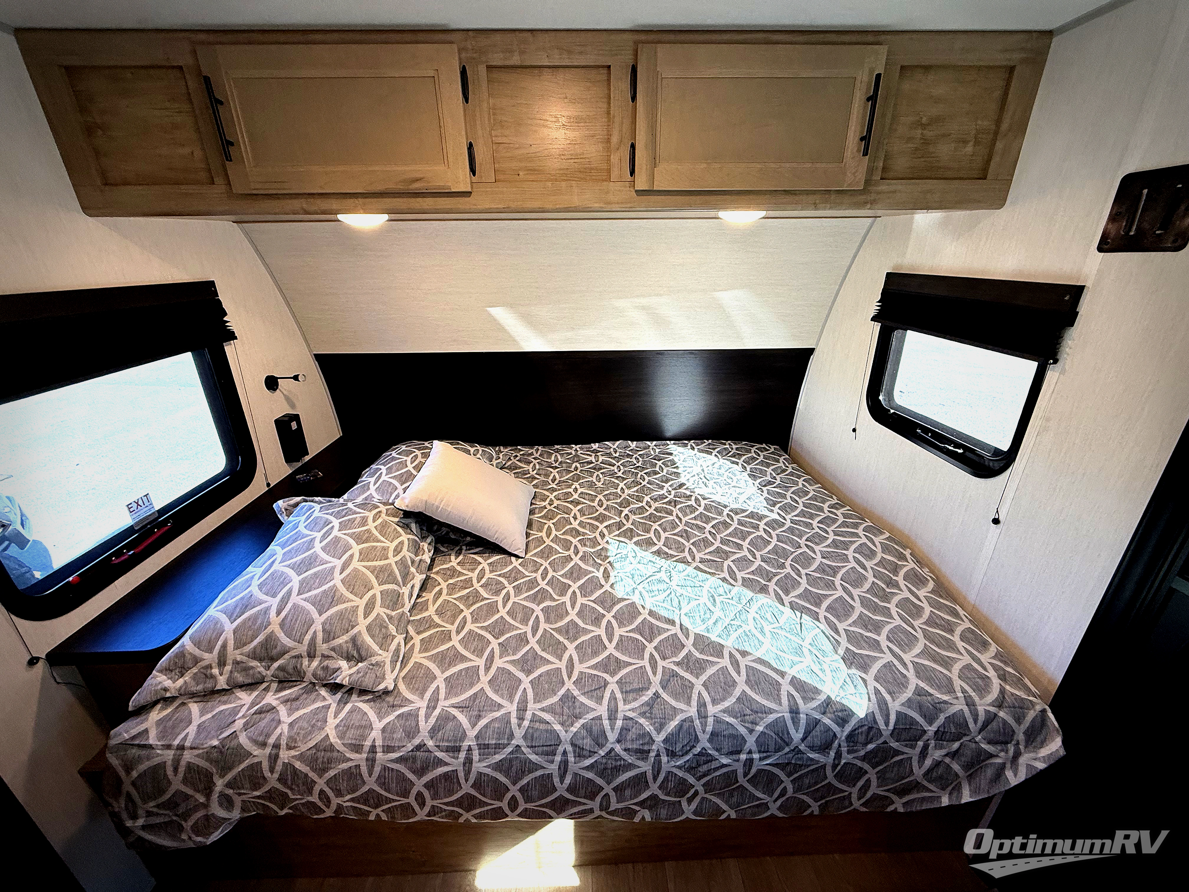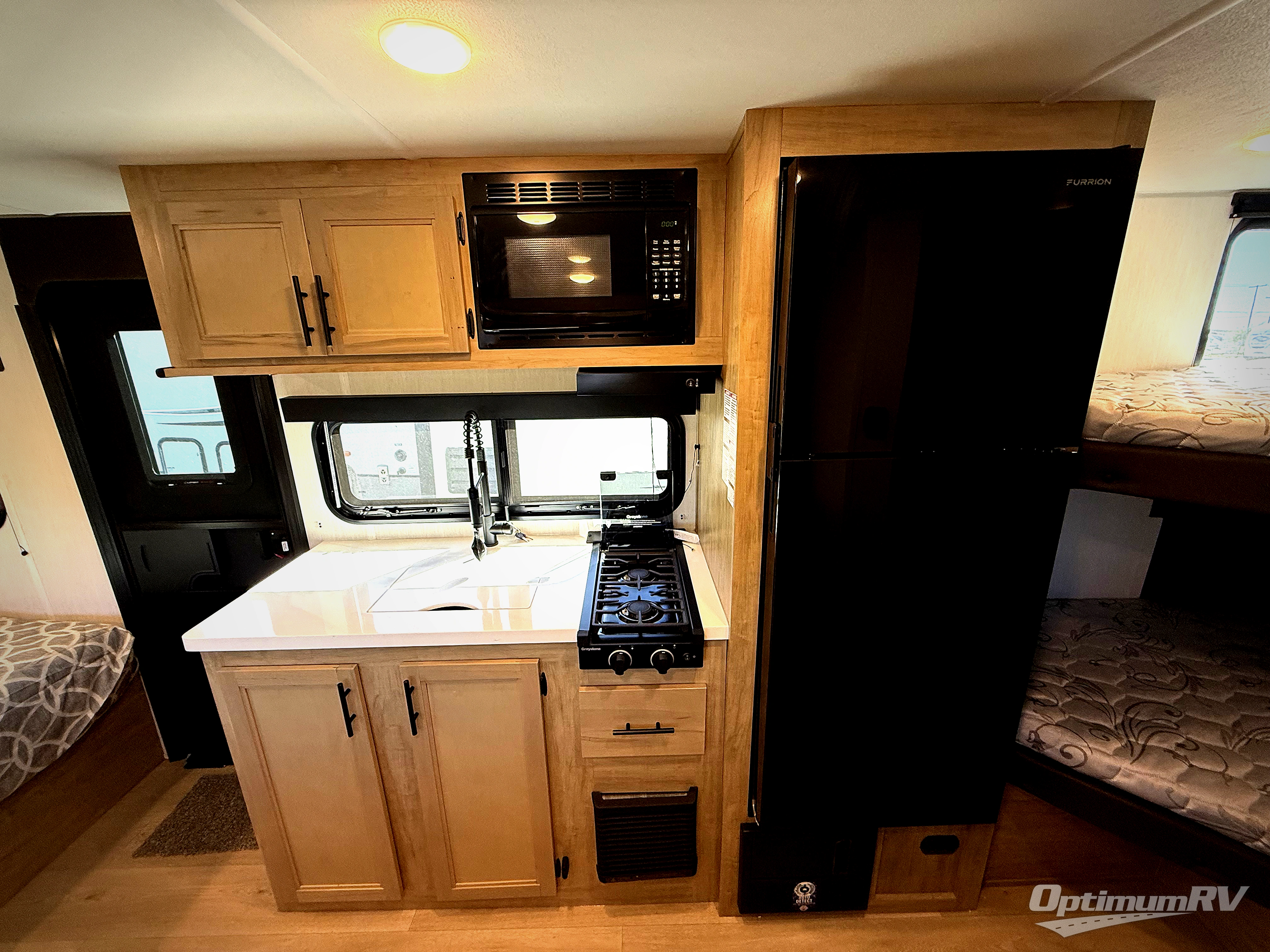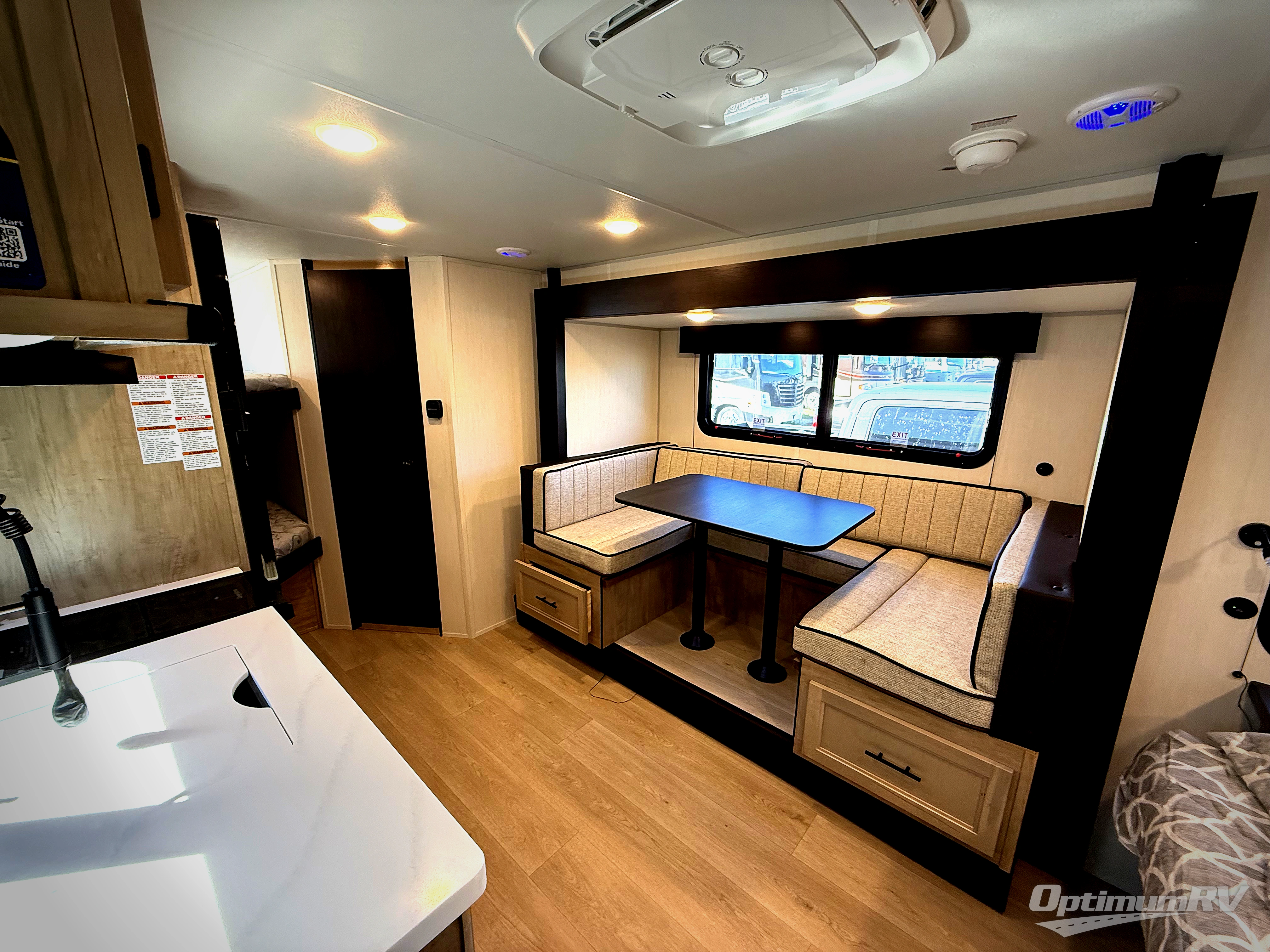 This family travel trailer is ready to head to the campground whenever you are! The kiddos can sleep on the set of double-size bed bunks, and you can sleep on the front queen bed, plus the U-shaped dinette slide can also transform into an extra sleeping space when you aren't using it to enjoy a meal. You can prepare your delicious meals on the range or at the outside mini kitchen and stay protected by the awning. The exterior not only has outside storage and an outside TV mount but also features an outside storage plus door for access to the storage space underneath the bottom bunk bed. The rear corner bath allows everyone to stay clean and refreshed while you camp.