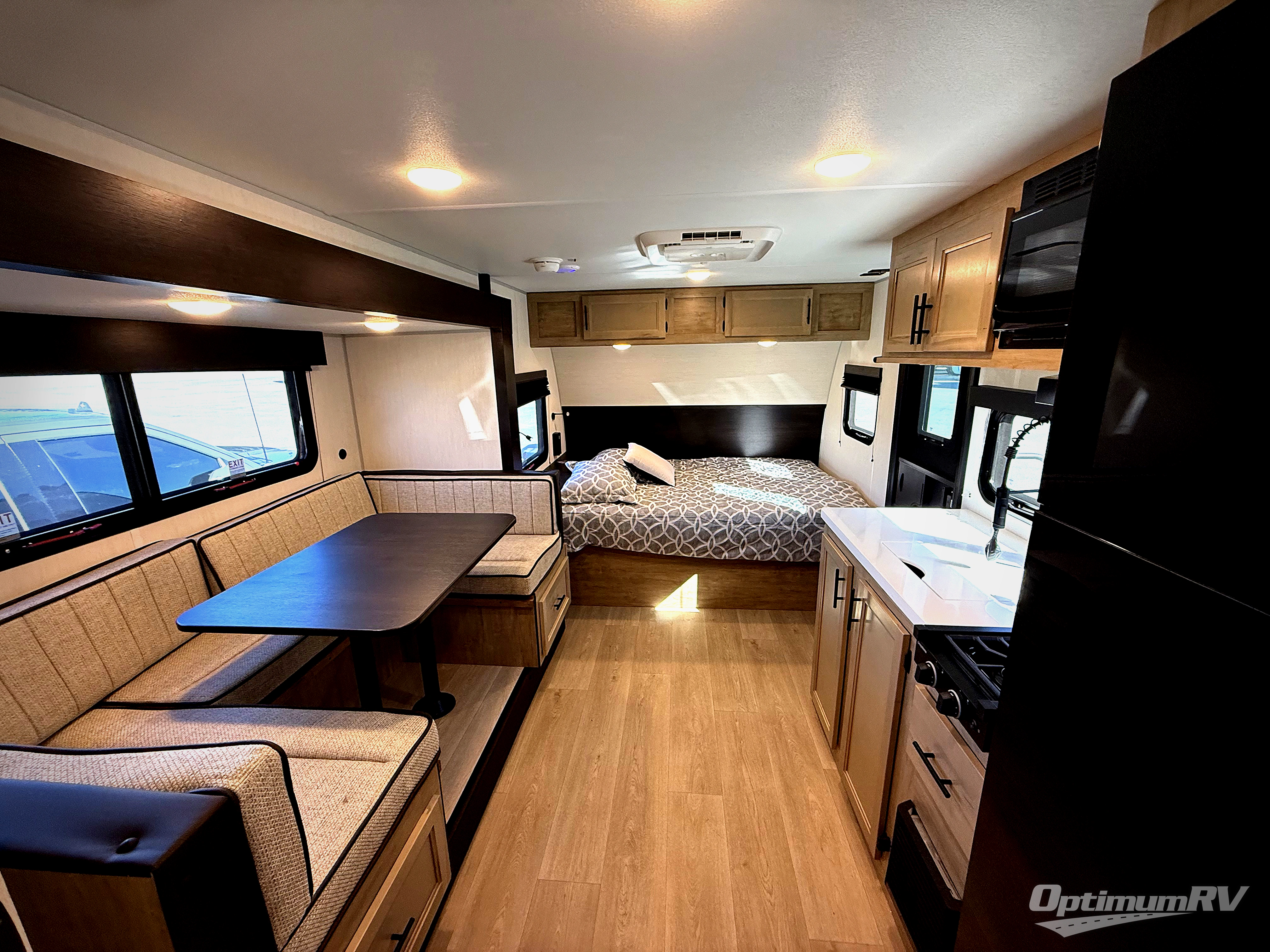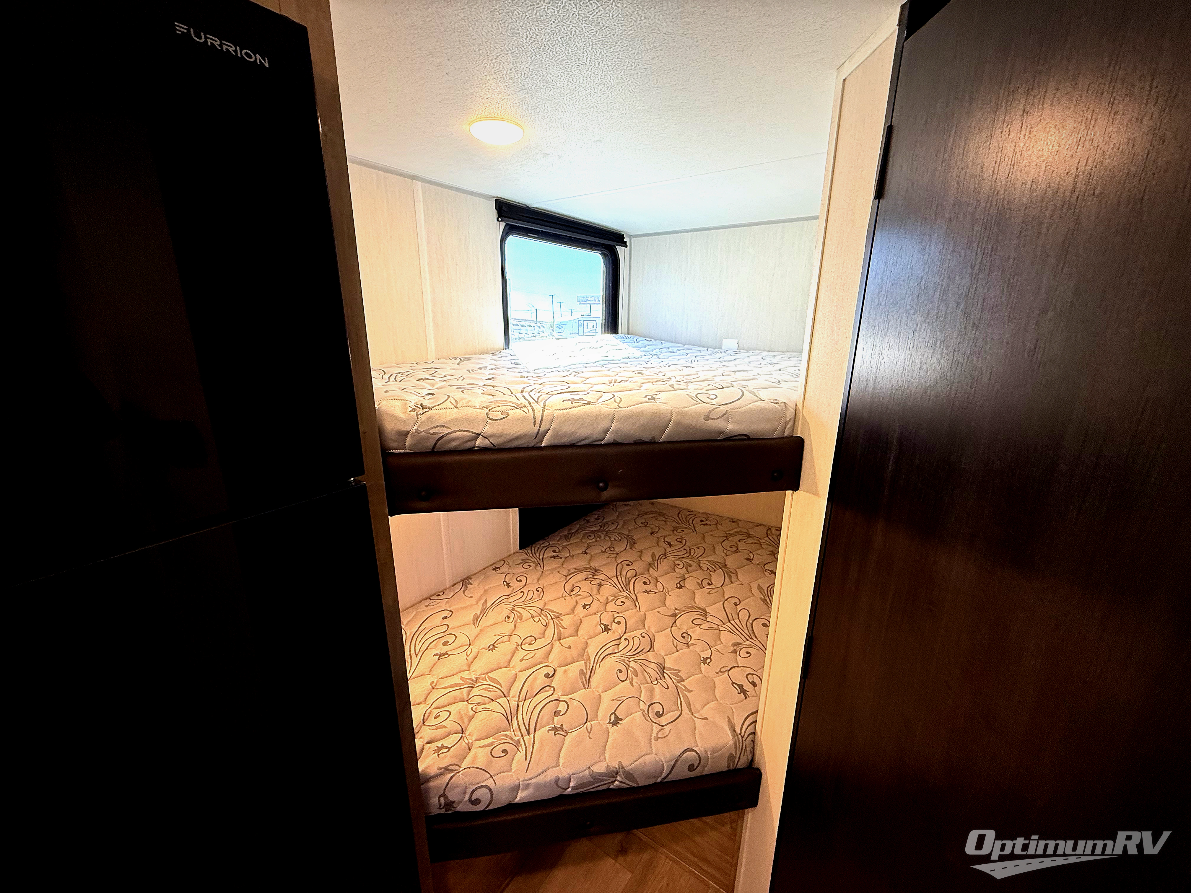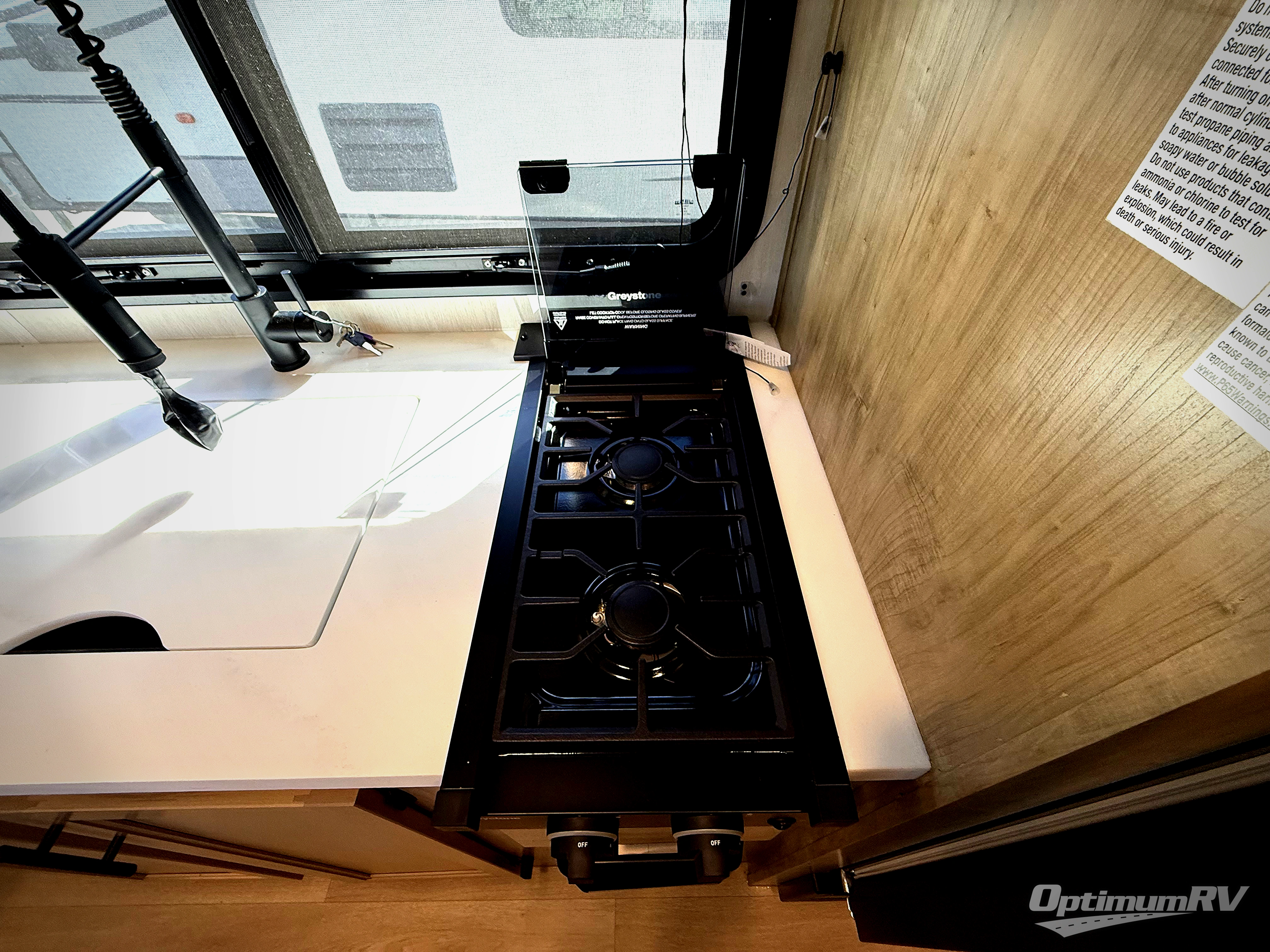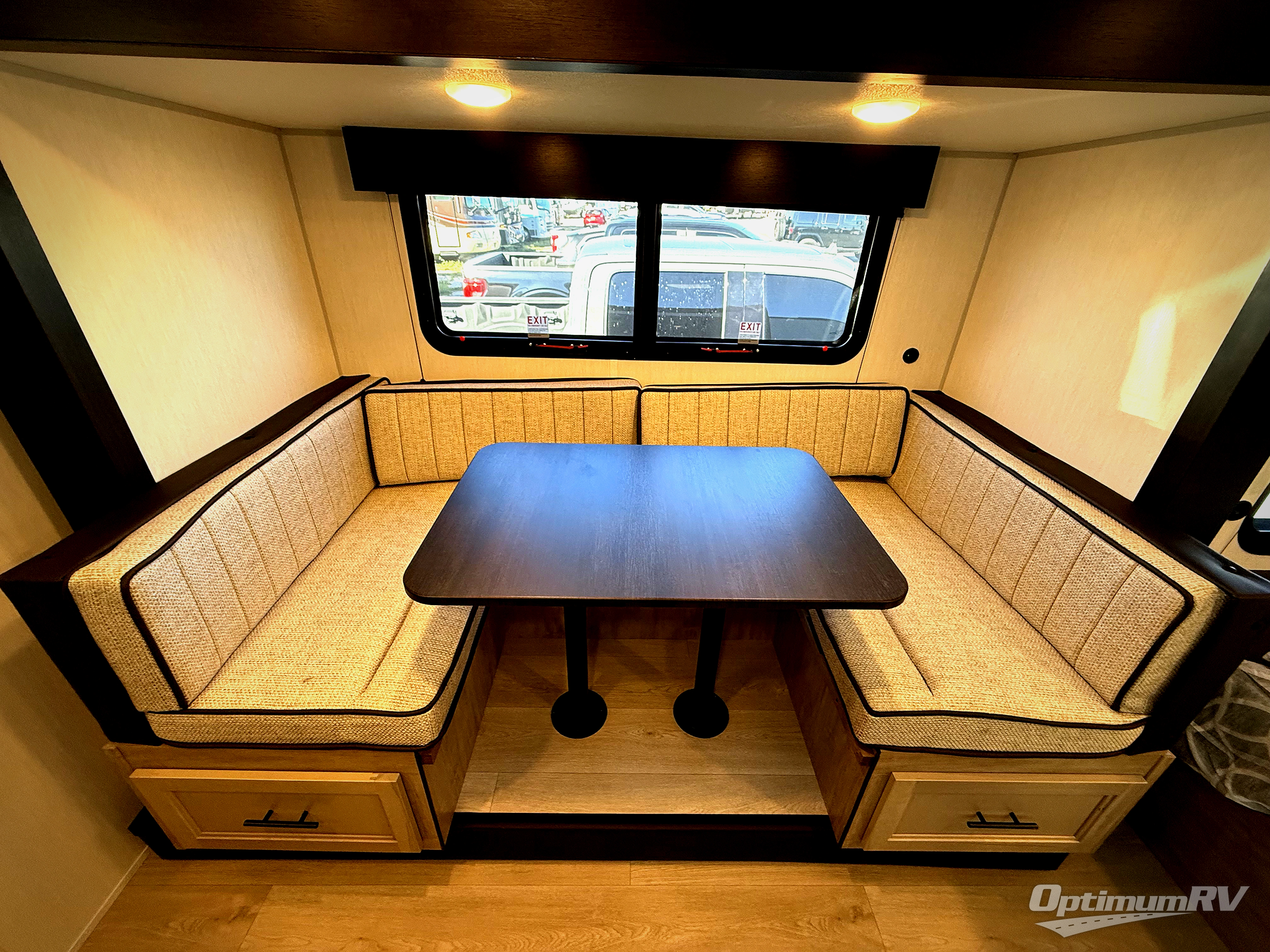 This family travel trailer is ready to head to the campground whenever you are! The kiddos can sleep on the set of double-size bed bunks, and you can sleep on the front queen bed, plus the U-shaped dinette slide can also transform into an extra sleeping space when you aren't using it to enjoy a meal. You can prepare your delicious meals on the range or at the outside mini kitchen and stay protected by the awning. The exterior not only has outside storage and an outside TV mount but also features an outside storage plus door for access to the storage space underneath the bottom bunk bed. The rear corner bath allows everyone to stay clean and refreshed while you camp.
