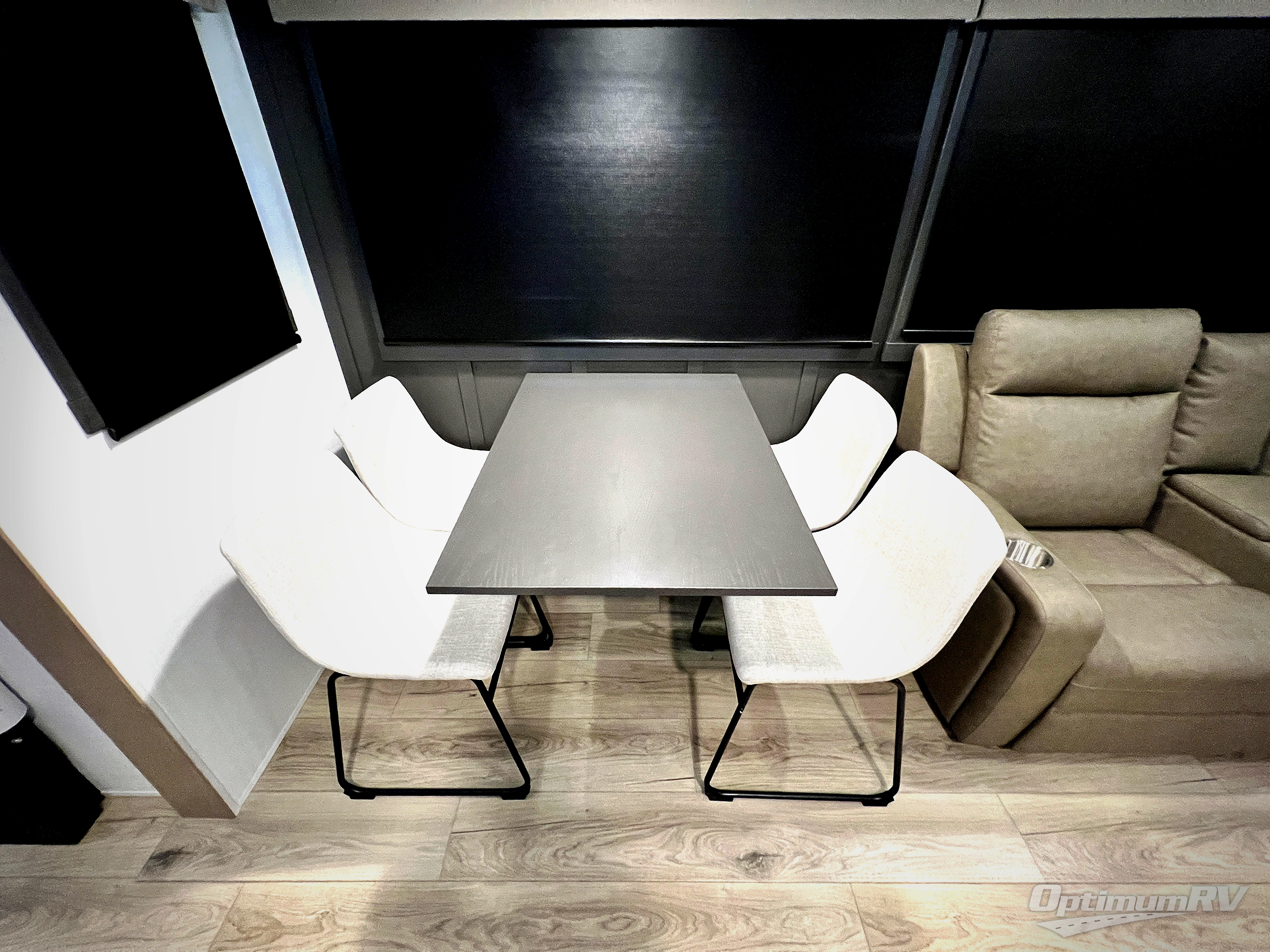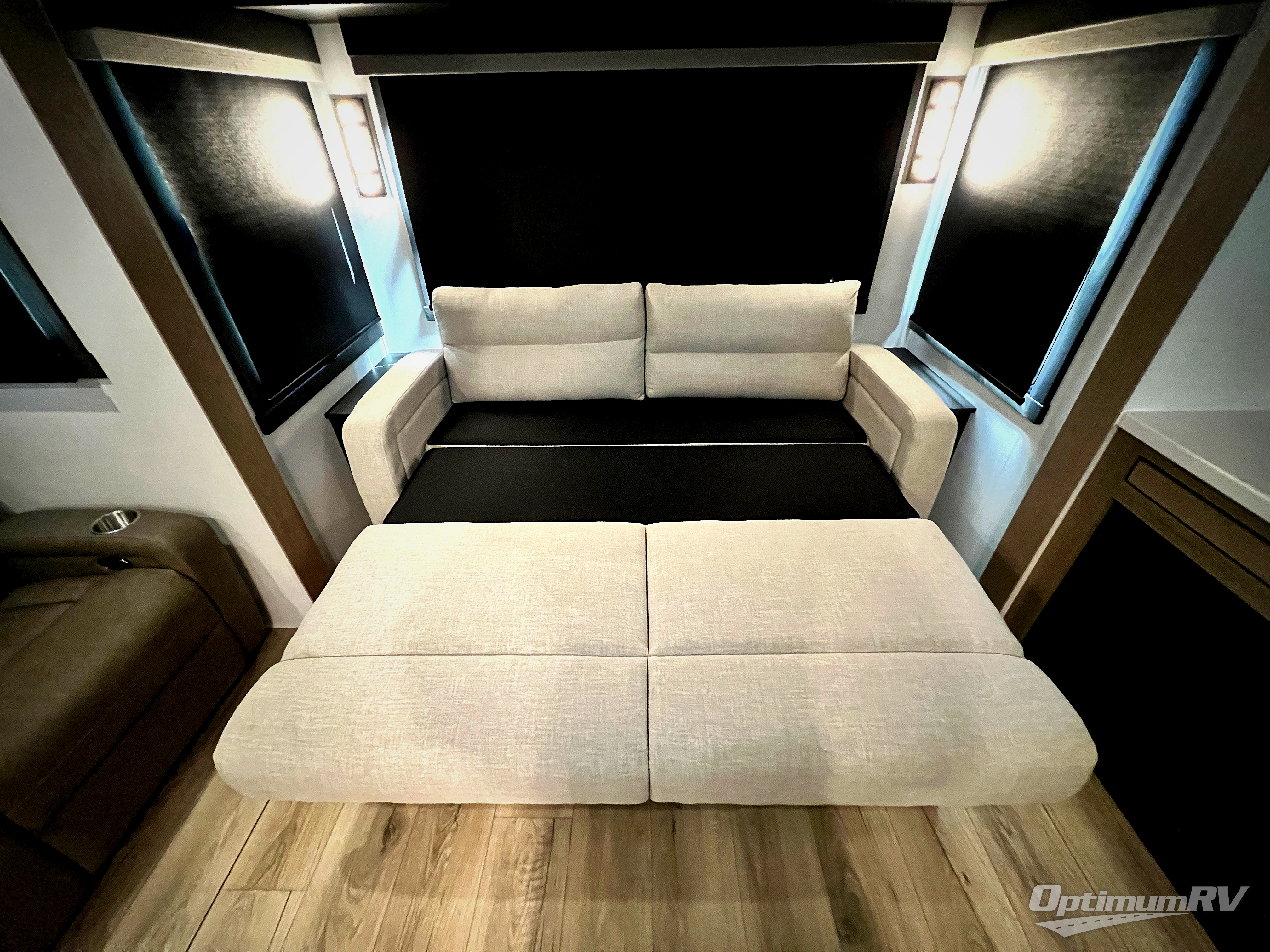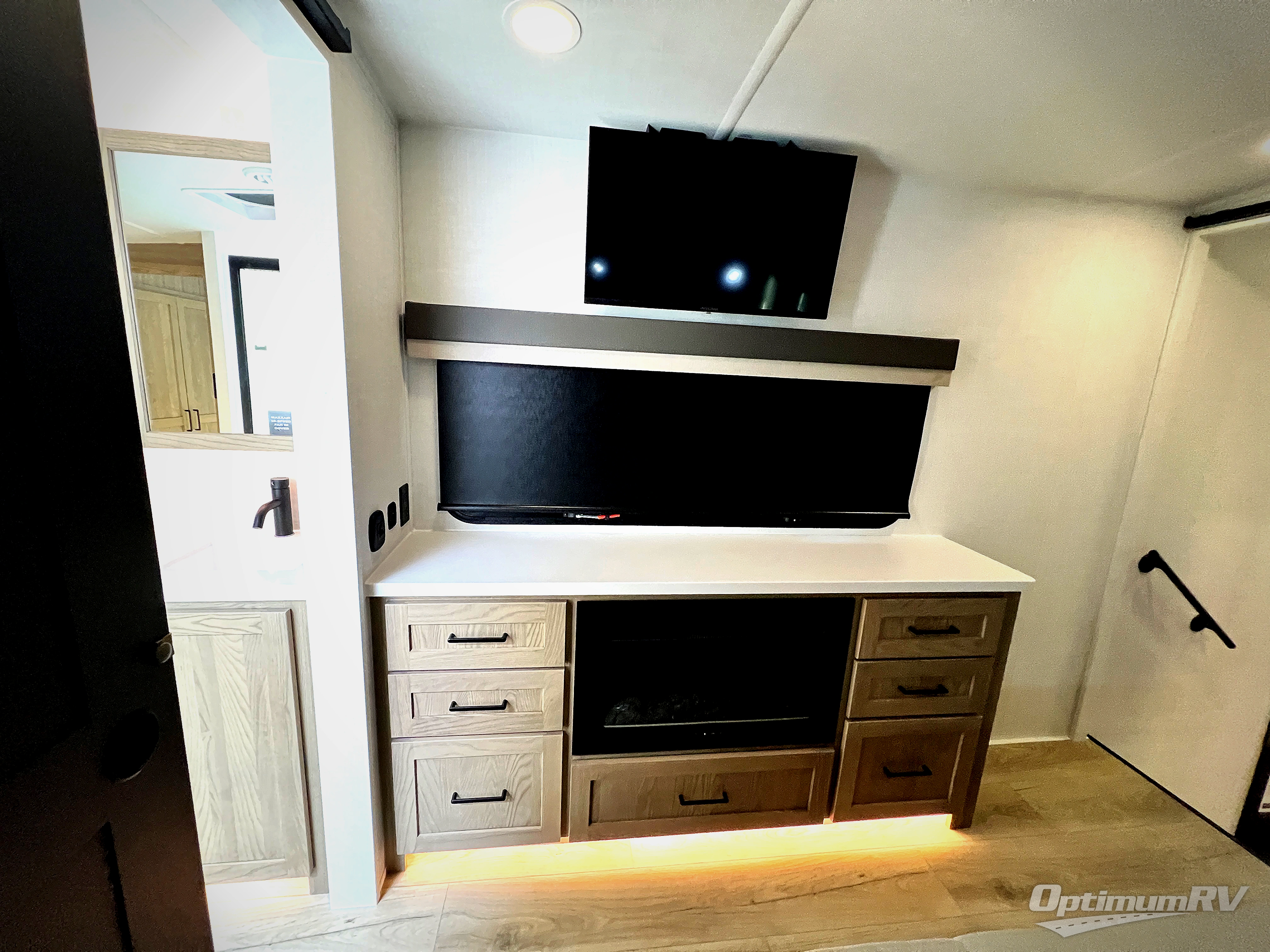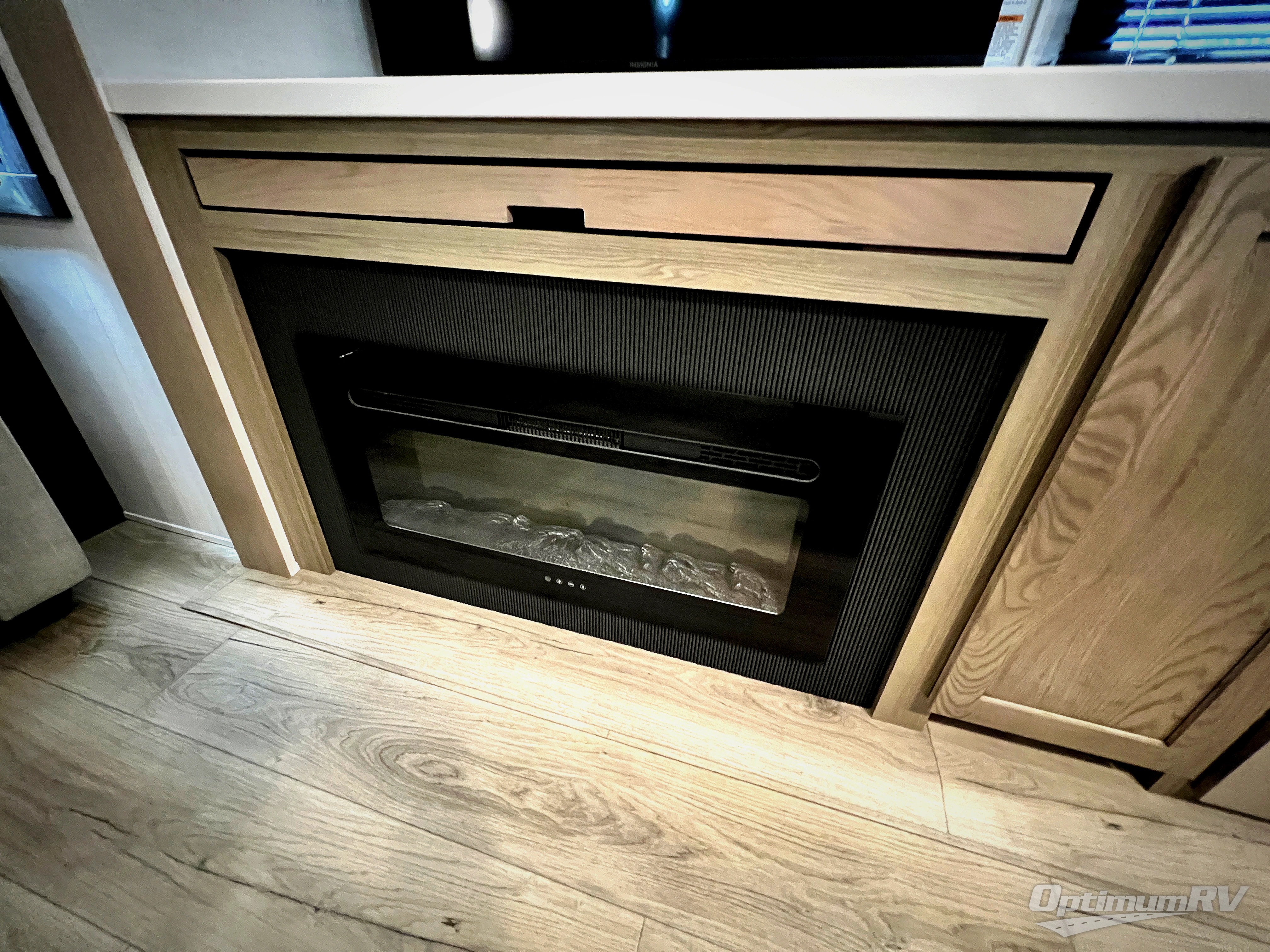 You can't go wrong when choosing this spacious fifth wheel! The master bedroom features a king bed slide out, wardrobe, and a dresser with a fireplace, and the full front bath is sure to bring comfort. There are dual bath sinks here, tons of storage, and even washer and dryer prep if you choose to add these appliances. The mid-coach half bath will come in handy if you have guests staying over on the rear hide-a-bed sofa. You'll also find a theater seat and a rotating table and chairs where you can dine and relax each day, plus there is a large kitchen island so the chef of your group has plenty of prep space. A Smart TV and fireplace will make your space feel more like home, and there is a pull-out desk here if you need to get some work done!