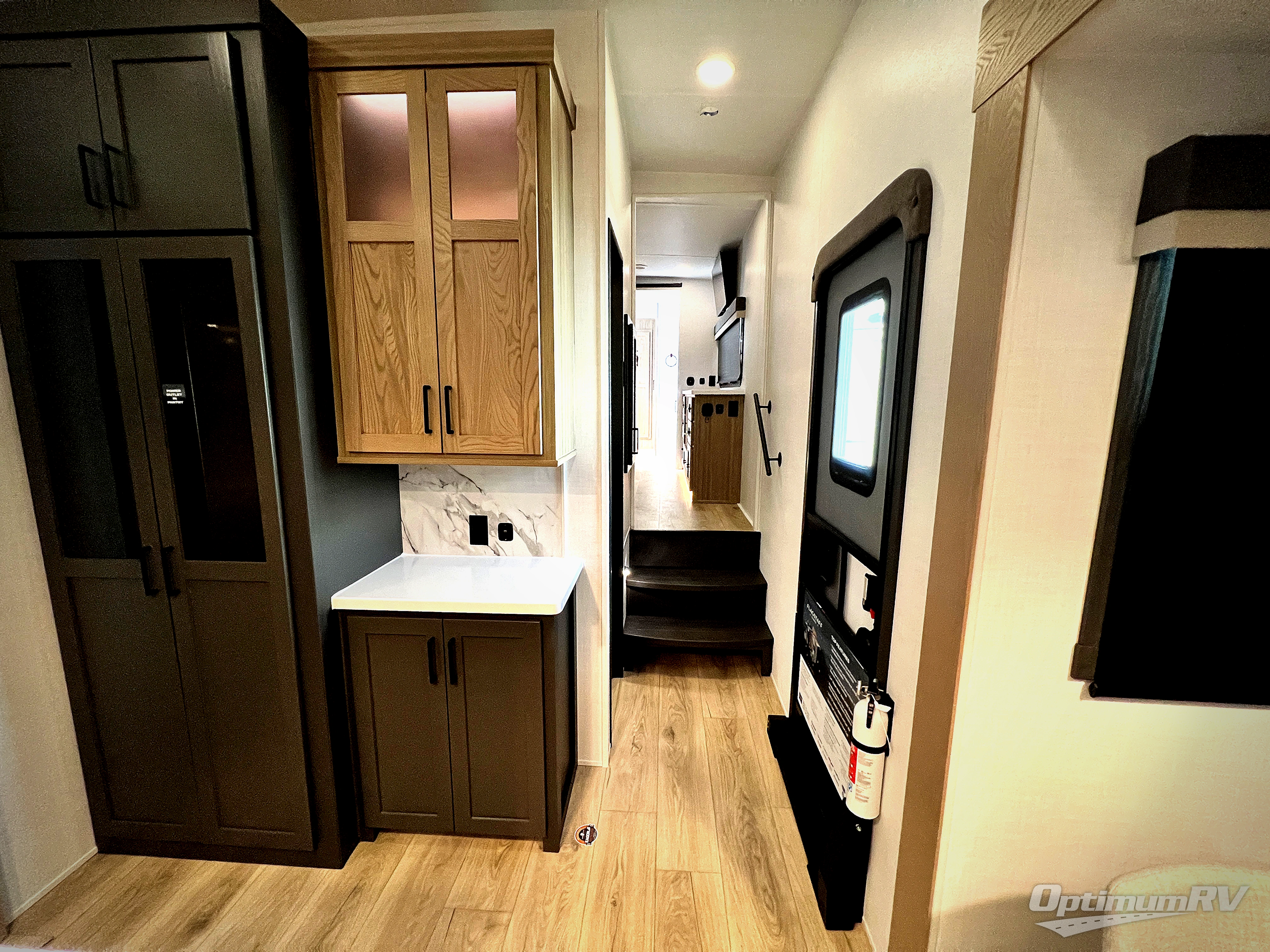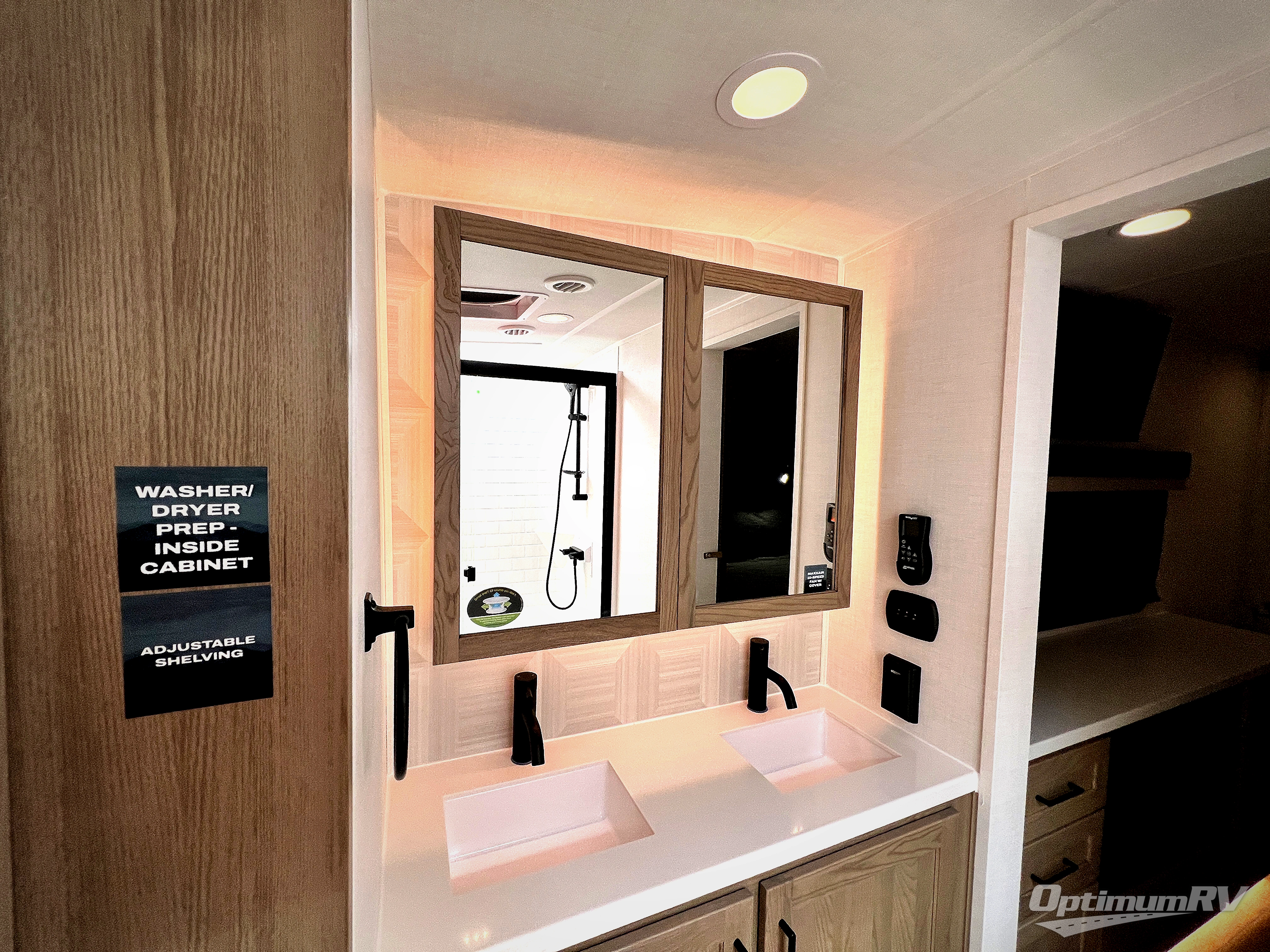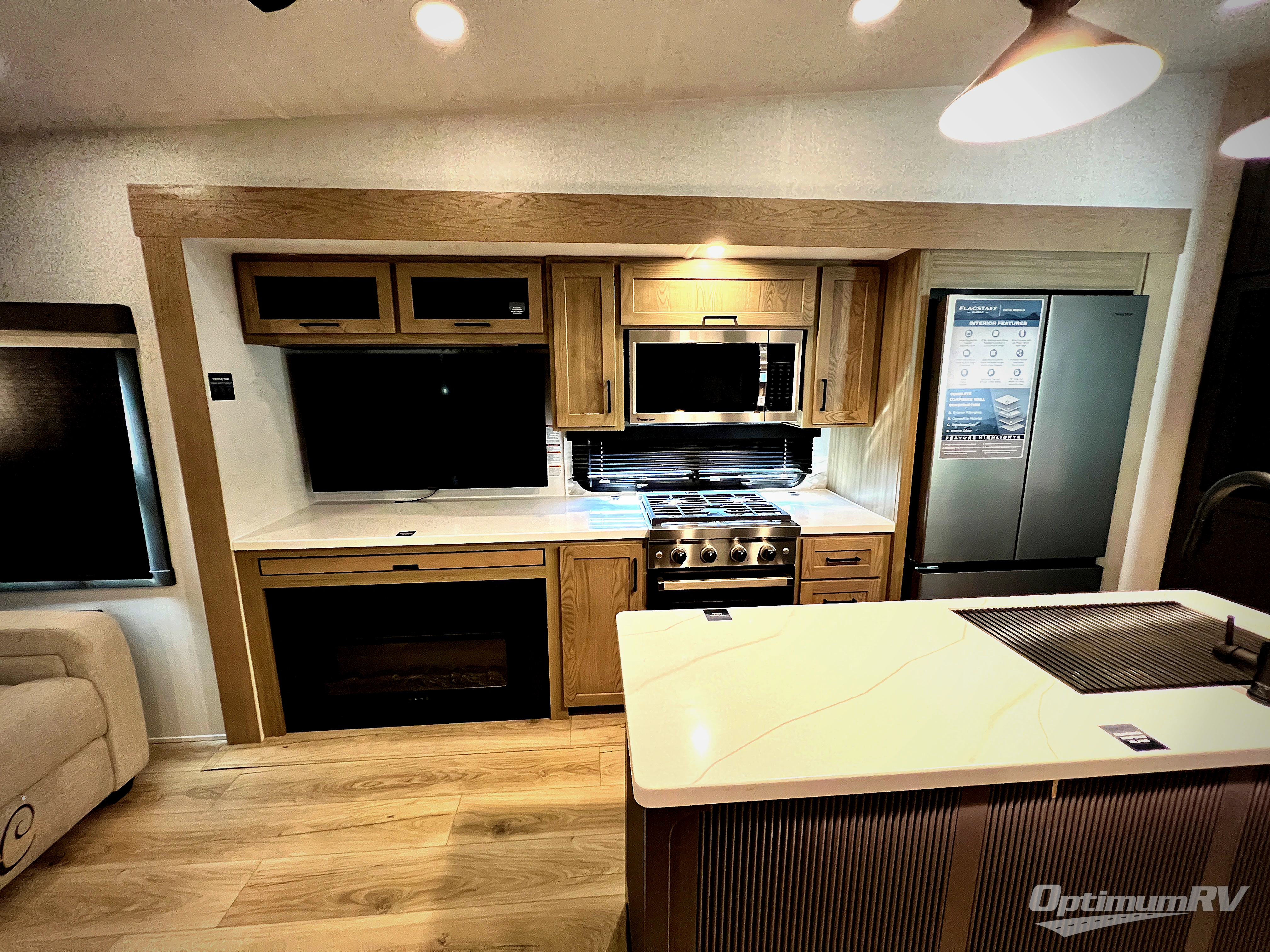 You can't go wrong when choosing this spacious fifth wheel! The master bedroom features a king bed slide out, wardrobe, and a dresser with a fireplace, and the full front bath is sure to bring comfort. There are dual bath sinks here, tons of storage, and even washer and dryer prep if you choose to add these appliances. The mid-coach half bath will come in handy if you have guests staying over on the rear hide-a-bed sofa. You'll also find a theater seat and a rotating table and chairs where you can dine and relax each day, plus there is a large kitchen island so the chef of your group has plenty of prep space. A Smart TV and fireplace will make your space feel more like home, and there is a pull-out desk here if you need to get some work done!