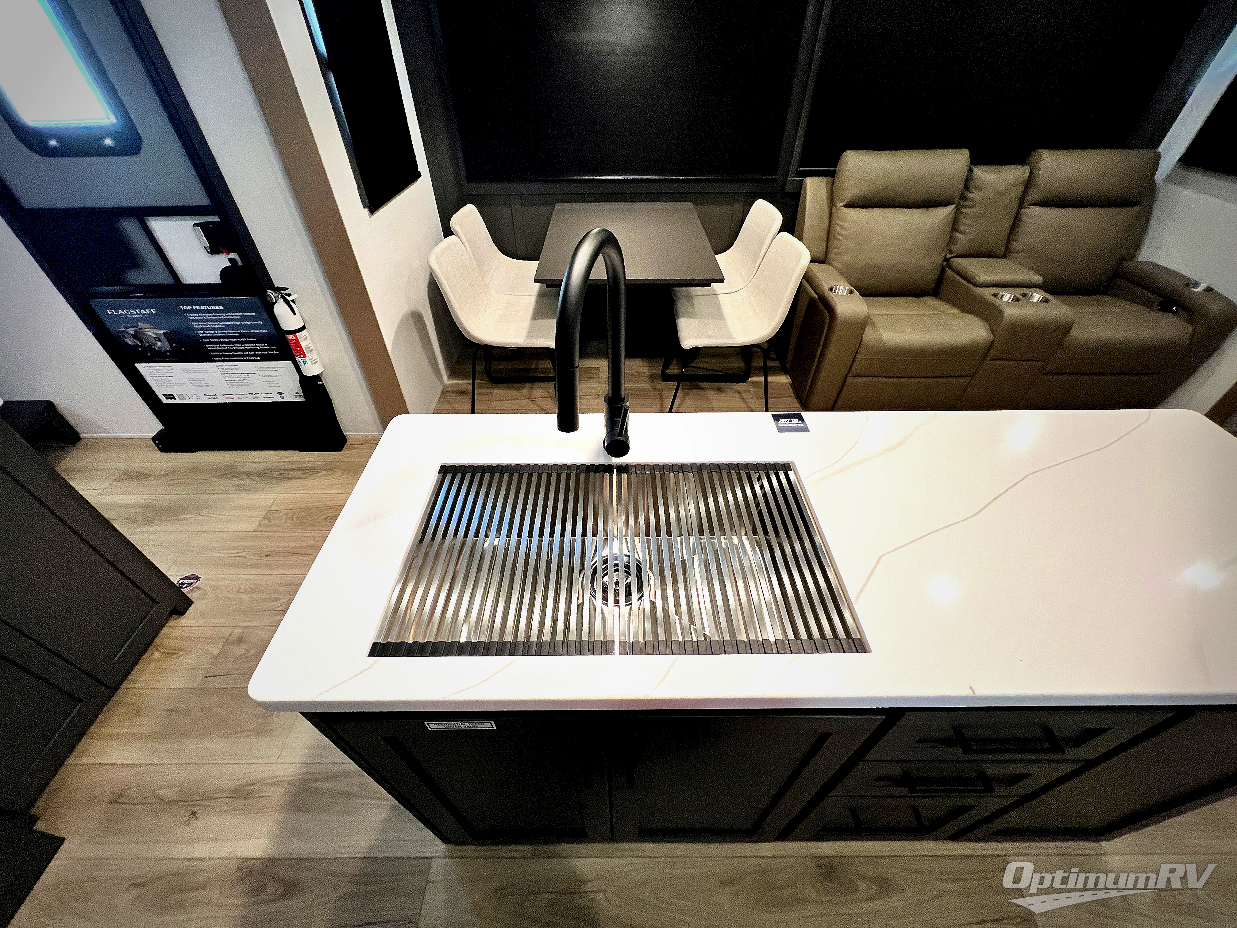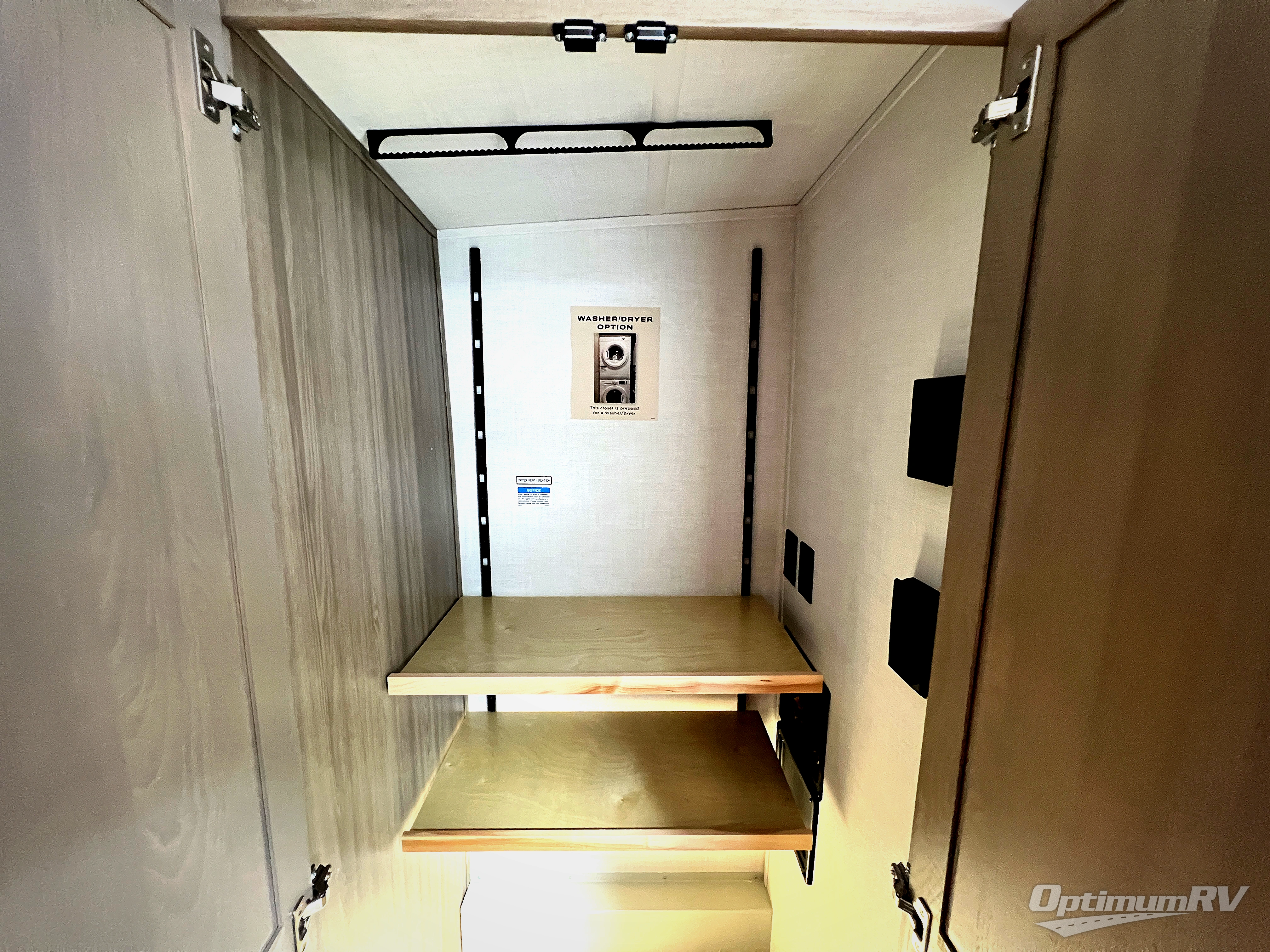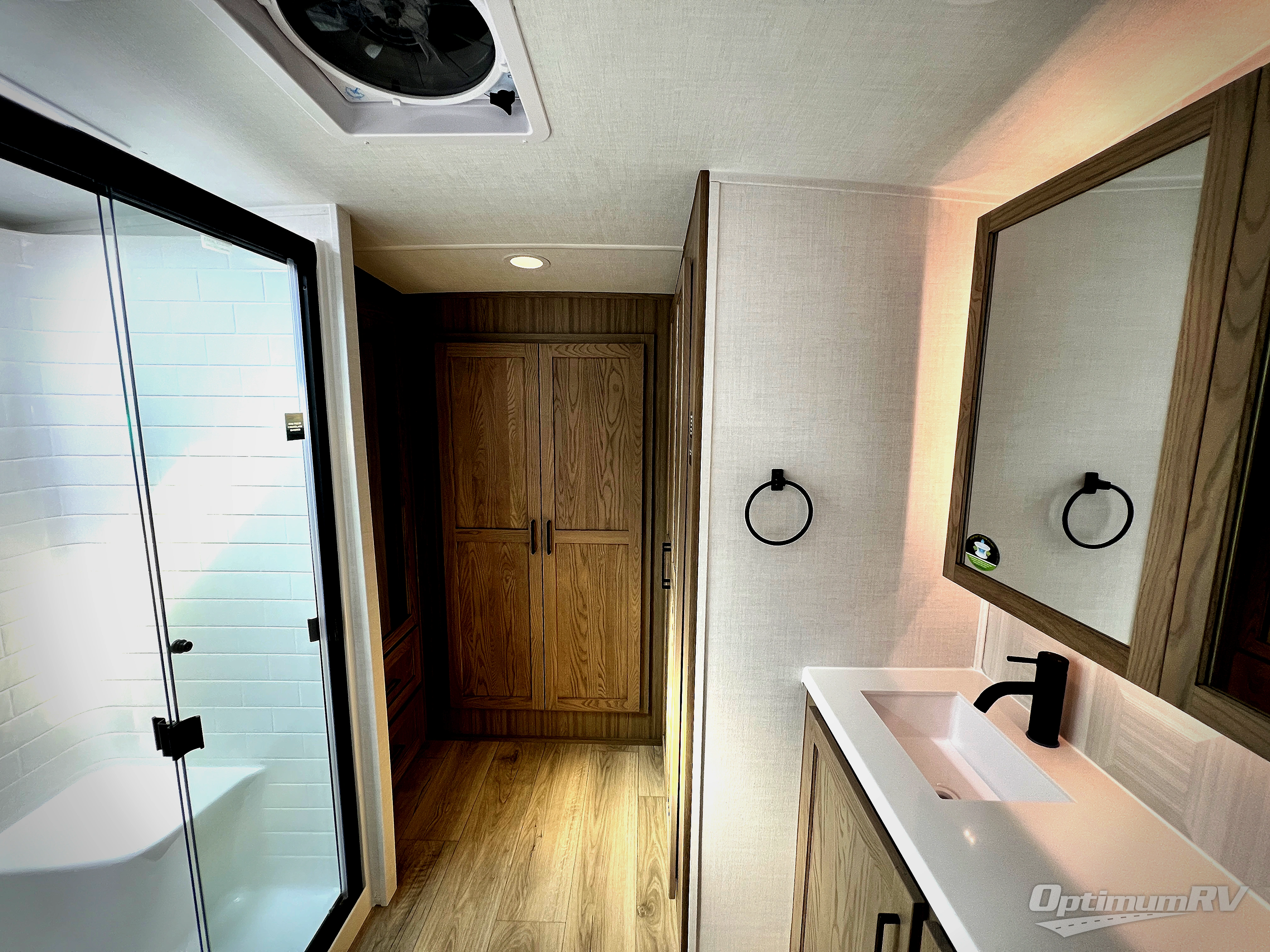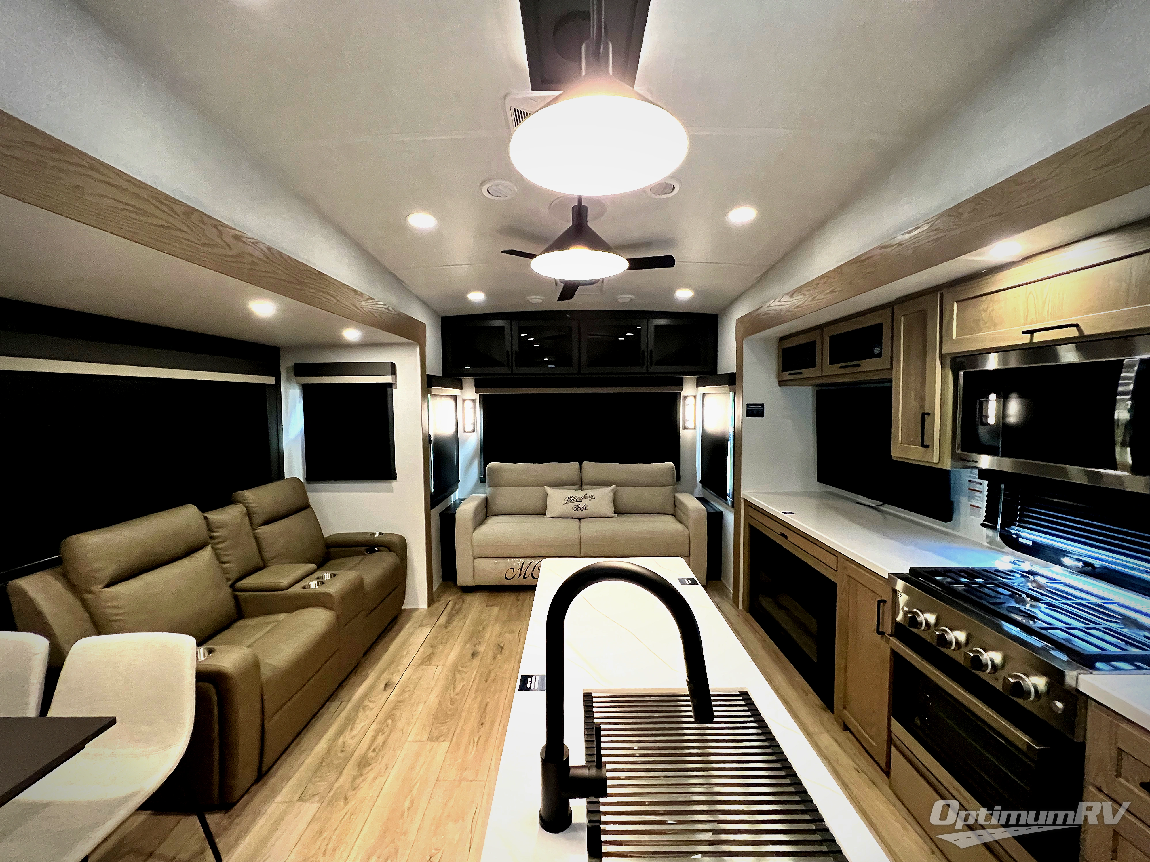 You can't go wrong when choosing this spacious fifth wheel! The master bedroom features a king bed slide out, wardrobe, and a dresser with a fireplace, and the full front bath is sure to bring comfort. There are dual bath sinks here, tons of storage, and even washer and dryer prep if you choose to add these appliances. The mid-coach half bath will come in handy if you have guests staying over on the rear hide-a-bed sofa. You'll also find a theater seat and a rotating table and chairs where you can dine and relax each day, plus there is a large kitchen island so the chef of your group has plenty of prep space. A Smart TV and fireplace will make your space feel more like home, and there is a pull-out desk here if you need to get some work done!