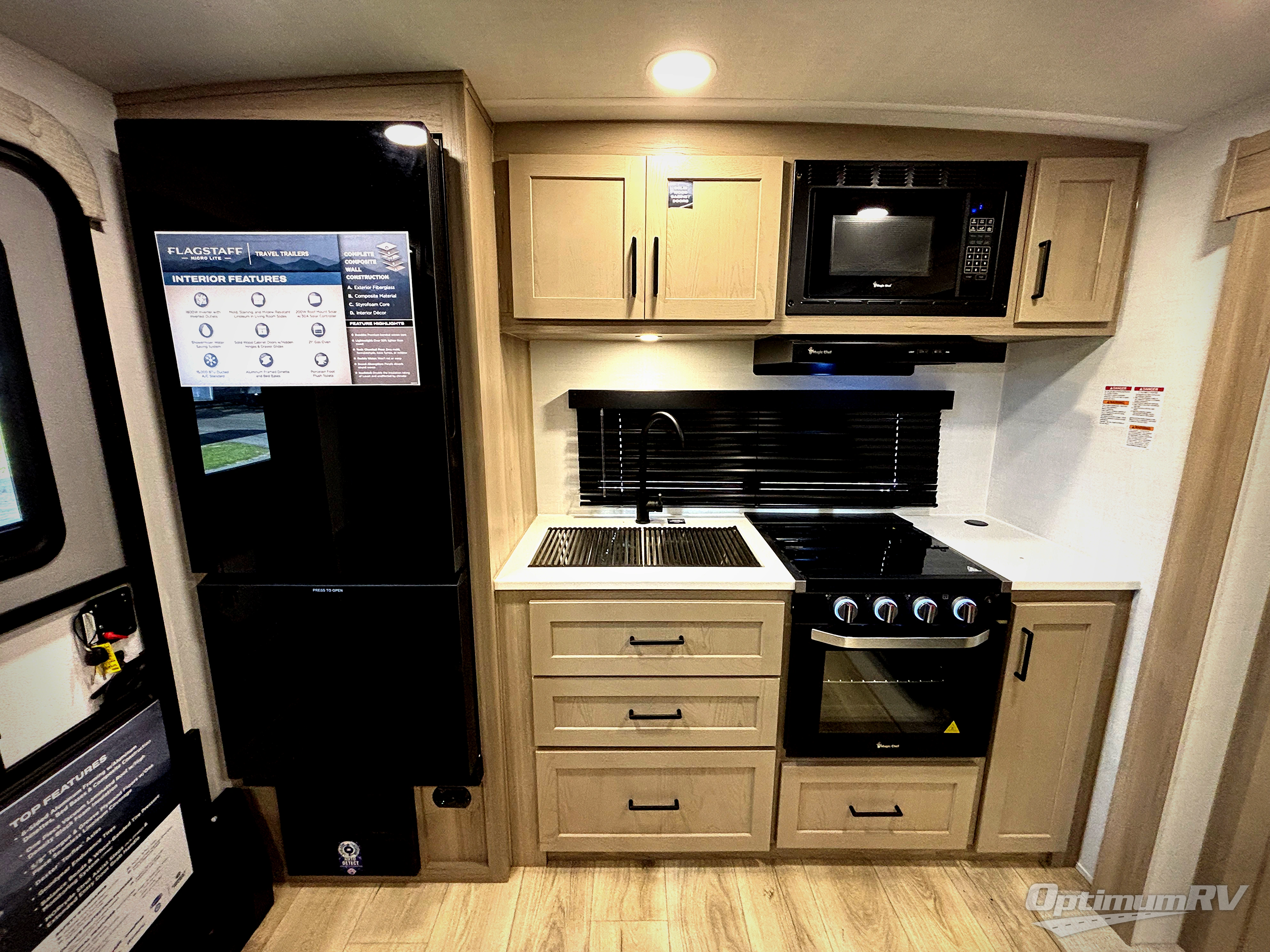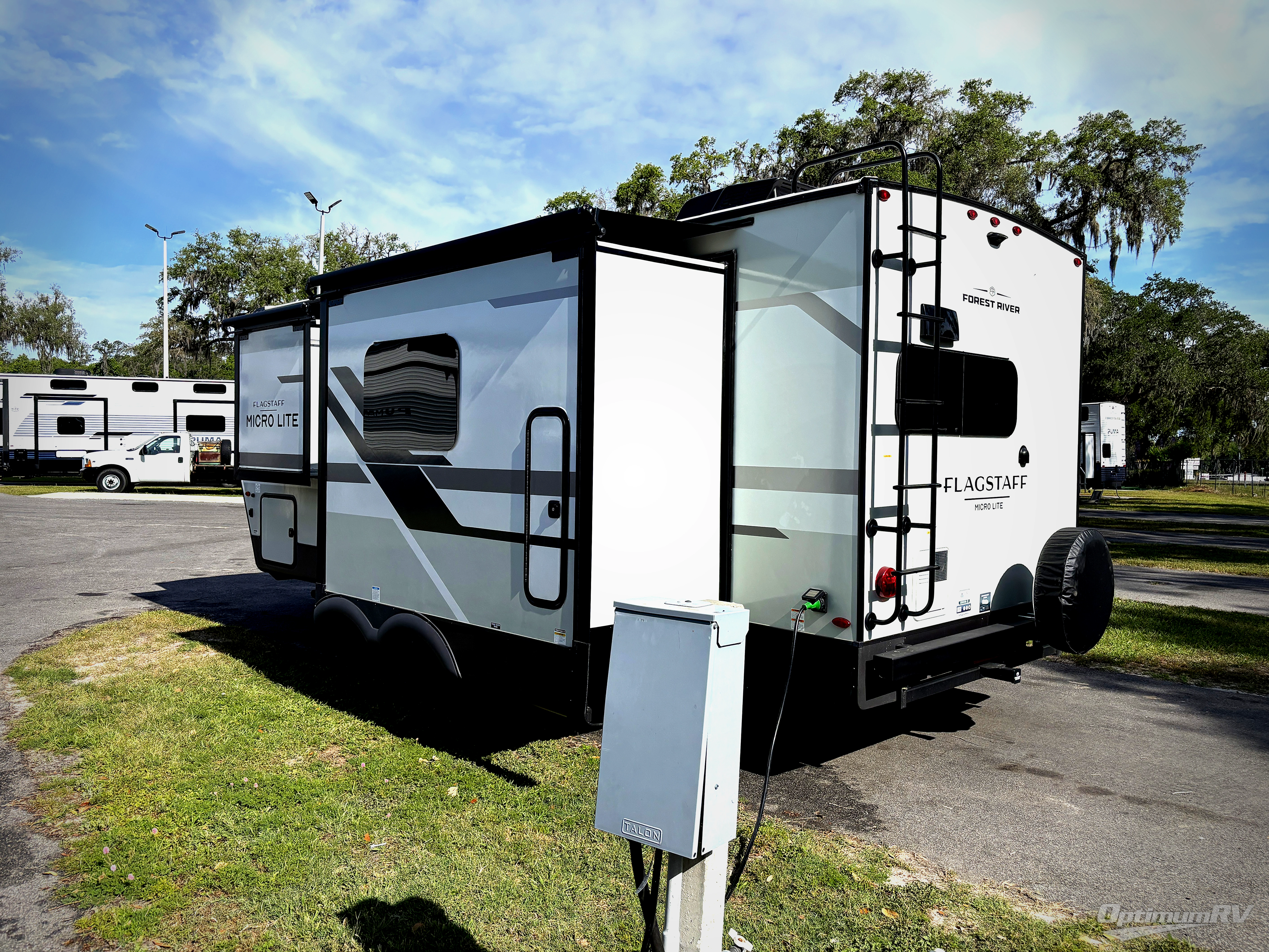 With any Flagstaff Micro Lite travel trailer by Forest River you will enjoy lightweight towing, durable construction, and added interior comforts to make each trip memorable! Each model features RoadTech tire pressure monitoring, Dexter Torflex axles, and nitrogen-filled Goodyear endurance tires for smooth towing from home to campground. The 6-sided aluminum framed construction provides a strong foundation so you can enjoy your RV for years to come, plus the radiant foil in the front cap, underbelly and slides help insulate your trailer. Additional exterior features include a 200W solar panel, back-up camera prep, frameless windows, and slam baggage doors. Each model includes the Great Expectations Package with roller shades, solid surface kitchen countertops, and hidden hinge cabinet doors. There is also an exterior hot/cold water port, outside speakers, a power tongue jack and stabilizer jacks, plus many more conveniences.