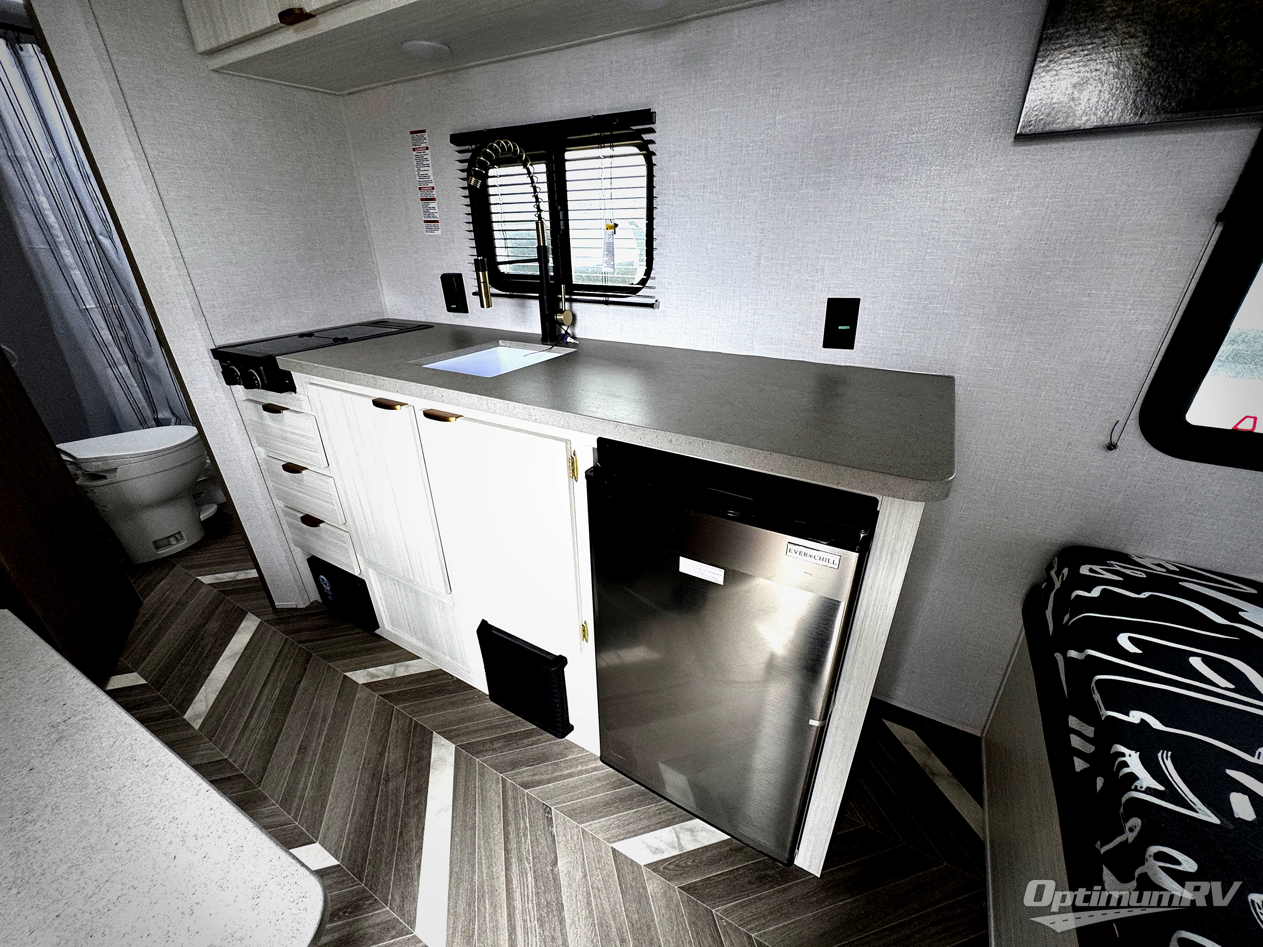 This Limited Edition travel trailer is perfect for your crew of seven thanks to the double-size bunks! You can take the front queen bed for yourselves, and any other guests can sleep on the L-shaped open lounge if needed. You will find a kitchen overhead cabinet for spices, and wardrobe by the bed for your clothes. Prepare all your meals in the fully-equipped kitchen that includes plenty of counter space and a refrigerator. On the outside, a 14' 12V power awning will provide an outdoor living space you are sure to love as well!