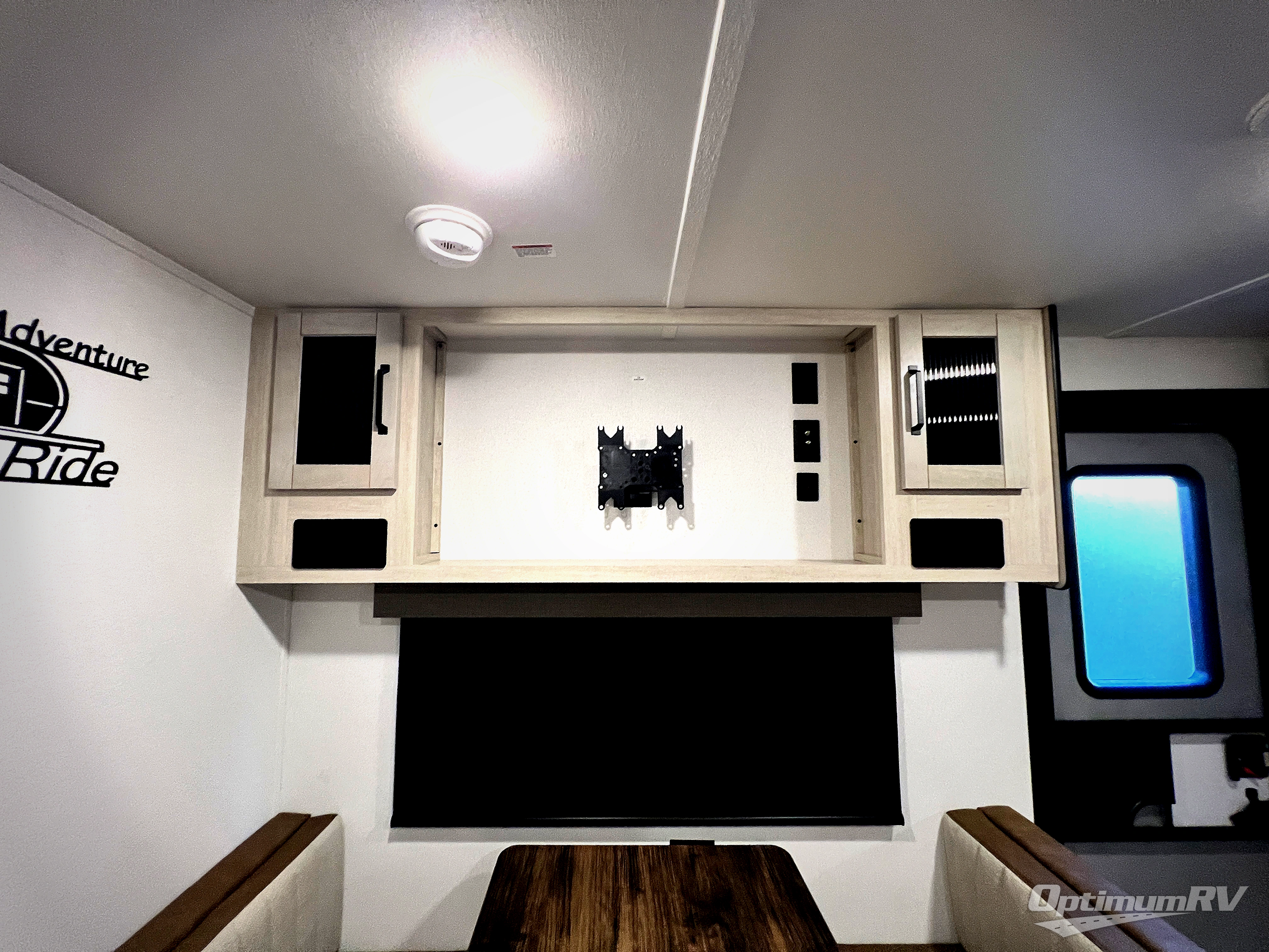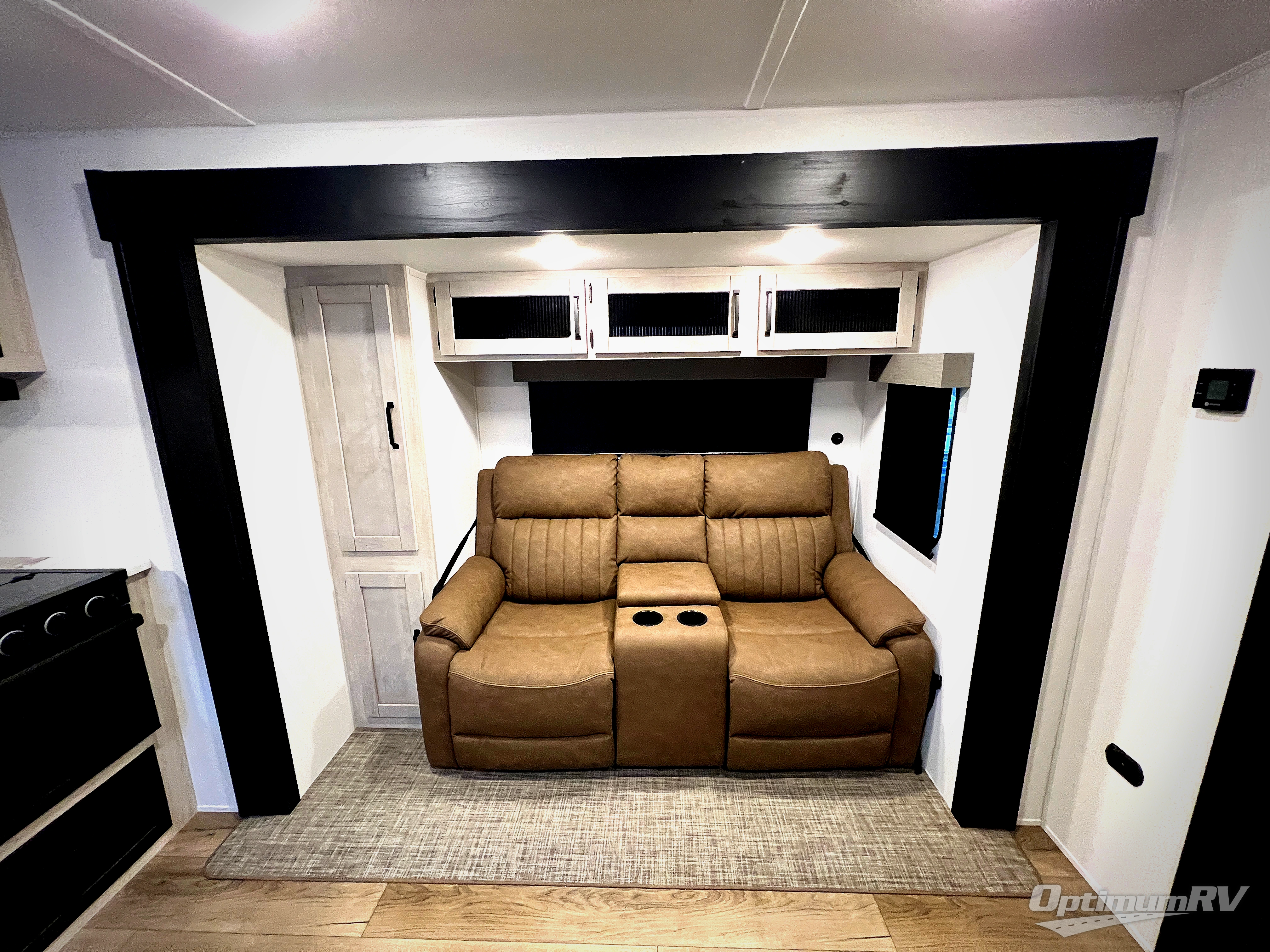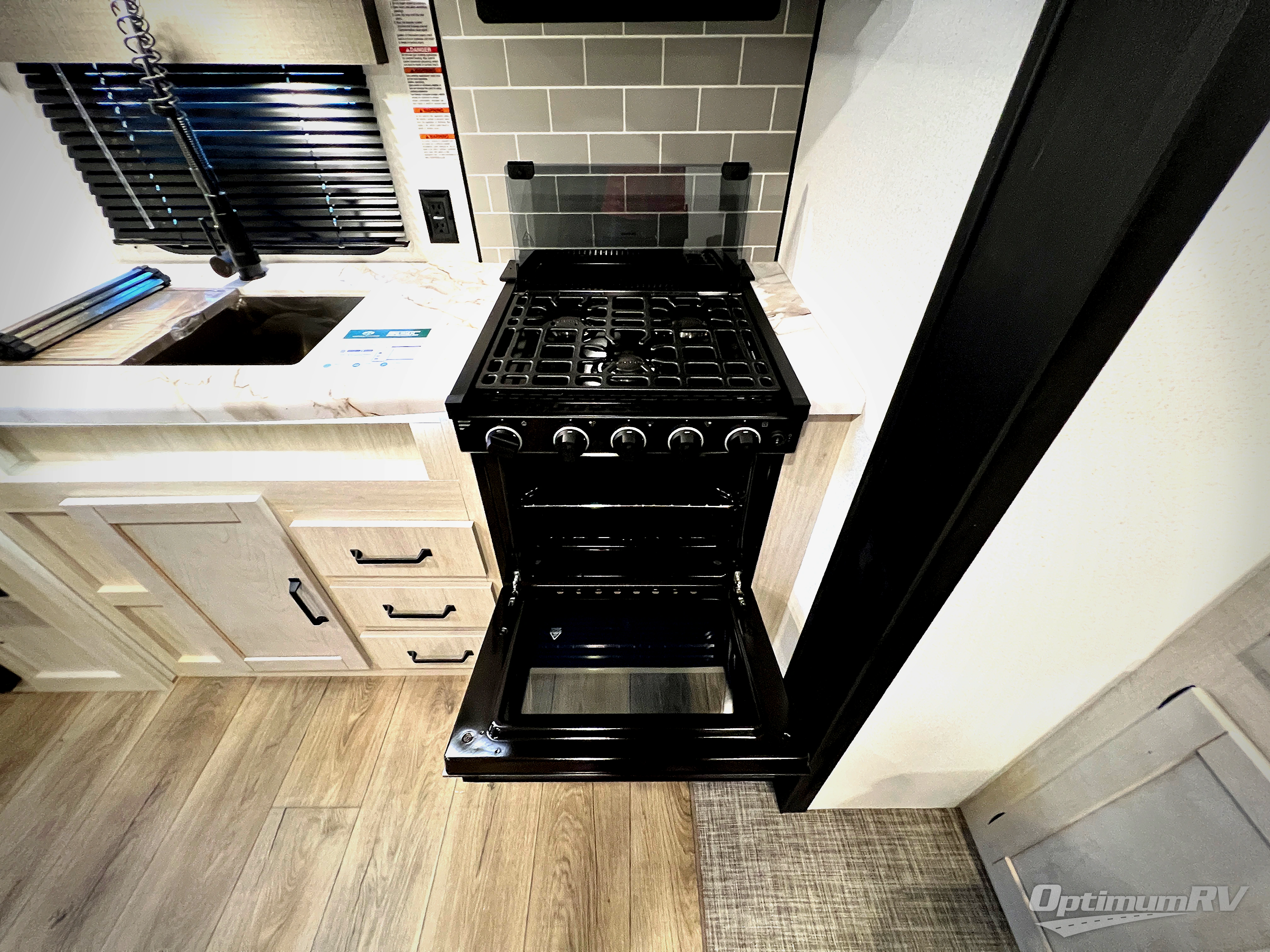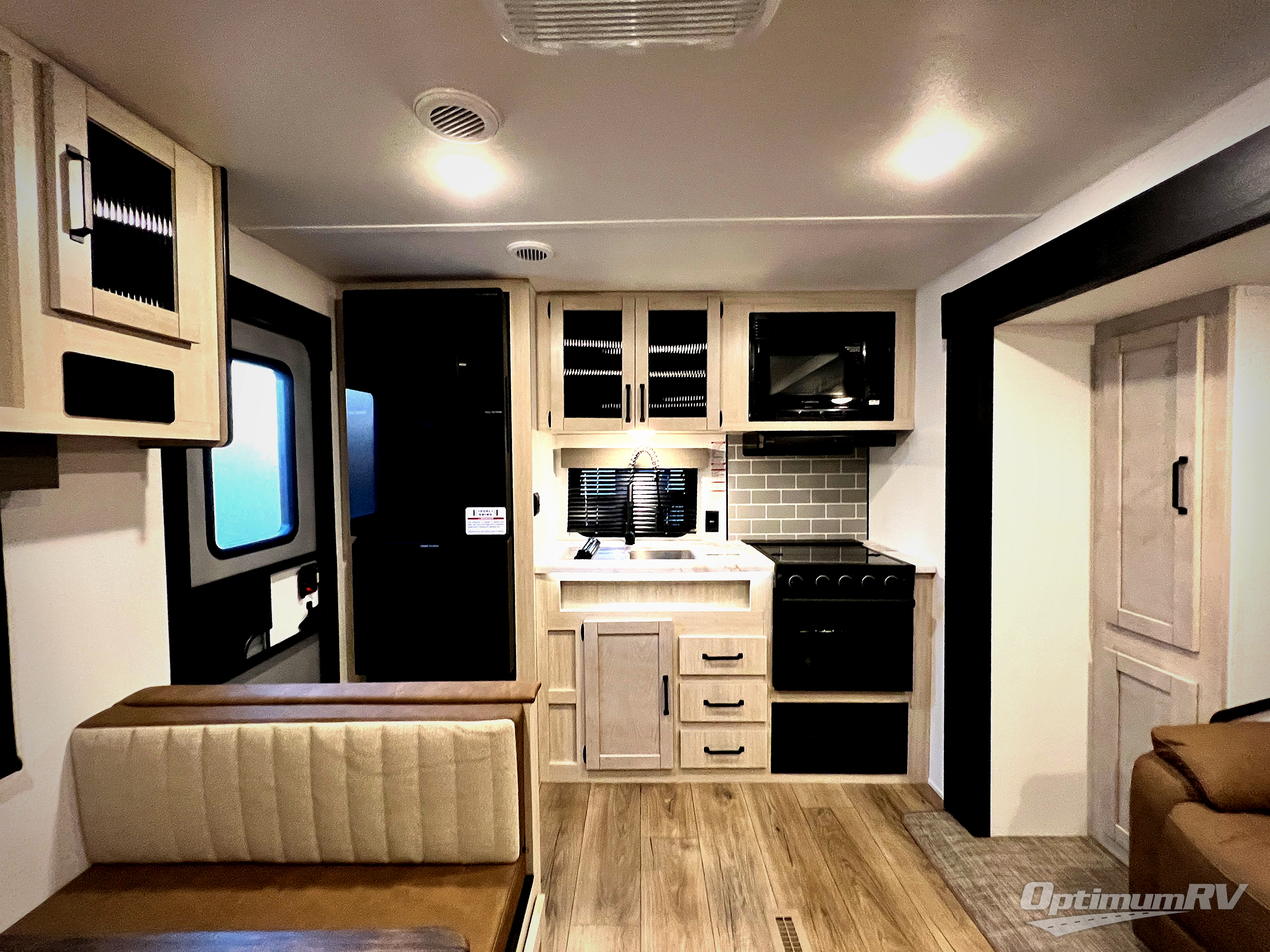This rear kitchen travel trailer will be perfect for camping trips to the lake or woods! Once you've made breakfast on the stainless steel oven and range, you can dine at the booth dinette or take your plate outdoors to sit under the 18' electric awning. There is also a sofa slide out inside for a comfy place to relax. The walk-thru bath features a shower with a seat for added comfort, and you'll love having your own space in the front master bedroom. Here, you'll find a queen bed plus dual bedside closets to keep your things organized!