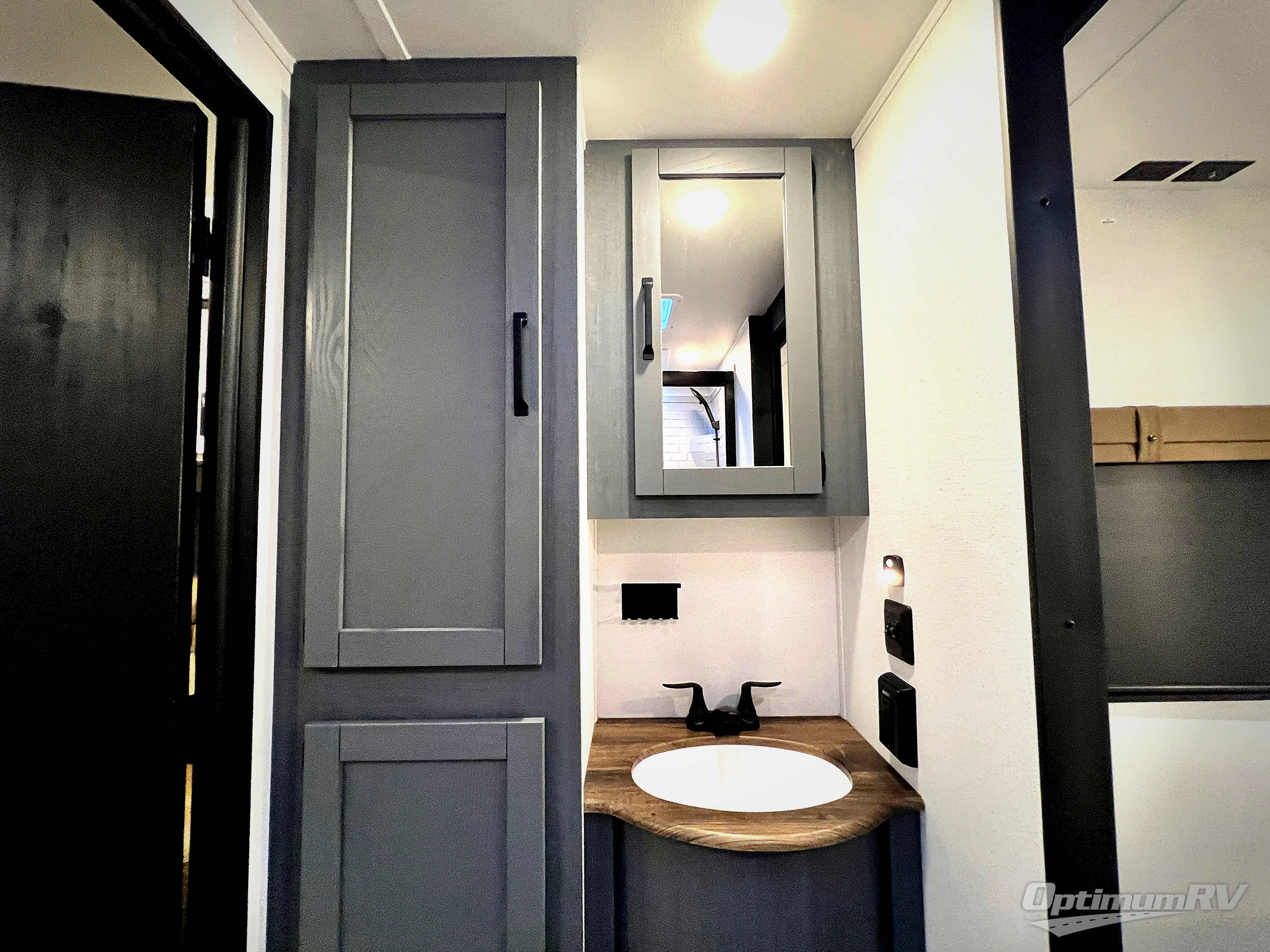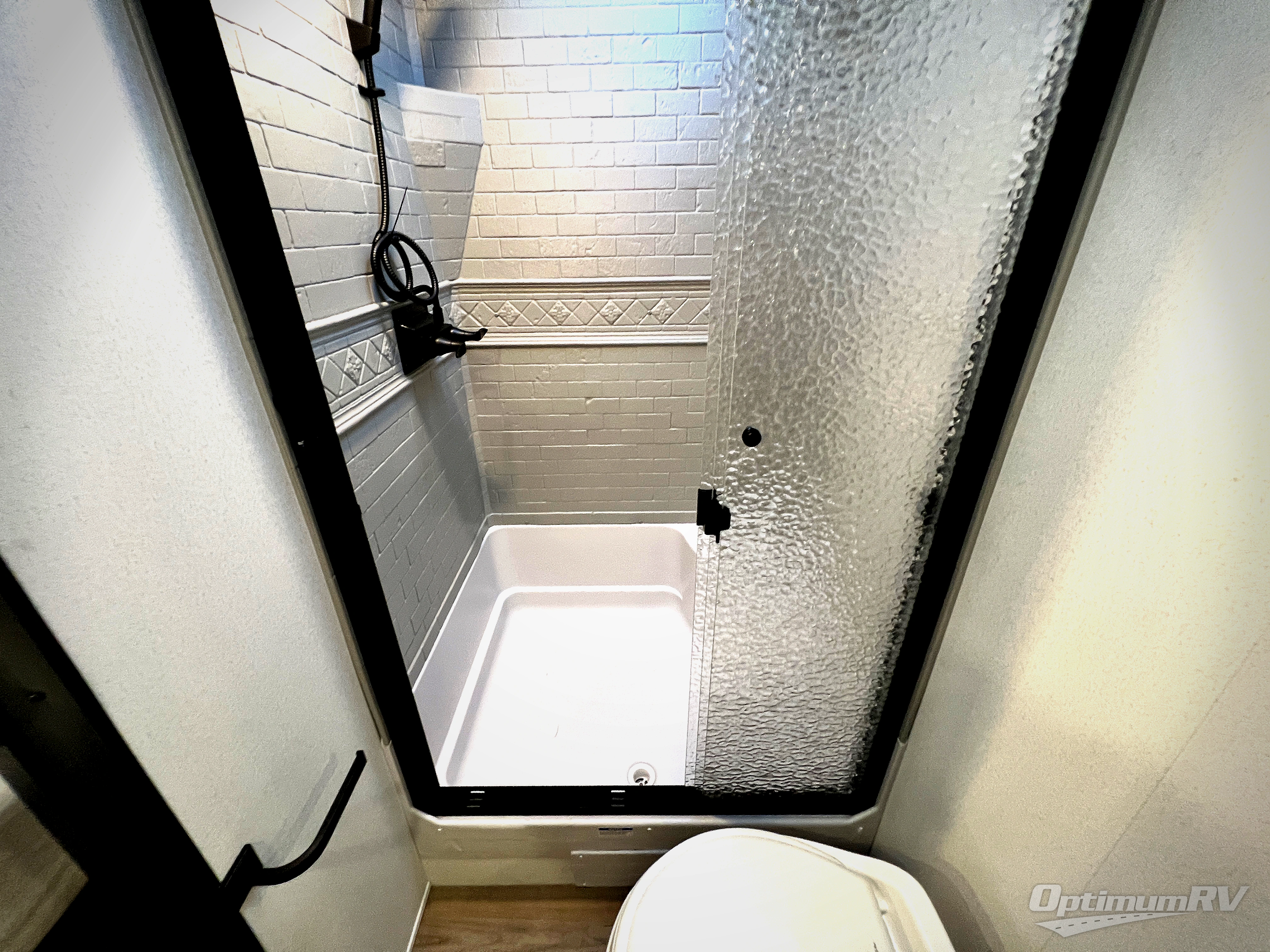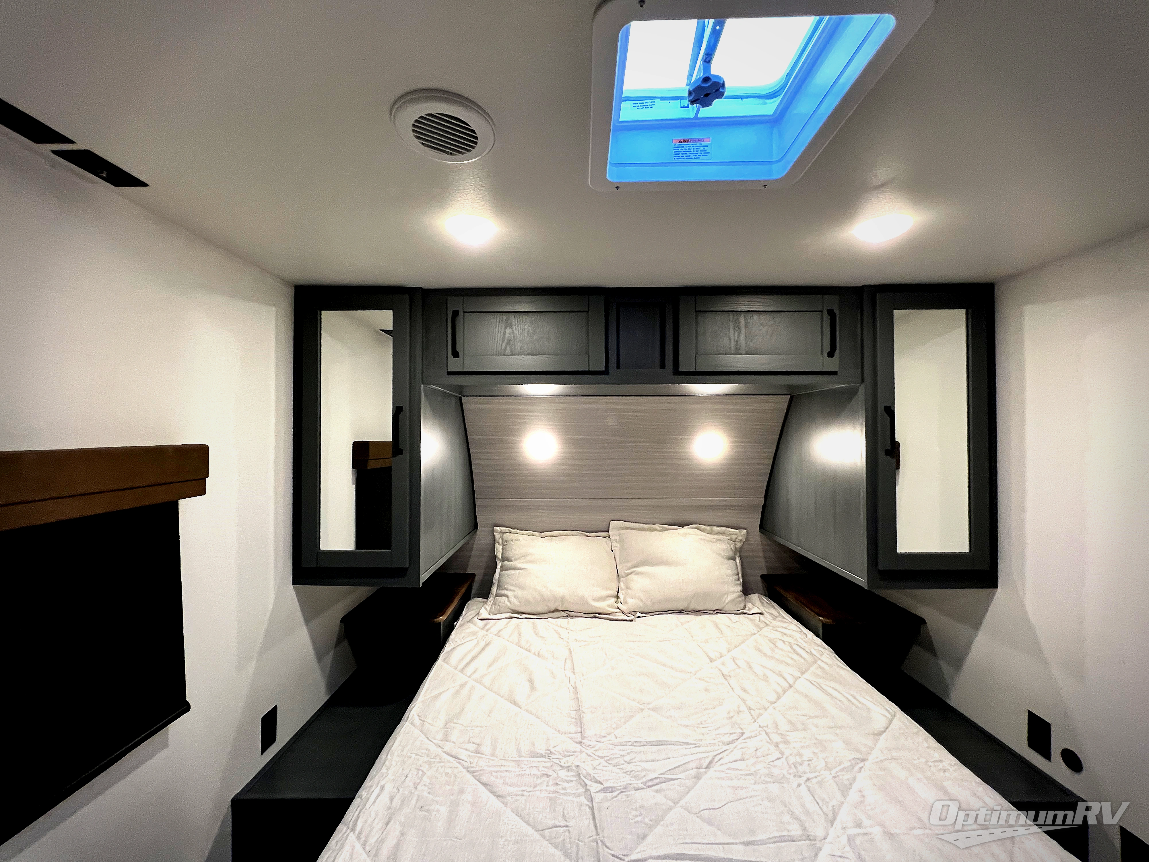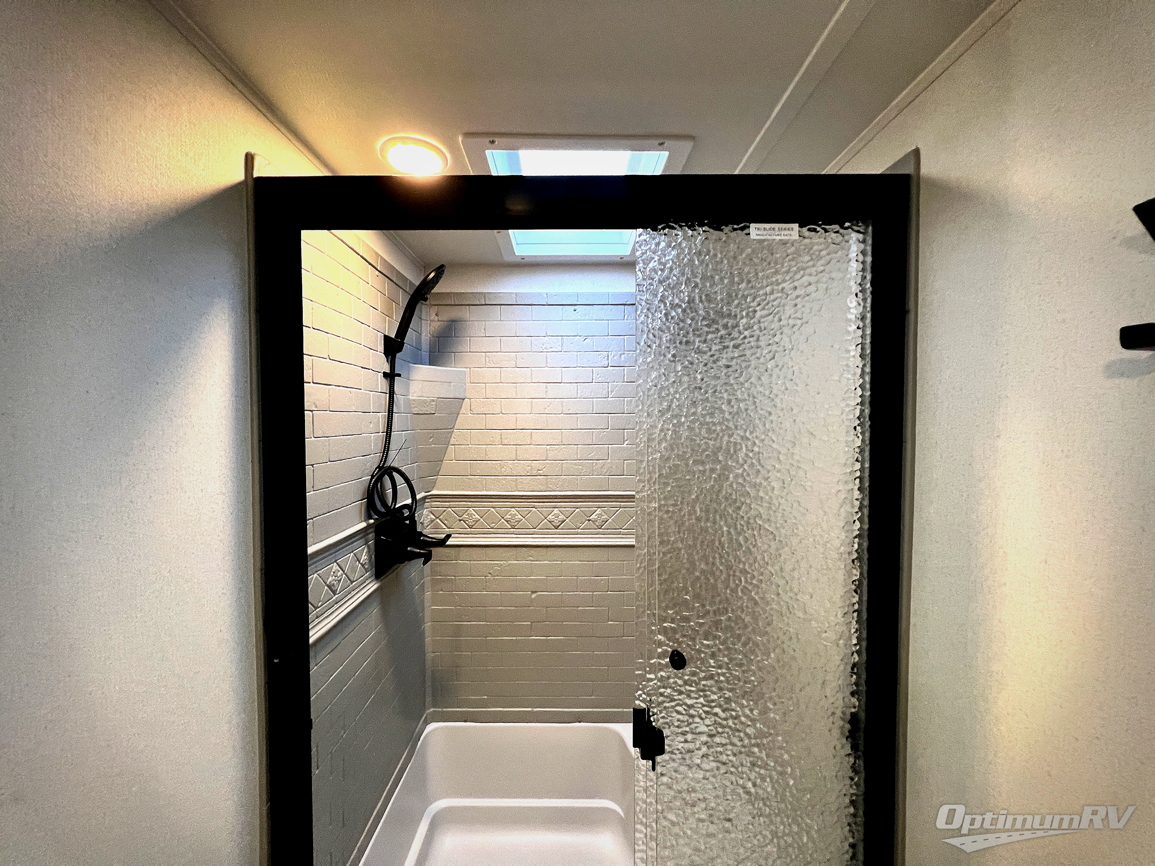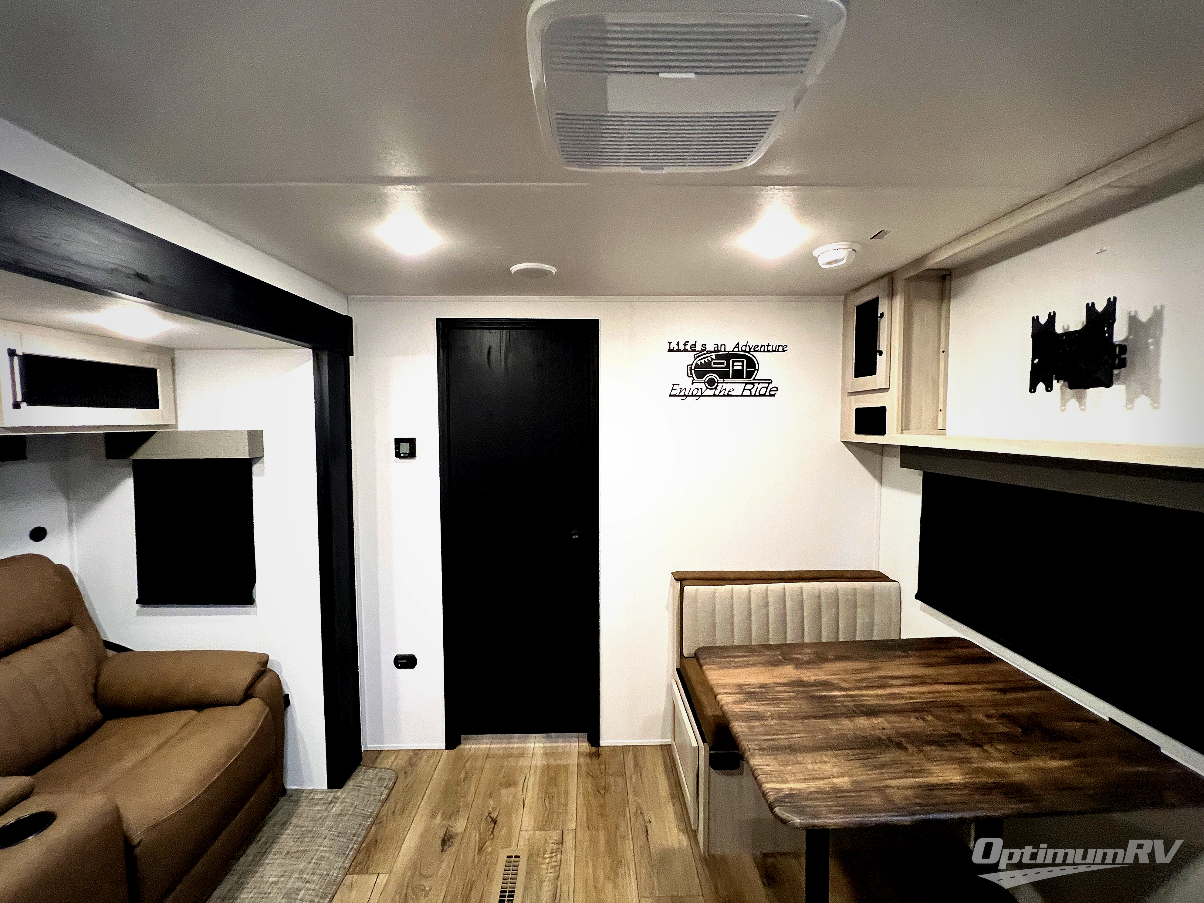 This rear kitchen travel trailer will be perfect for camping trips to the lake or woods! Once you've made breakfast on the stainless steel oven and range, you can dine at the booth dinette or take your plate outdoors to sit under the 18' electric awning. There is also a sofa slide out inside for a comfy place to relax. The walk-thru bath features a shower with a seat for added comfort, and you'll love having your own space in the front master bedroom. Here, you'll find a queen bed plus dual bedside closets to keep your things organized!