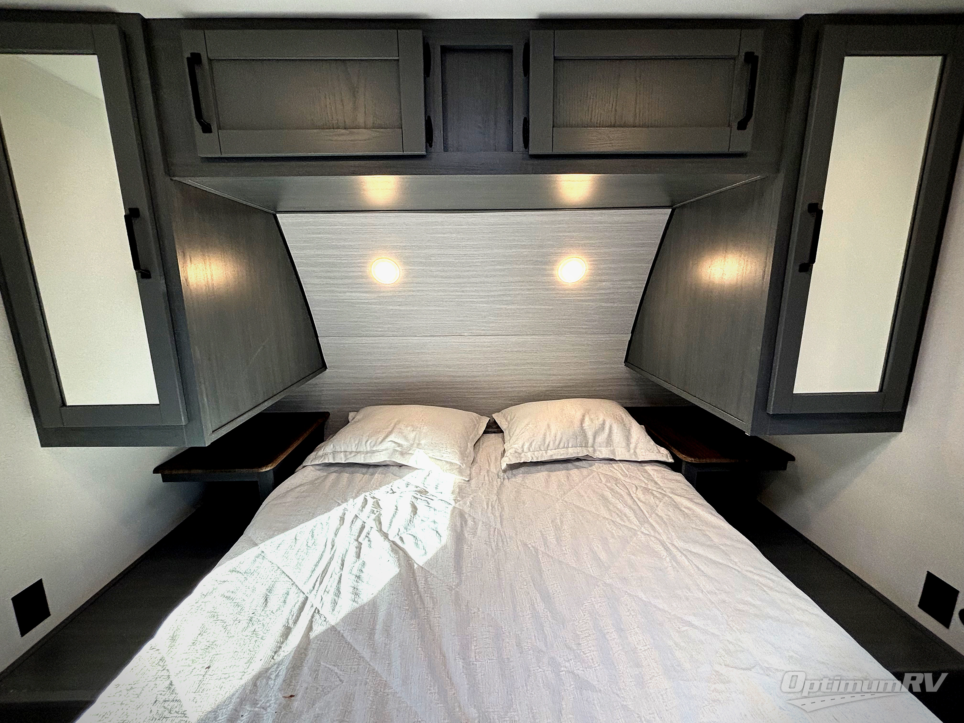 This rear kitchen travel trailer will be perfect for camping trips to the lake or woods! Once you've made breakfast on the stainless steel oven and range, you can dine at the booth dinette or take your plate outdoors to sit under the 18' electric awning. There is also a sofa slide out inside for a comfy place to relax. The walk-thru bath features a shower with a seat for added comfort, and you'll love having your own space in the front master bedroom. Here, you'll find a queen bed plus dual bedside closets to keep your things organized!