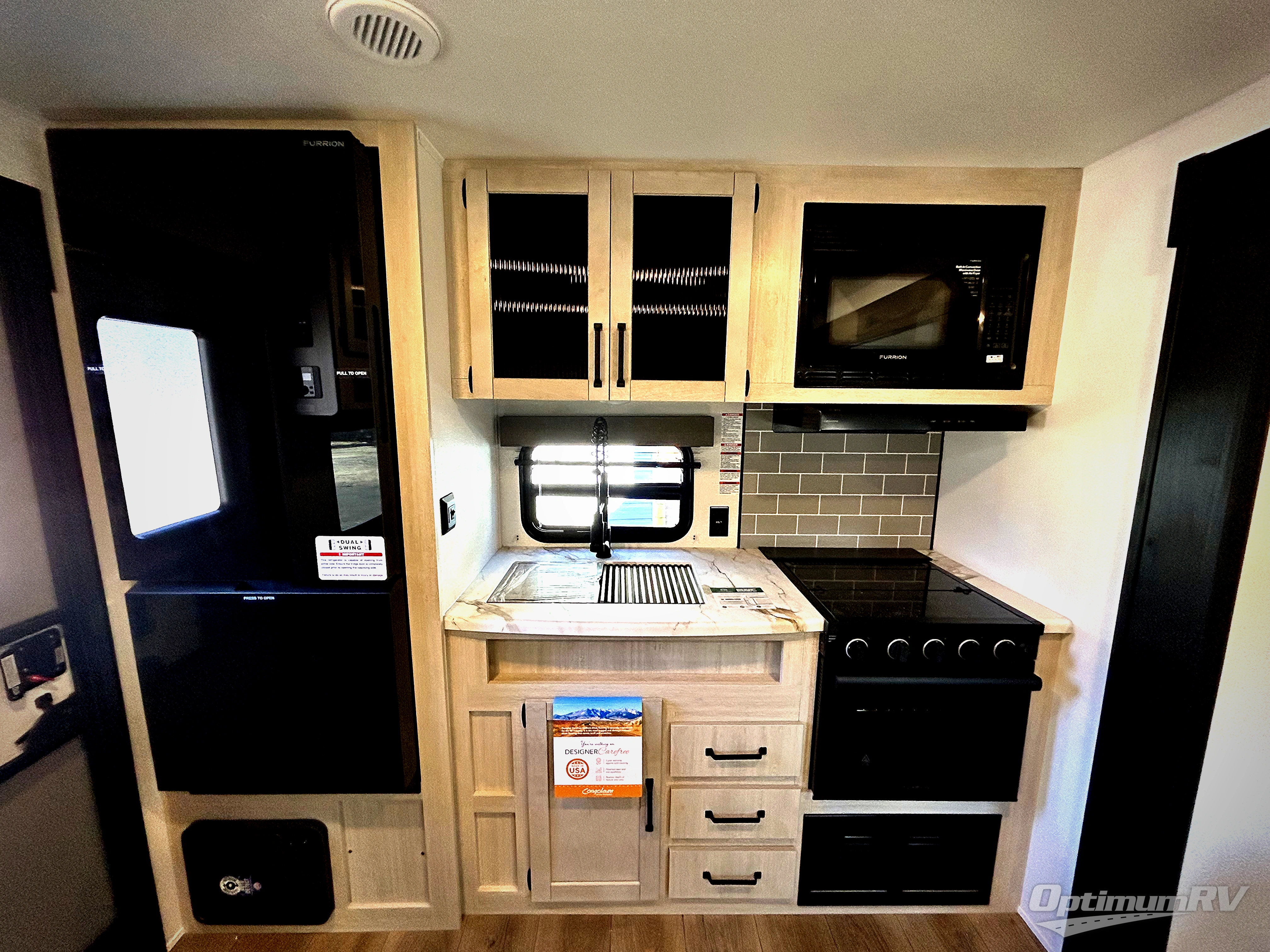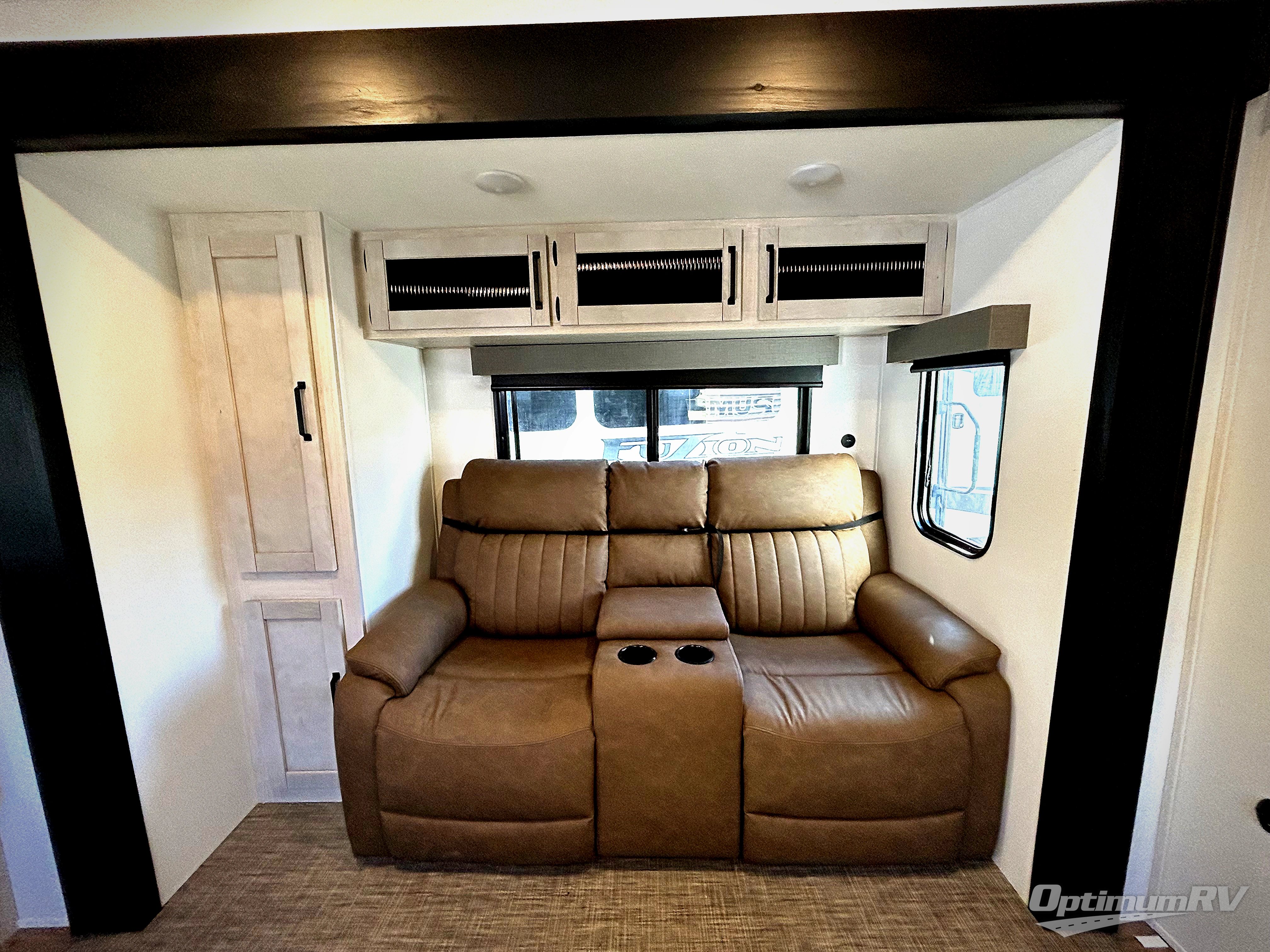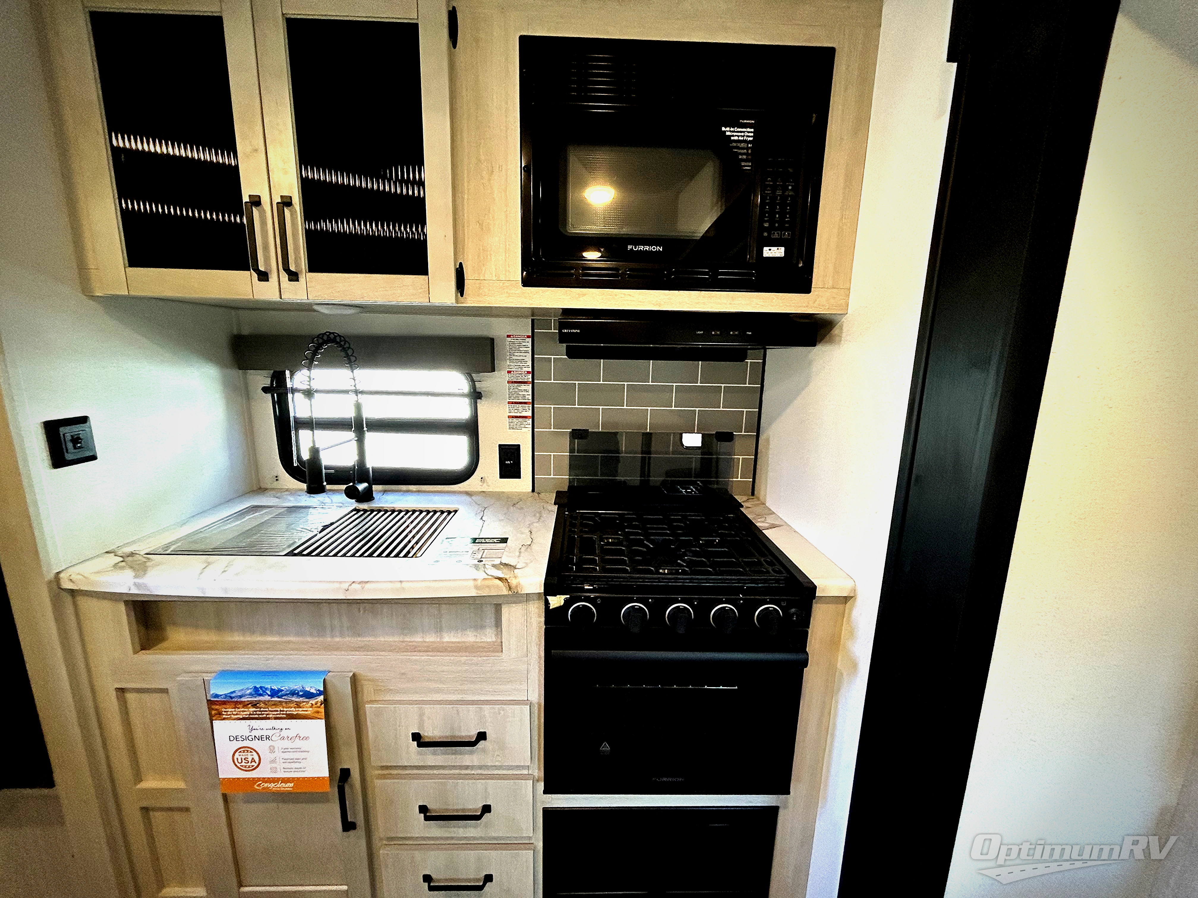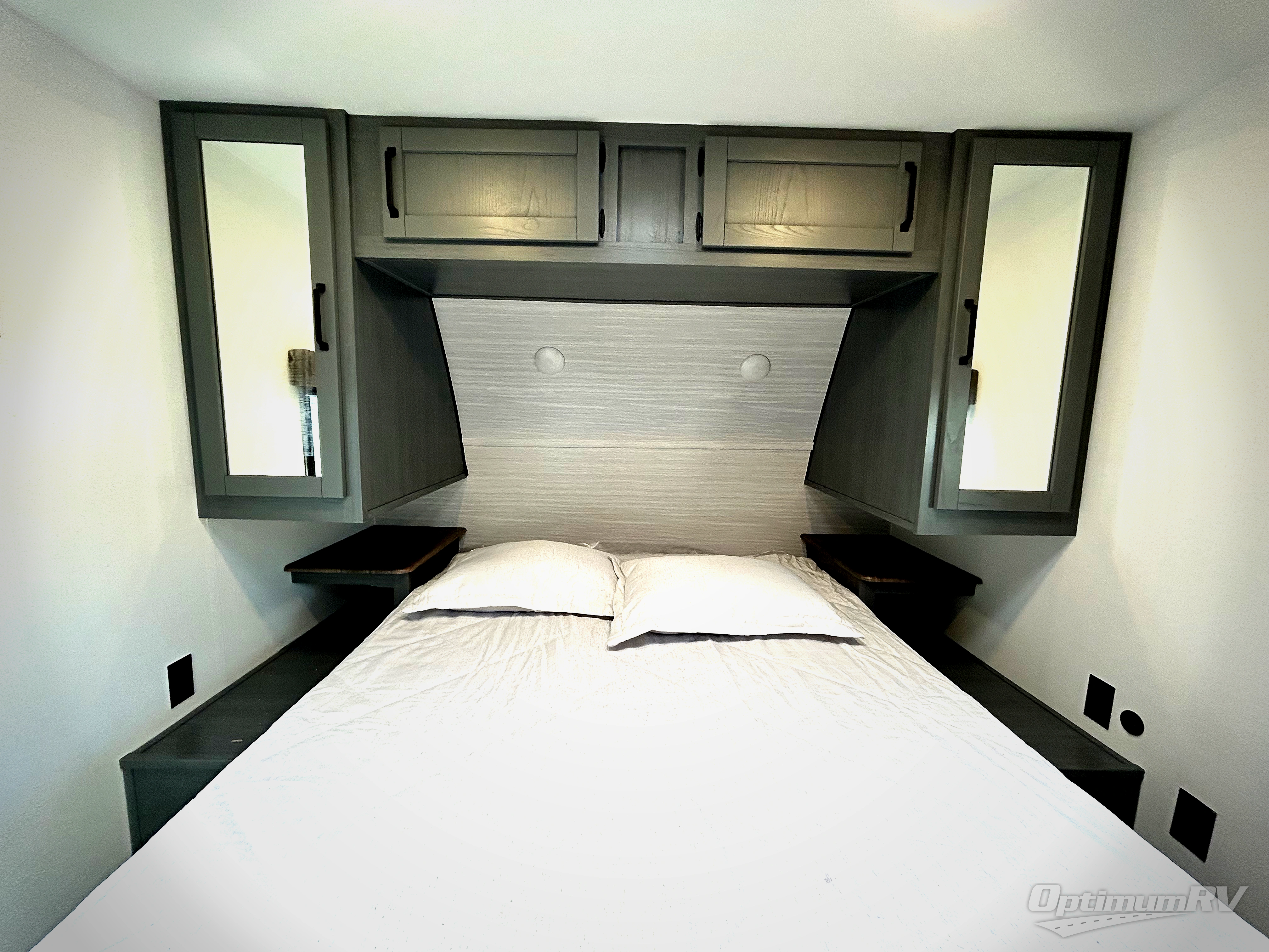 This rear kitchen travel trailer will be perfect for camping trips to the lake or woods! Once you've made breakfast on the stainless steel oven and range, you can dine at the booth dinette or take your plate outdoors to sit under the 18' electric awning. There is also a sofa slide out inside for a comfy place to relax. The walk-thru bath features a shower with a seat for added comfort, and you'll love having your own space in the front master bedroom. Here, you'll find a queen bed plus dual bedside closets to keep your things organized!