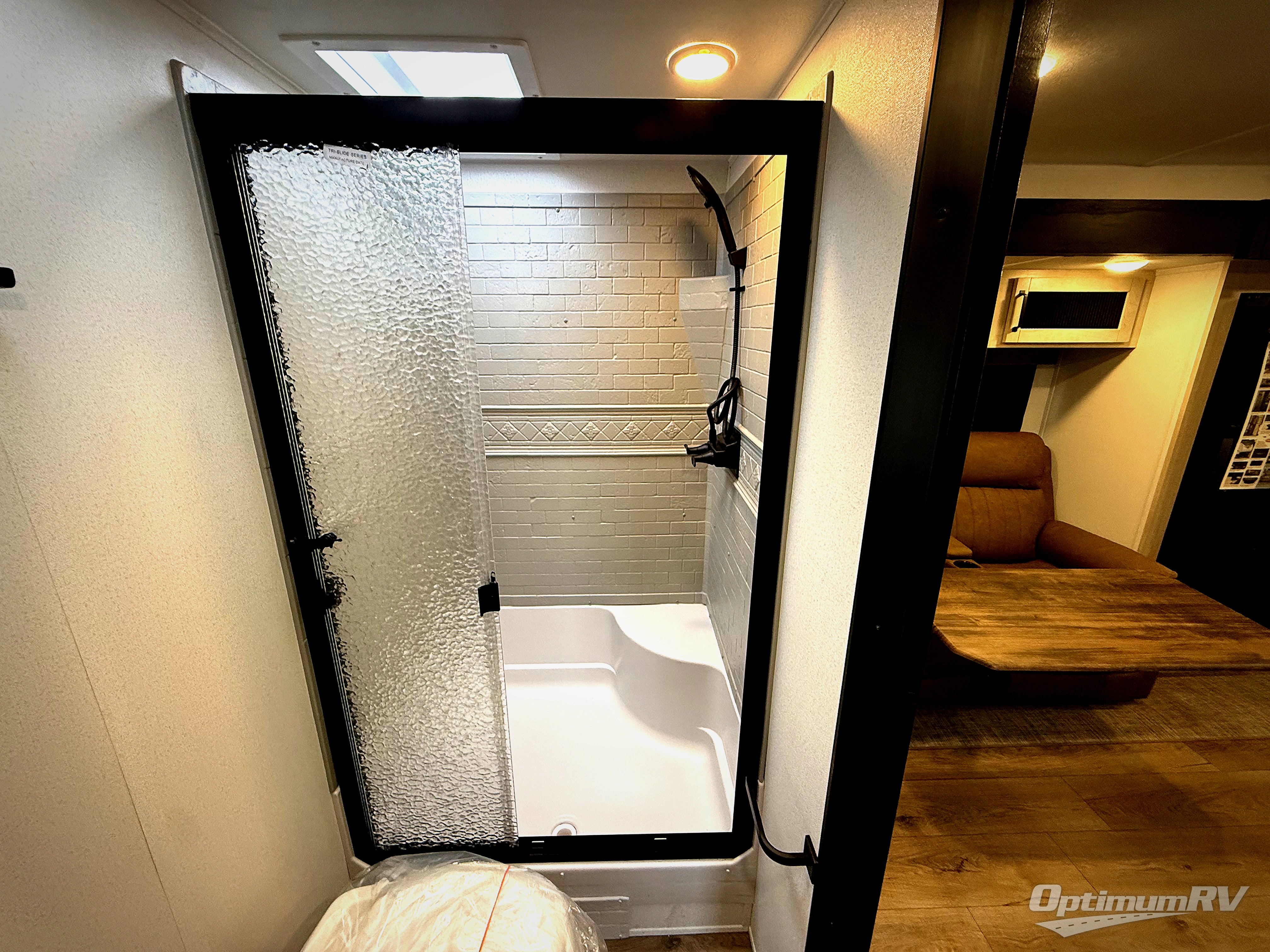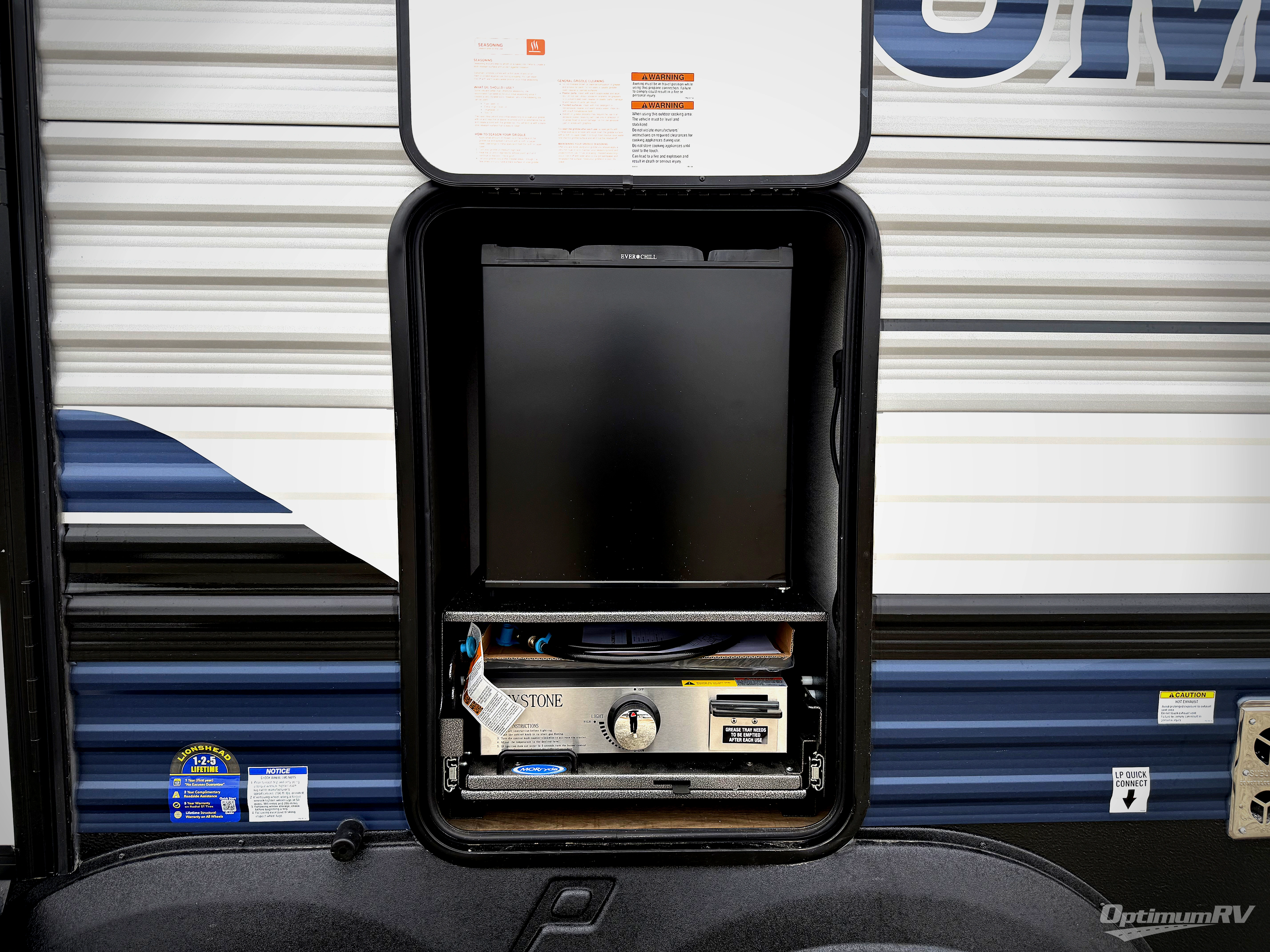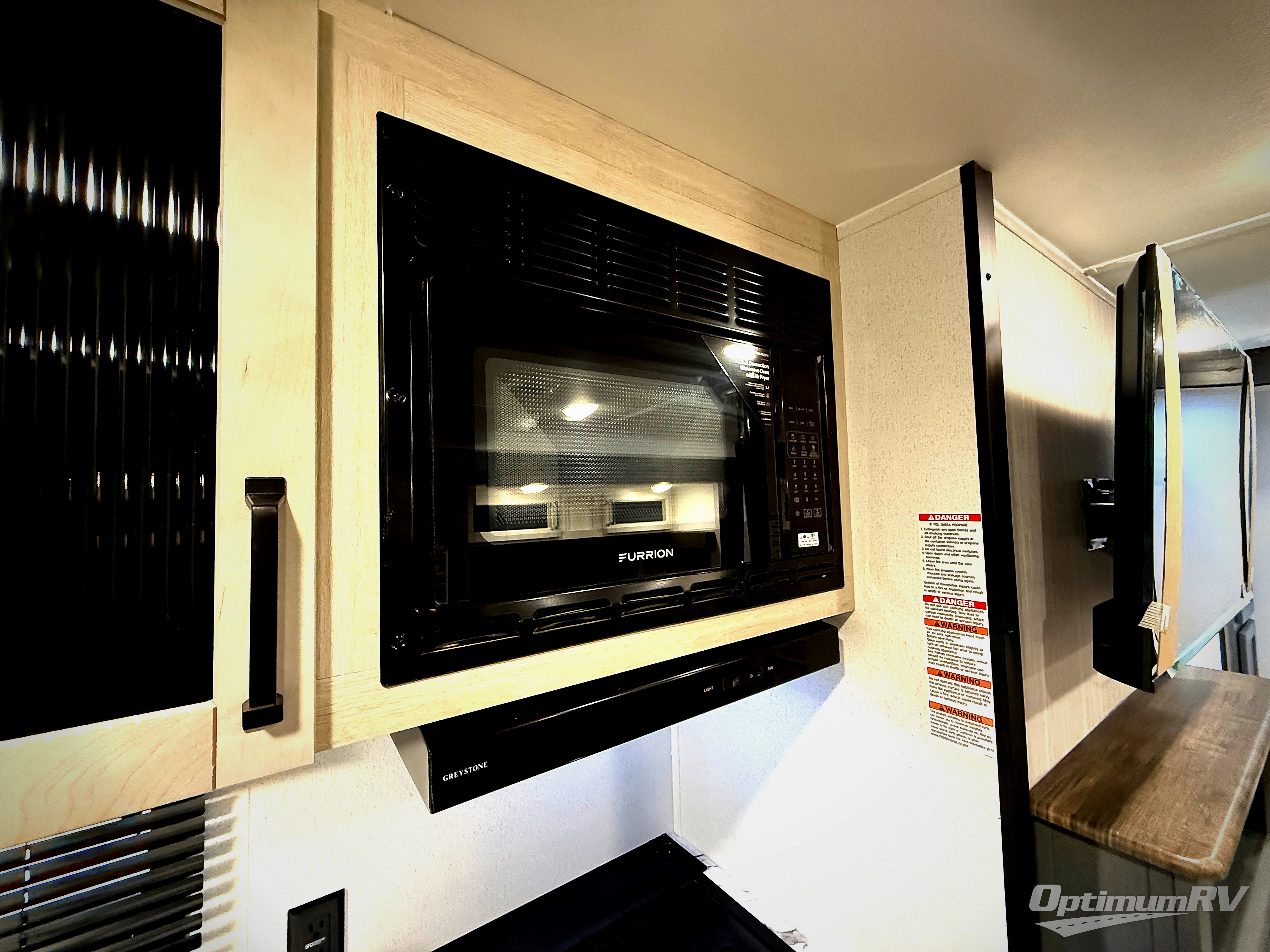 This travel trailer is inviting and spacious thanks to the large slide out, which houses the sofa, 12V refrigerator and second pantry! There is a fireplace across from the sofa for added comfort, and the full rear bath will be easy to get to. A full kitchen inside includes a stainless steel oven and range plus a stainless steel microwave to cook meals, and you can choose to add the optional micro kitchen with a griddle if you enjoy cooking outdoors! When you're ready to call it a night, the queen bed in the front private bedroom will be calling your name!