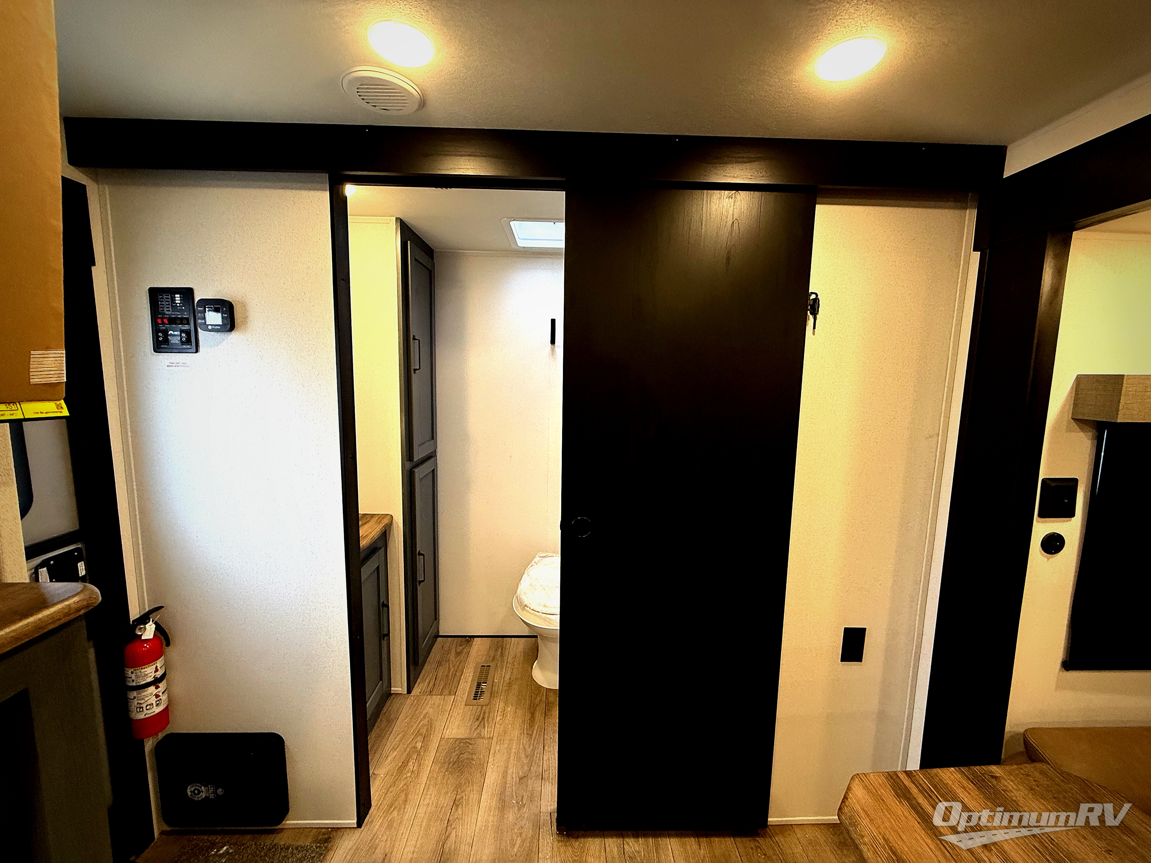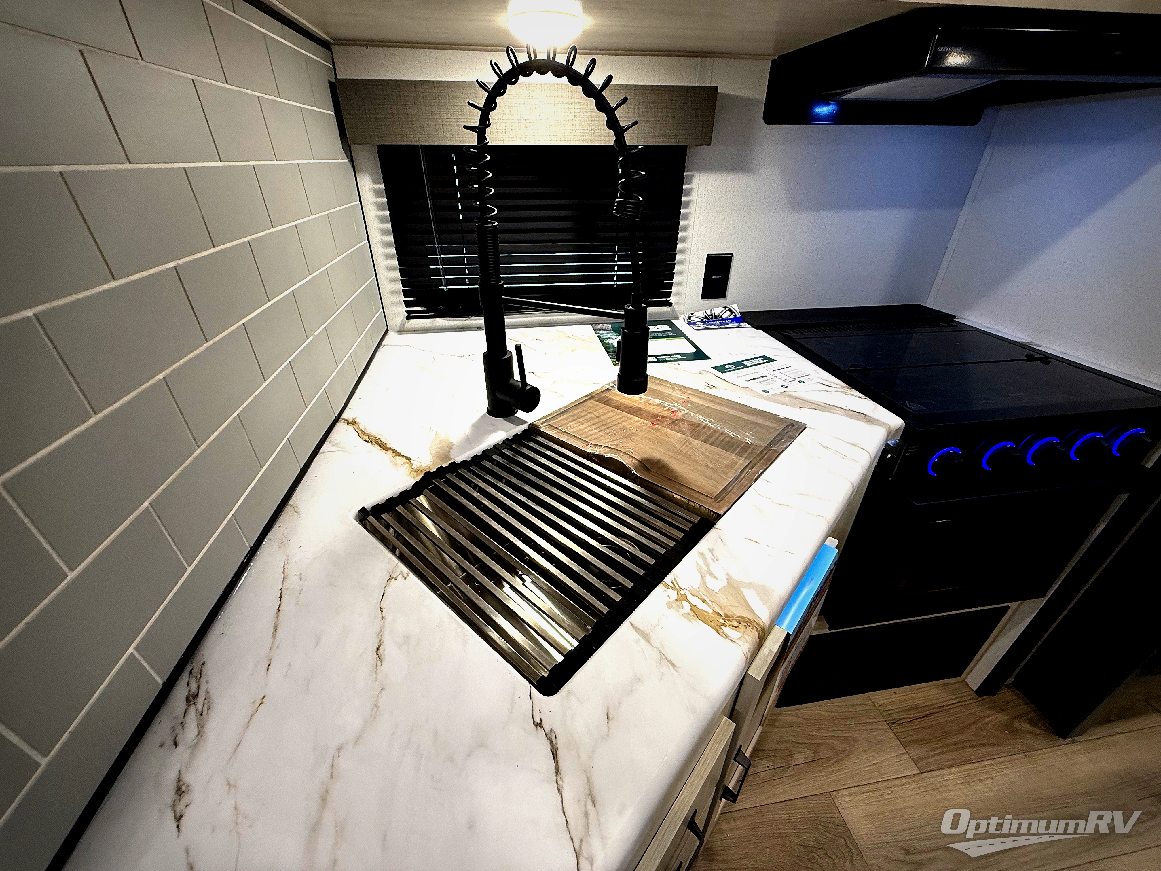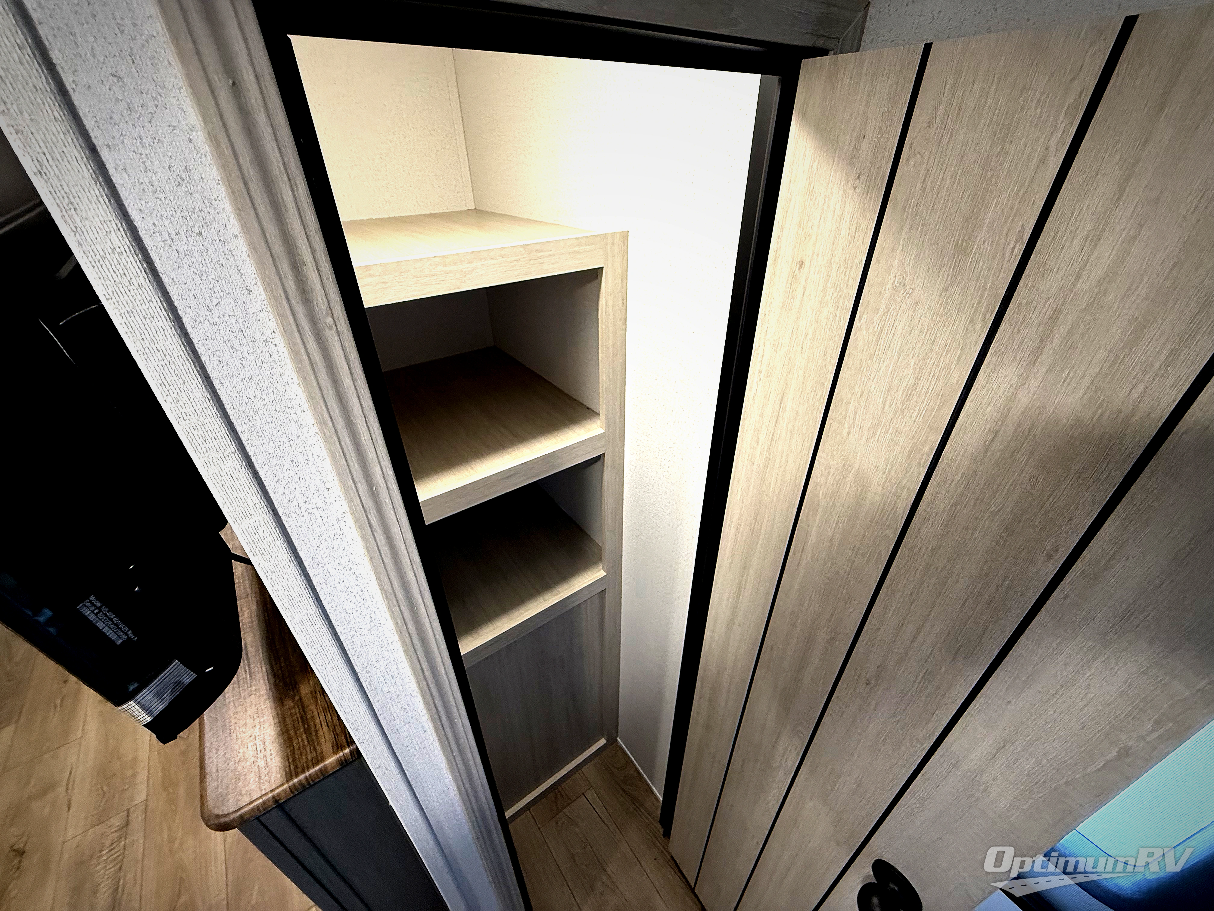 This travel trailer is inviting and spacious thanks to the large slide out, which houses the sofa, 12V refrigerator and second pantry! There is a fireplace across from the sofa for added comfort, and the full rear bath will be easy to get to. A full kitchen inside includes a stainless steel oven and range plus a stainless steel microwave to cook meals, and you can choose to add the optional micro kitchen with a griddle if you enjoy cooking outdoors! When you're ready to call it a night, the queen bed in the front private bedroom will be calling your name!