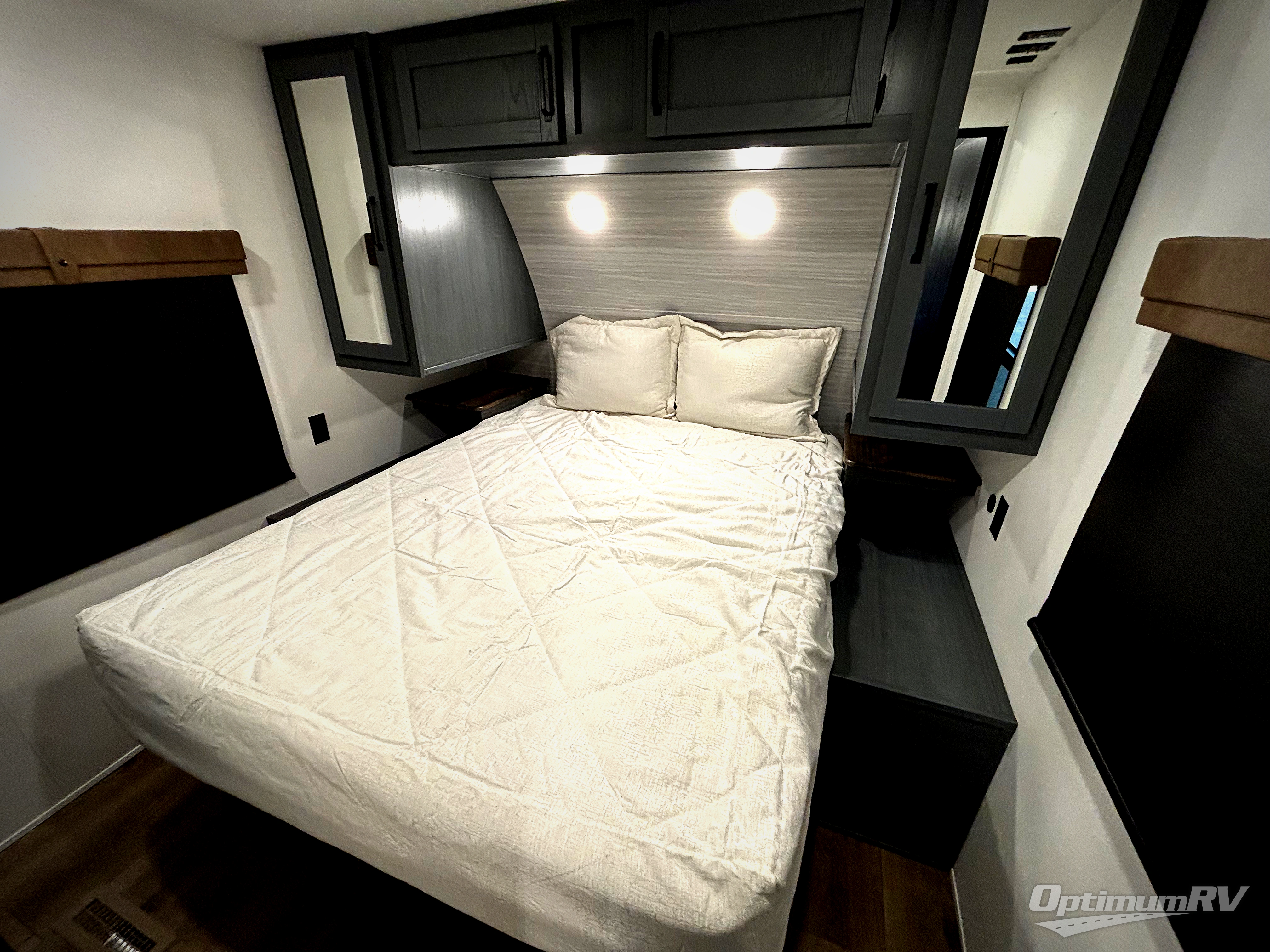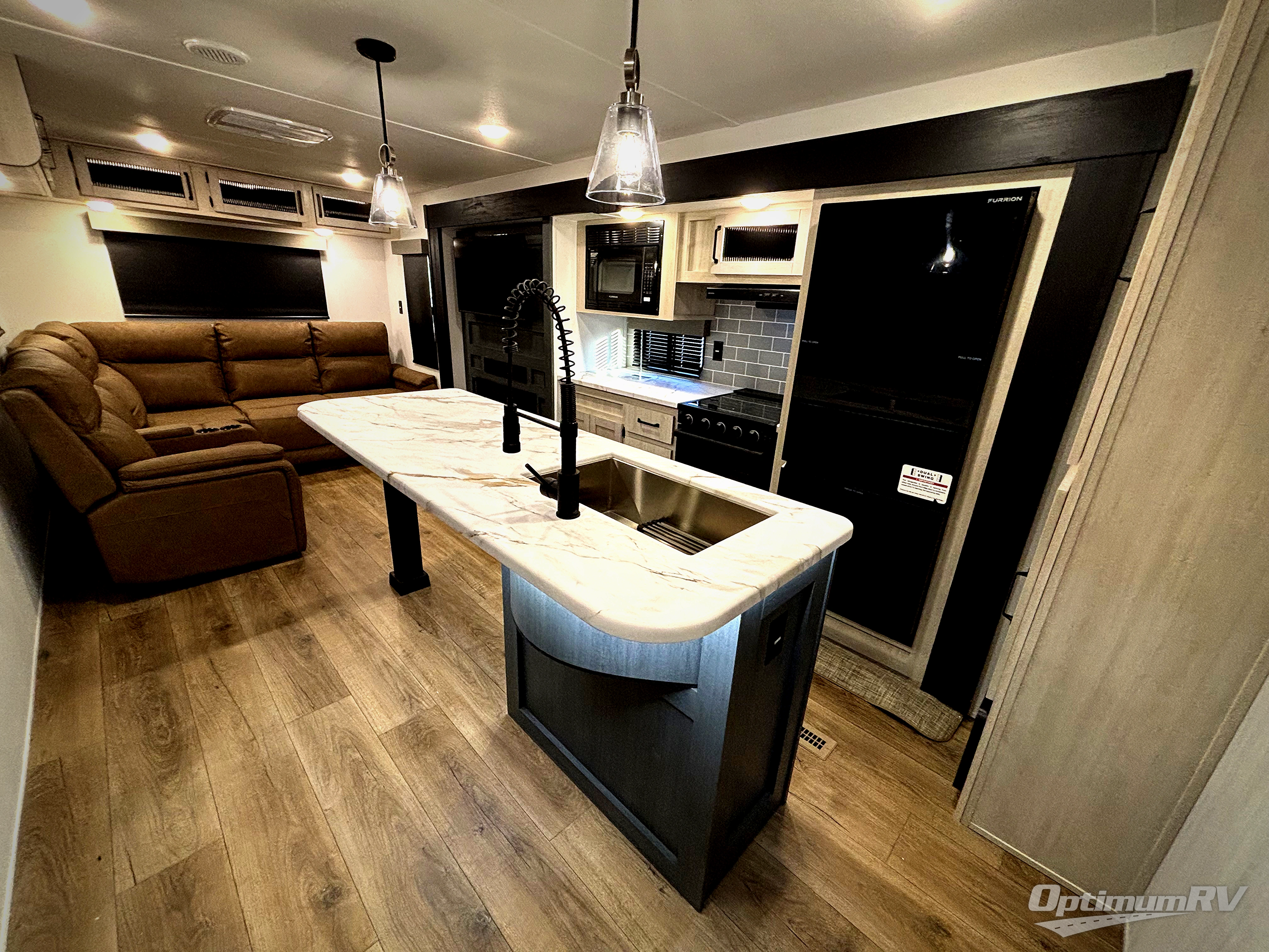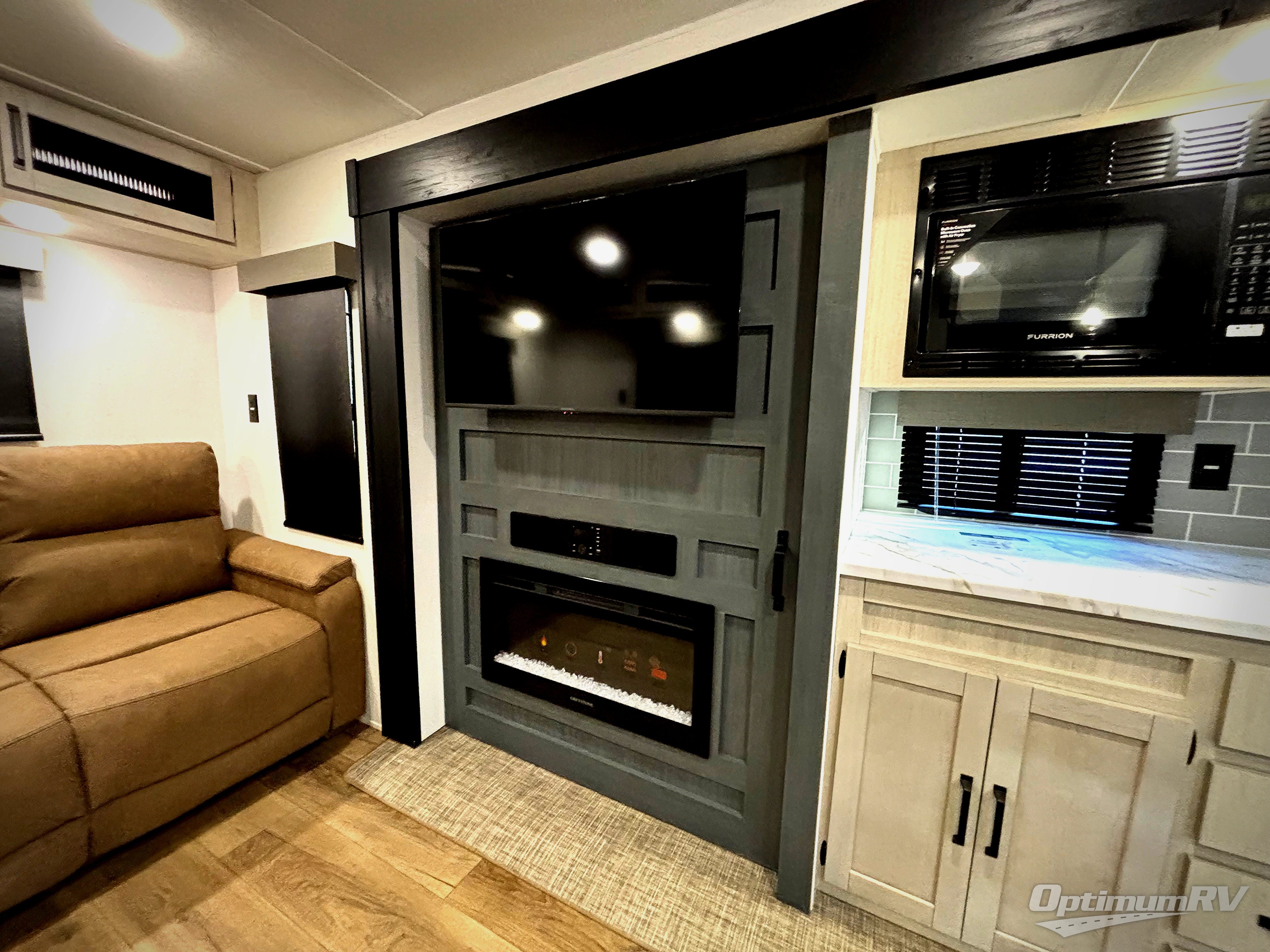 Pack your bags and head to your favorite camping spot in this spacious travel trailer. There is a front private bedroom with a queen bed, dual shirt closets, plus washer and dryer prep if you choose to add these appliances. If you have guests staying over, they can sleep on the L-shaped sofa with a theater sofa on the end. And you're sure to appreciate the hidden pantry behind the entertainment center and fireplace! A full kitchen lets you make breakfast for your crew, and there is a large kitchen island with four chairs to dine at.