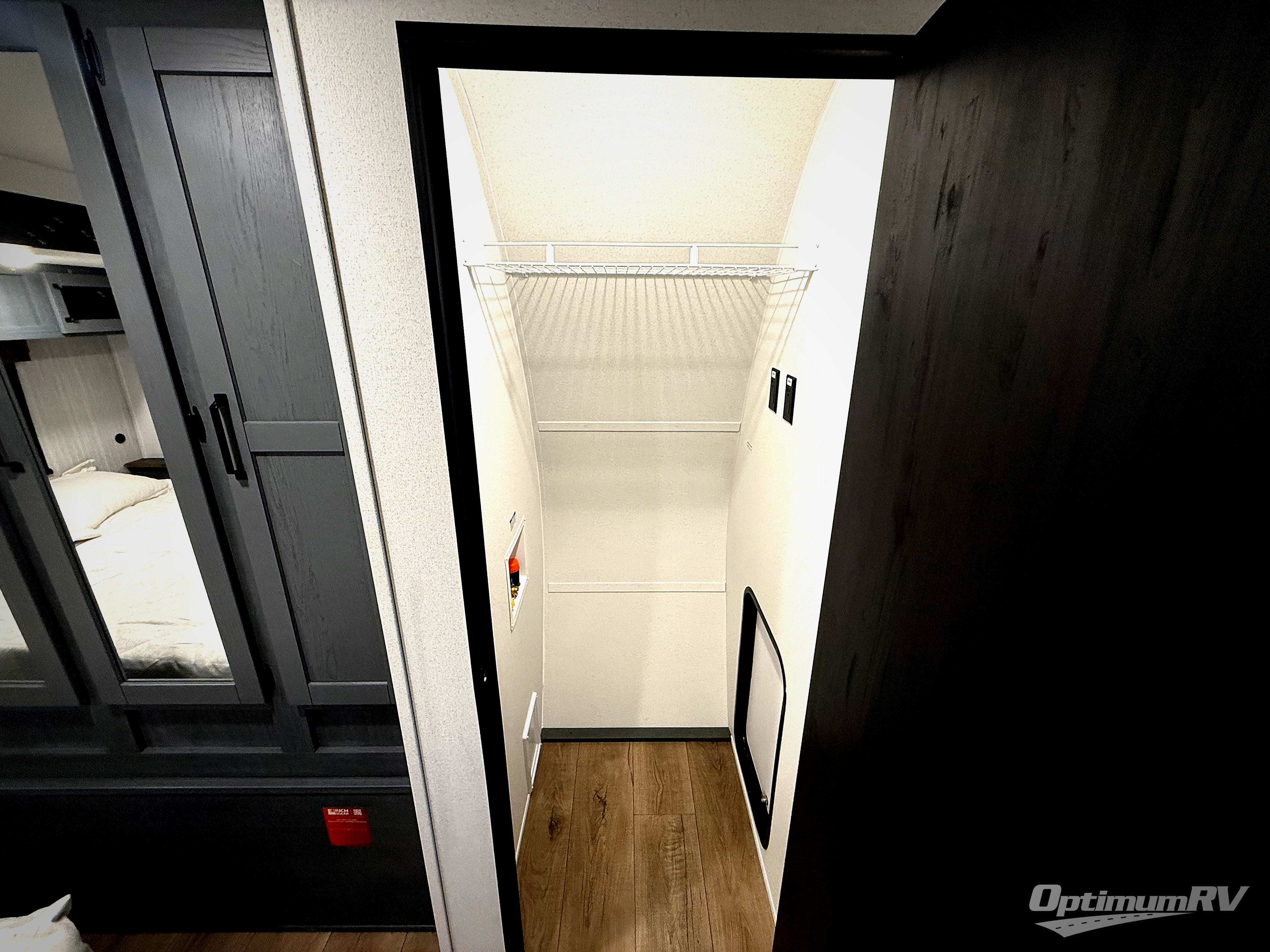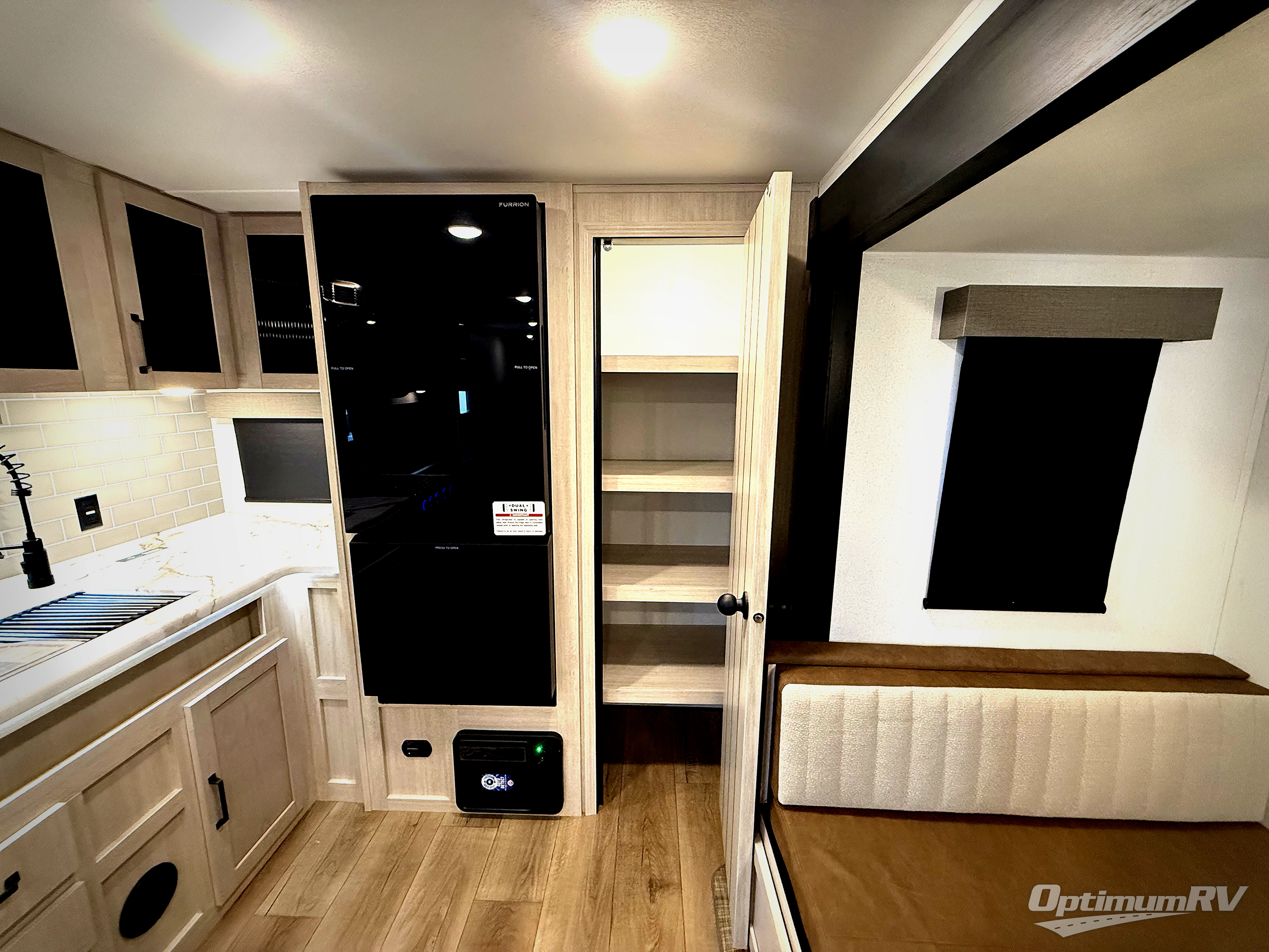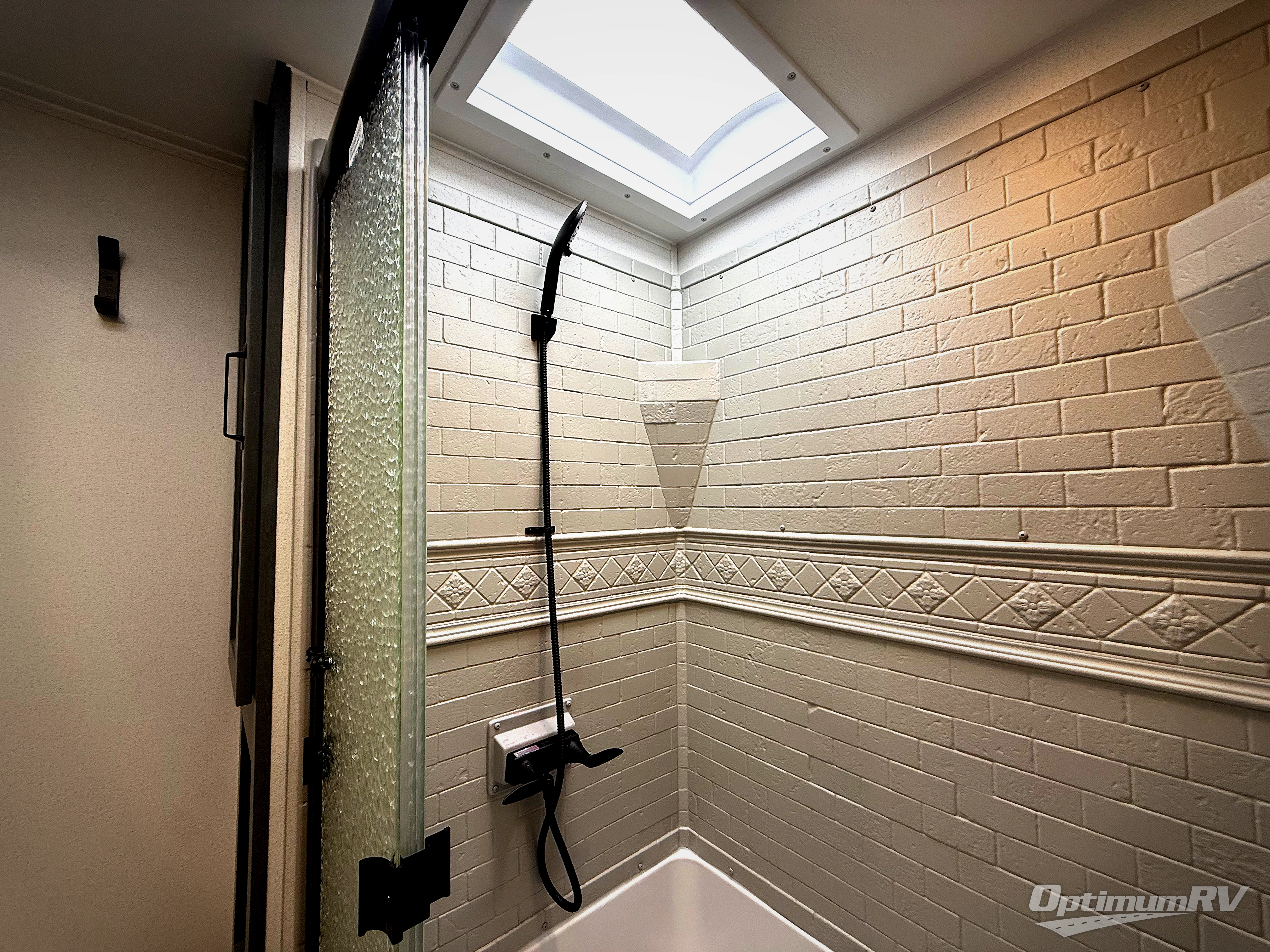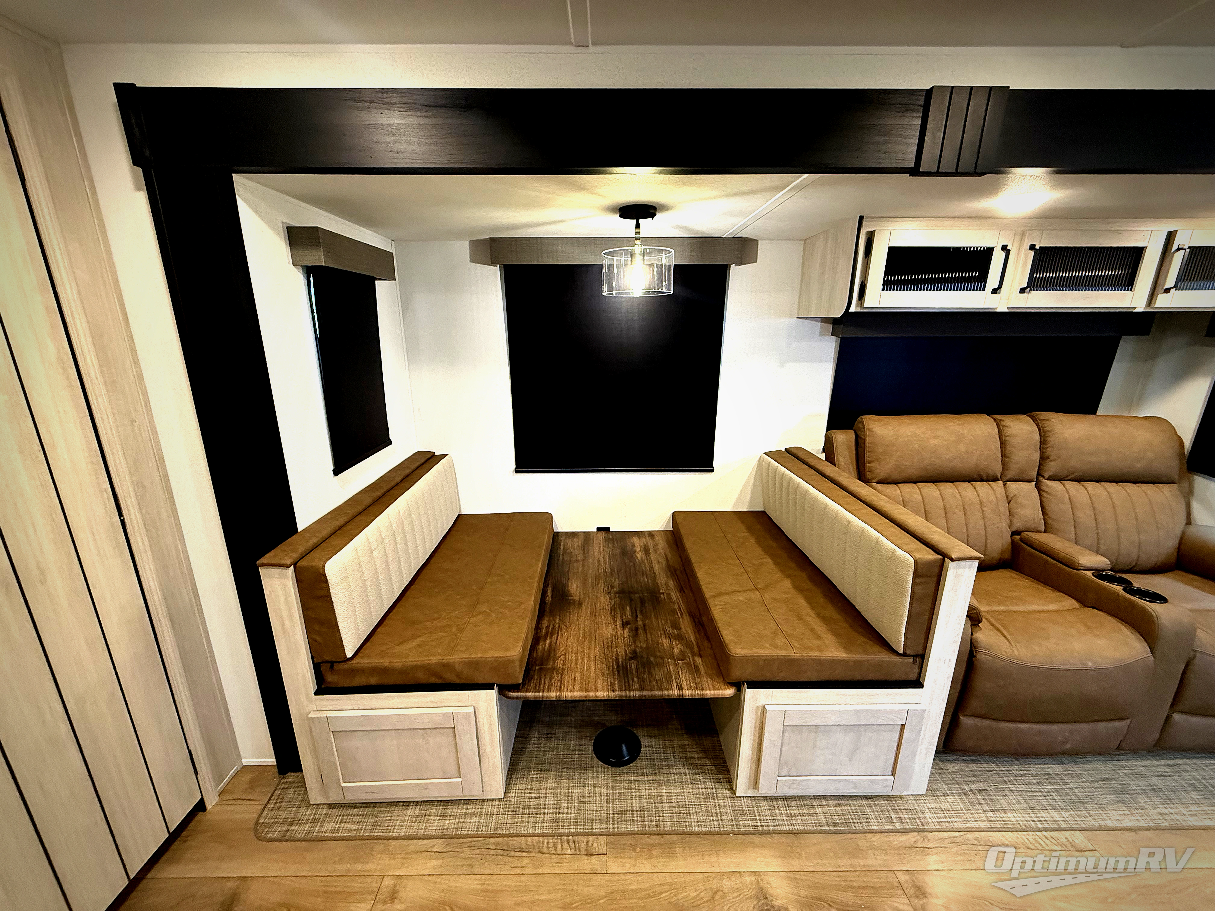 You won't want to camp any other way once you step inside this travel trailer! The rear kitchen has a stainless steel oven and range to prepare your best meals, a 12V refrigerator to keep your perishables fresh, and a walk-in pantry for your canned goods and snacks for movie night. After a fun day at the beach, you can play a card game at the booth dinette, relax in either one of the two recliners and sofa, or rinse the sand out of your hair in the 32" x 40" shower with a seat in the full bathroom. There is also a front private bedroom with a queen bed slide across from a dresser and a front closet with another closet with washer and dryer prep.