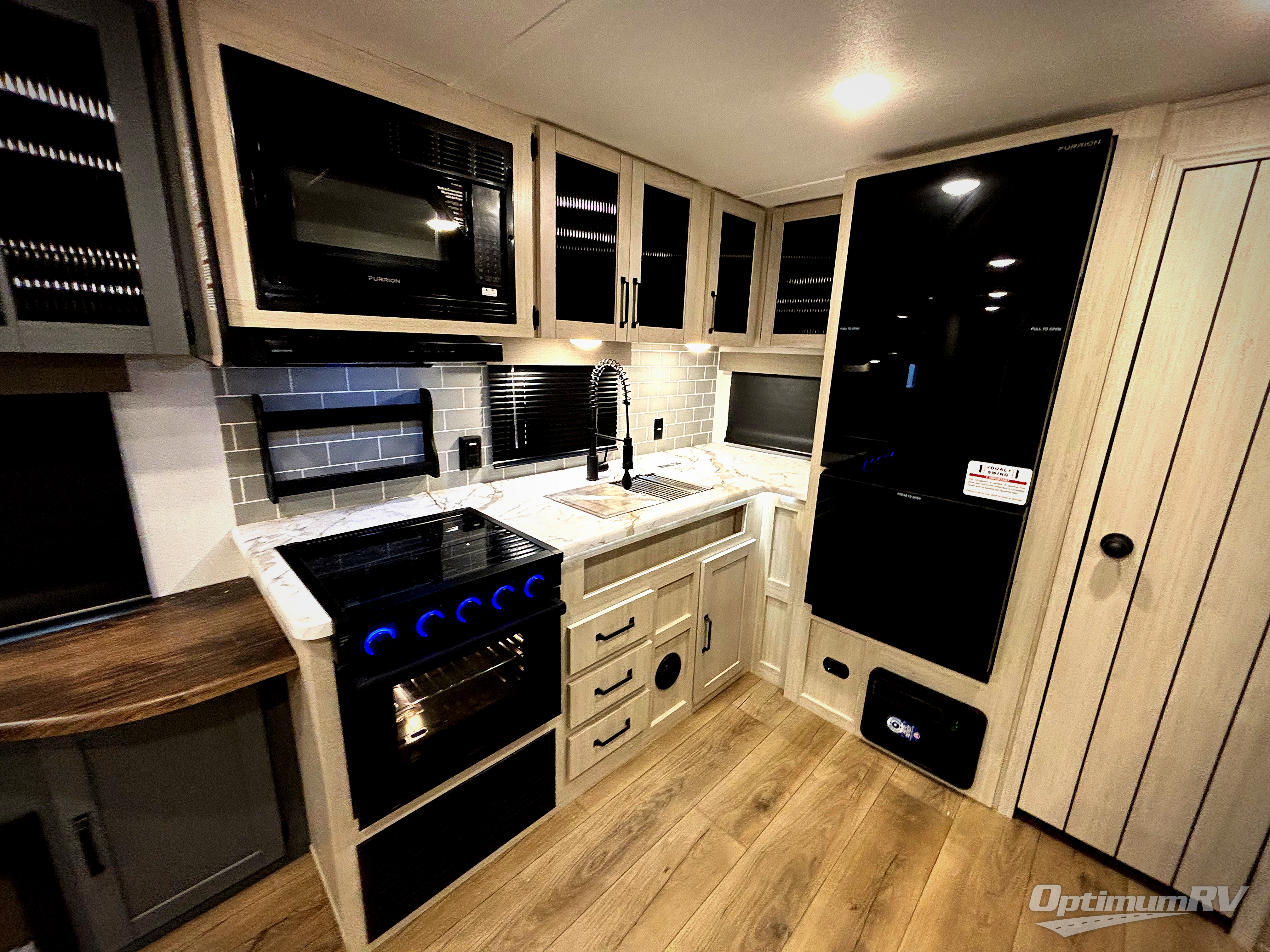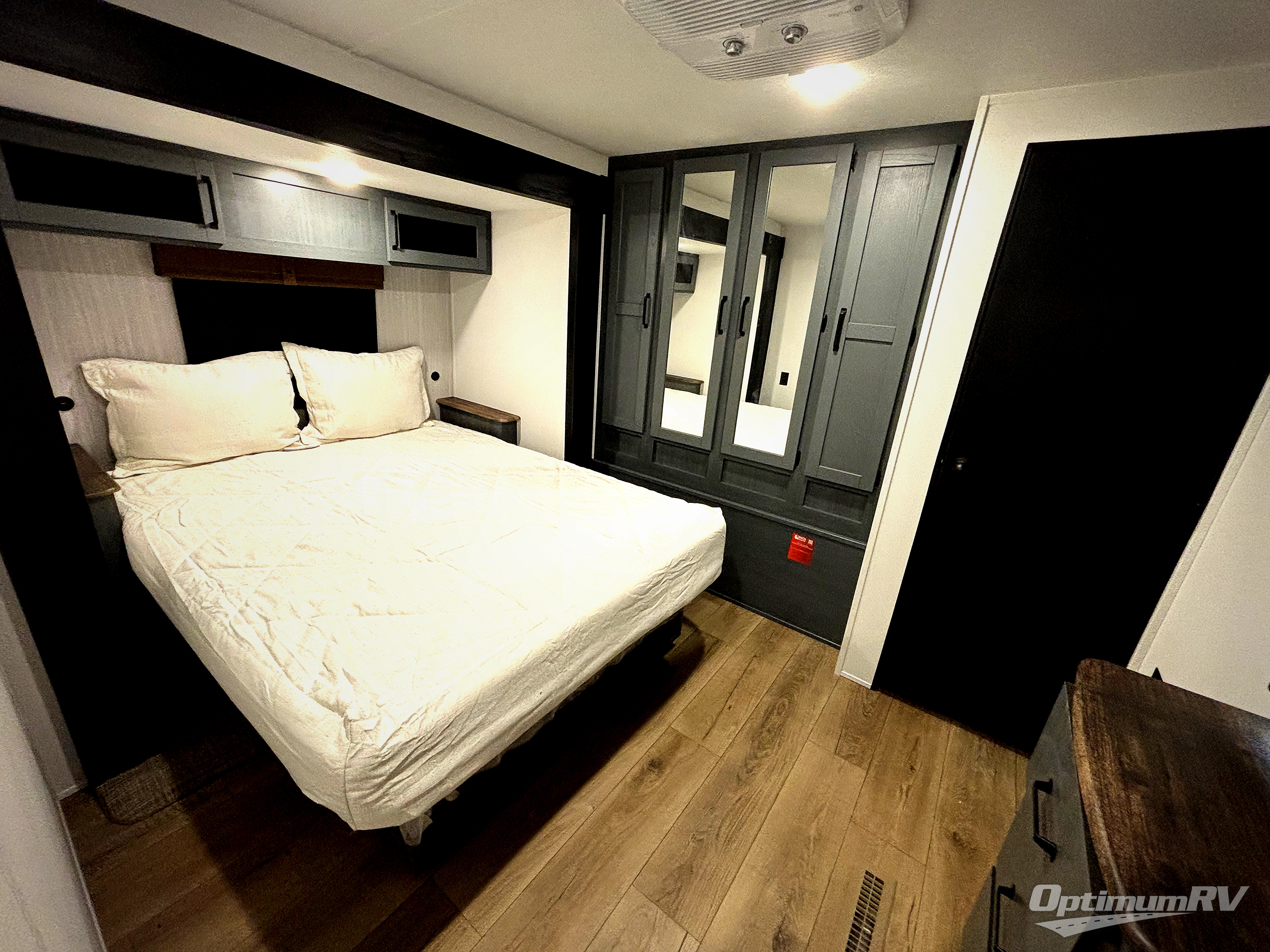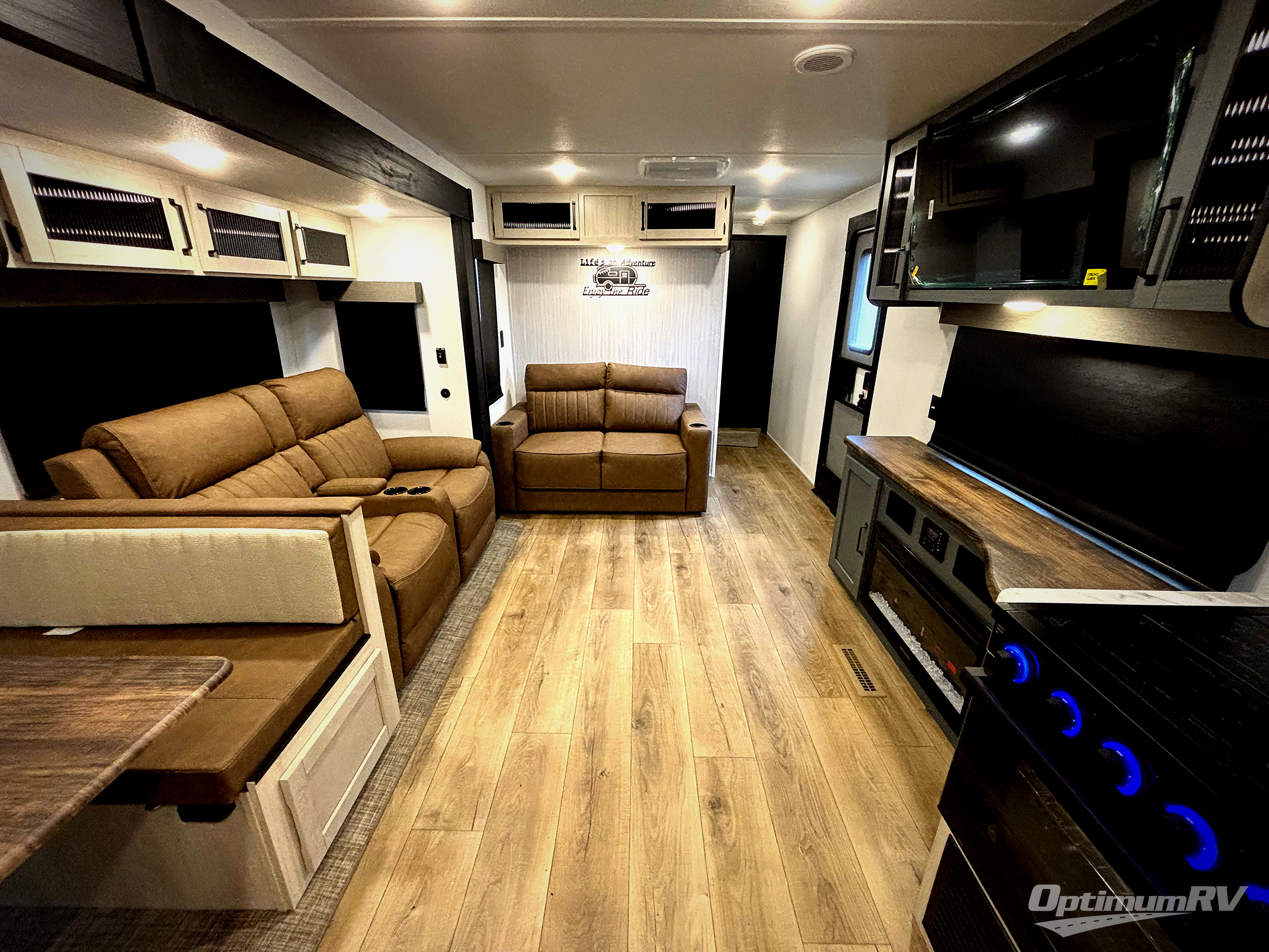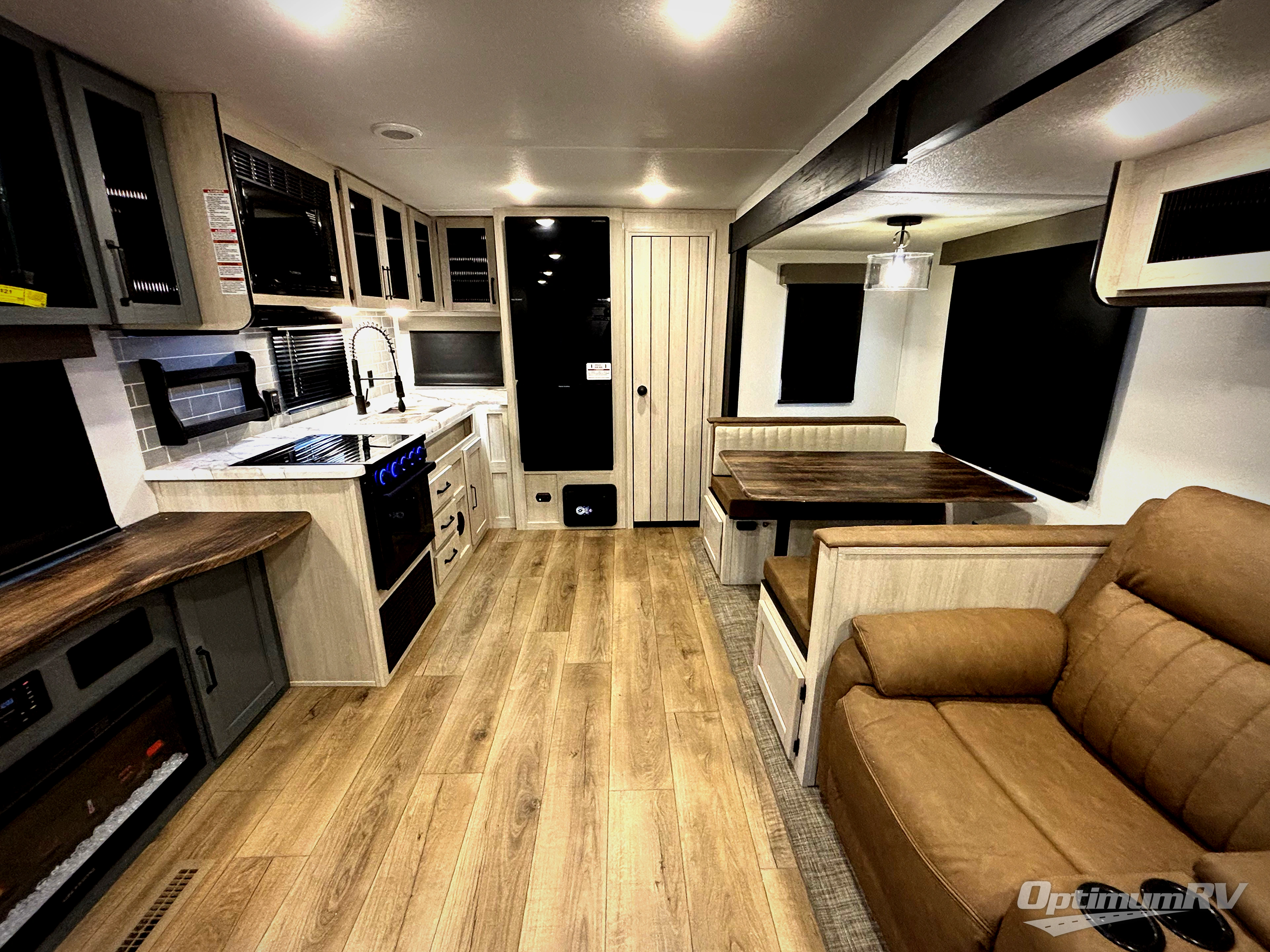 You won't want to camp any other way once you step inside this travel trailer! The rear kitchen has a stainless-steel oven and range to prepare your best meals, a 12V refrigerator to keep your perishables fresh, and a walk-in pantry for your canned goods and snacks for movie night. After a fun day at the beach, you can play a card game at the booth dinette, relax on the theater seating and sofa, or rinse the sand out of your hair in the 32" x 40" shower with a seat in the full bathroom. There is also a front private bedroom with a queen bed slide across from a dresser and a front closet with another closet with washer and dryer prep.
