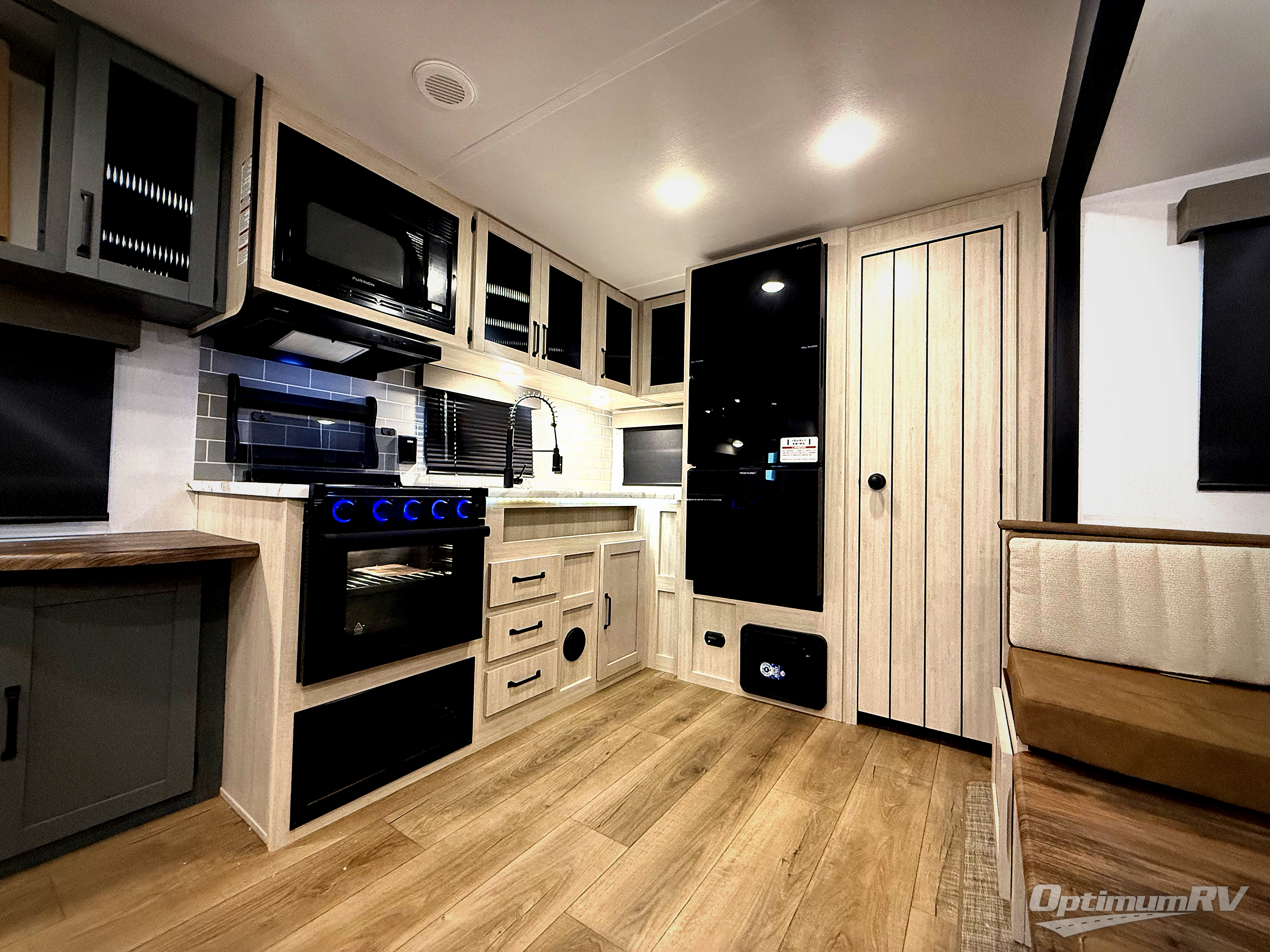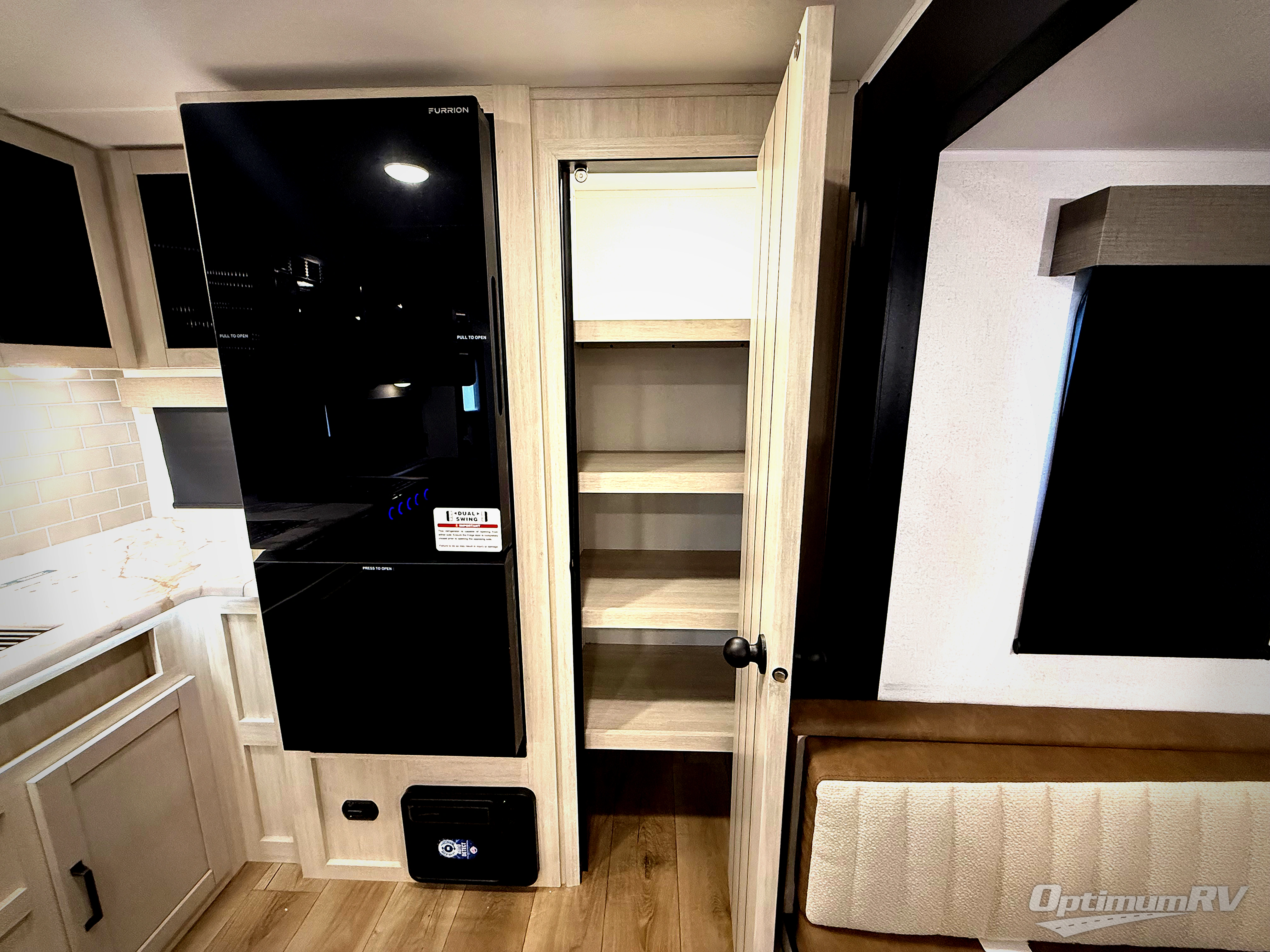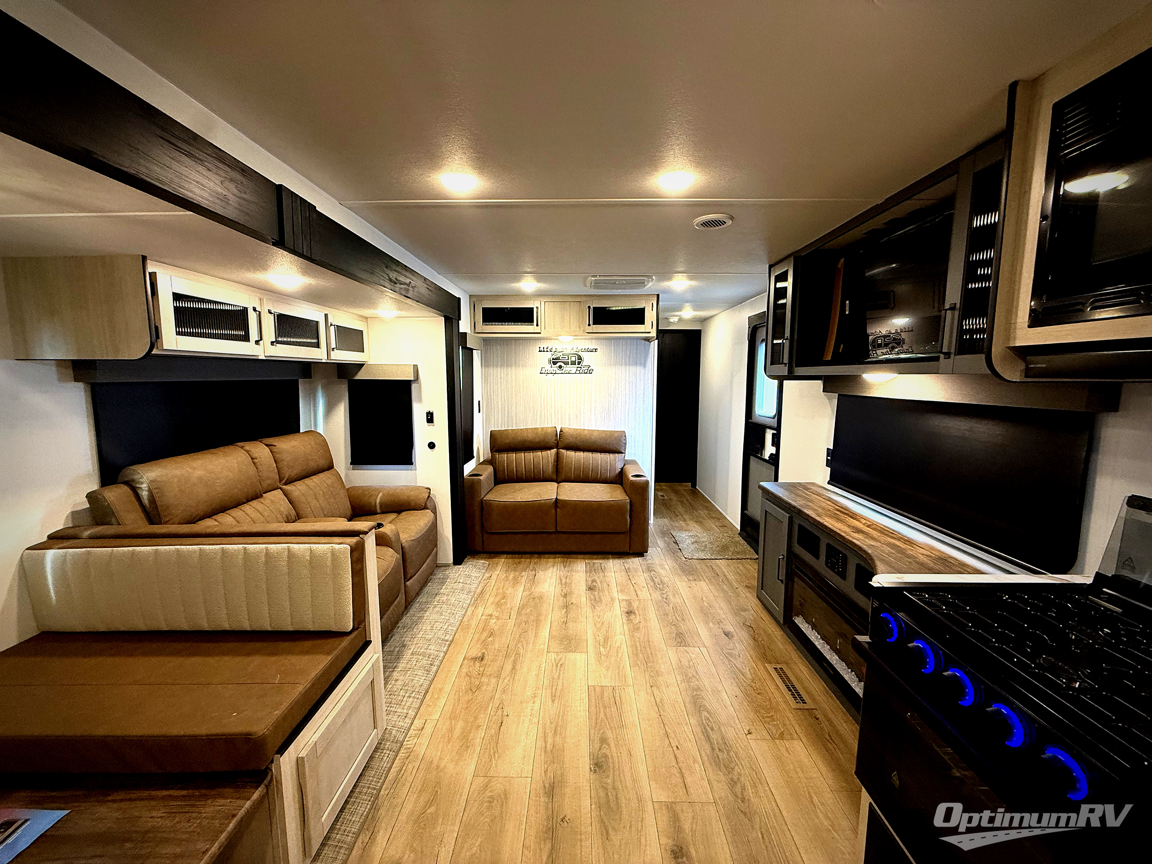 You won't want to camp any other way once you step inside this travel trailer! The rear kitchen has a stainless-steel oven and range to prepare your best meals, a 12V refrigerator to keep your perishables fresh, and a walk-in pantry for your canned goods and snacks for movie night. After a fun day at the beach, you can play a card game at the booth dinette, relax on the theater seating and sofa, or rinse the sand out of your hair in the 32" x 40" shower with a seat in the full bathroom. There is also a front private bedroom with a queen bed slide across from a dresser and a front closet with another closet with washer and dryer prep.