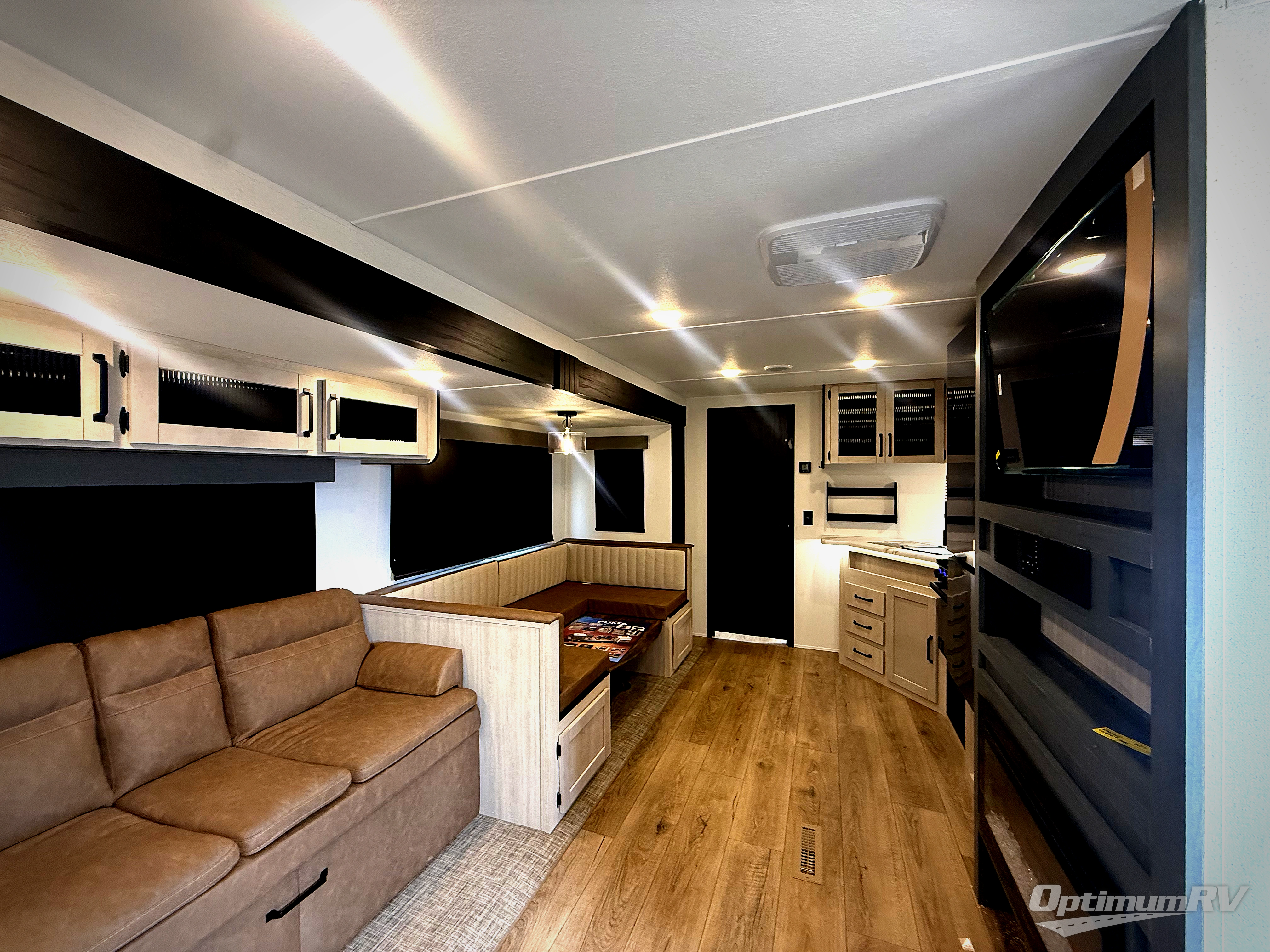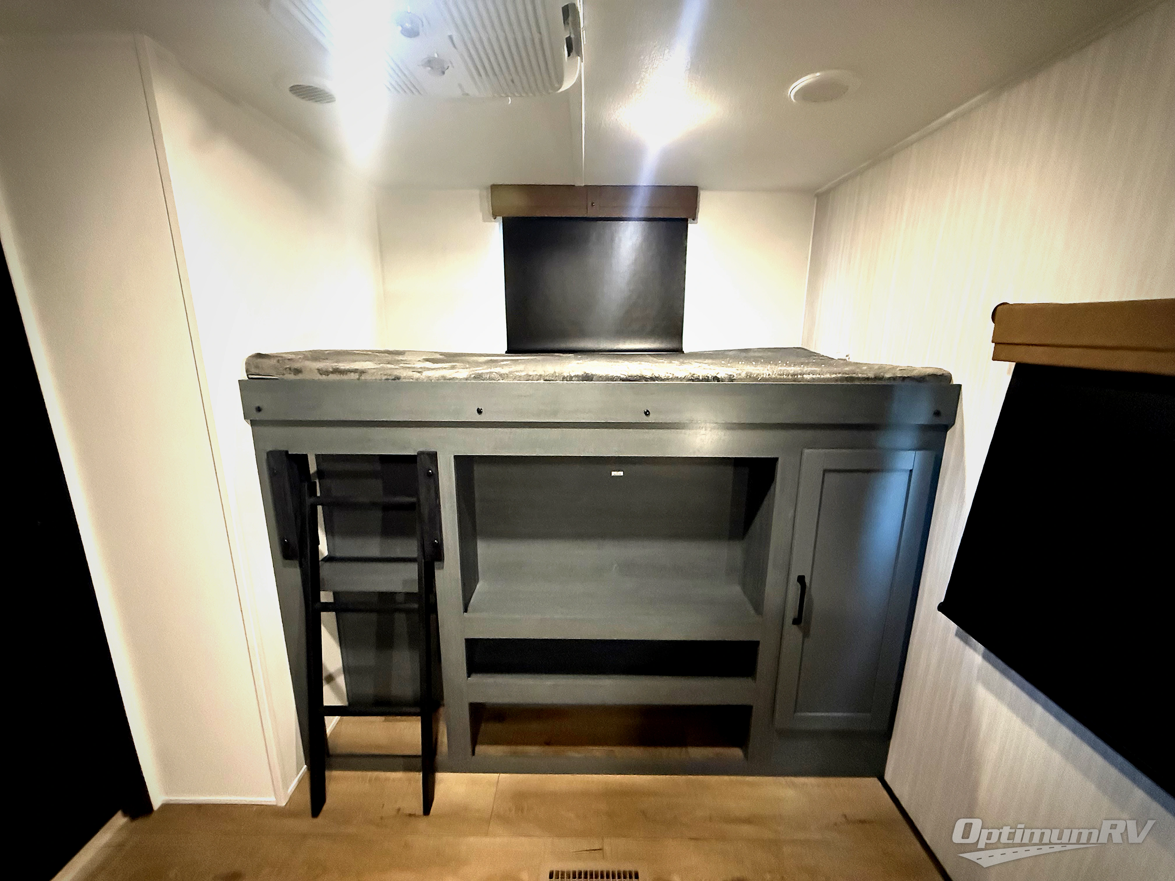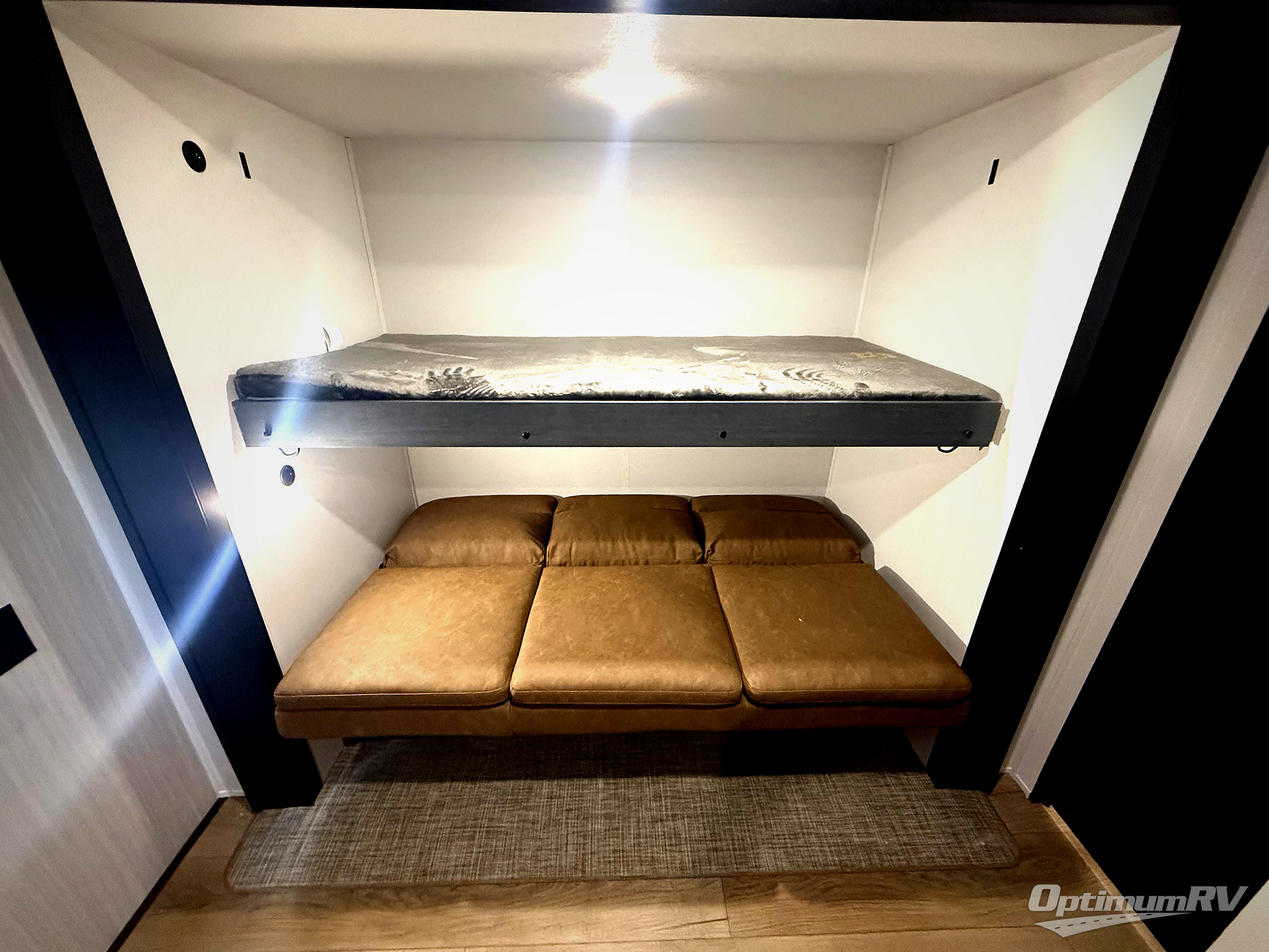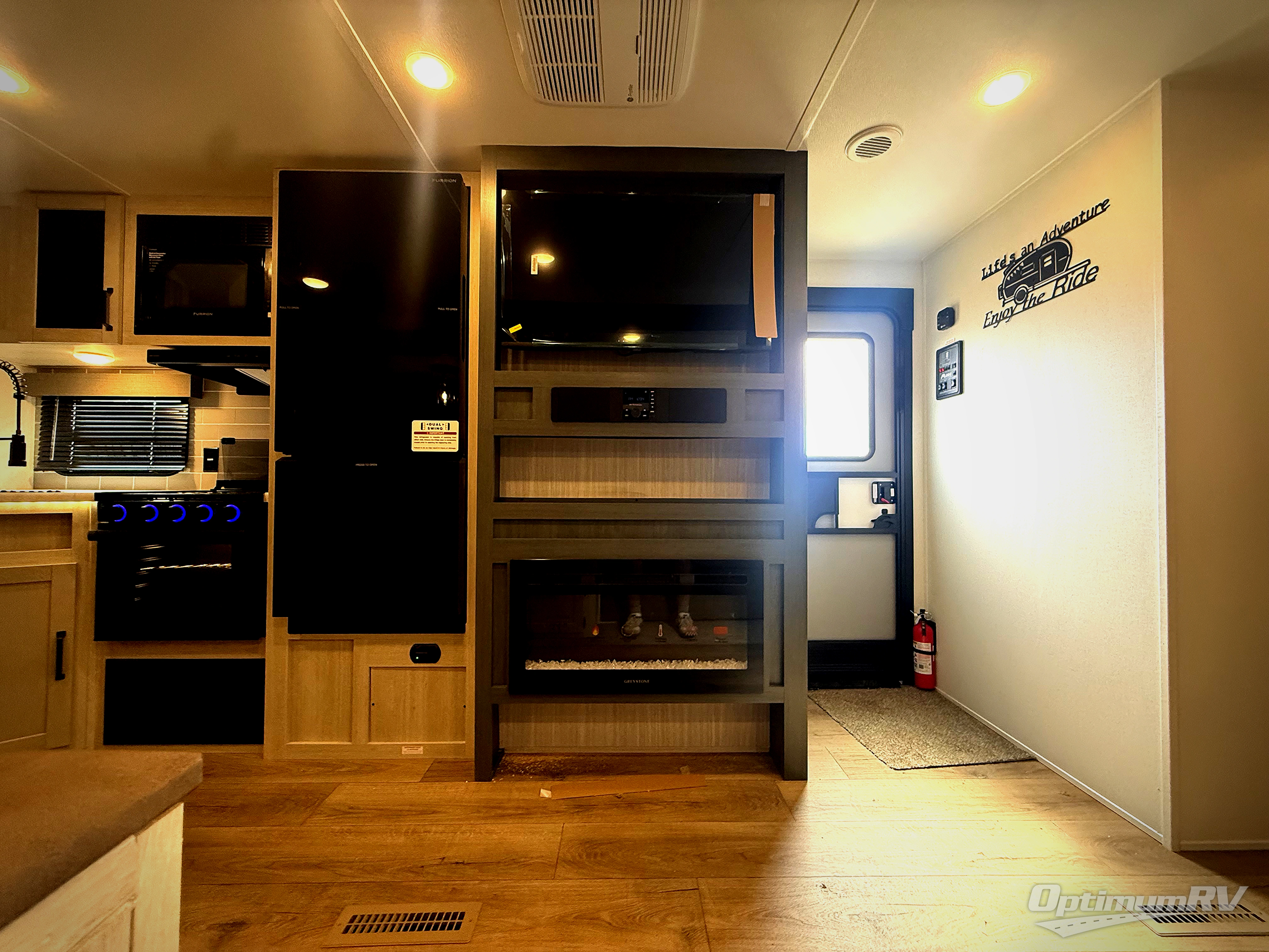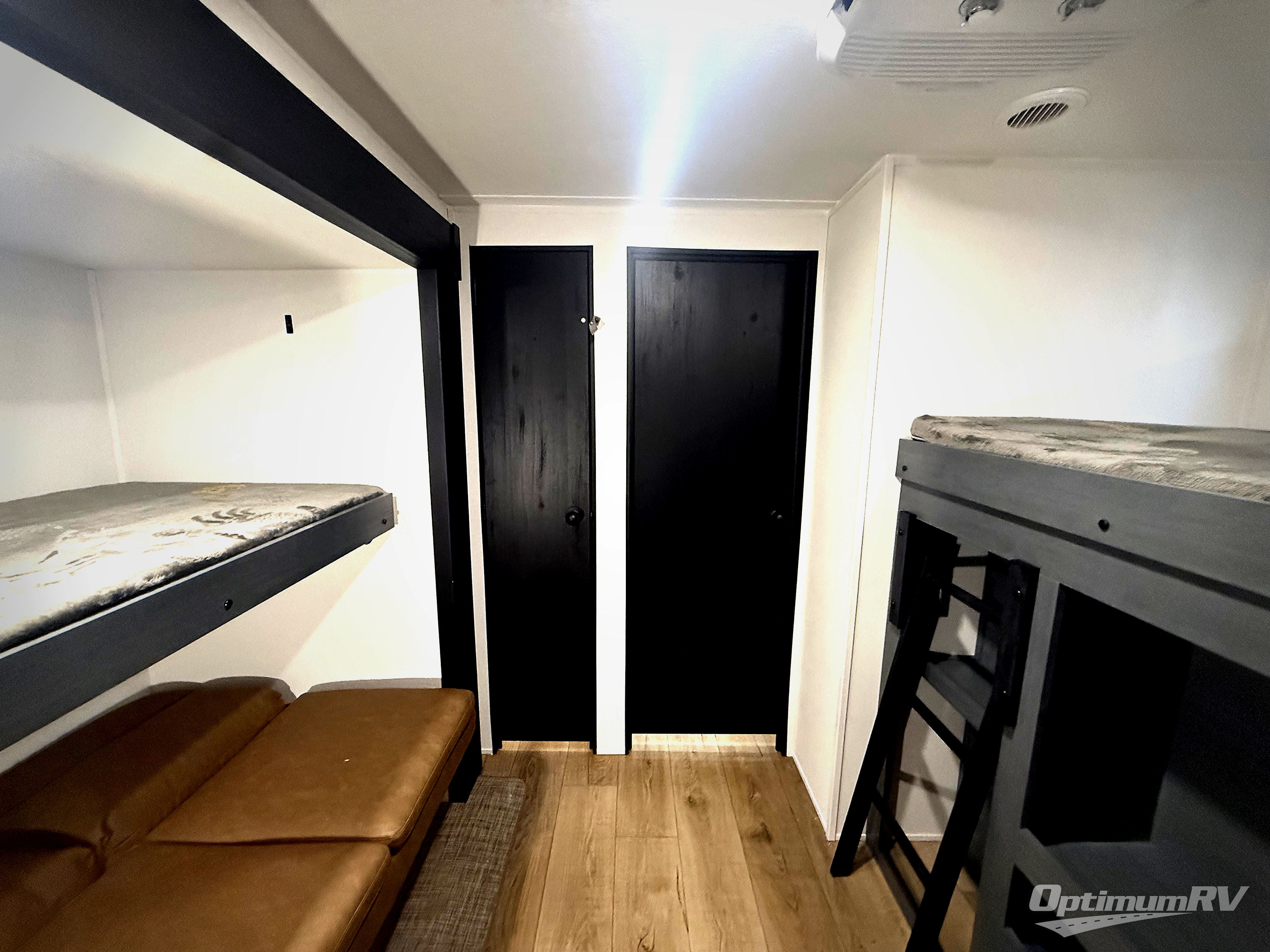 The kids will love having their own rear private bunkhouse in this travel trailer! Inside the bunkhouse is a 38" x 76" bunk above an entertainment center, a closet, and a 32" x 69" bunk above a jiffy sofa slide. The full bathroom with a 34" x 34" radius shower is just outside the bunkhouse for them to easily access it at night. They can even invite a friend or two to tag along and sleep on the sofa and U-shaped dinette once converted. Behind the entertainment center is a closet/pantry to keep your favorite snacks and the kitchen has a 12V refrigerator to keep your beverages cold. When you're ready to wind down your nights, head to the front private bedroom and relax on the queen bed with shirt closets and nightstands on either side of it, plus it has one of the dual entry doors to the unit! This model also has an outside kitchen option if you enjoy cooking in the fresh outdoors!