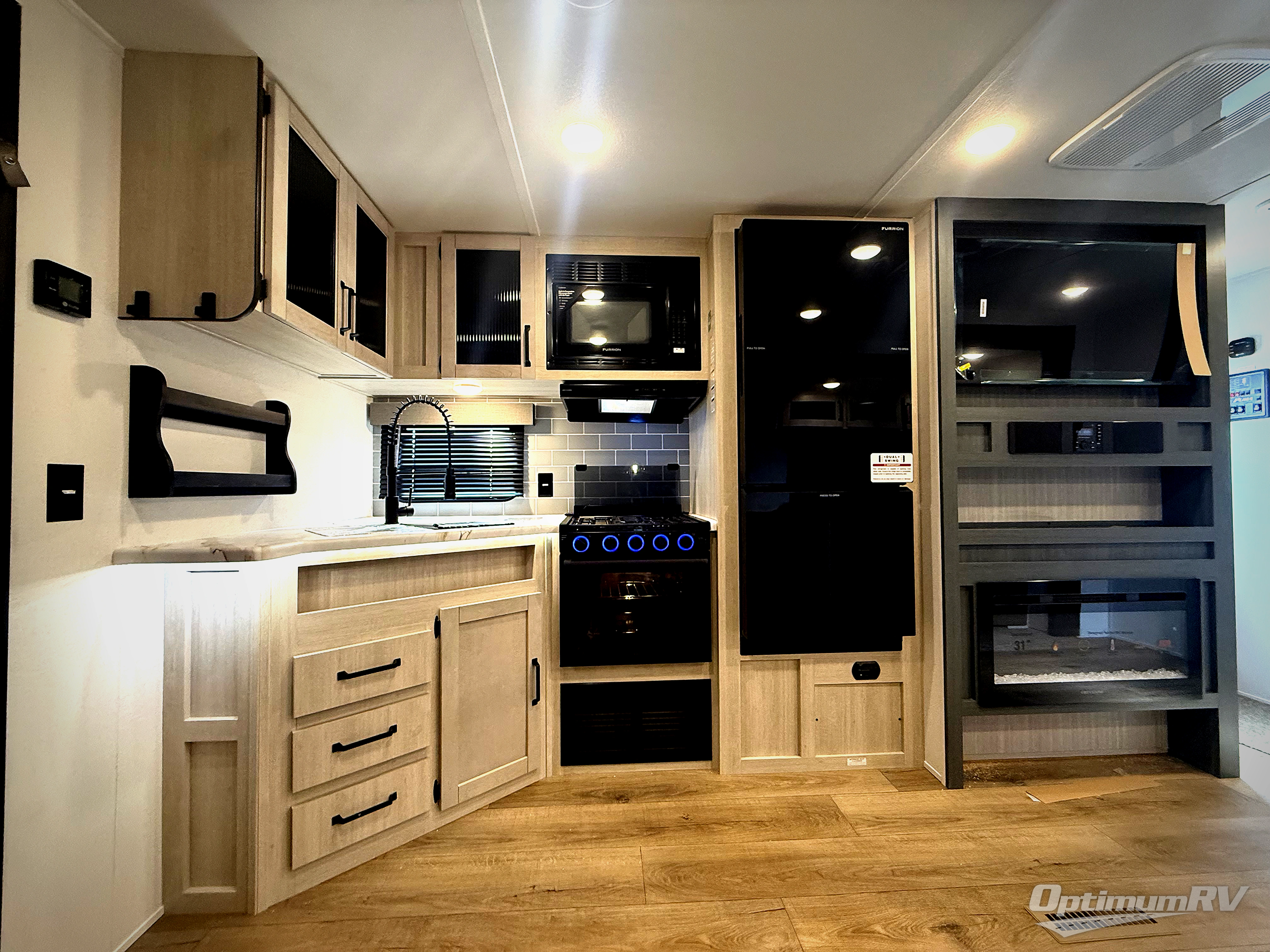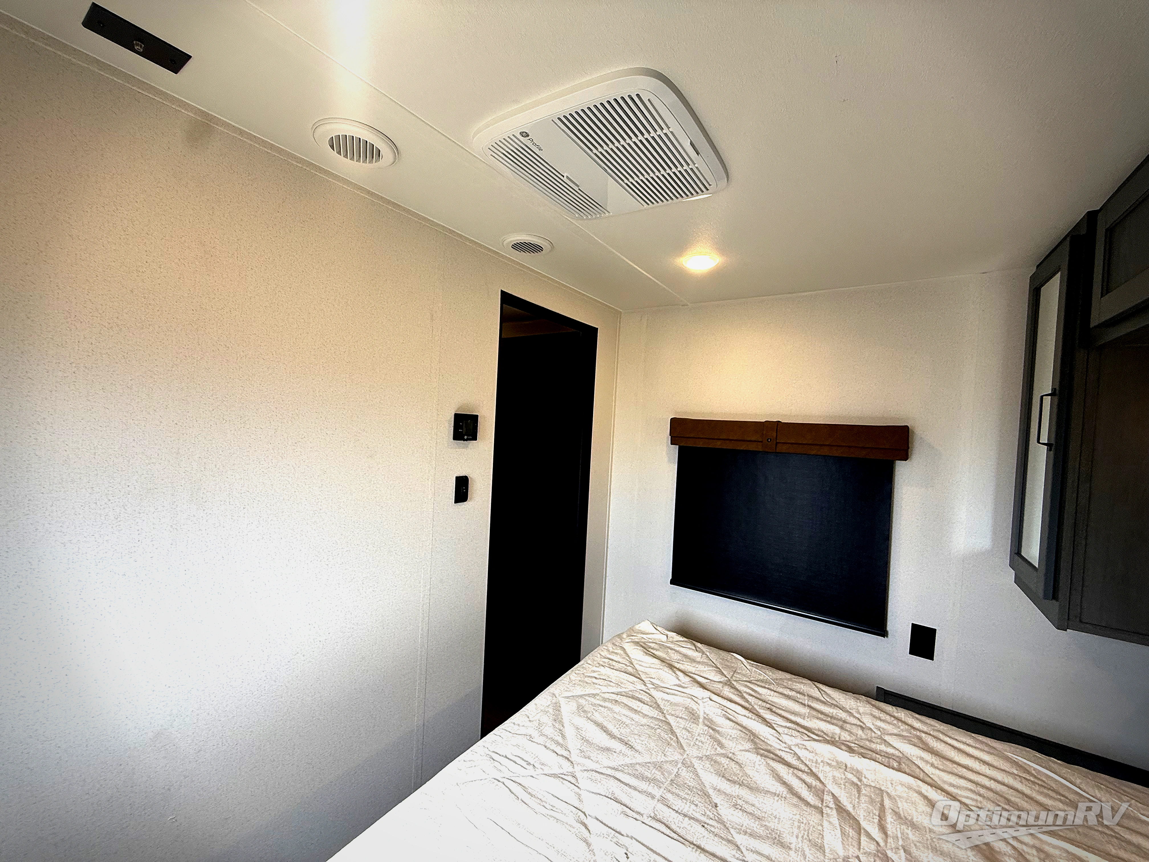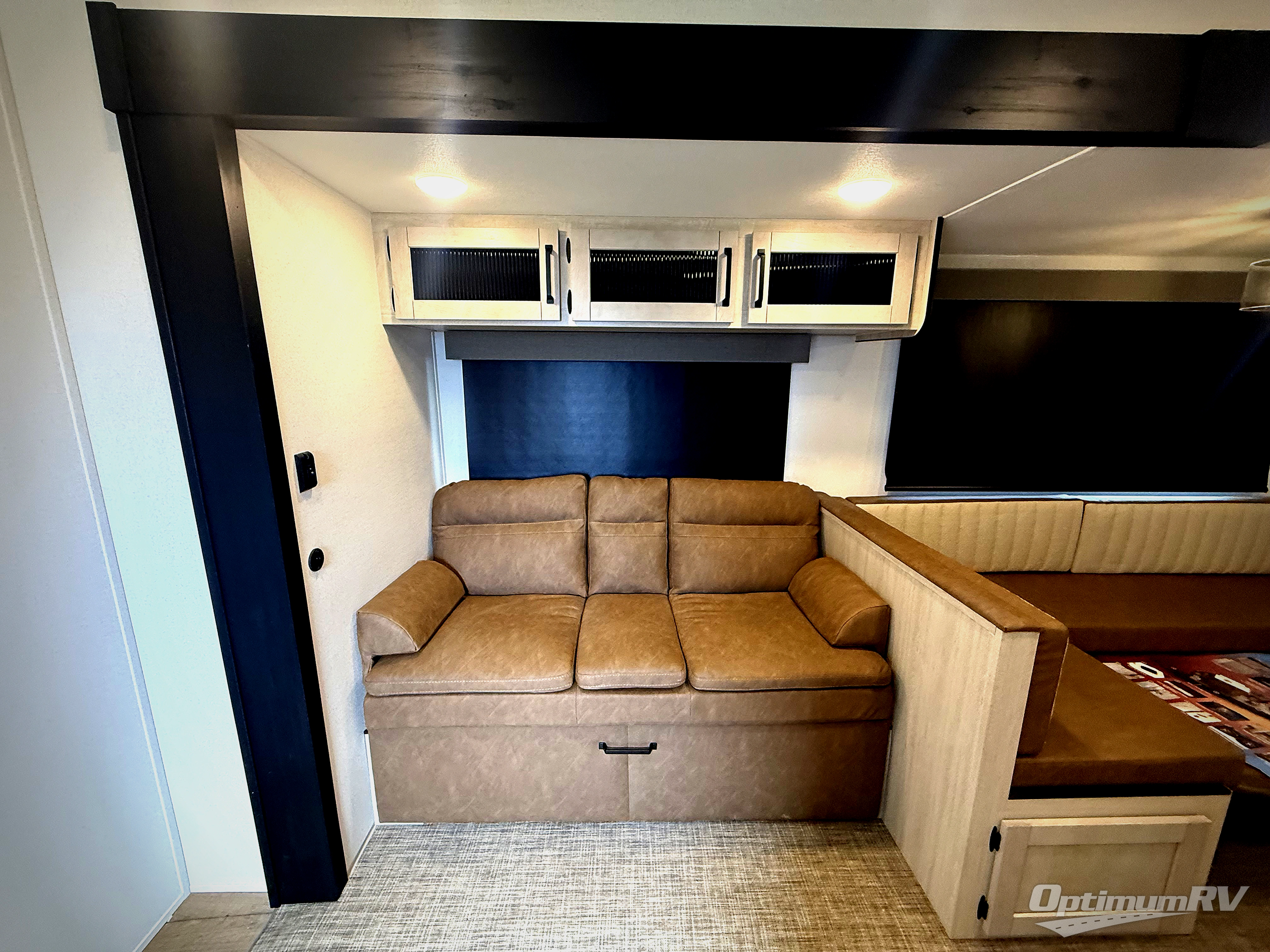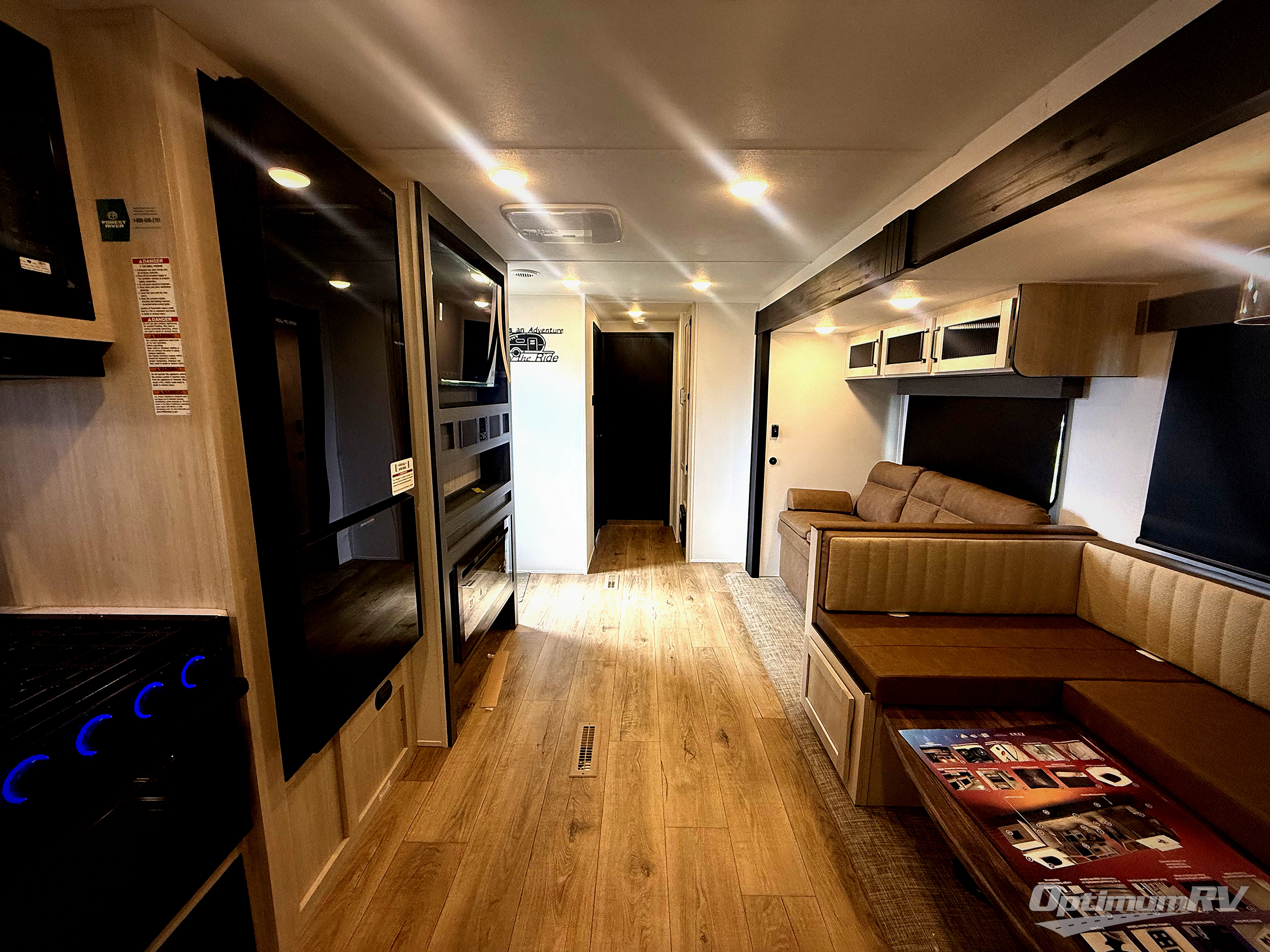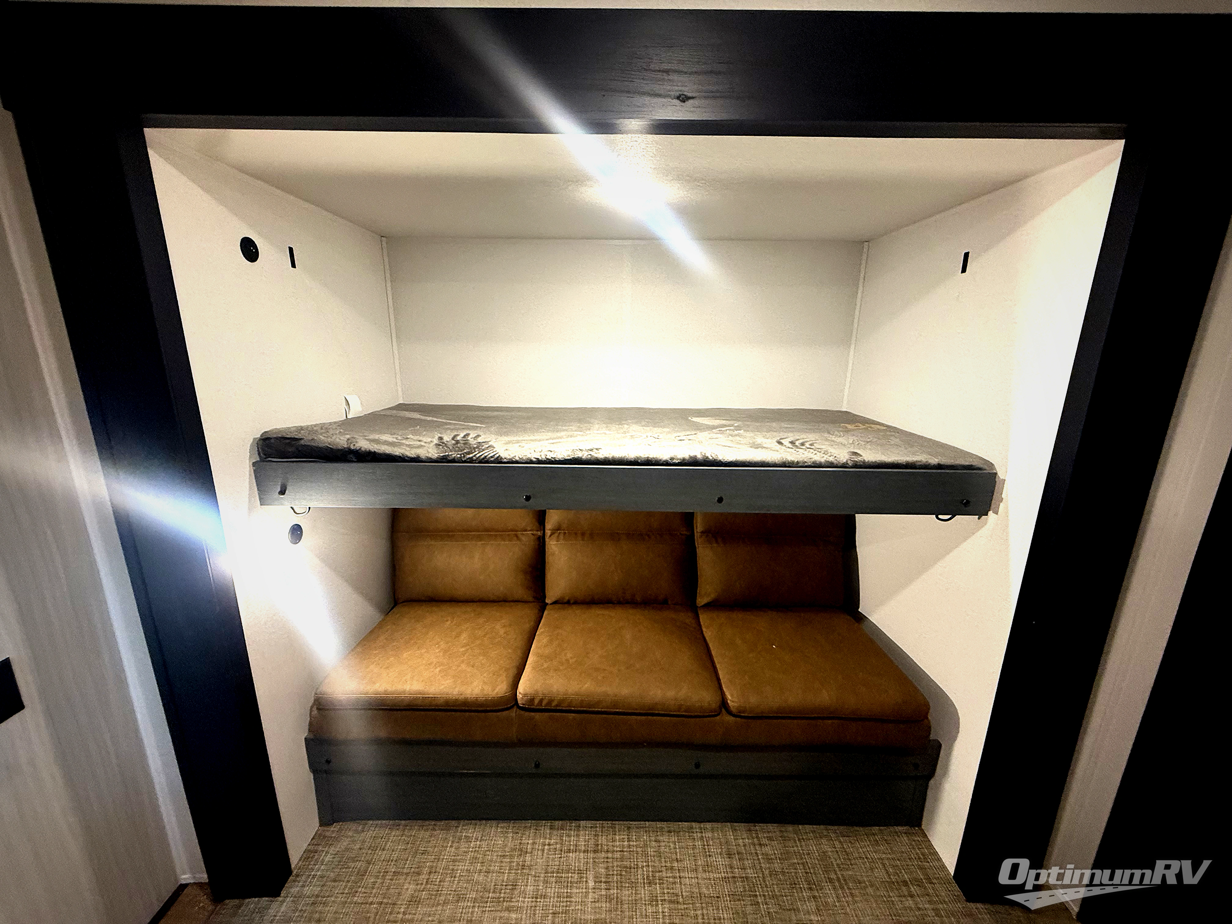 The kids will love having their own rear private bunkhouse in this travel trailer! Inside the bunkhouse is a 38" x 76" bunk above an entertainment center, a closet, and a 32" x 69" bunk above a jiffy sofa slide. The full bathroom with a 34" x 34" radius shower is just outside the bunkhouse for them to easily access it at night. They can even invite a friend or two to tag along and sleep on the sofa and U-shaped dinette once converted. Behind the entertainment center is a closet/pantry to keep your favorite snacks and the kitchen has a 12V refrigerator to keep your beverages cold. When you're ready to wind down your nights, head to the front private bedroom and relax on the queen bed with shirt closets and nightstands on either side of it, plus it has one of the dual entry doors to the unit! This model also has an outside kitchen option if you enjoy cooking in the fresh outdoors!