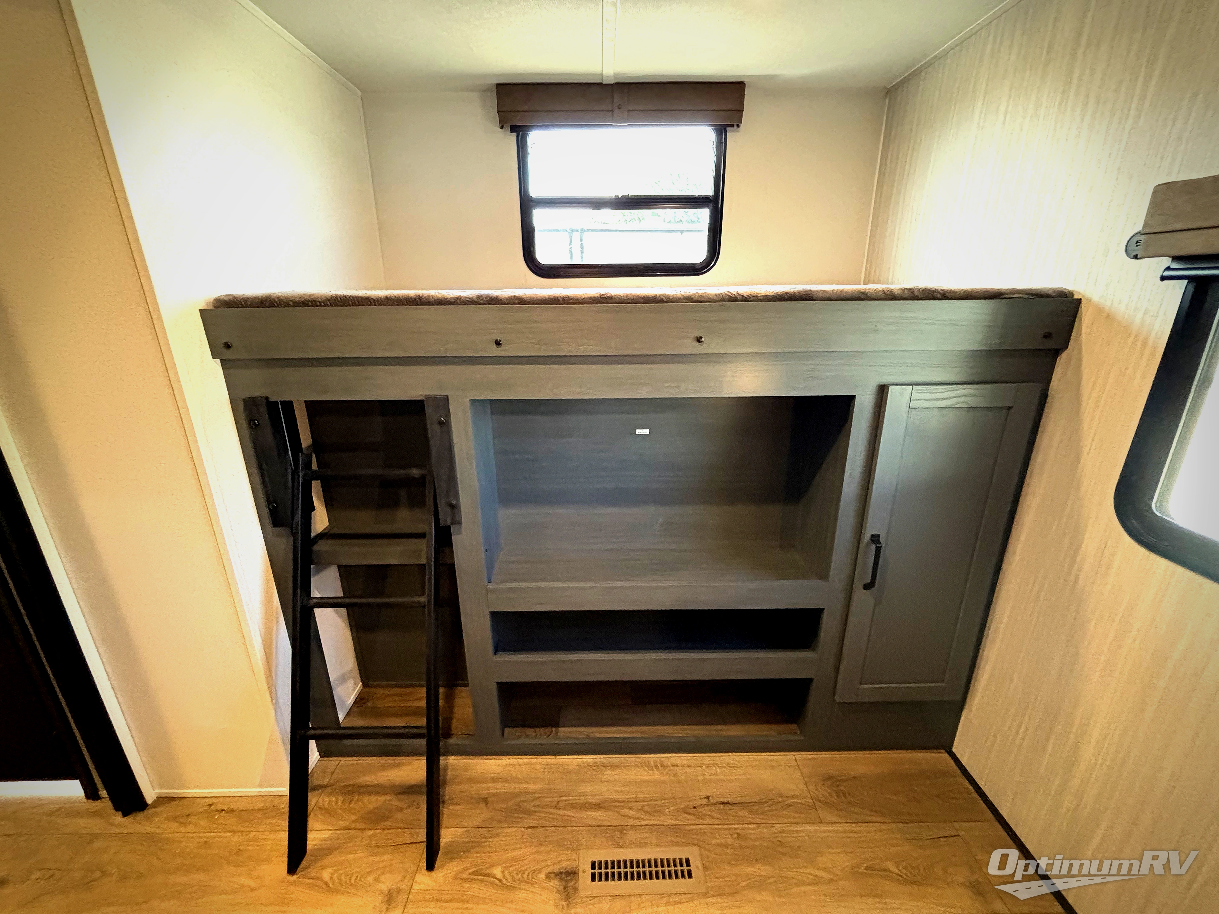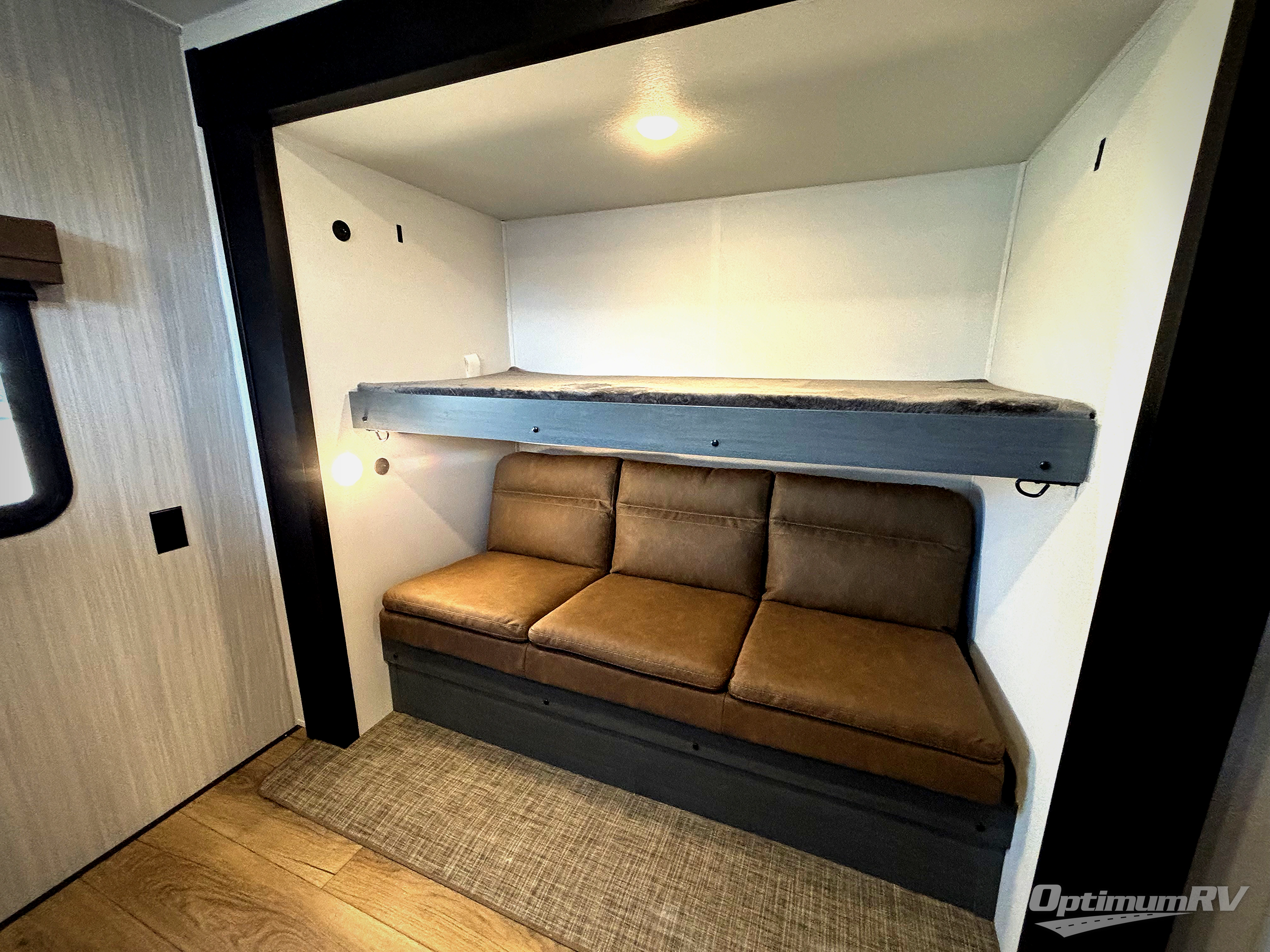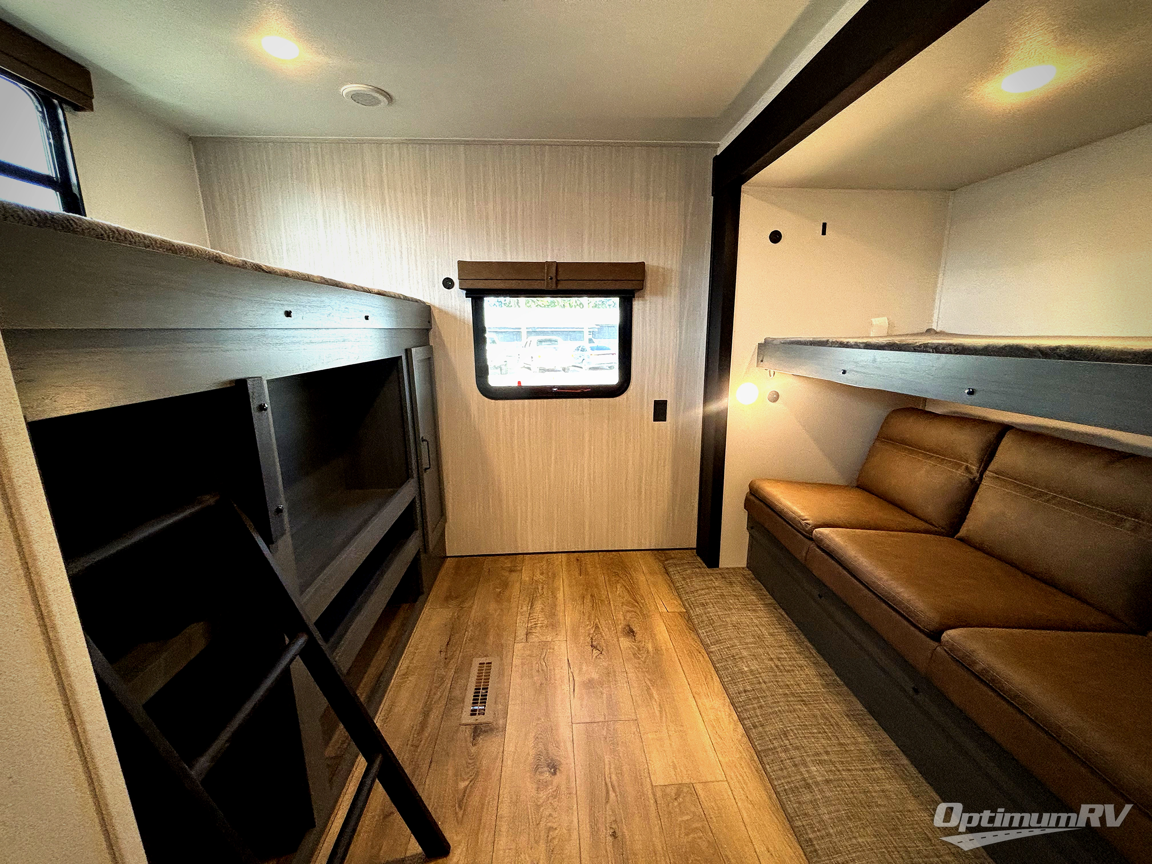 The kids will love having their own rear private bunkhouse in this travel trailer! Inside the bunkhouse is a 38" x 76" bunk above an entertainment center, a closet, and a 32" x 69" bunk above a jiffy sofa slide. The full bathroom with a 34" x 34" radius shower is just outside the bunkhouse for them to easily access it at night. They can even invite a friend or two to tag along and sleep on the sofa and U-shaped dinette once converted. Behind the entertainment center is a closet/pantry to keep your favorite snacks and the kitchen has a 12V refrigerator to keep your beverages cold. When you're ready to wind down your nights, head to the front private bedroom and relax on the queen bed with shirt closets and nightstands on either side of it, plus it has one of the dual entry doors to the unit! This model also has an outside kitchen option if you enjoy cooking in the fresh outdoors!