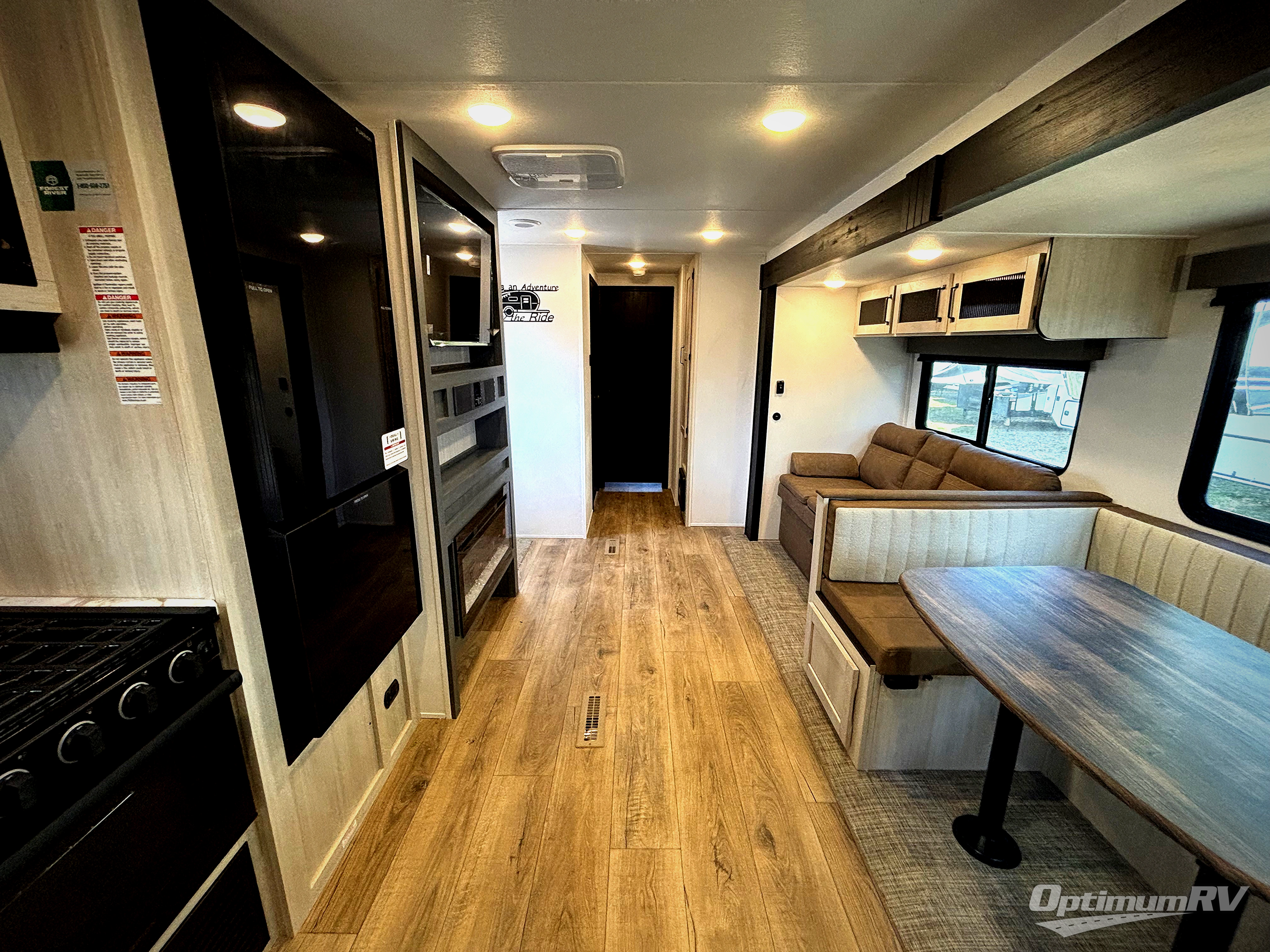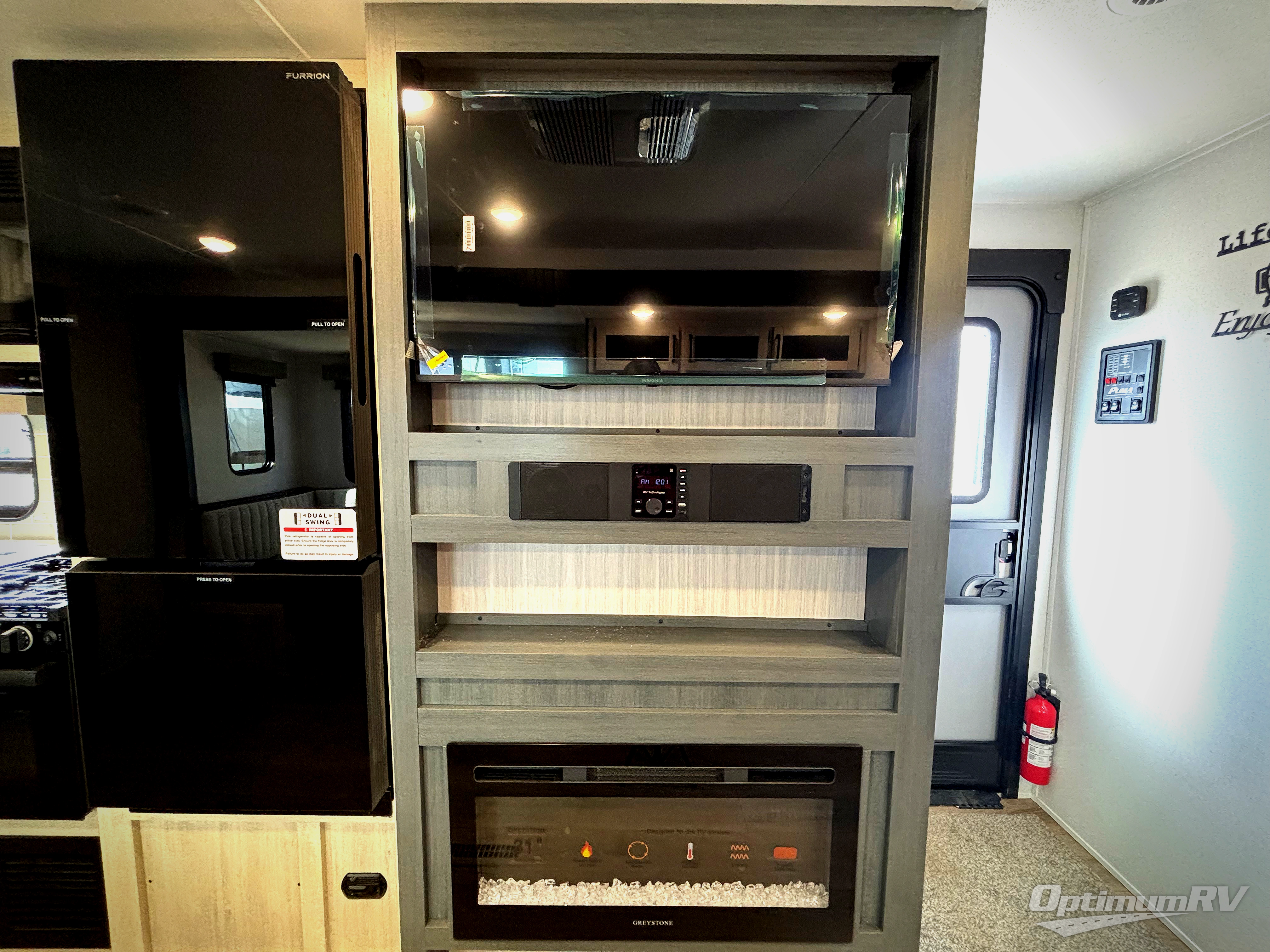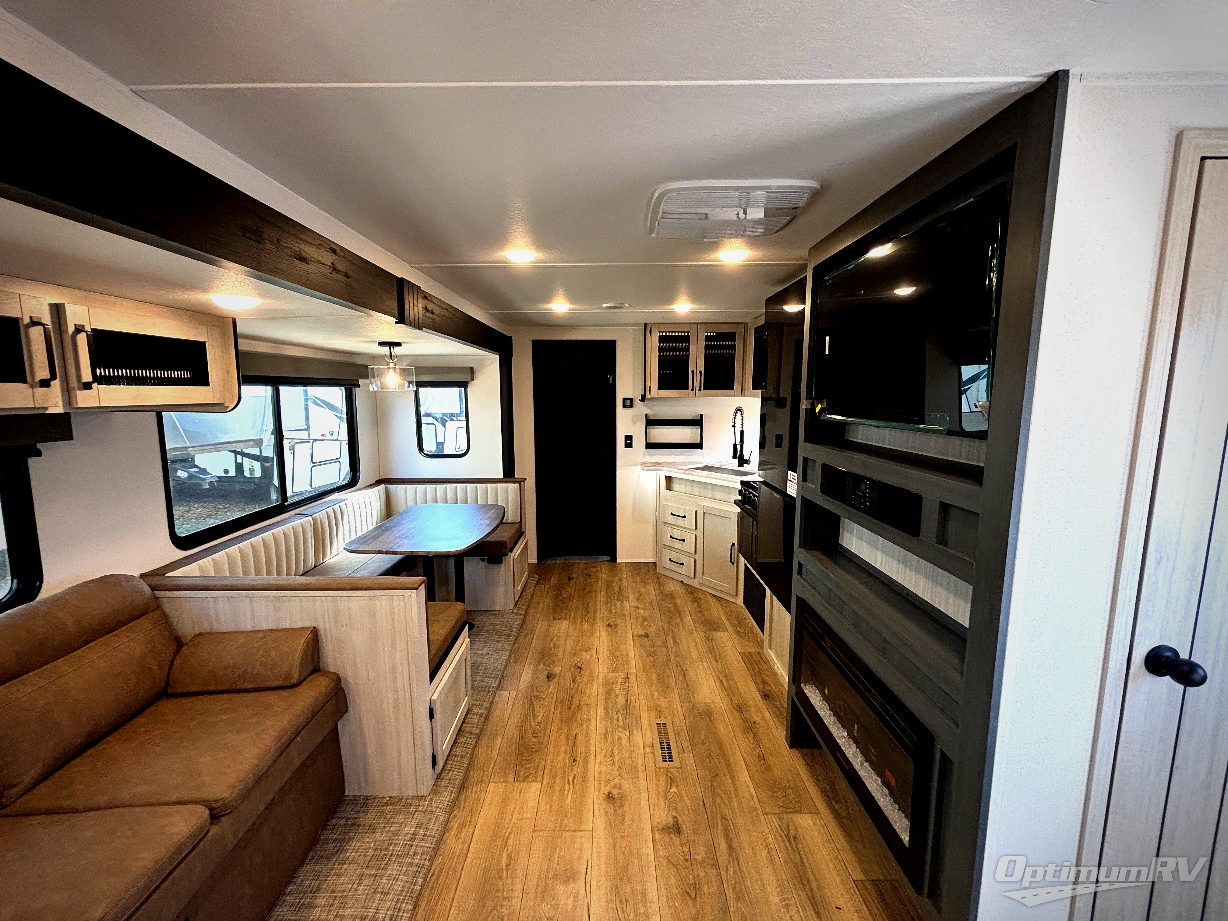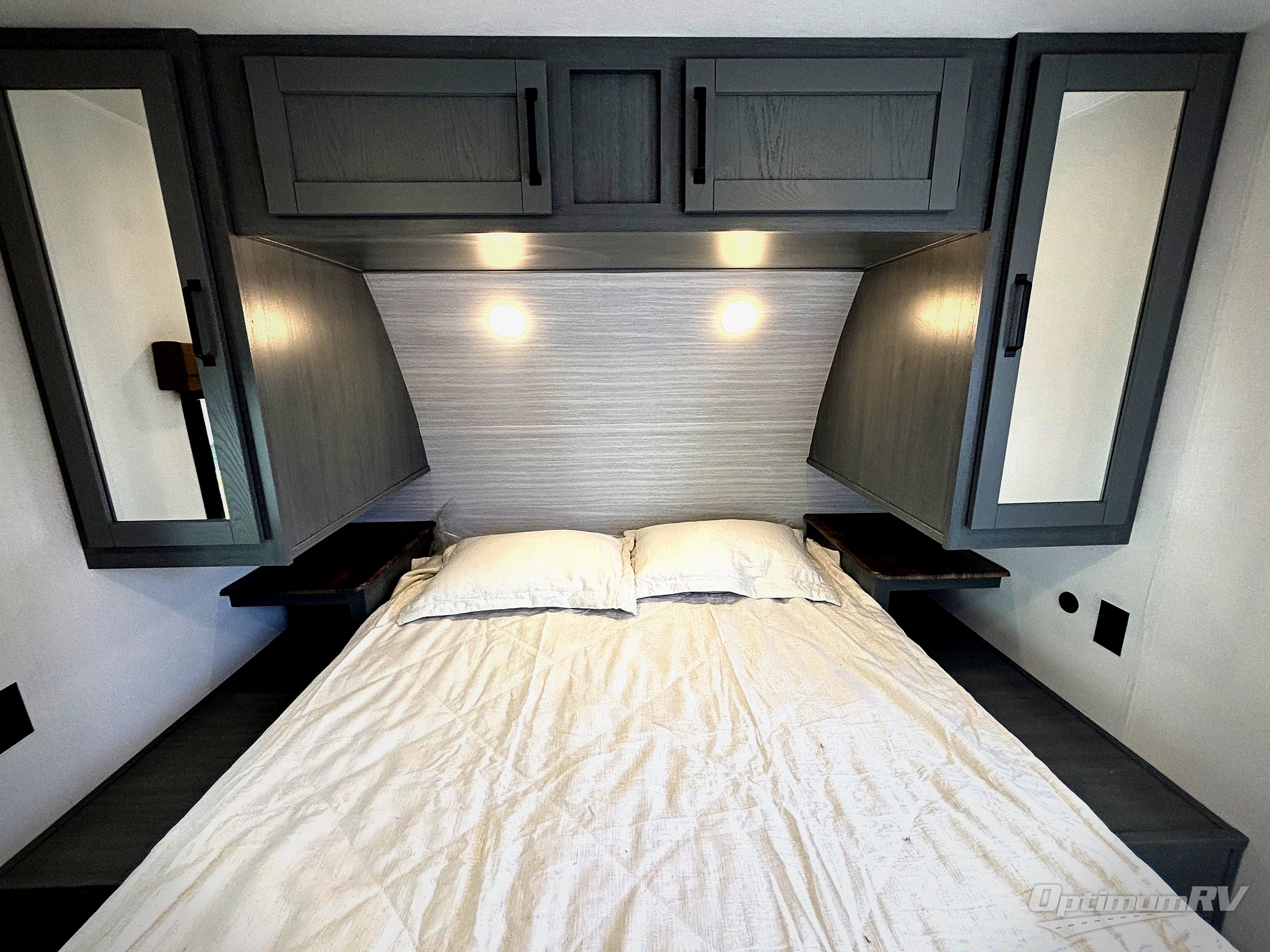 The kids will love having their own rear private bunkhouse in this travel trailer! Inside the bunkhouse is a 38" x 76" bunk above an entertainment center, a closet, and a 32" x 69" bunk above a jiffy sofa slide. The full bathroom with a 34" x 34" radius shower is just outside the bunkhouse for them to easily access it at night. They can even invite a friend or two to tag along and sleep on the sofa and U-shaped dinette once converted. Behind the entertainment center is a closet/pantry to keep your favorite snacks and the kitchen has a 12V refrigerator to keep your beverages cold. When you're ready to wind down your nights, head to the front private bedroom and relax on the queen bed with shirt closets and nightstands on either side of it, plus it has one of the dual entry doors to the unit! This model also has an outside kitchen option if you enjoy cooking in the fresh outdoors!