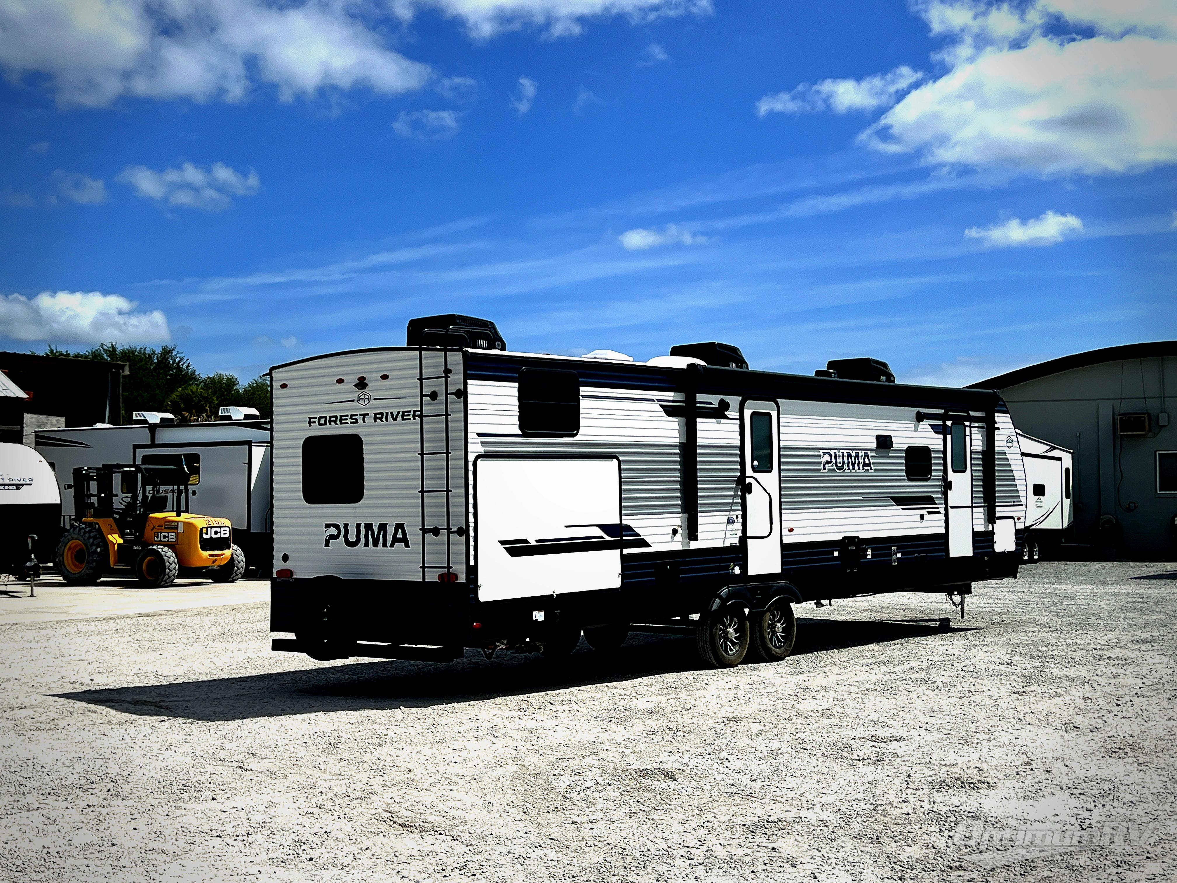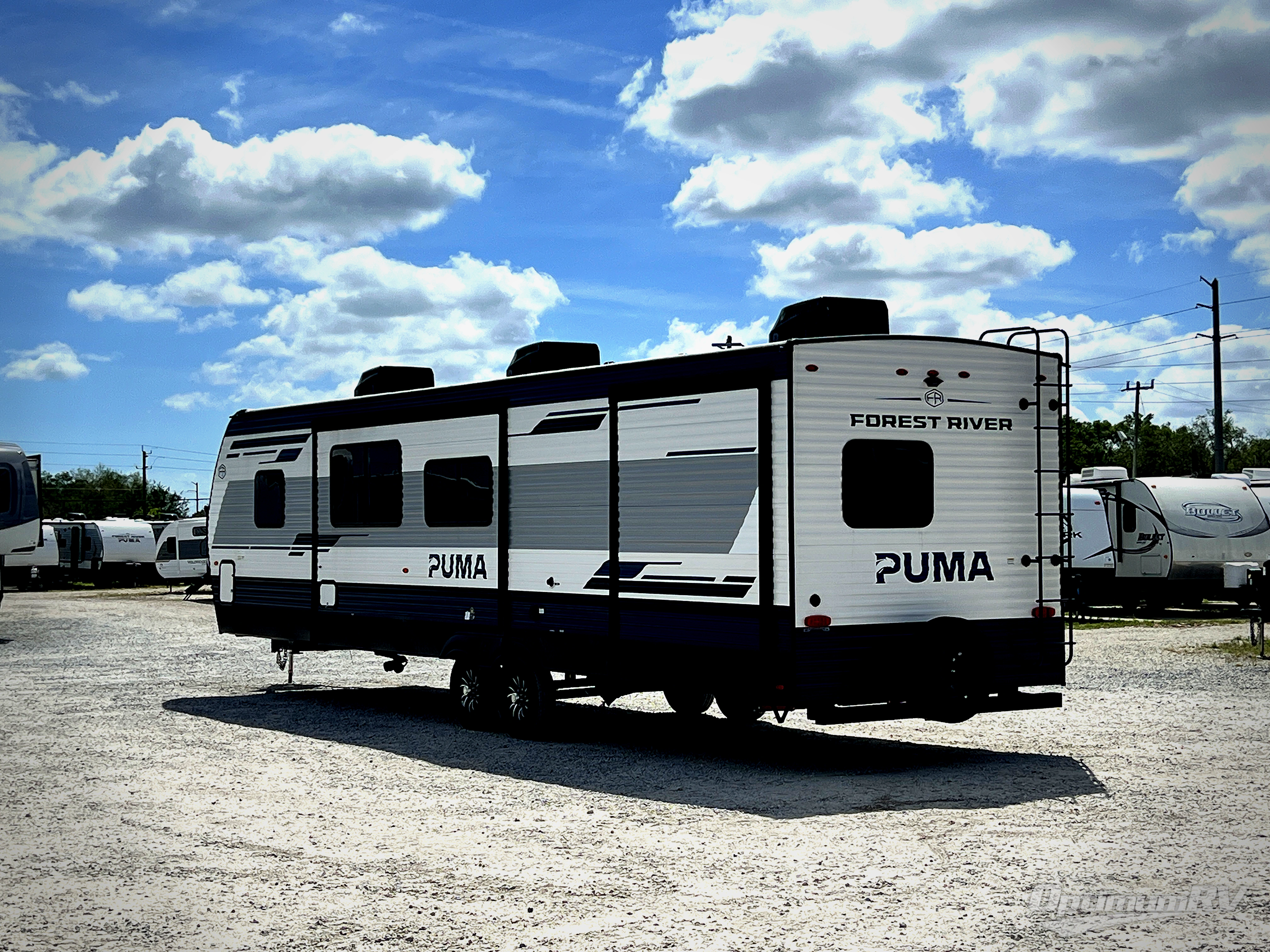 If you're looking for family-fun adventures, then you need one of these Forest River Puma travel trailers! They are built rugged, easy to tow, and jam packed with features. The Darco wrapped underbelly will help protect your unit, and the roof and side mount solar prep gives you the option to add off-grid power. Inside, the Congoleum linoleum will be easy to keep clean, and the night roller shades will provide privacy when it's time to turn in. You'll also enjoy an electric awning with an LED light strip plus an AM/FM/Bluetooth stereo and two outside speakers to keep the party going!