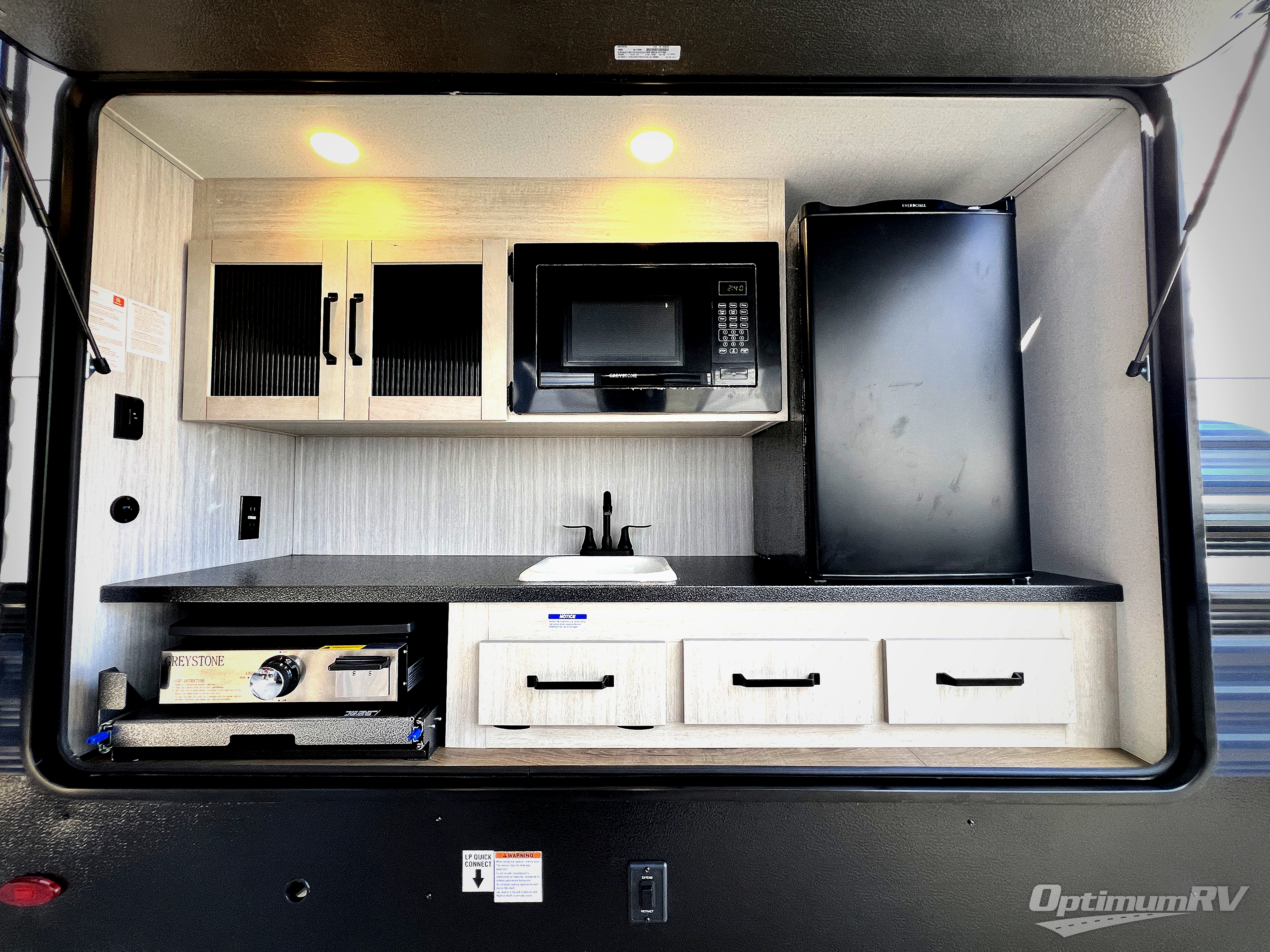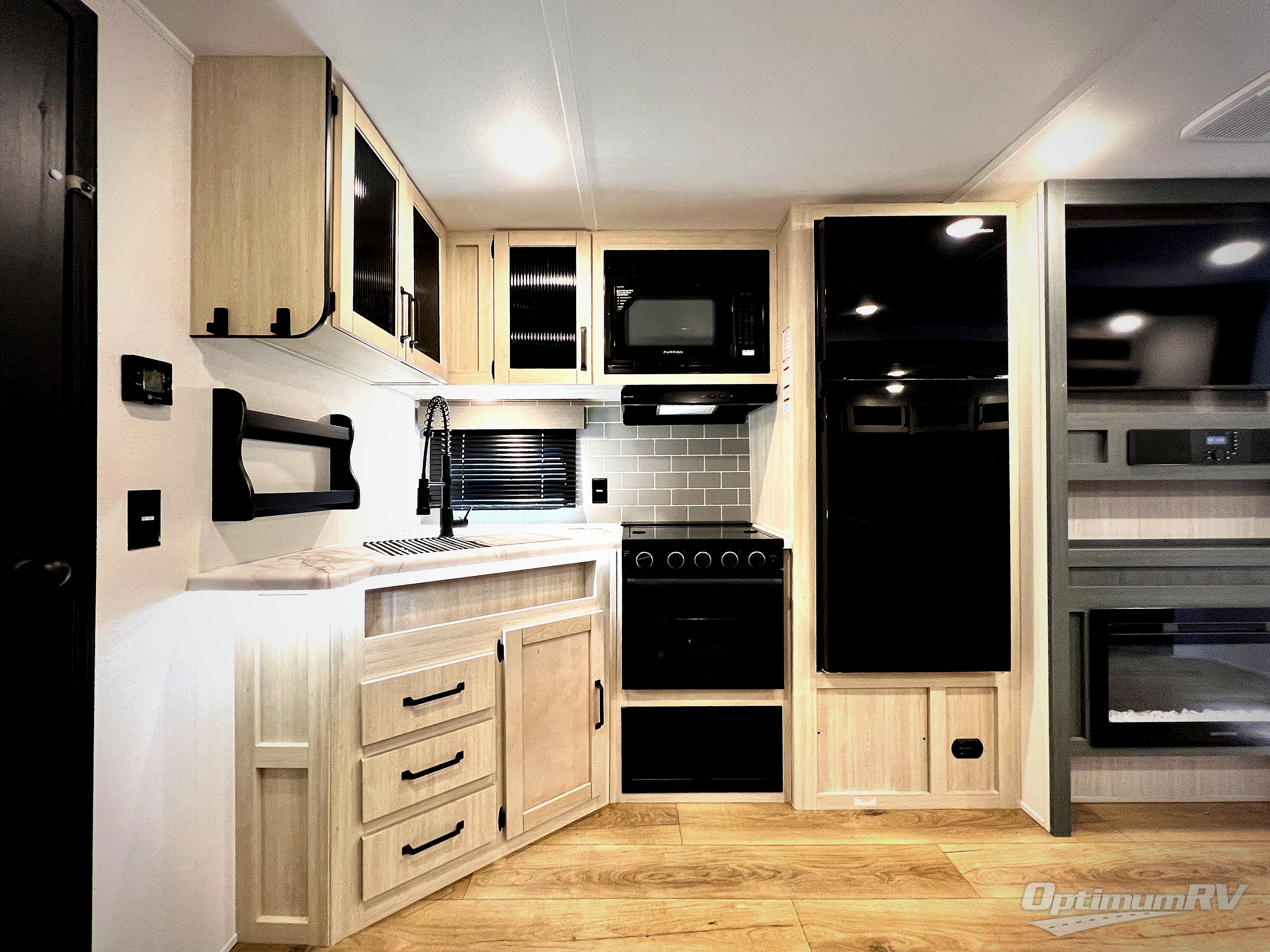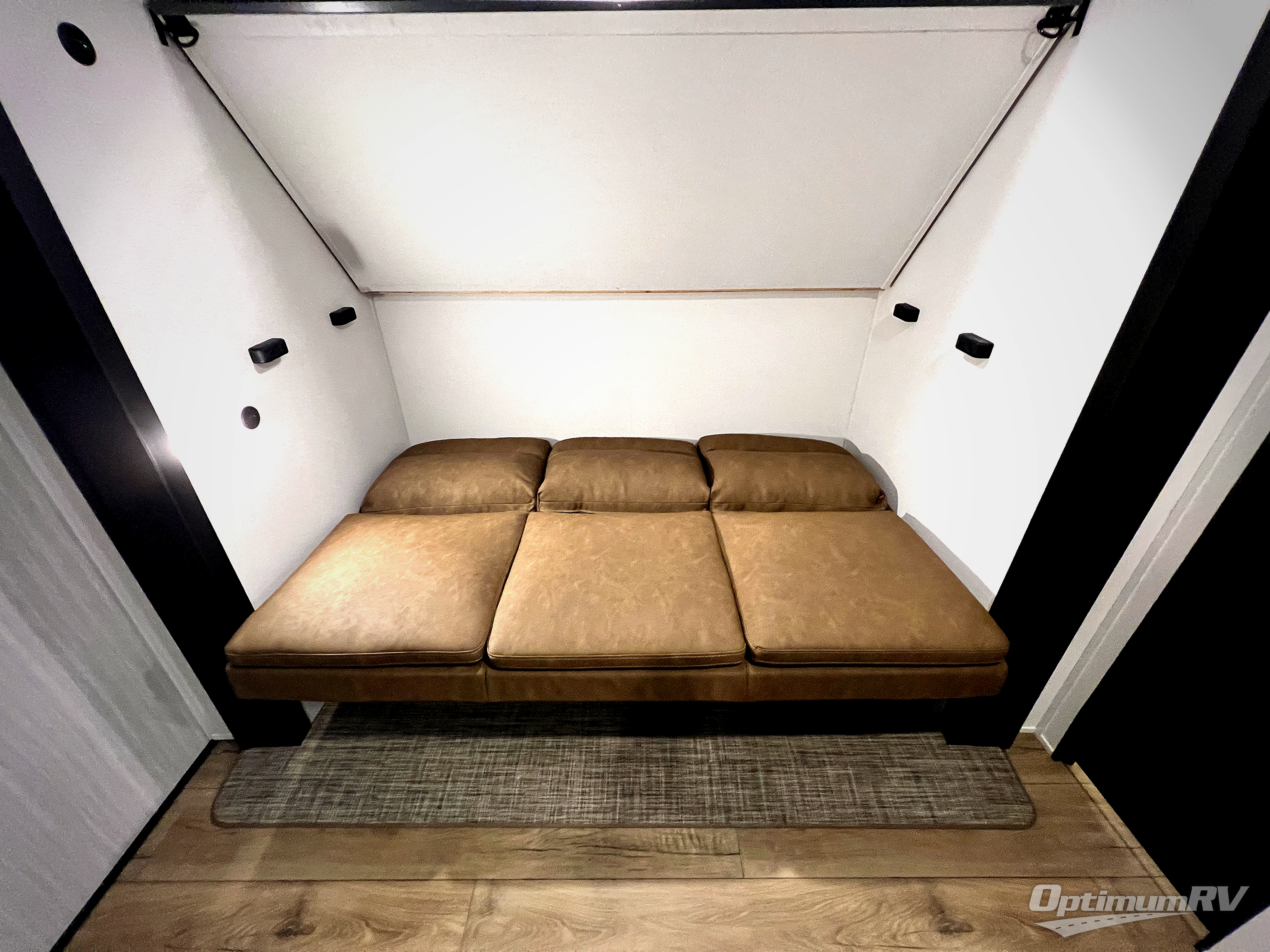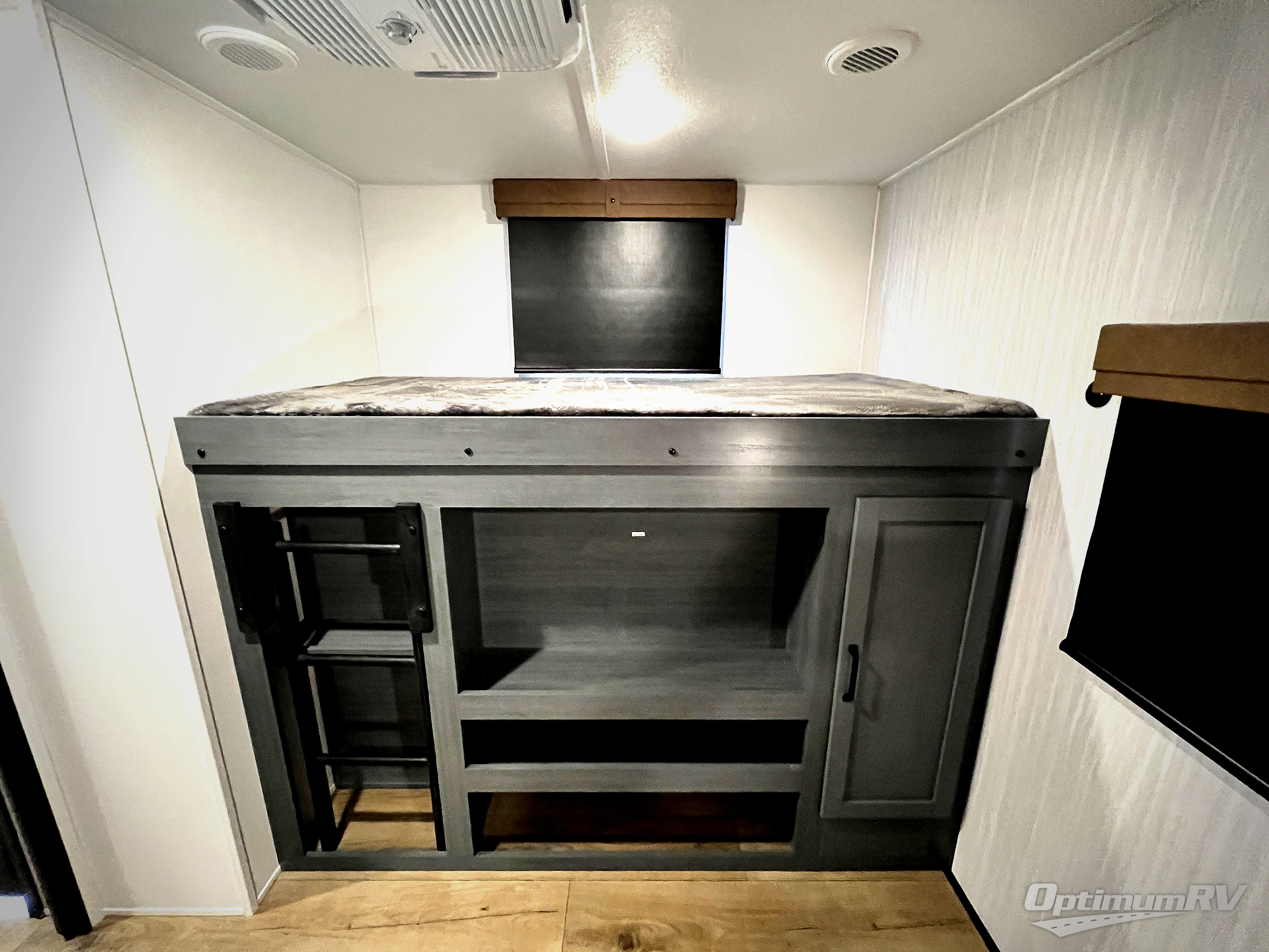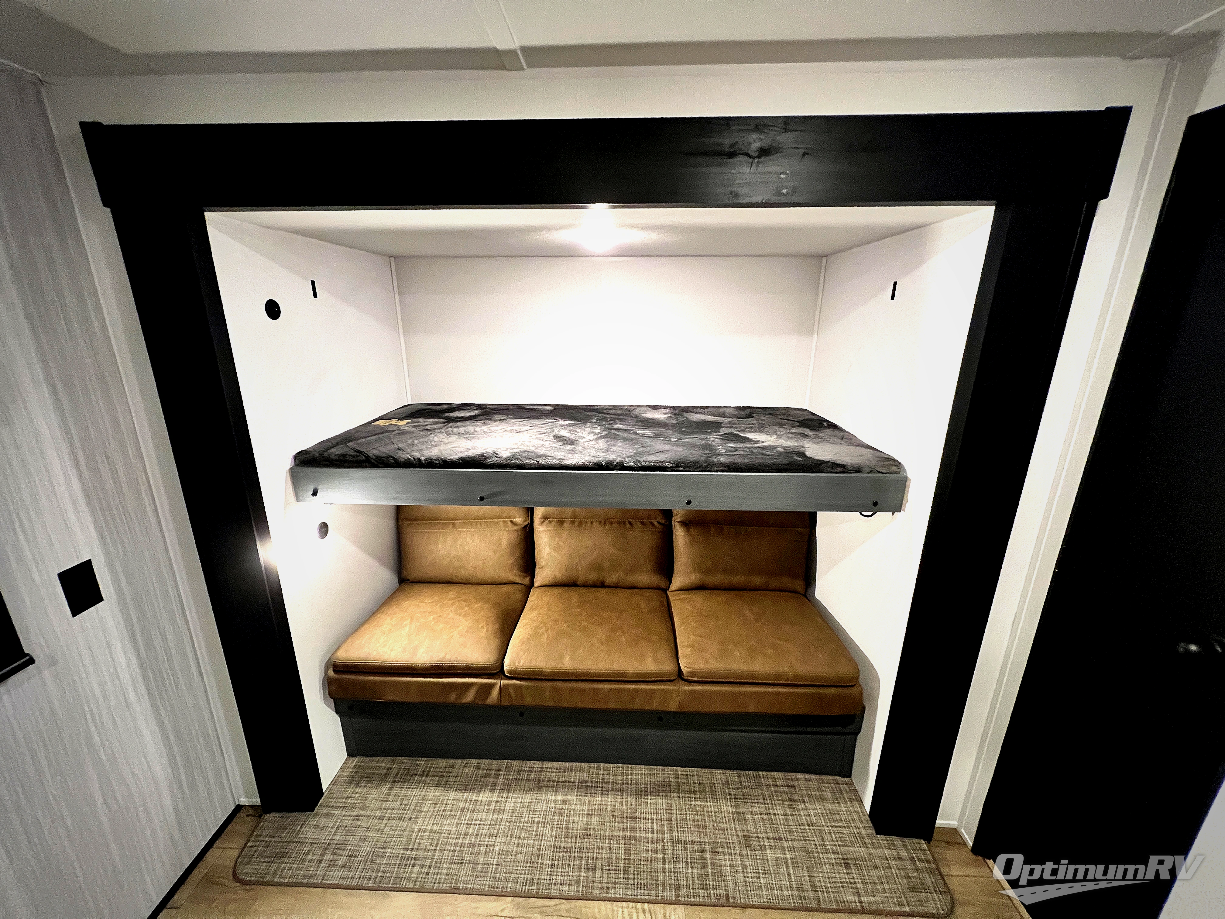 The kids will love having their own rear private bunkhouse in this travel trailer! Inside the bunkhouse is a 38" x 76" bunk above an entertainment center, a closet, and a 32" x 69" bunk above a jiffy sofa slide. The full bathroom with a 34" x 34" radius shower is just outside the bunkhouse for them to easily access it at night. They can even invite a friend or two to tag along and sleep on the sofa and U-shaped dinette once converted. Behind the entertainment center is a closet/pantry to keep your favorite snacks and the kitchen has a 12V refrigerator to keep your beverages cold. When you're ready to wind down your nights, head to the front private bedroom and relax on the queen bed with shirt closets and nightstands on either side of it, plus it has one of the dual entry doors to the unit! This model also has an outside kitchen option if you enjoy cooking in the fresh outdoors!