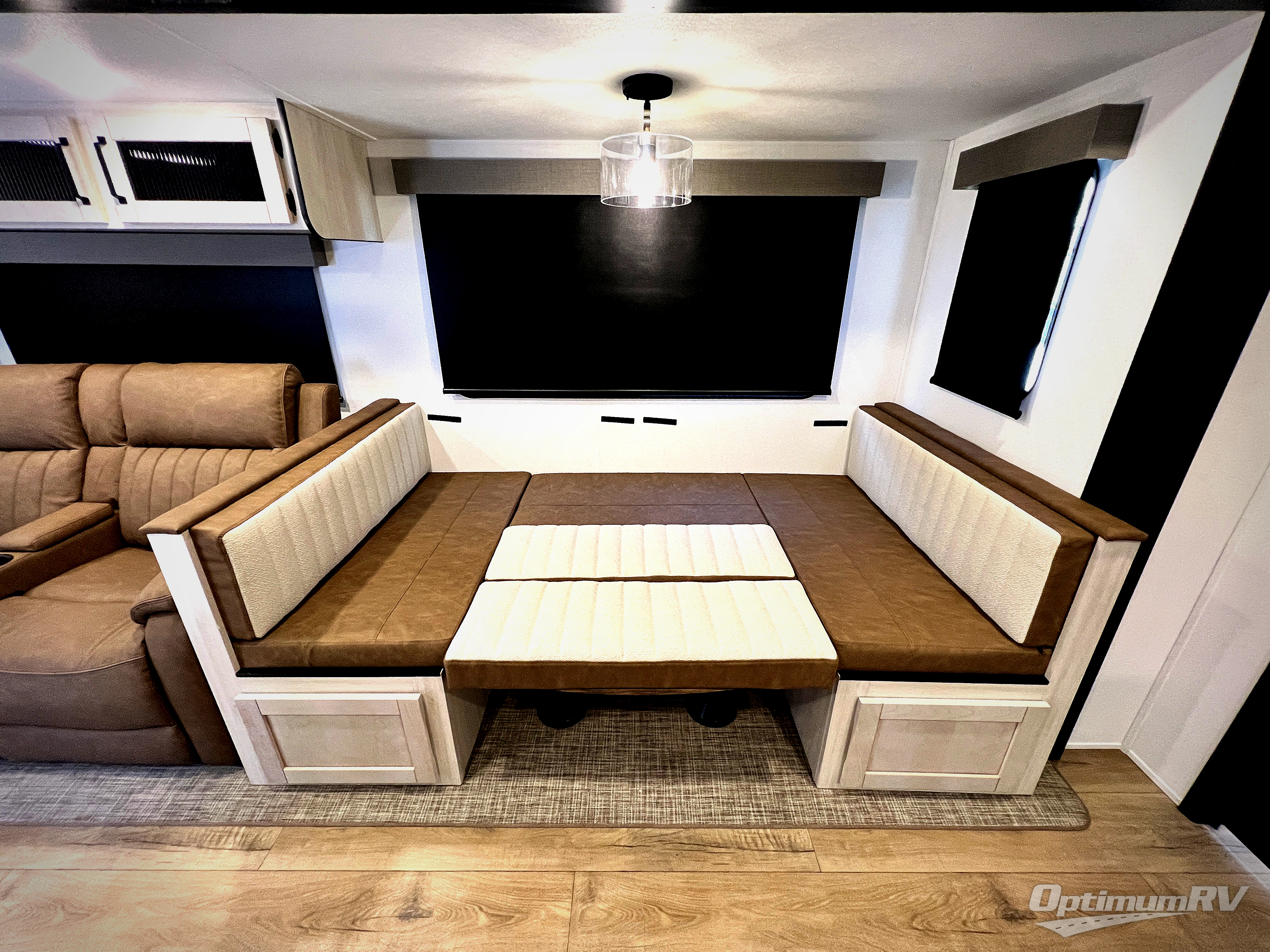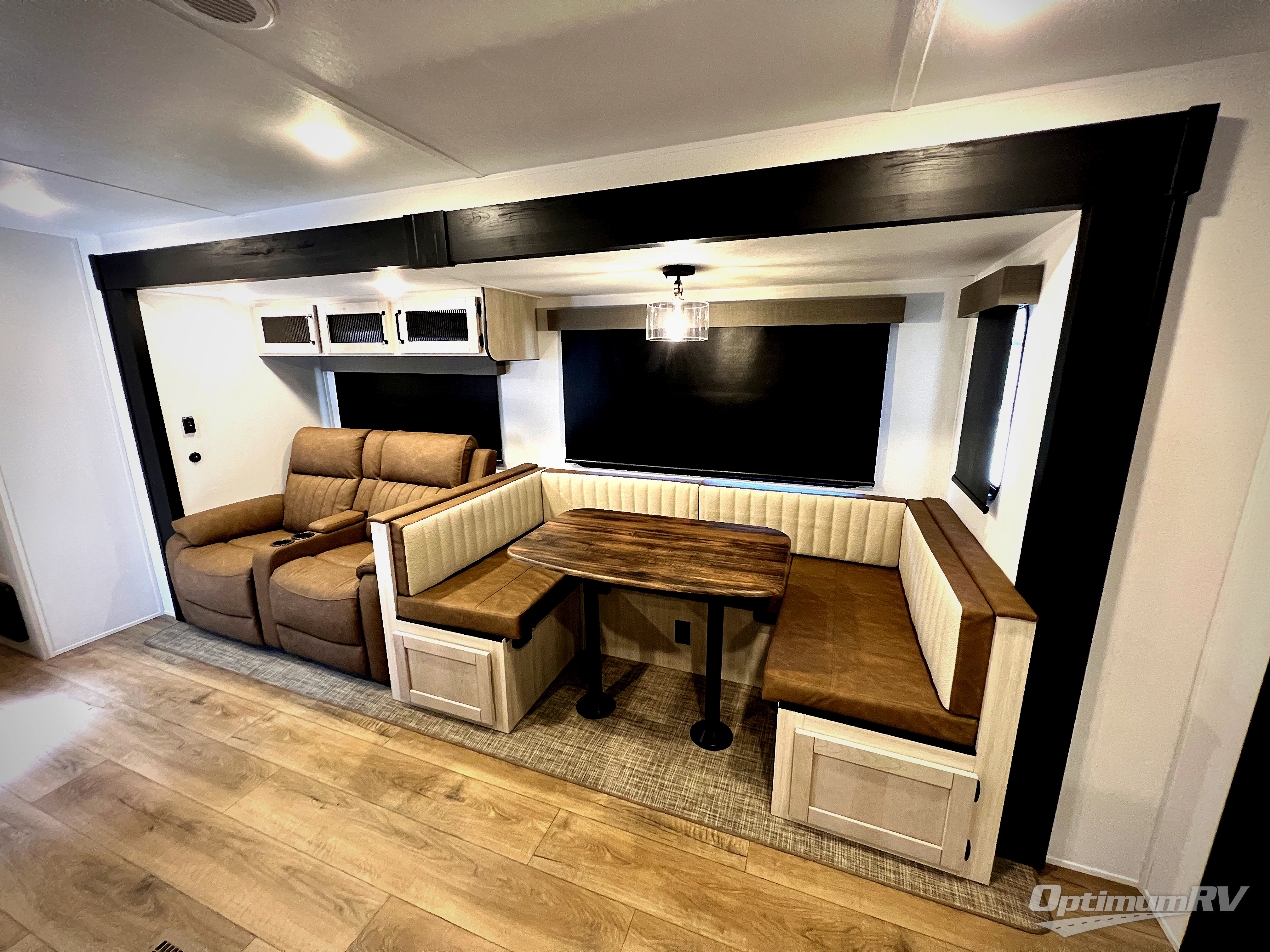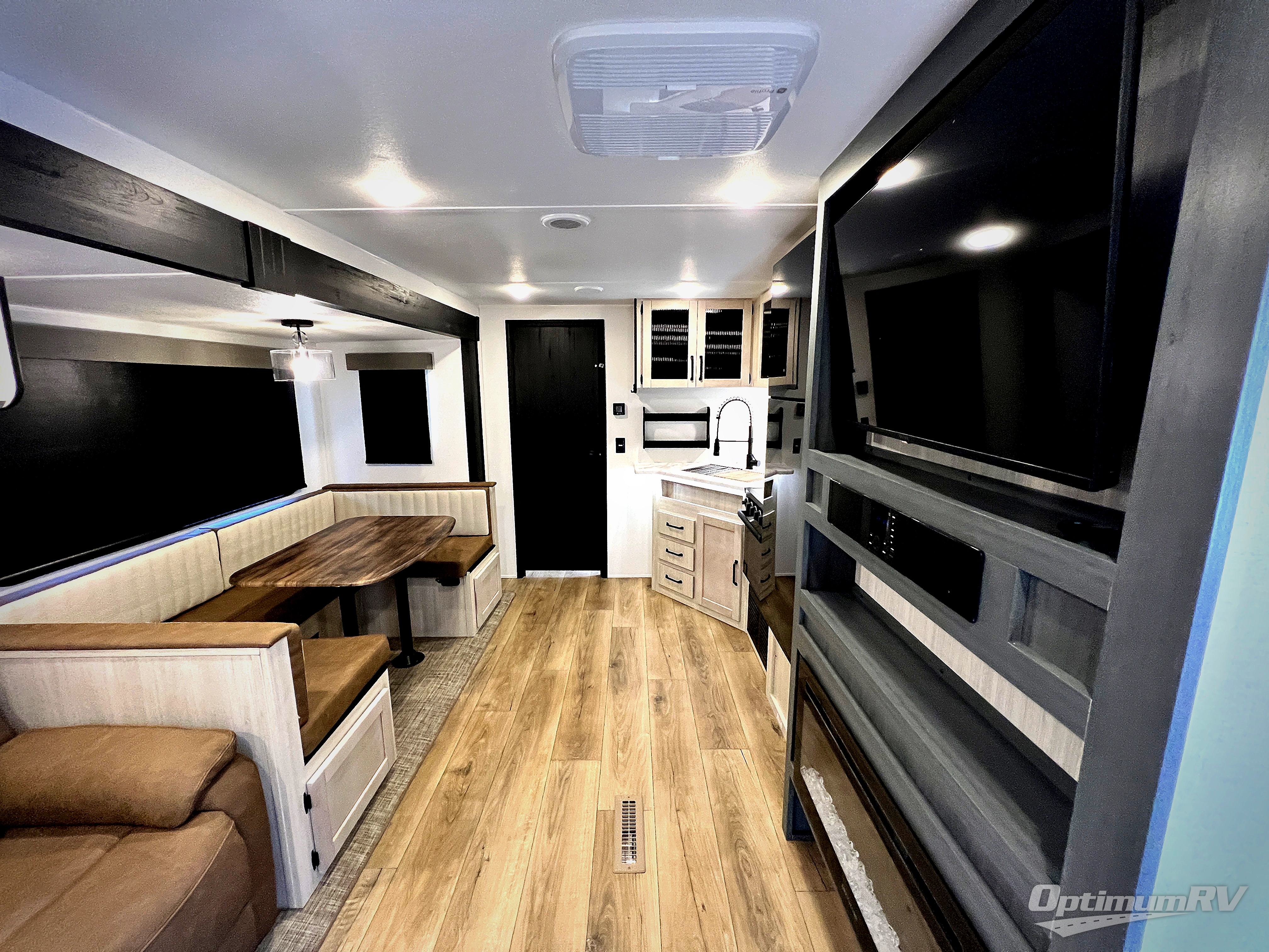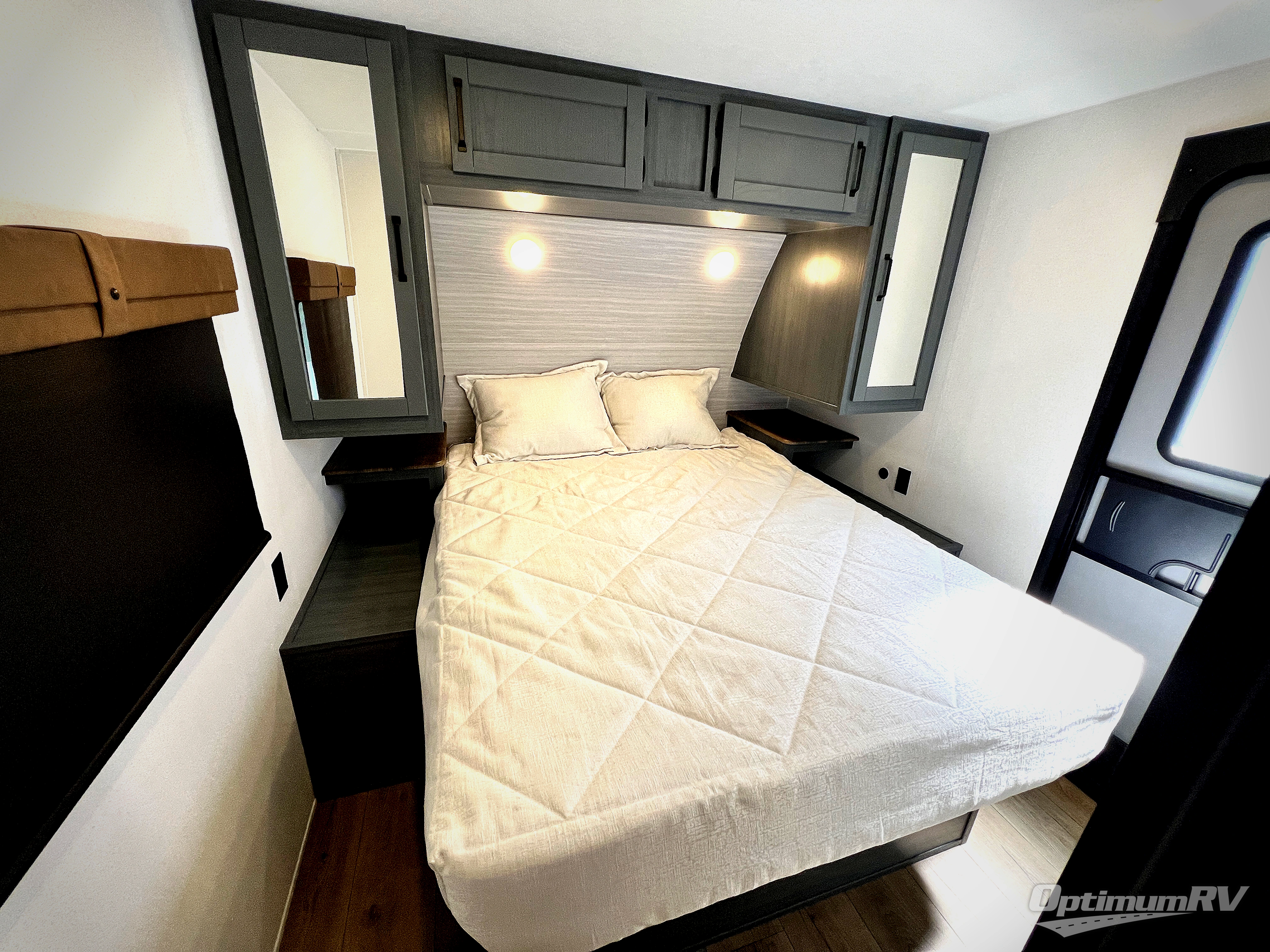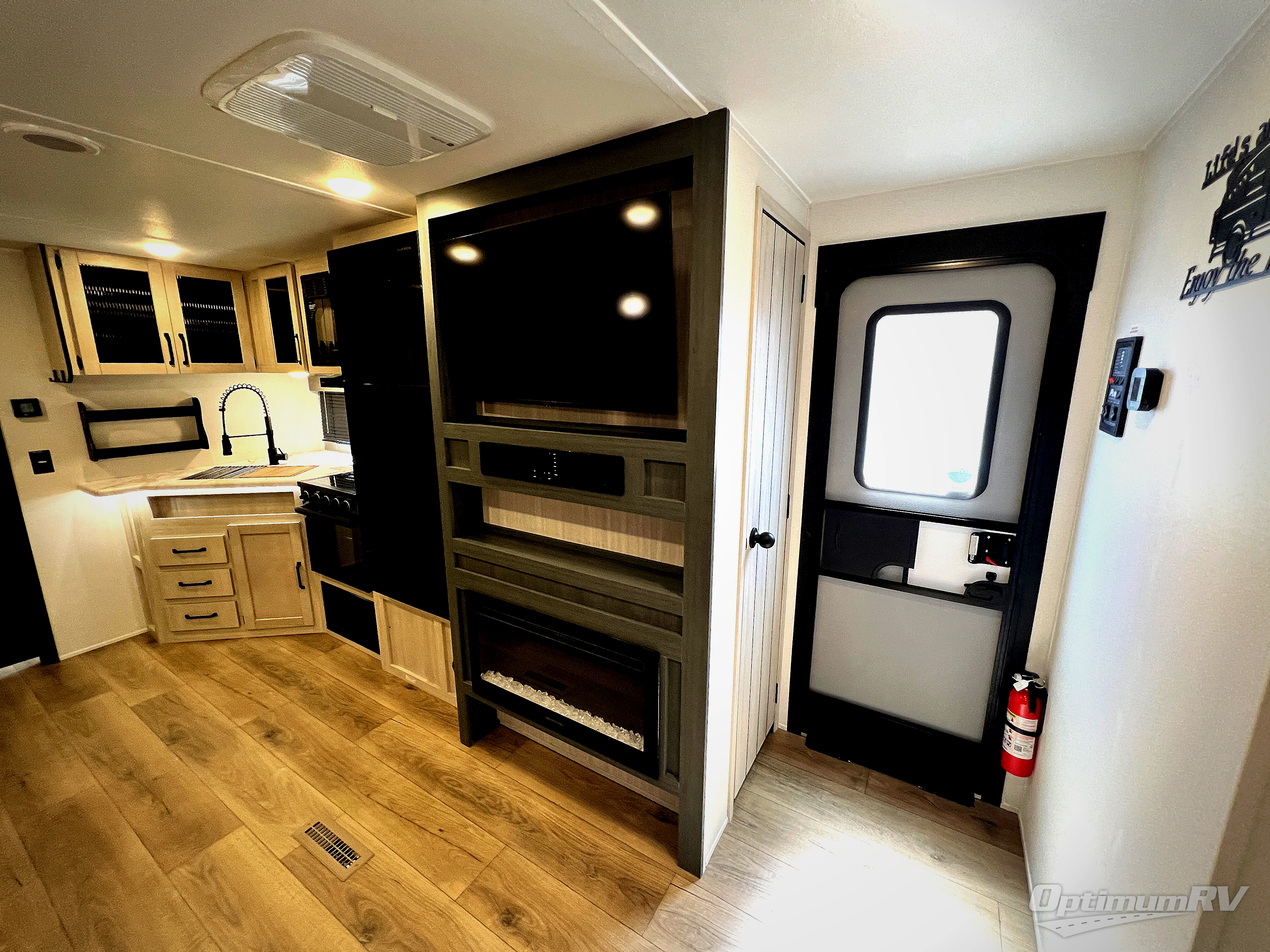 The kids will love having their own rear private bunkhouse in this travel trailer! Inside the bunkhouse is a 38" x 76" bunk above an entertainment center, a closet, and a 32" x 69" bunk above a jiffy sofa slide. The full bathroom with a 34" x 34" radius shower is just outside the bunkhouse for them to easily access it at night. They can even invite a friend or two to tag along and sleep on the sofa and U-shaped dinette once converted. Behind the entertainment center is a closet/pantry to keep your favorite snacks and the kitchen has a 12V refrigerator to keep your beverages cold. When you're ready to wind down your nights, head to the front private bedroom and relax on the queen bed with shirt closets and nightstands on either side of it, plus it has one of the dual entry doors to the unit! This model also has an outside kitchen option if you enjoy cooking in the fresh outdoors!