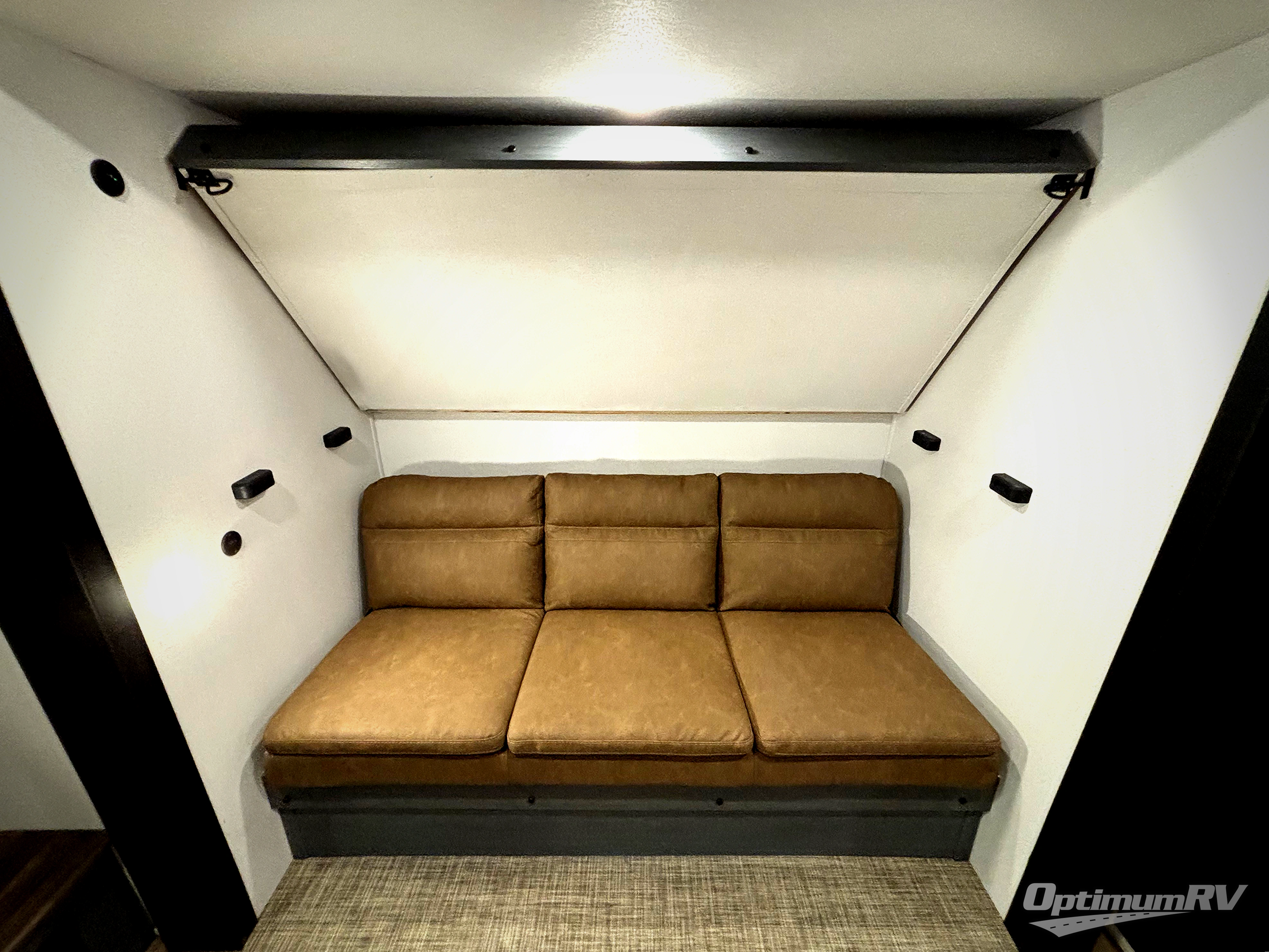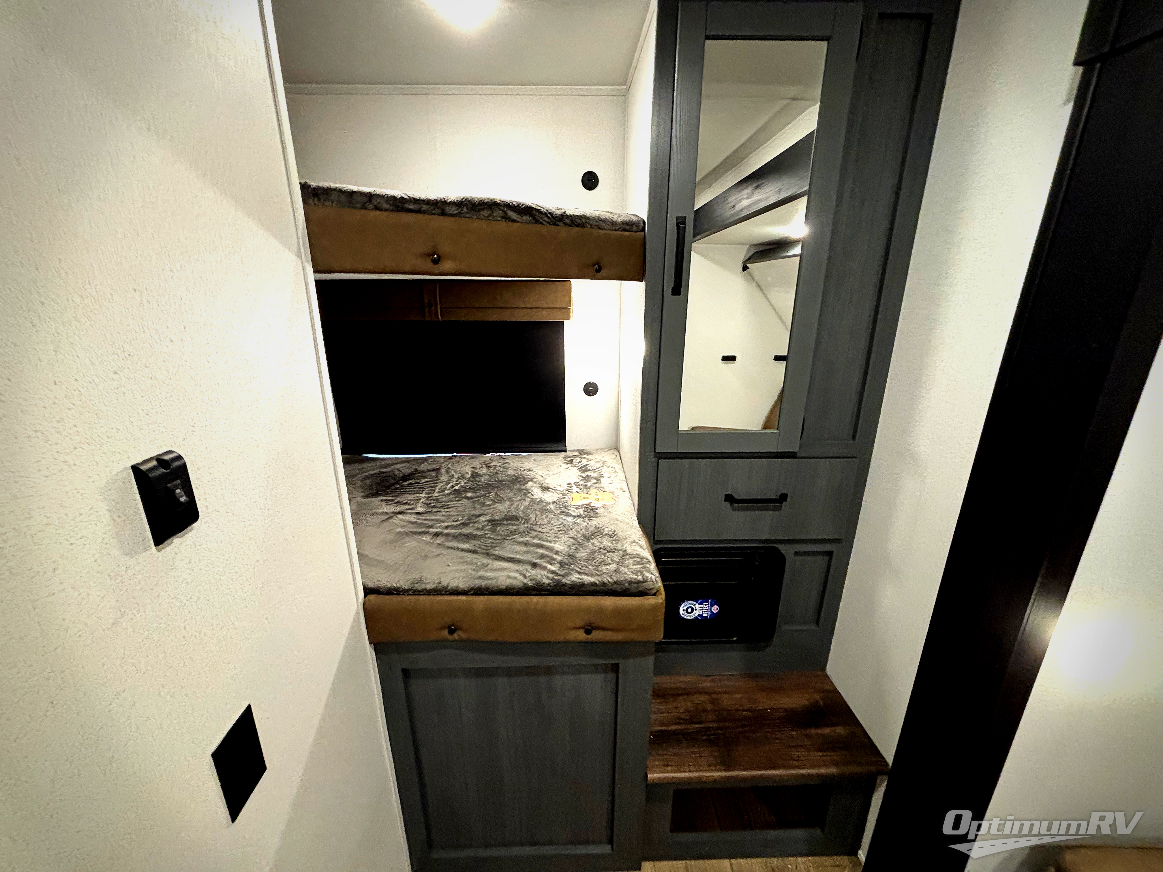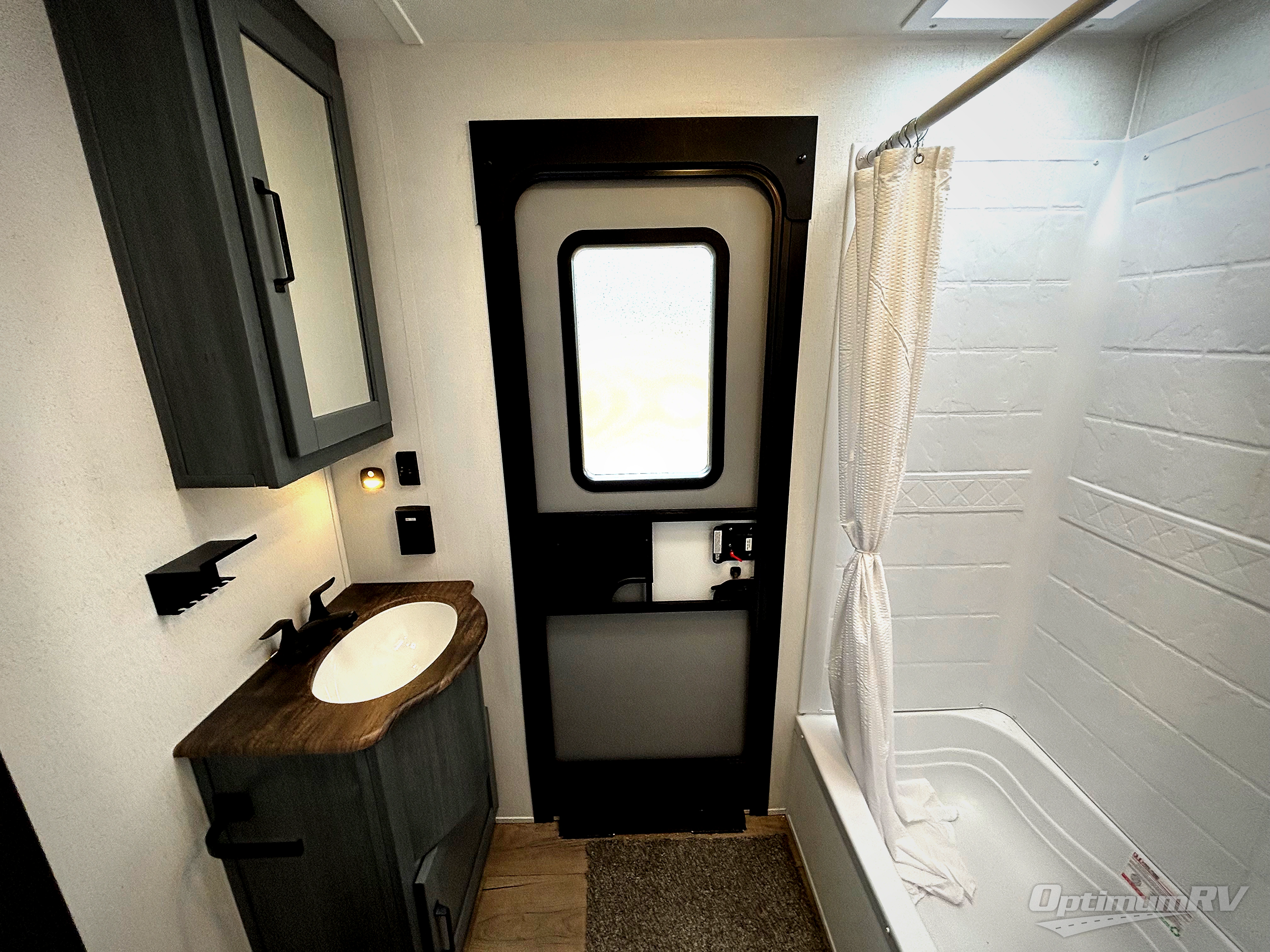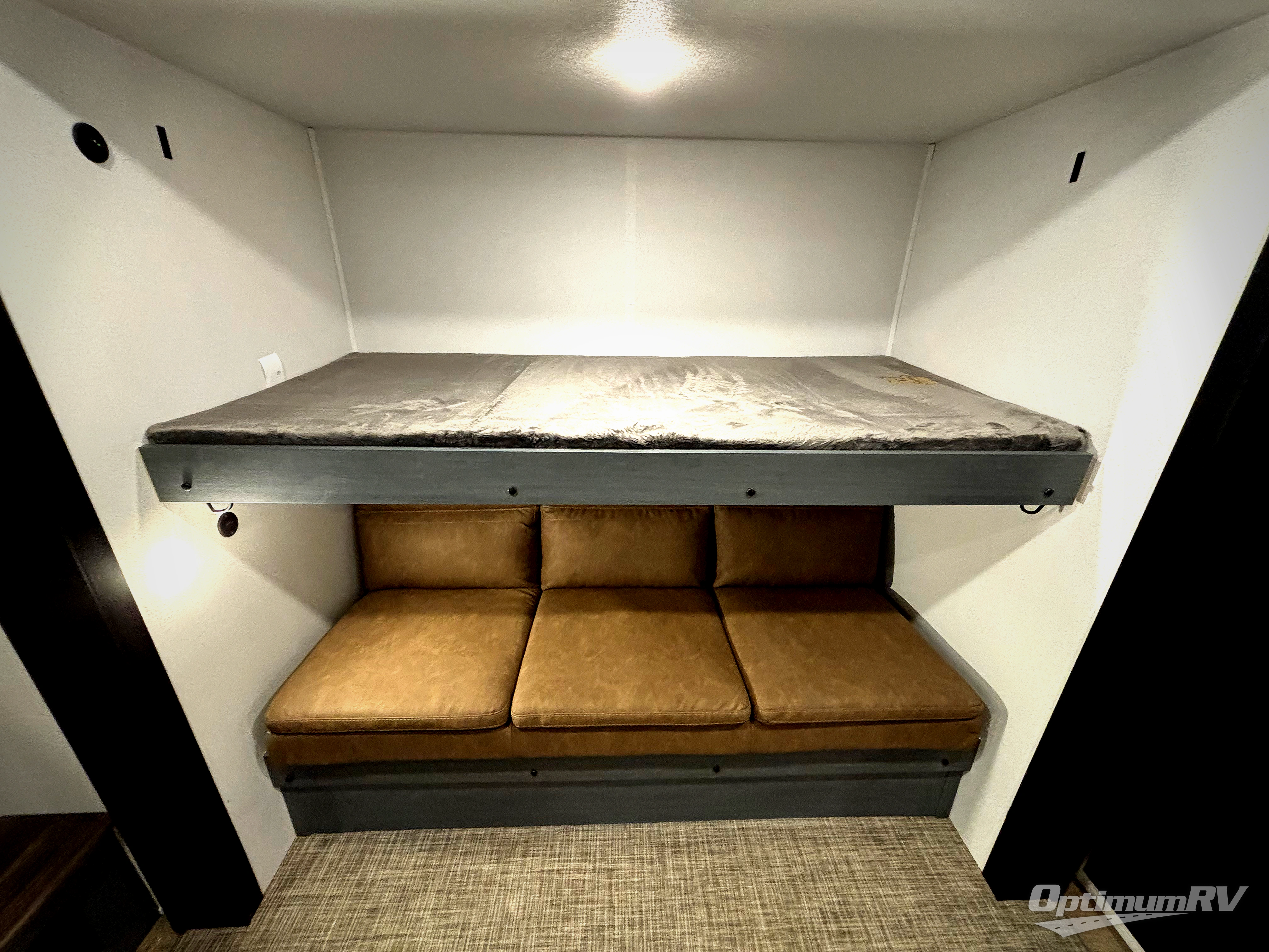 With two full bathrooms, it's a clean decision to take this travel trailer on your next family vacation! Start each morning feeling recharged after sleeping on the queen bed in the front private bedroom or in the rear private bunkhouse with an angled top bunk above a 32" x 69" double bunk bed and a 32" x 69" bunk above a 68" sofa slide. The bunkhouse also has a full bathroom with a 24" x 40" tub and one of the dual entry doors to the unit. You can relax on the sofa while enjoying the entertainment center and eat your meals prepared with the kitchen island at the booth dinette.