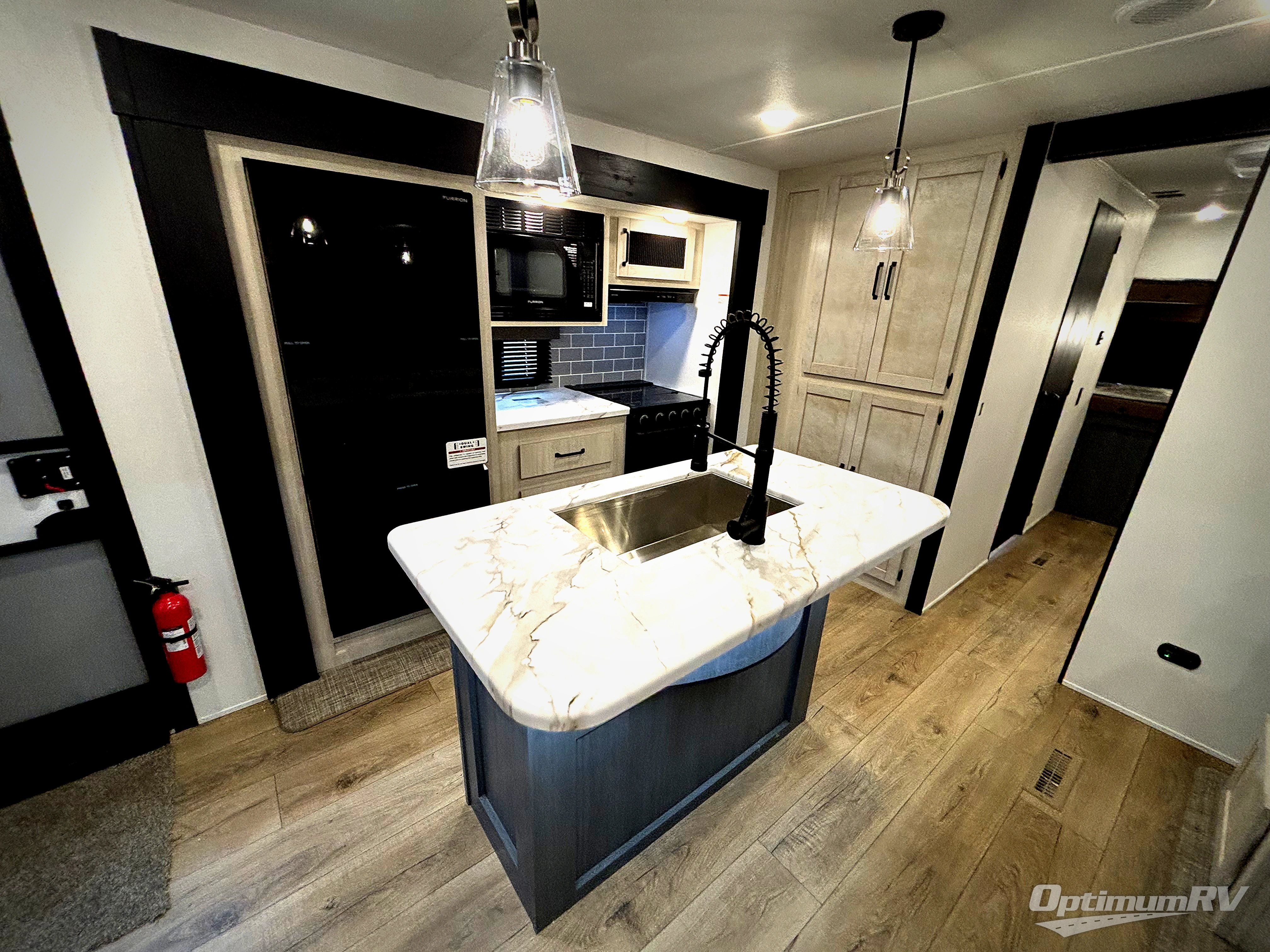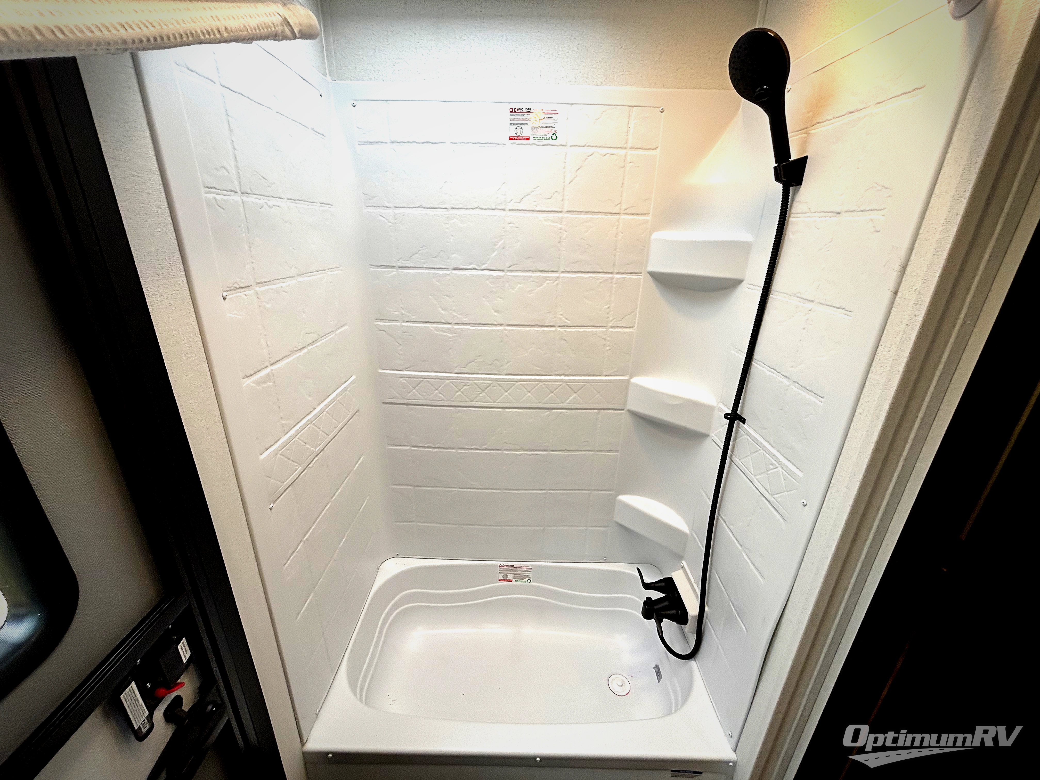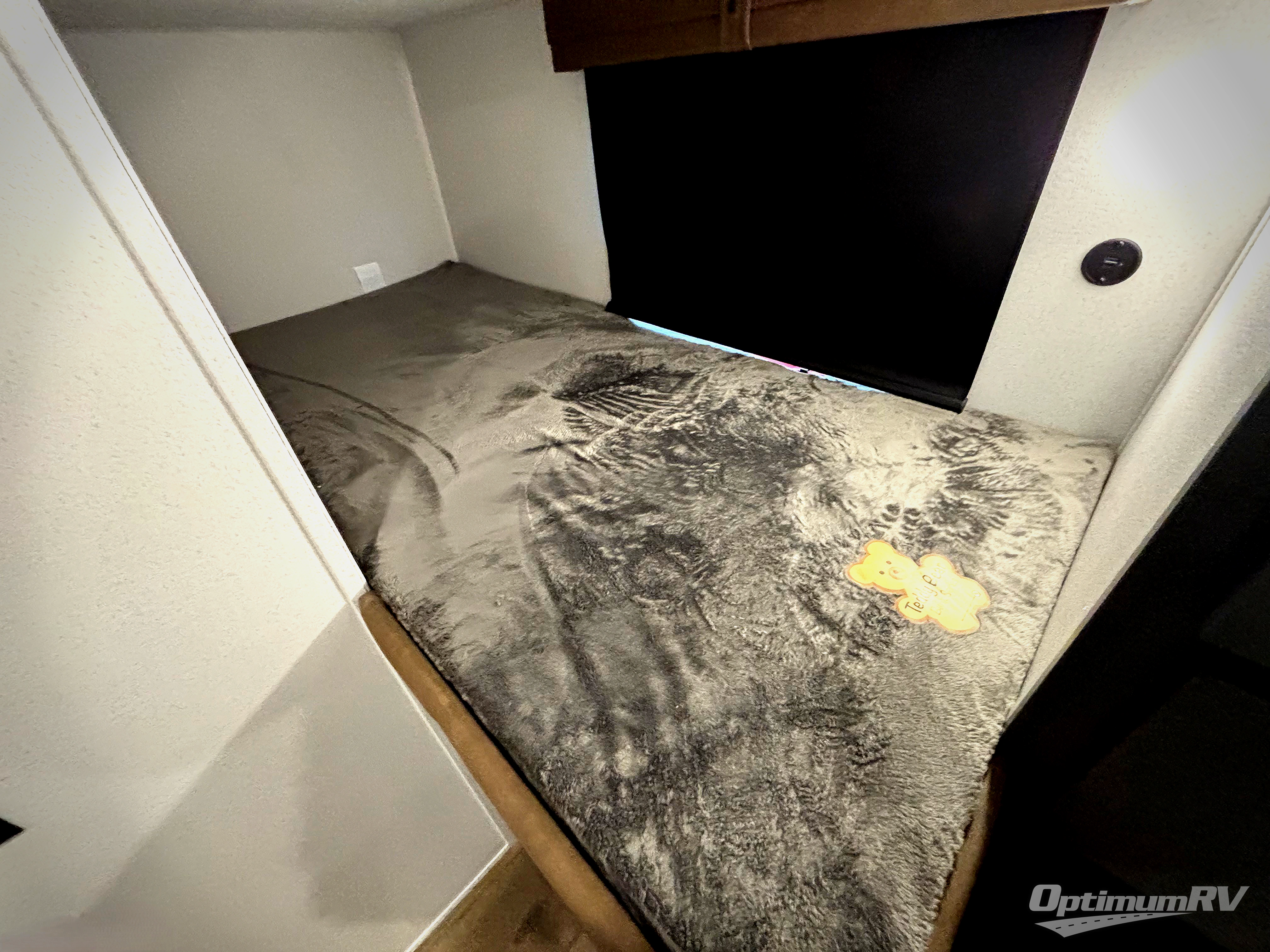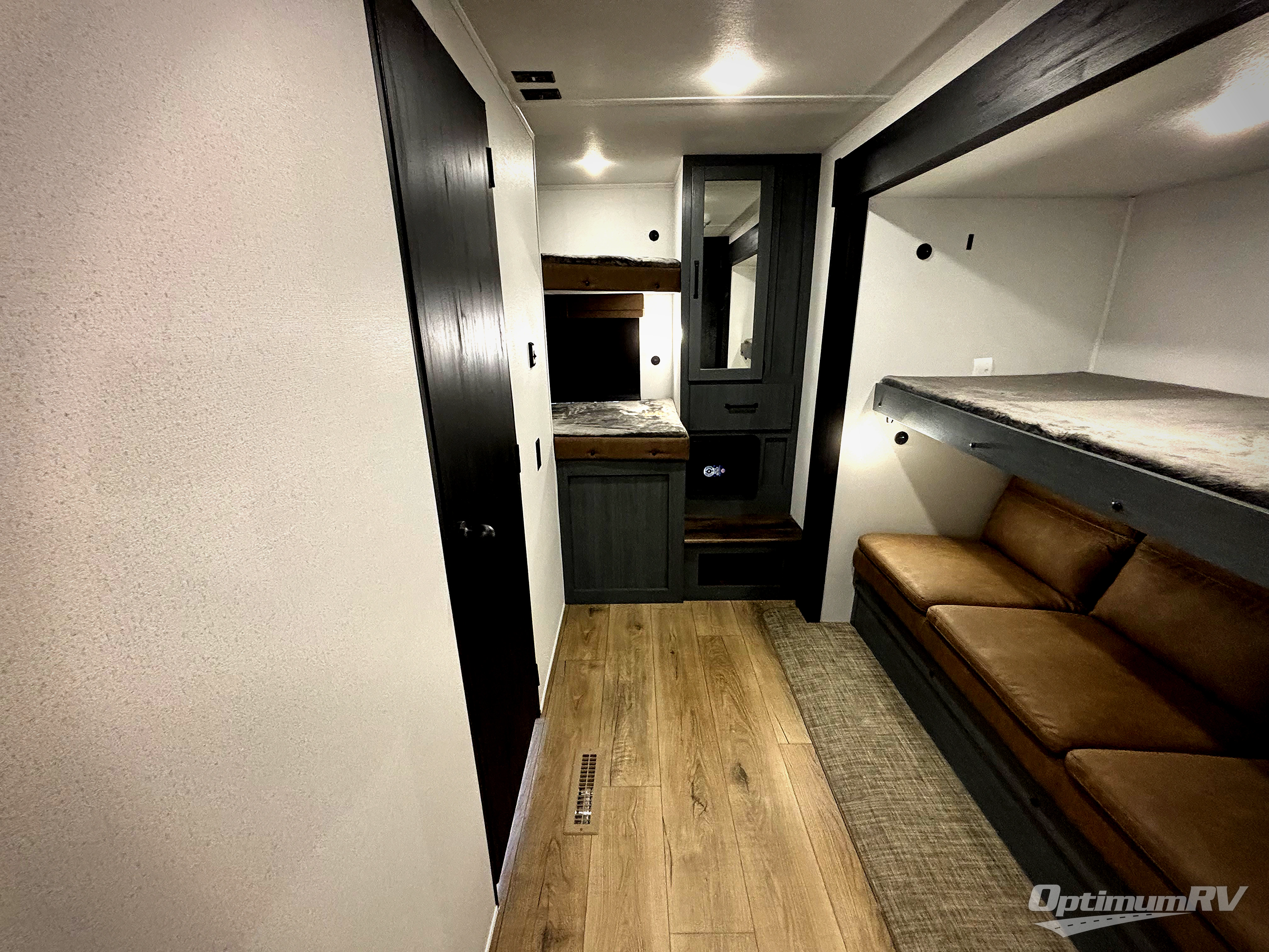 With two full bathrooms, it's a clean decision to take this travel trailer on your next family vacation! Start each morning feeling recharged after sleeping on the queen bed in the front private bedroom or in the rear private bunkhouse with an angled top bunk above a 32" x 69" double bunk bed and a 32" x 69" bunk above a 68" sofa slide. The bunkhouse also has a full bathroom with a 24" x 40" tub and one of the dual entry doors to the unit. You can relax on the sofa while enjoying the entertainment center and eat your meals prepared with the kitchen island at the booth dinette.